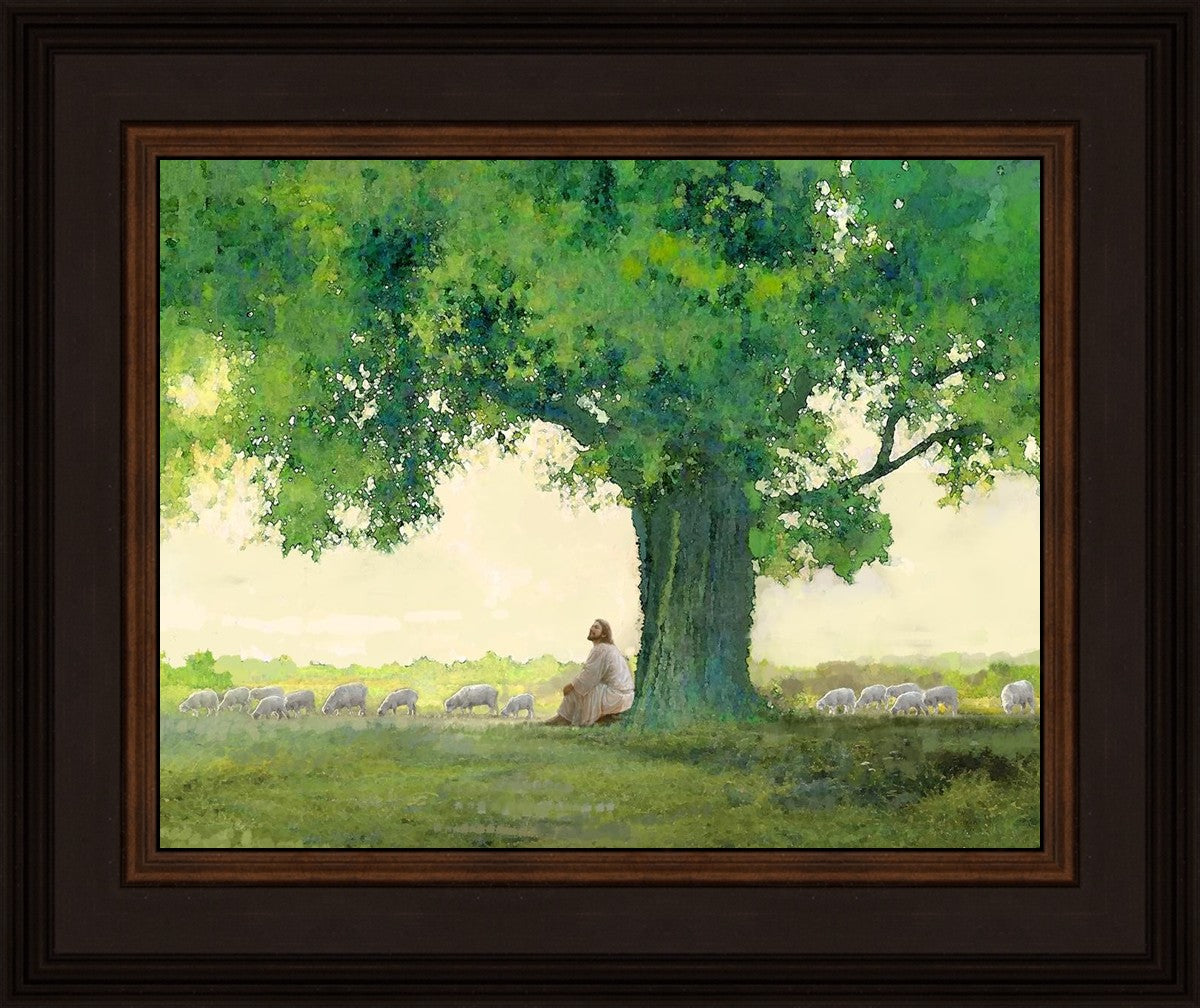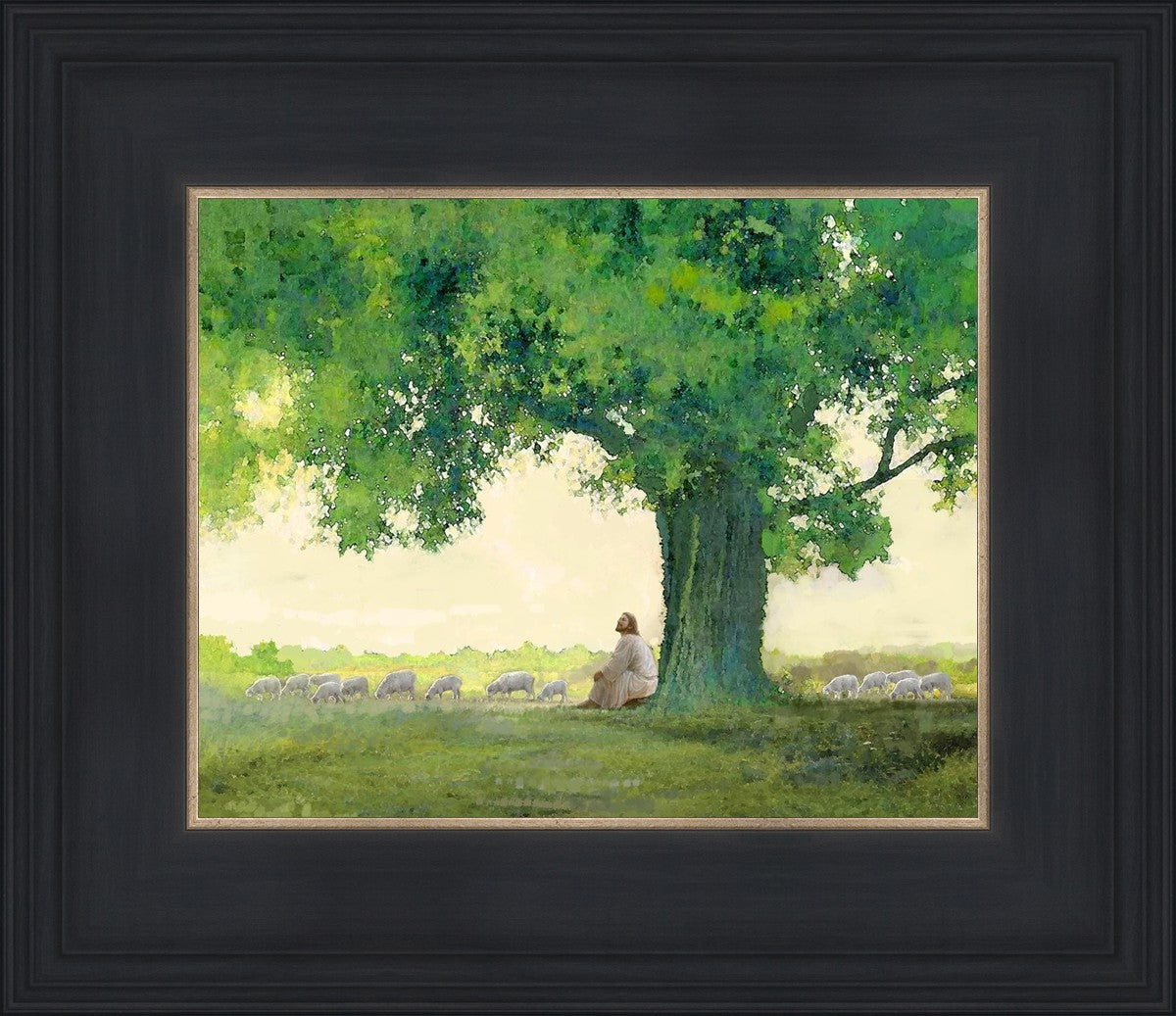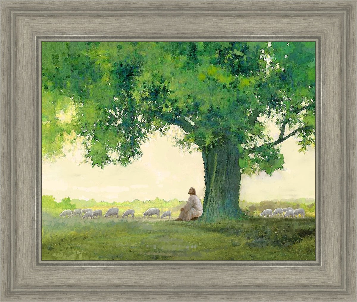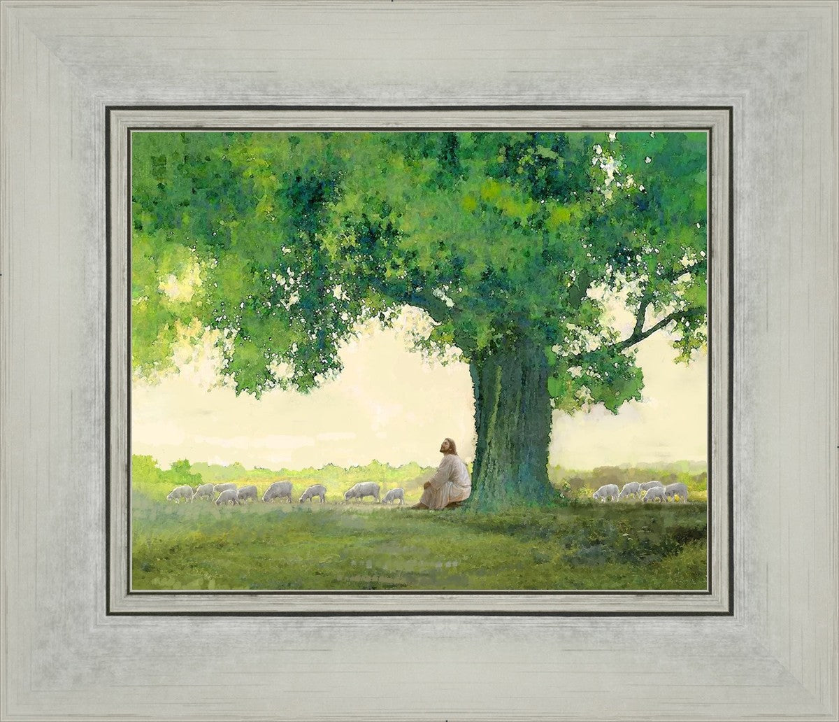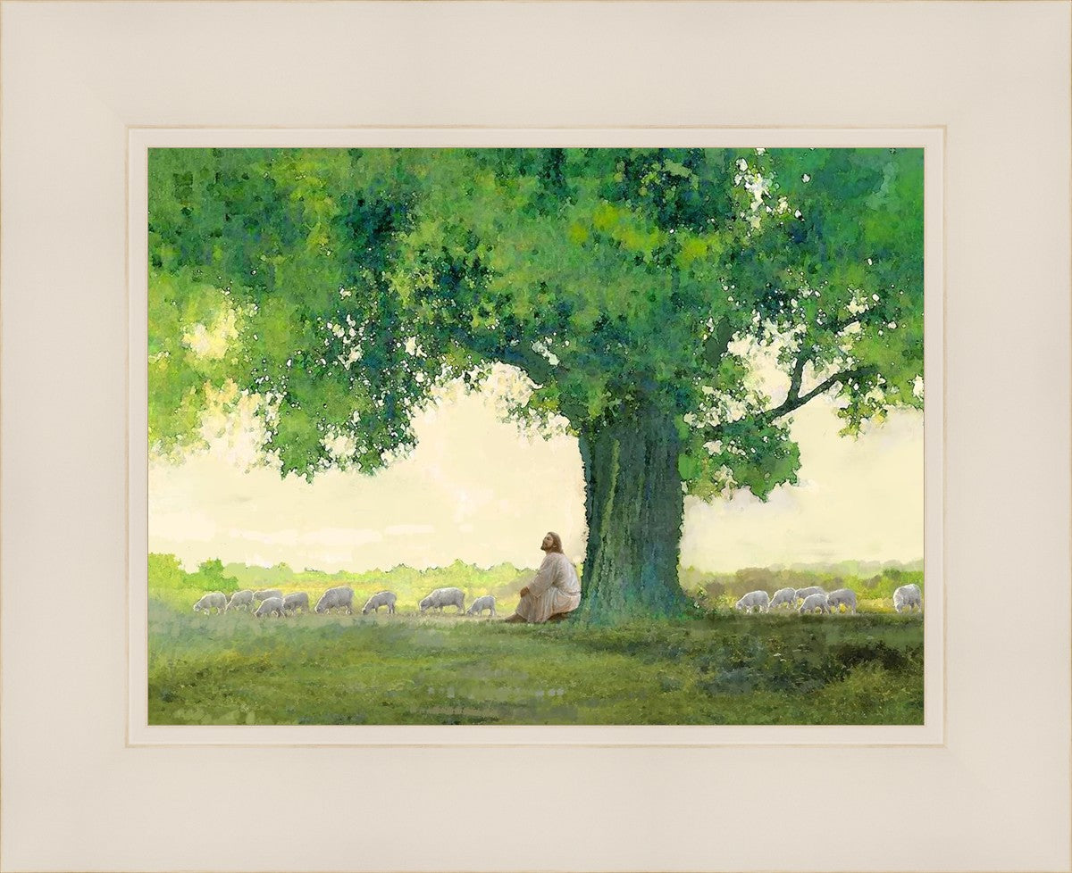 Morning Solace is a painting by Yongsung Kim. This painting depicts Jesus Christ sitting under a big green tree while watching His flock.