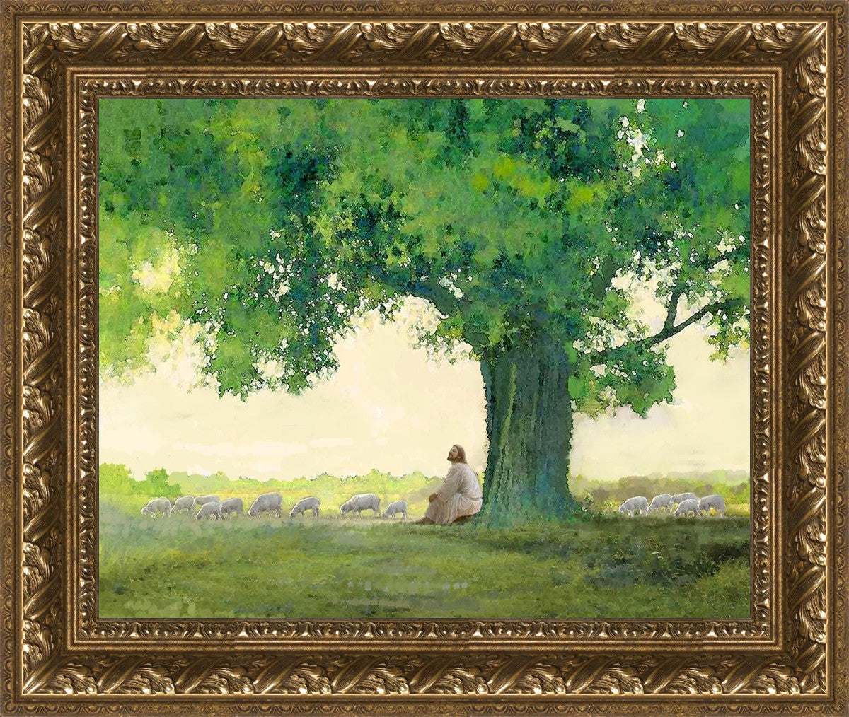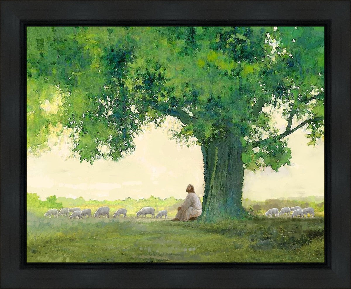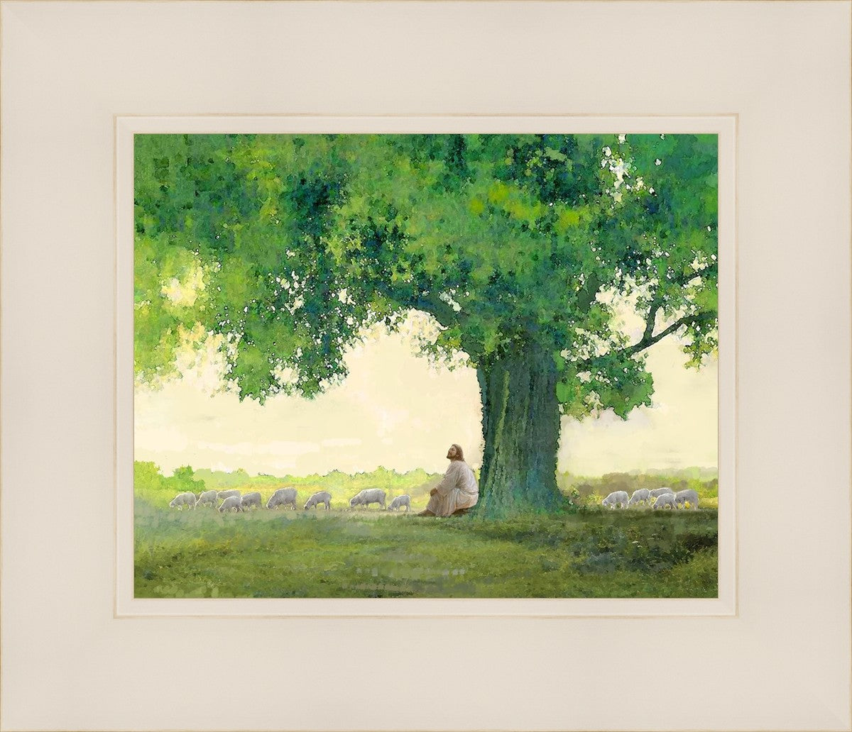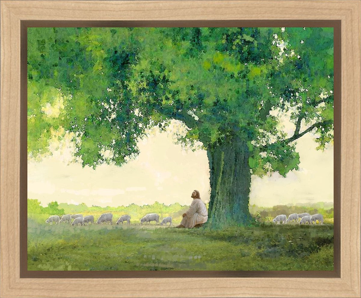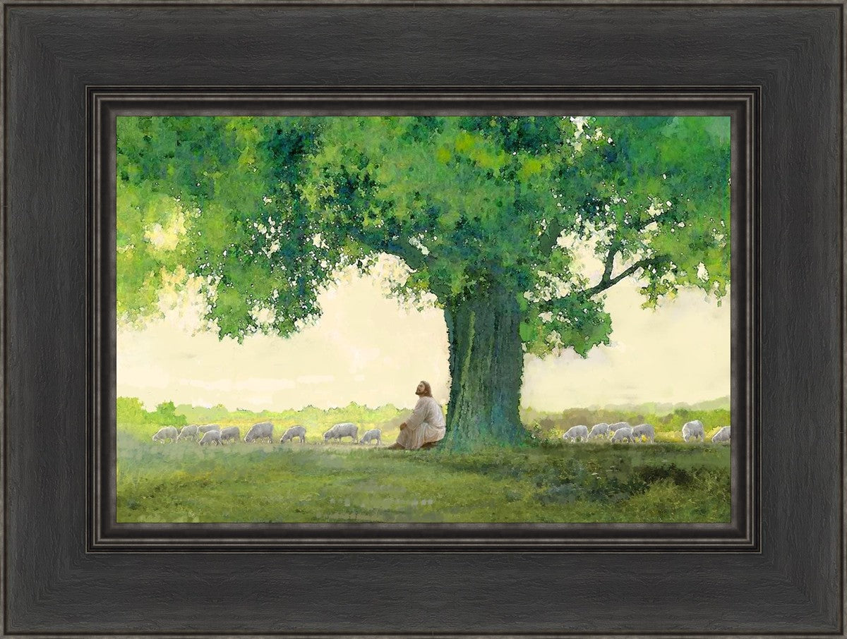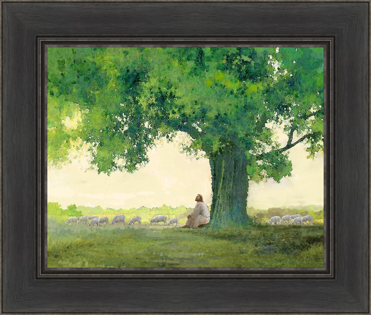 Morning Solace is a painting by Yongsung Kim. This painting depicts Jesus Christ sitting under a big green tree while watching His flock.