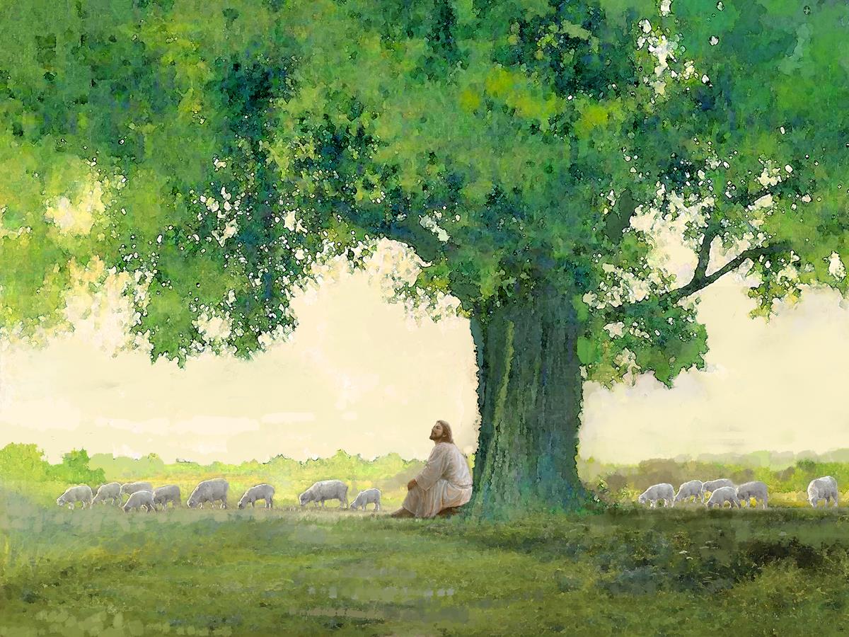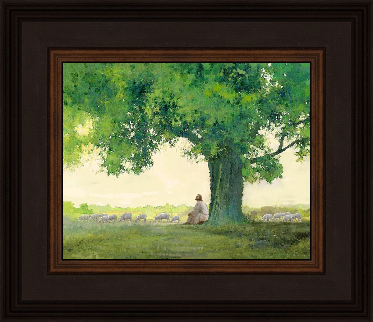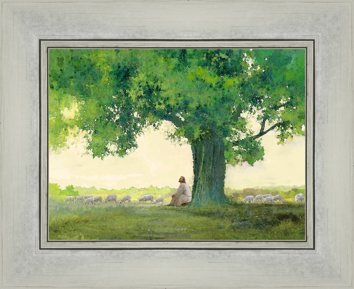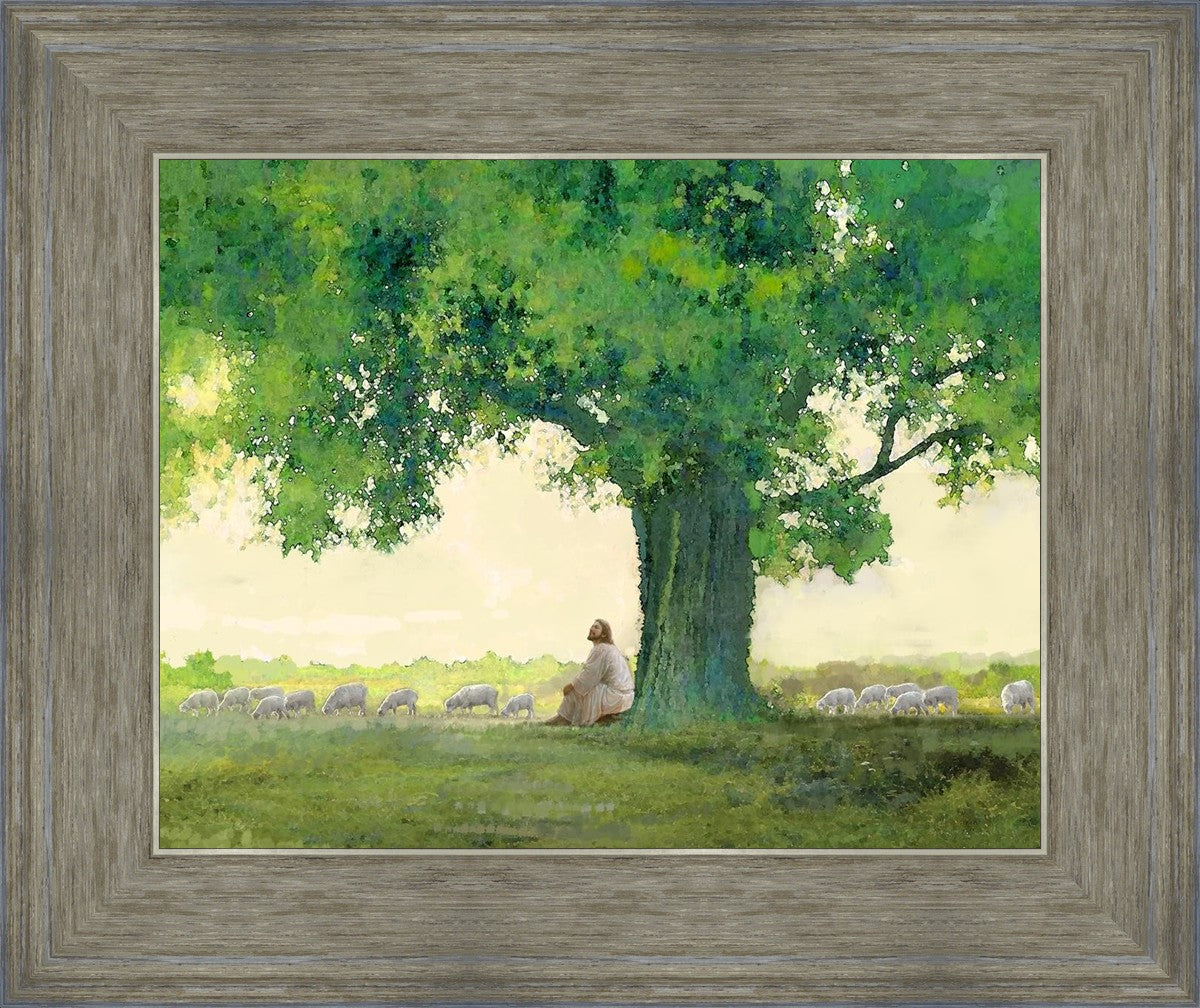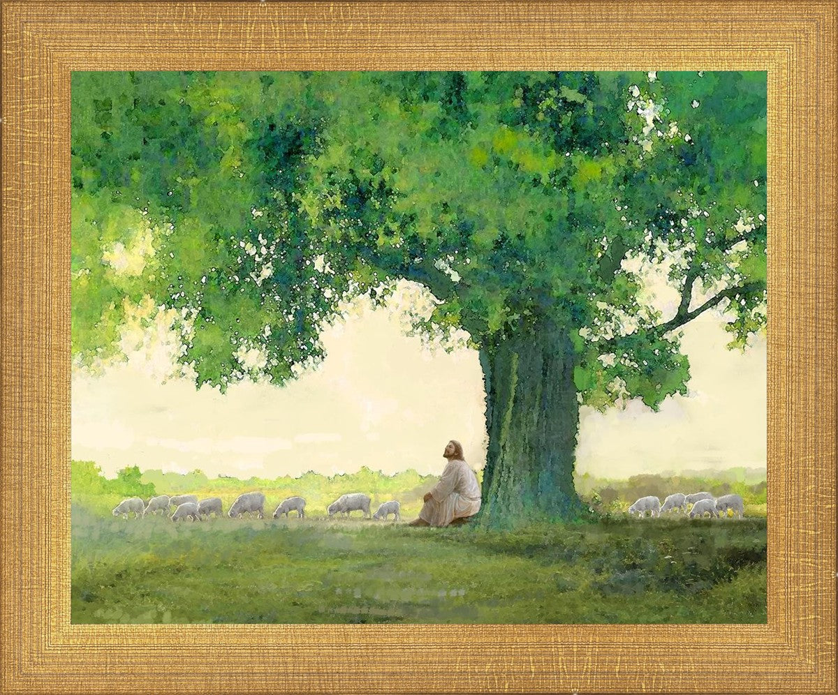 Morning Solace is a painting by Yongsung Kim. This painting depicts Jesus Christ sitting under a big green tree while watching His flock.