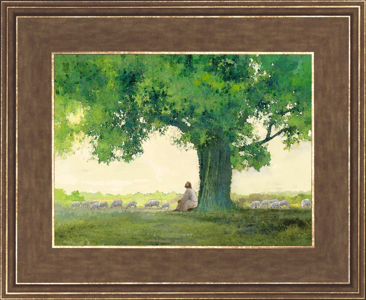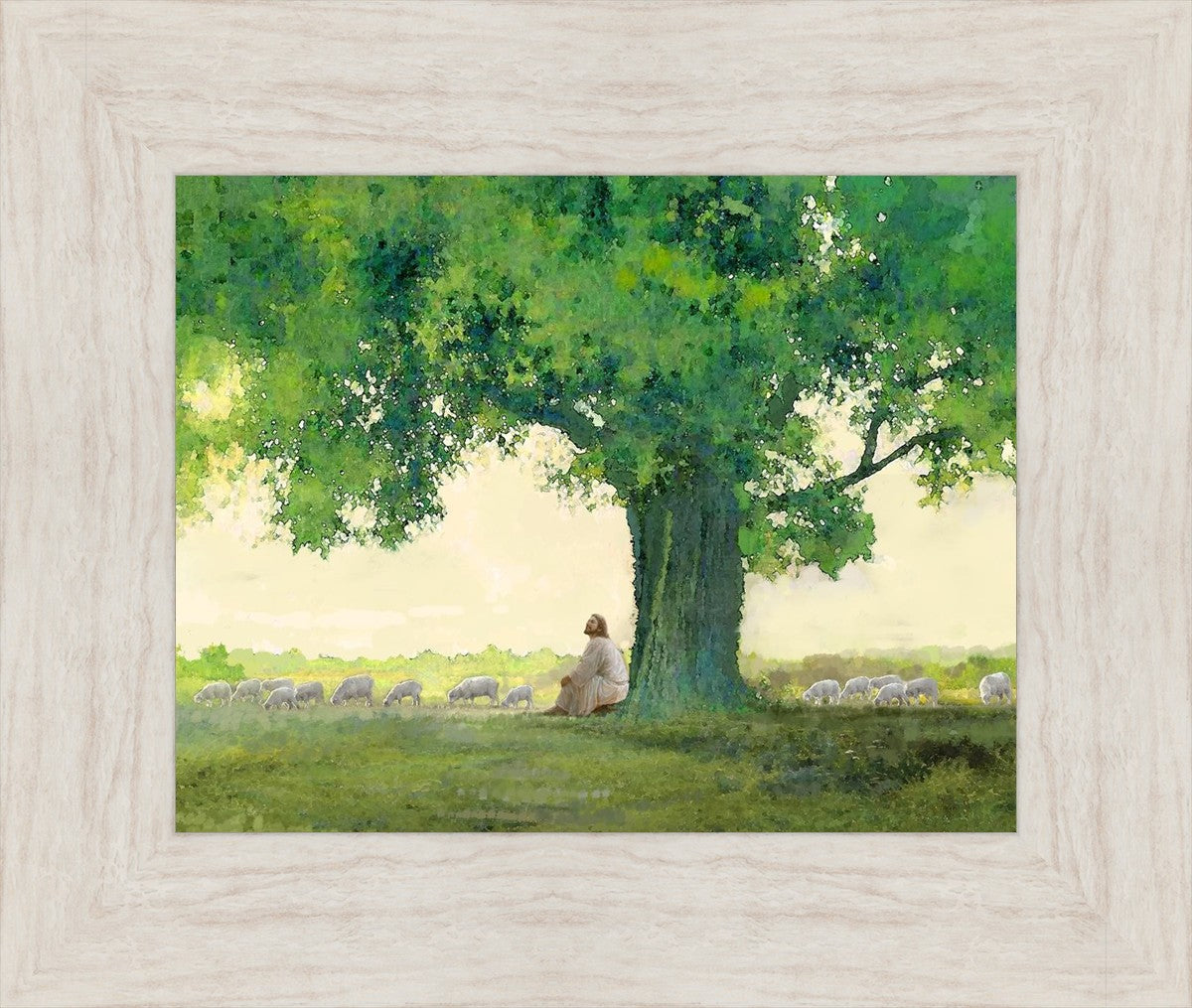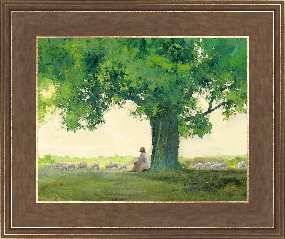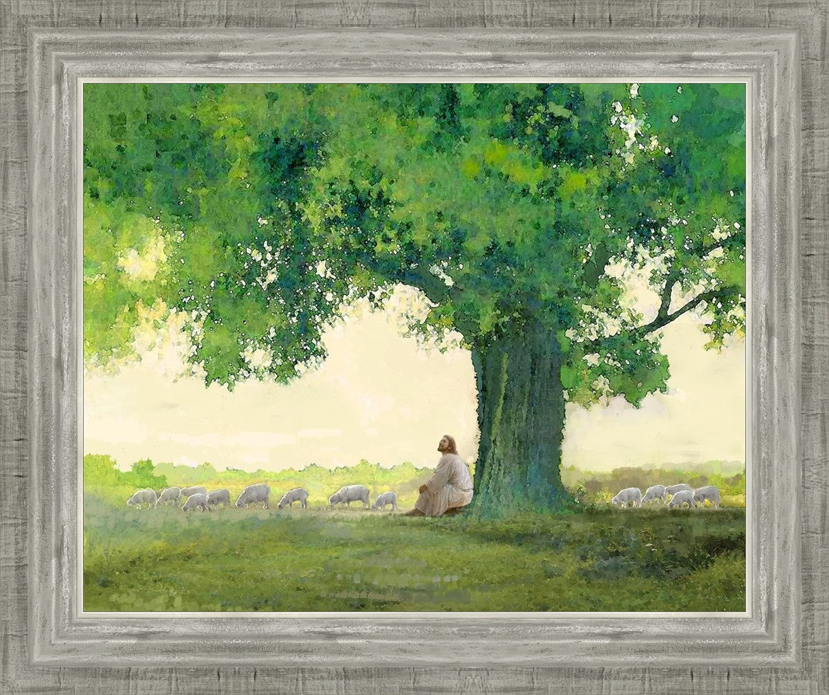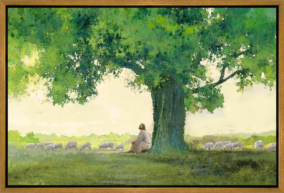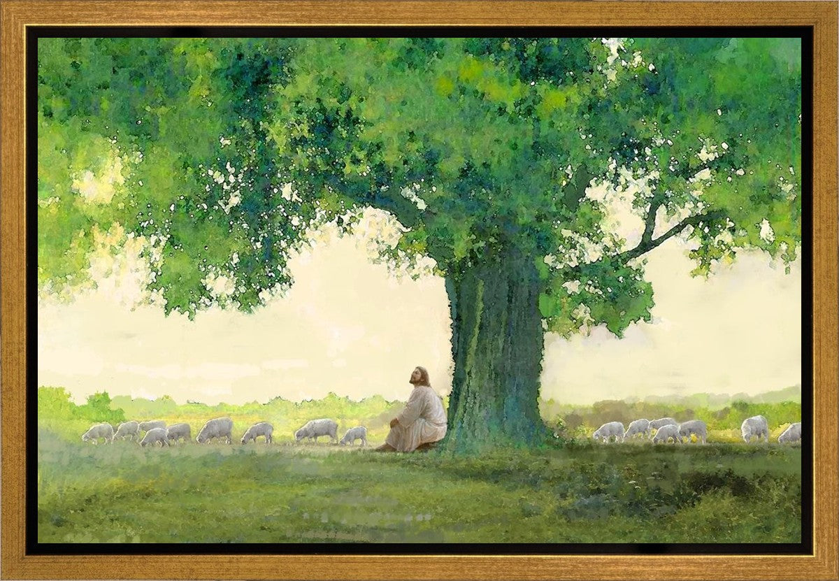 Morning Solace is a painting by Yongsung Kim. This painting depicts Jesus Christ sitting under a big green tree while watching His flock.