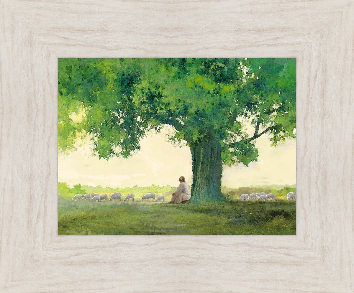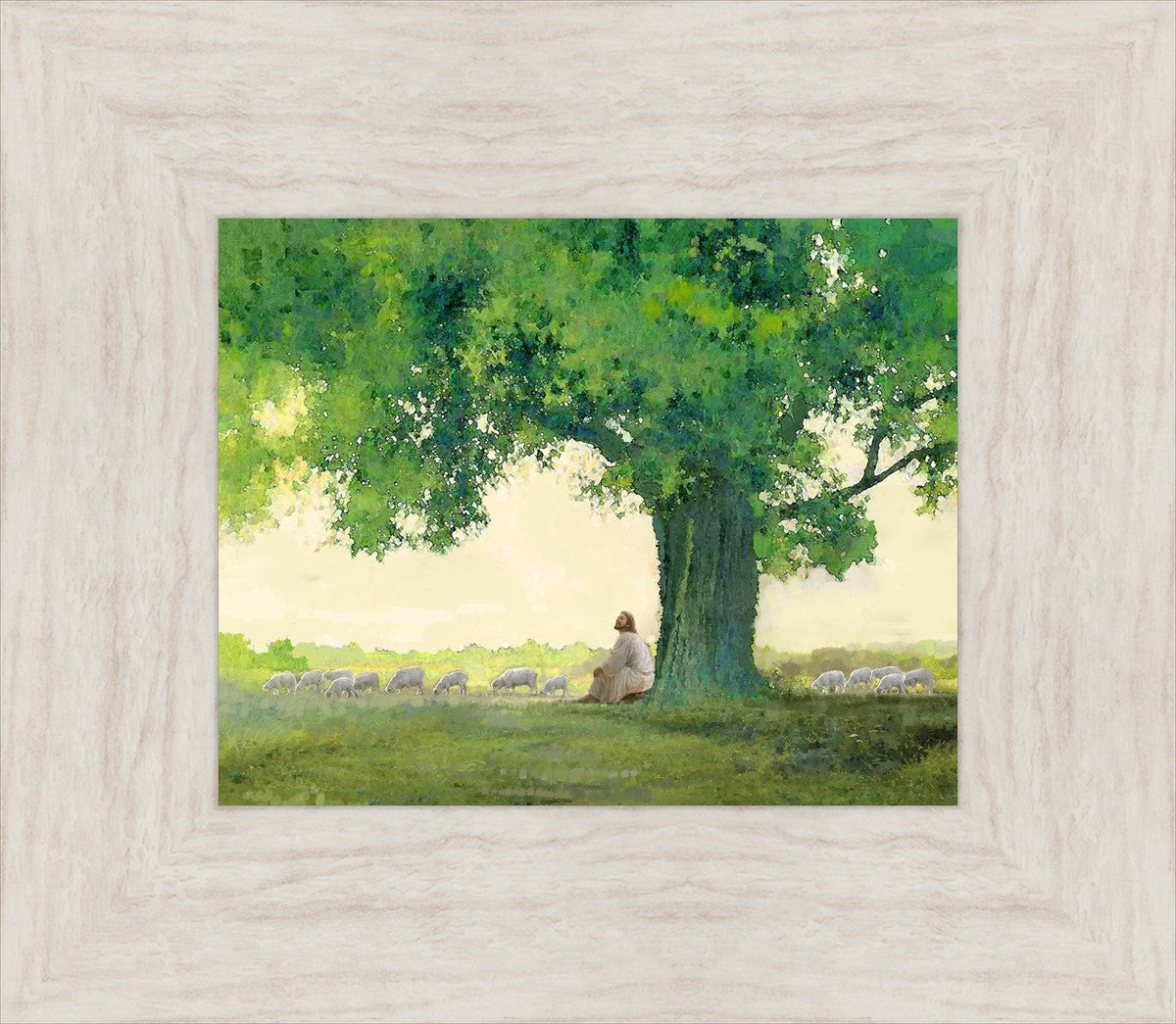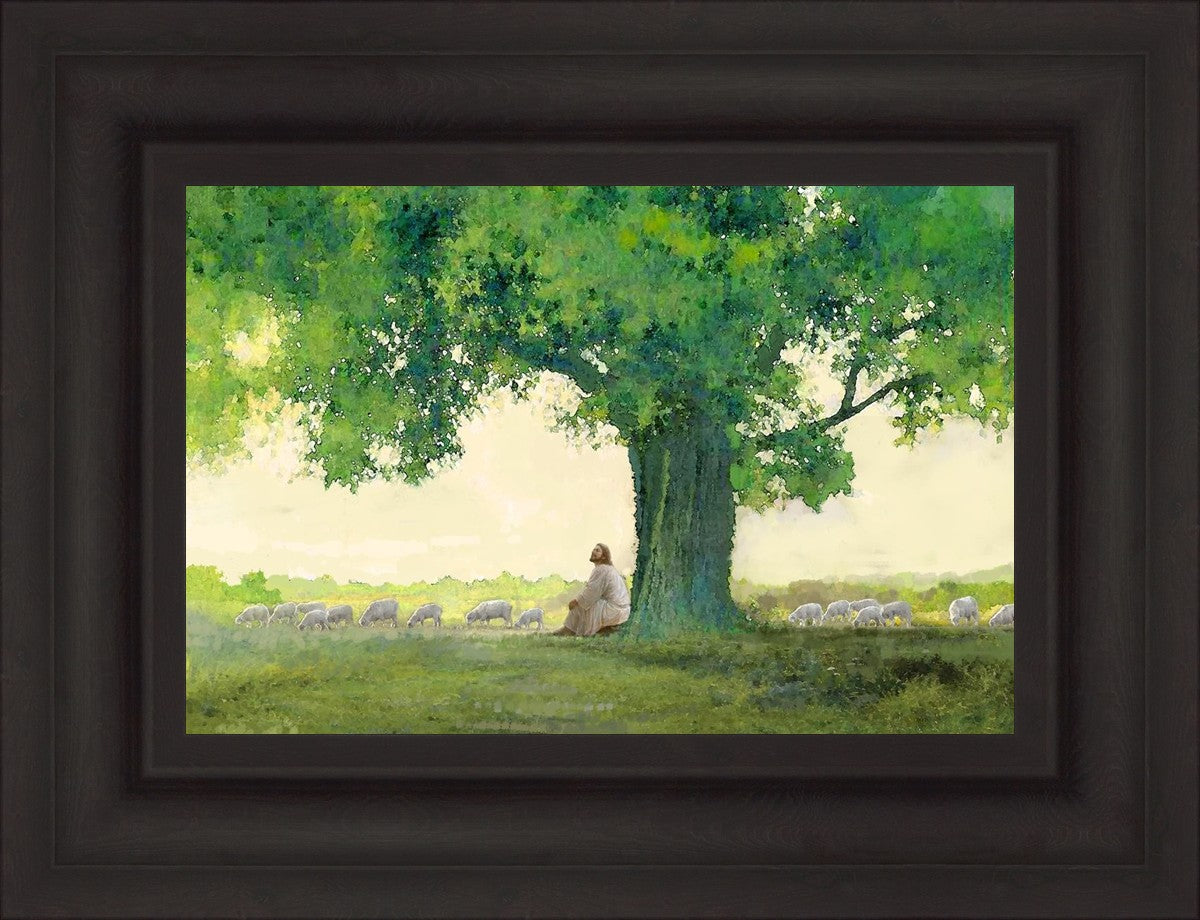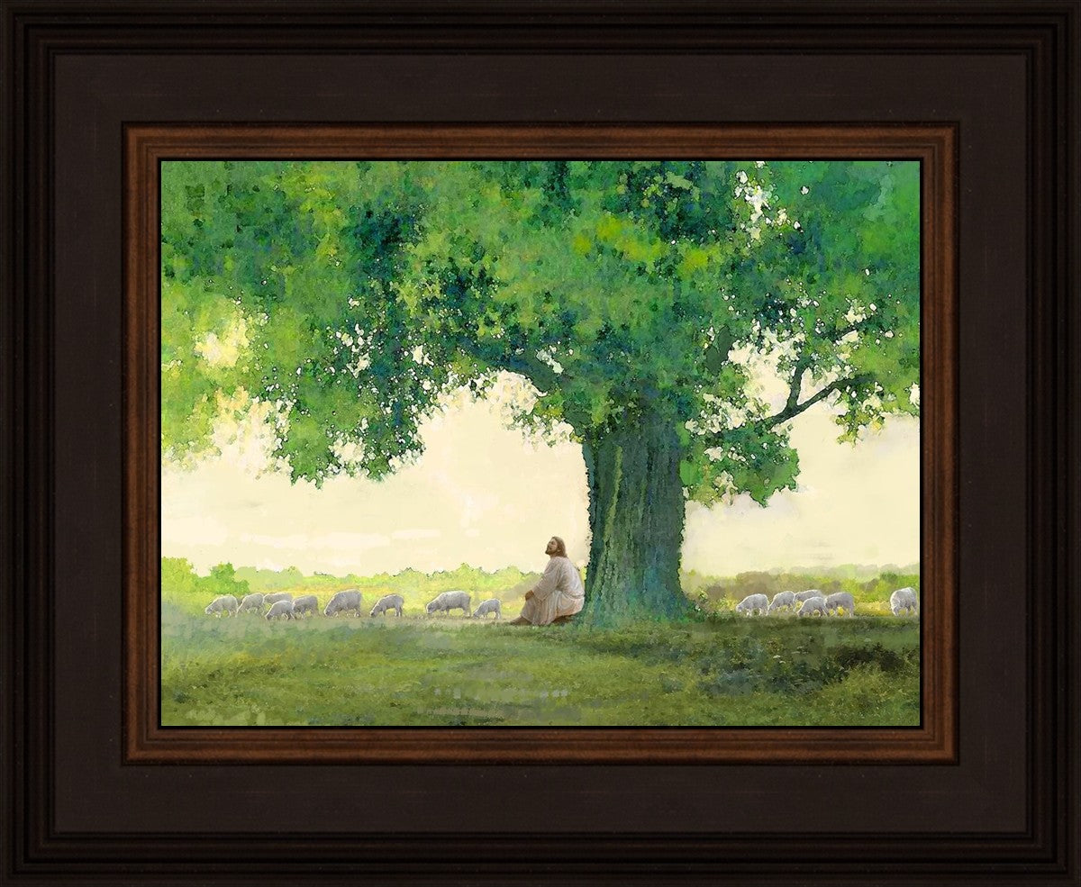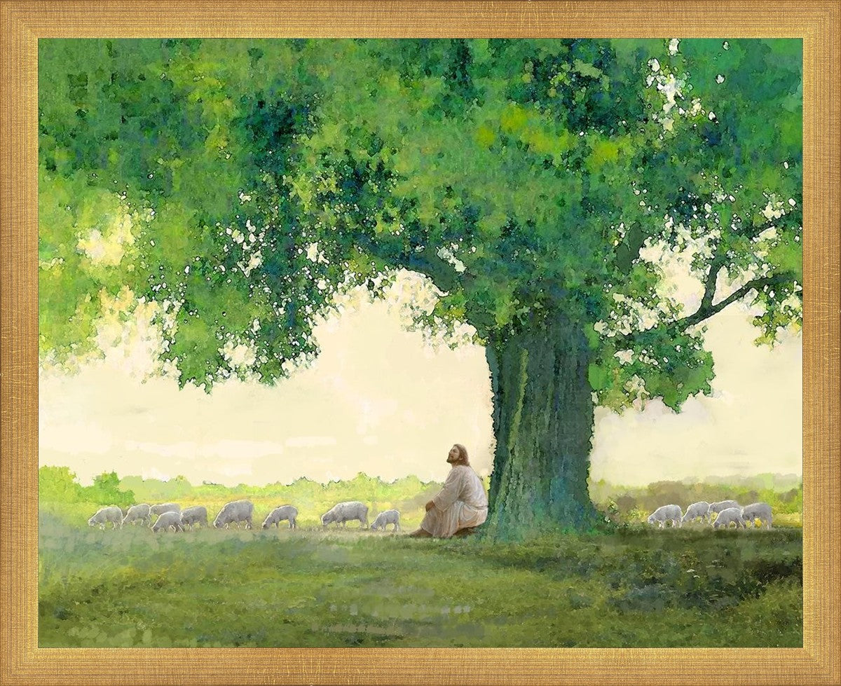 Morning Solace is a painting by Yongsung Kim. This painting depicts Jesus Christ sitting under a big green tree while watching His flock.