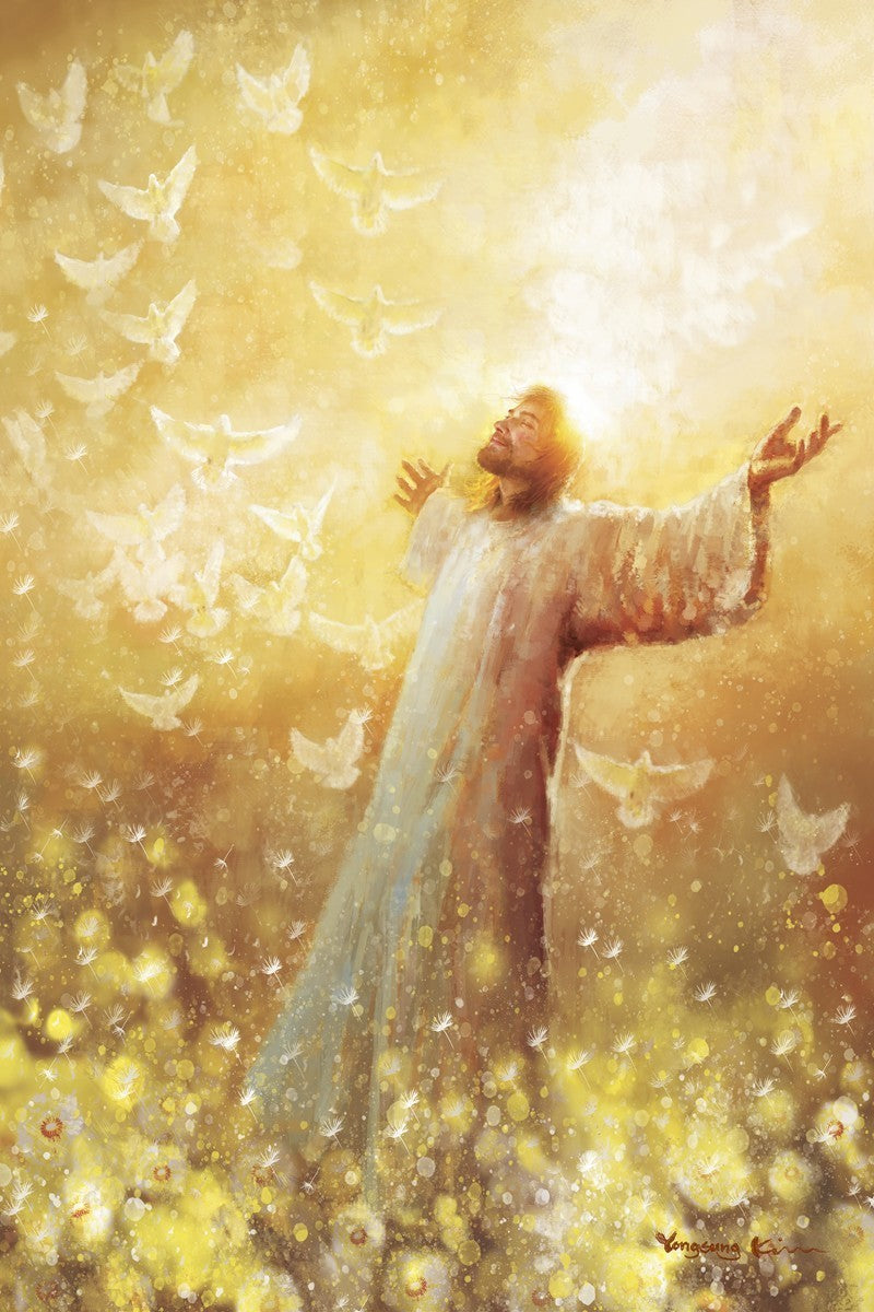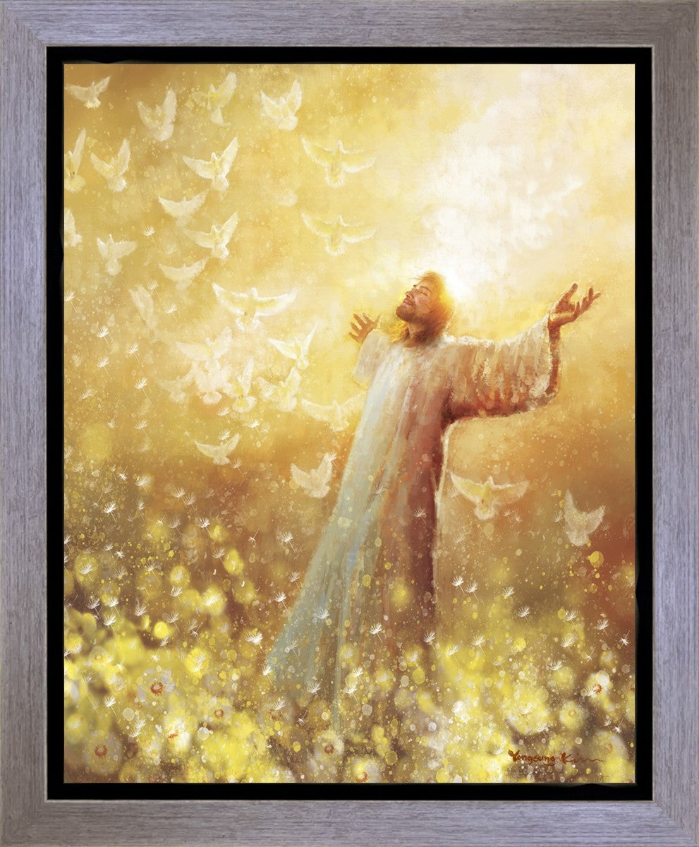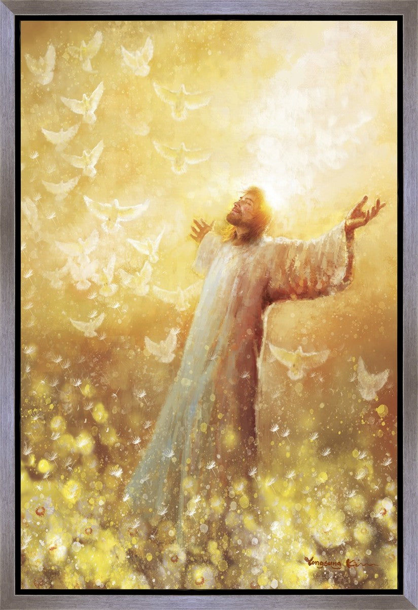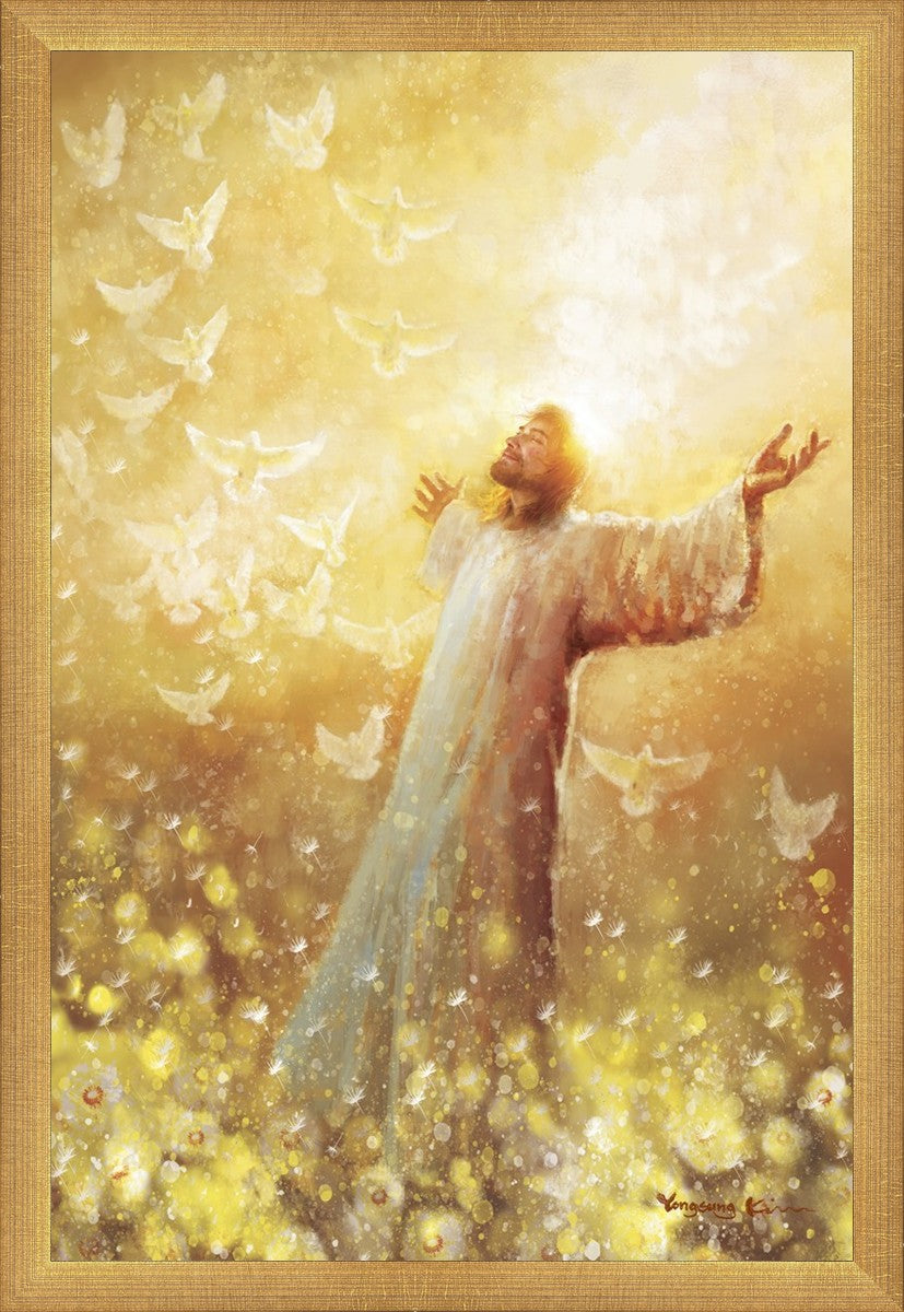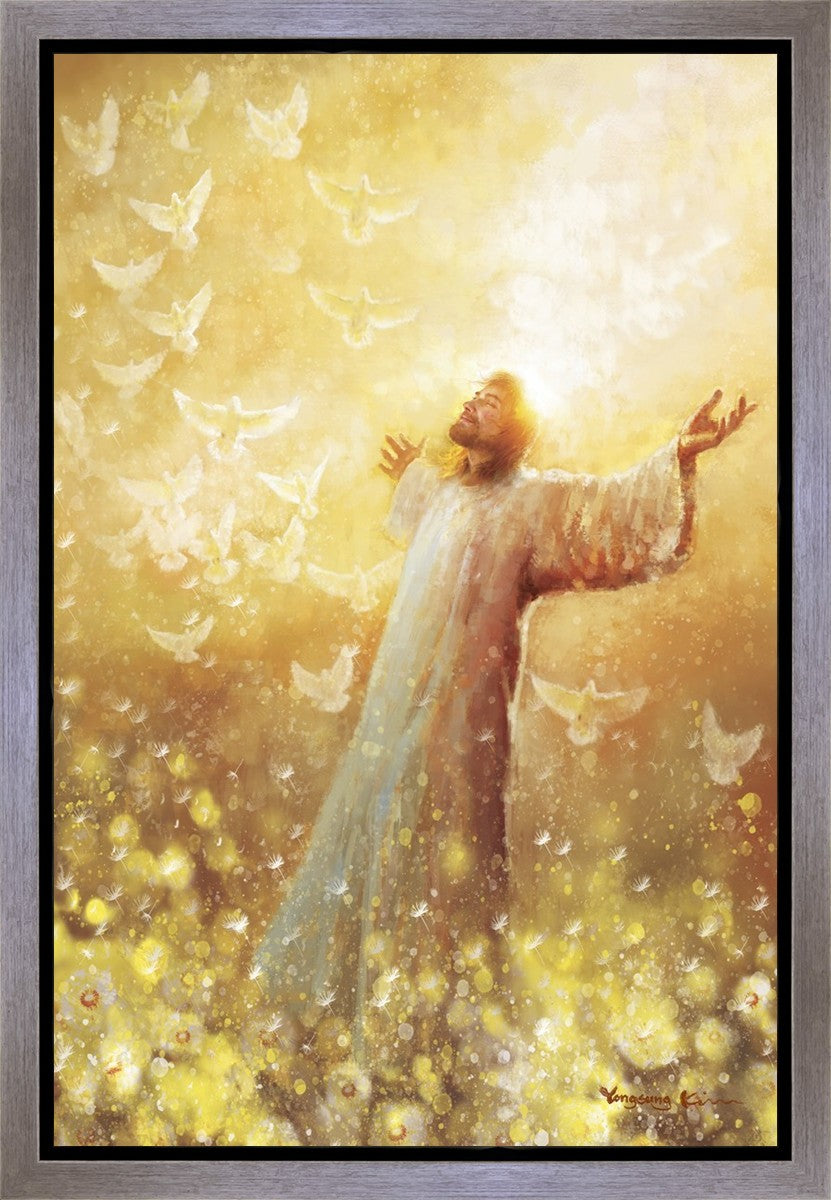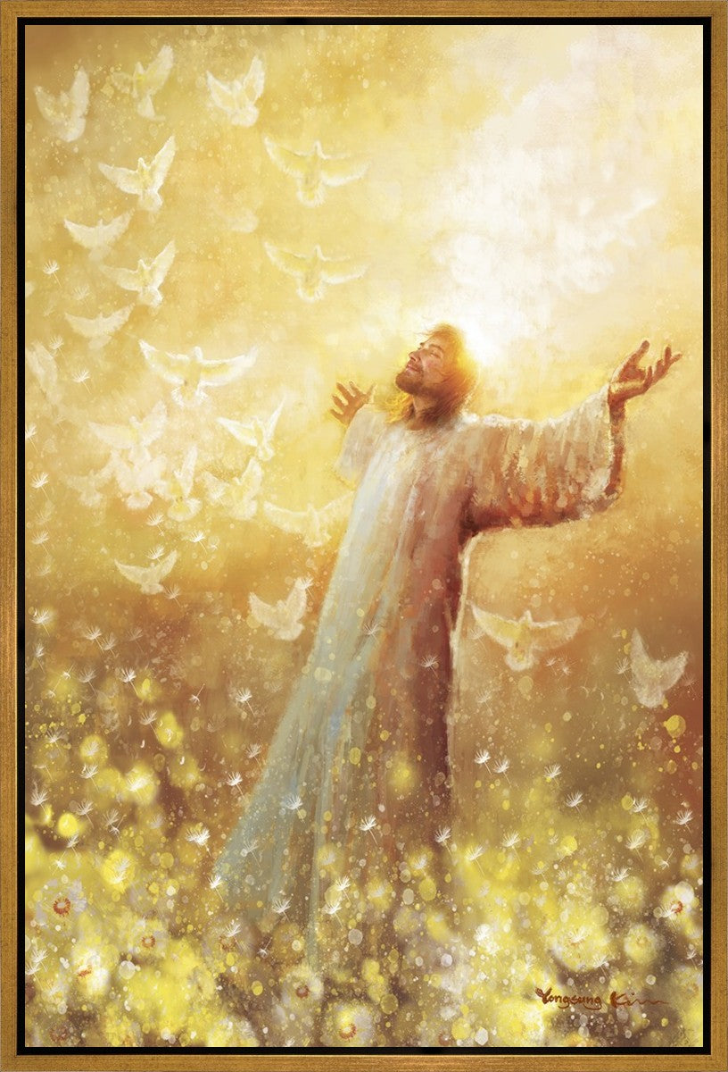 Oh Lord" by Yongsung Kim is a captivating painting portraying Christ standing in a field of flowers, with doves flying overhead, symbolizing peace and divine presence.