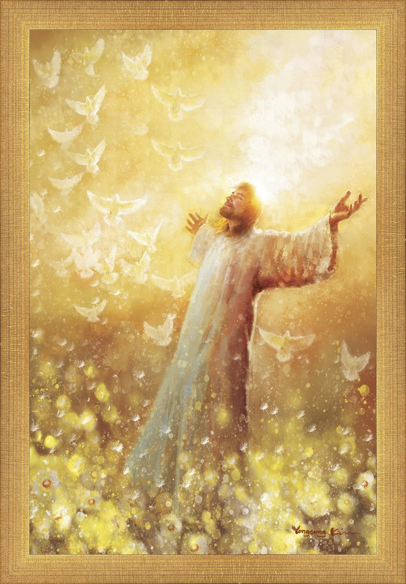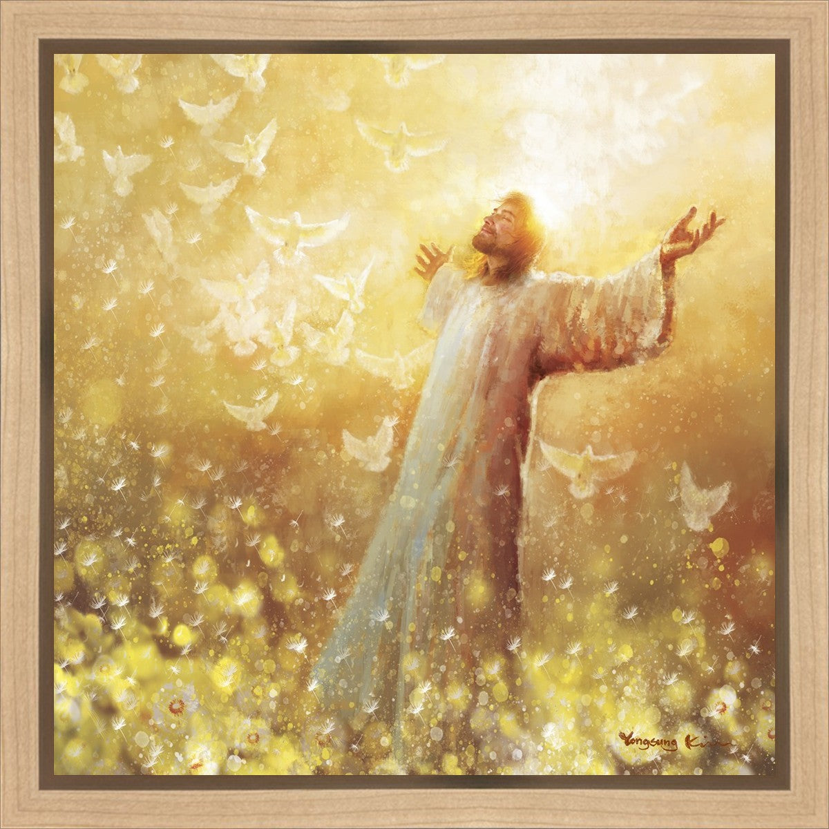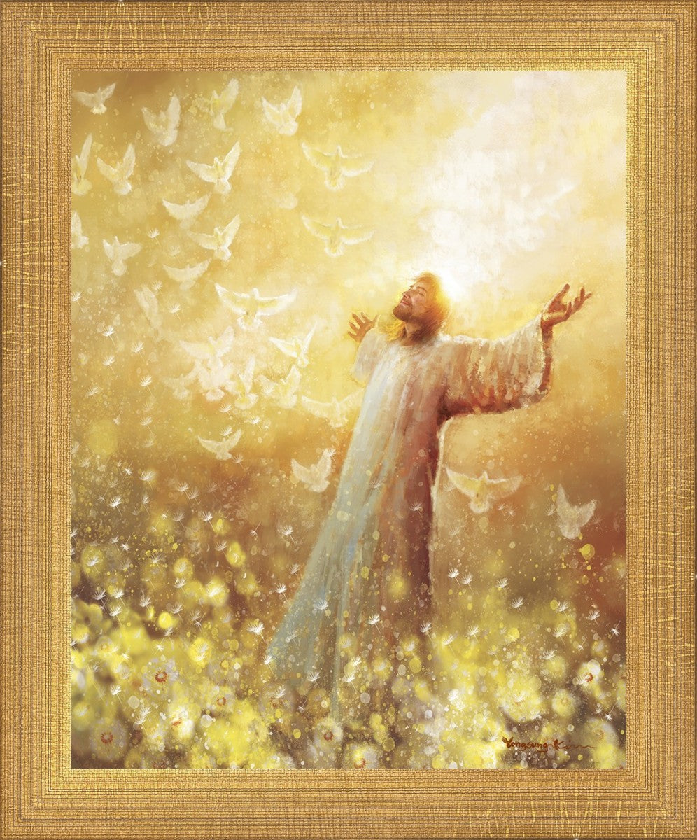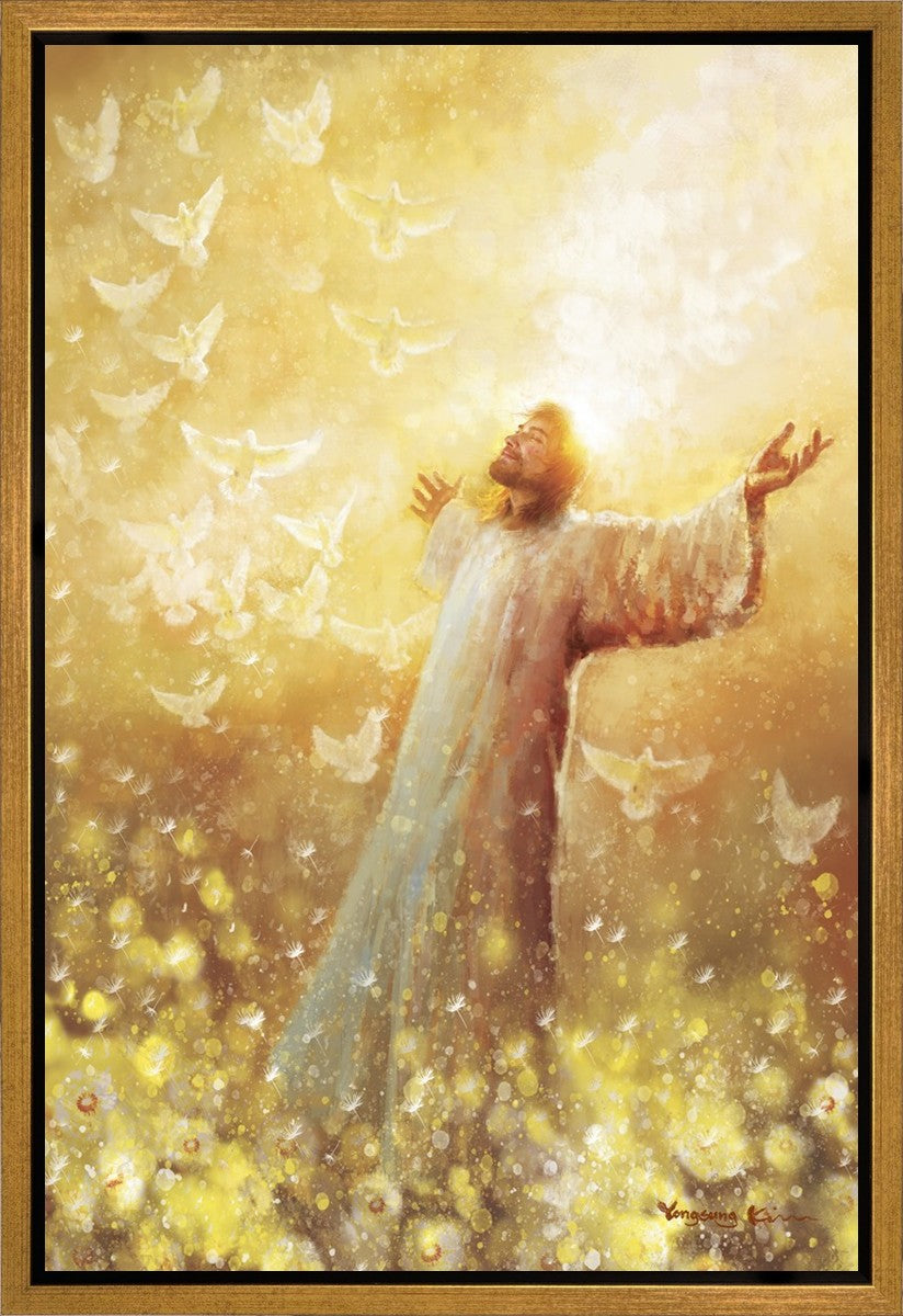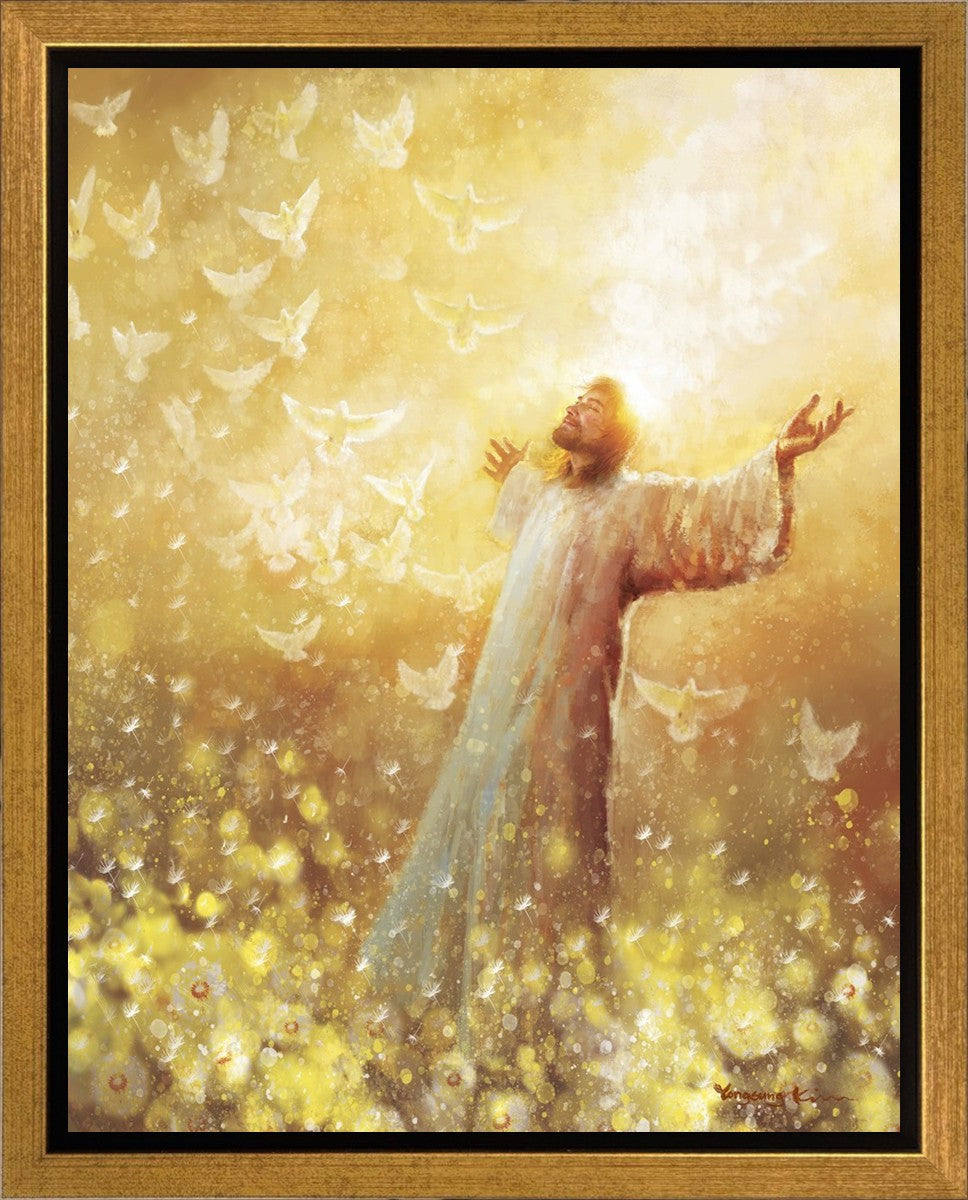 Oh Lord" by Yongsung Kim is a captivating painting portraying Christ standing in a field of flowers, with doves flying overhead, symbolizing peace and divine presence.