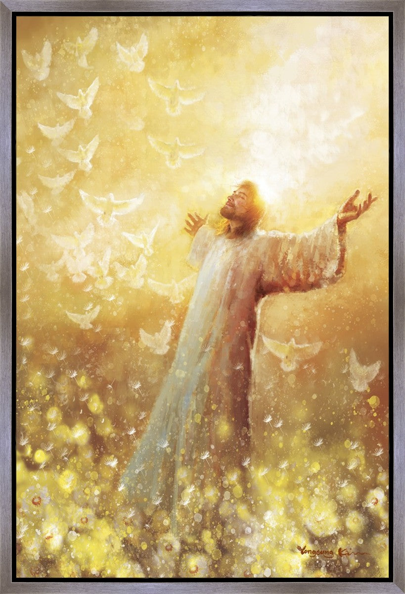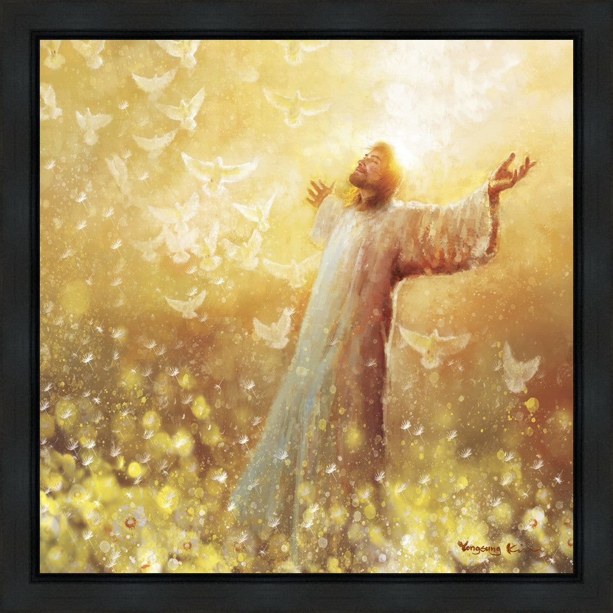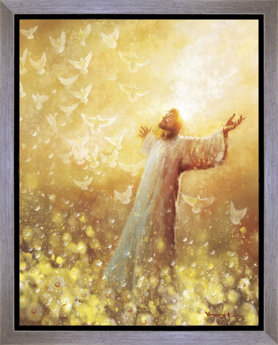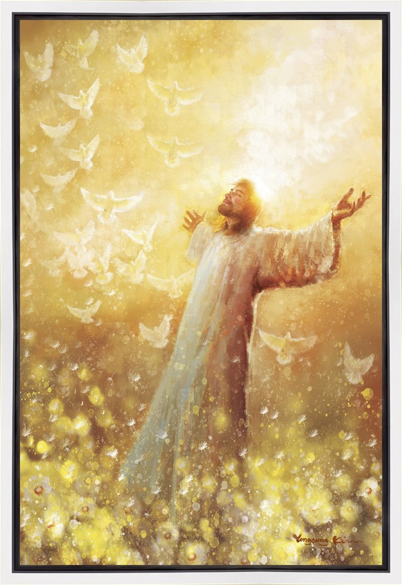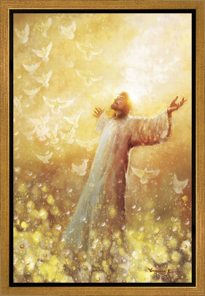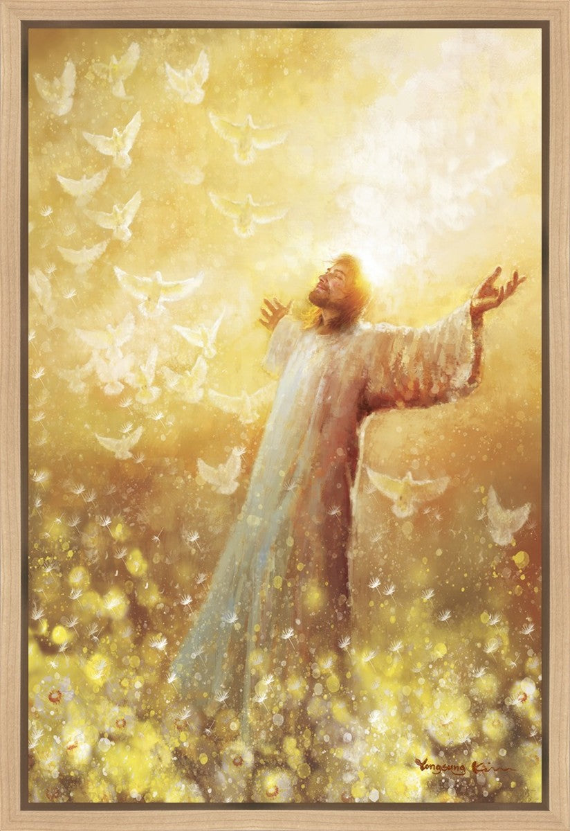 Oh Lord" by Yongsung Kim is a captivating painting portraying Christ standing in a field of flowers, with doves flying overhead, symbolizing peace and divine presence.