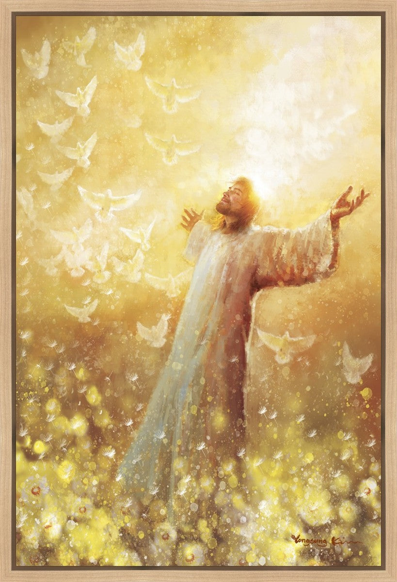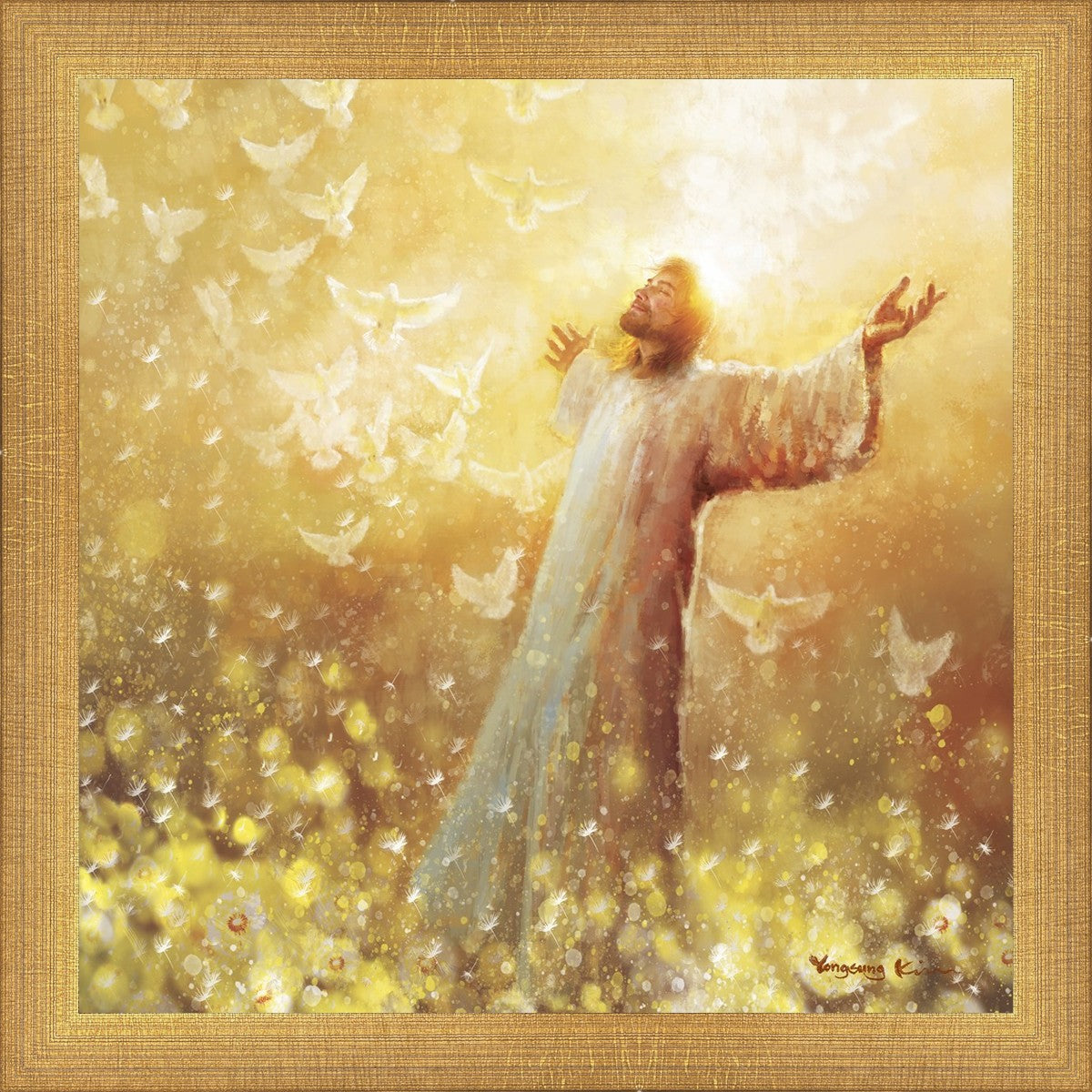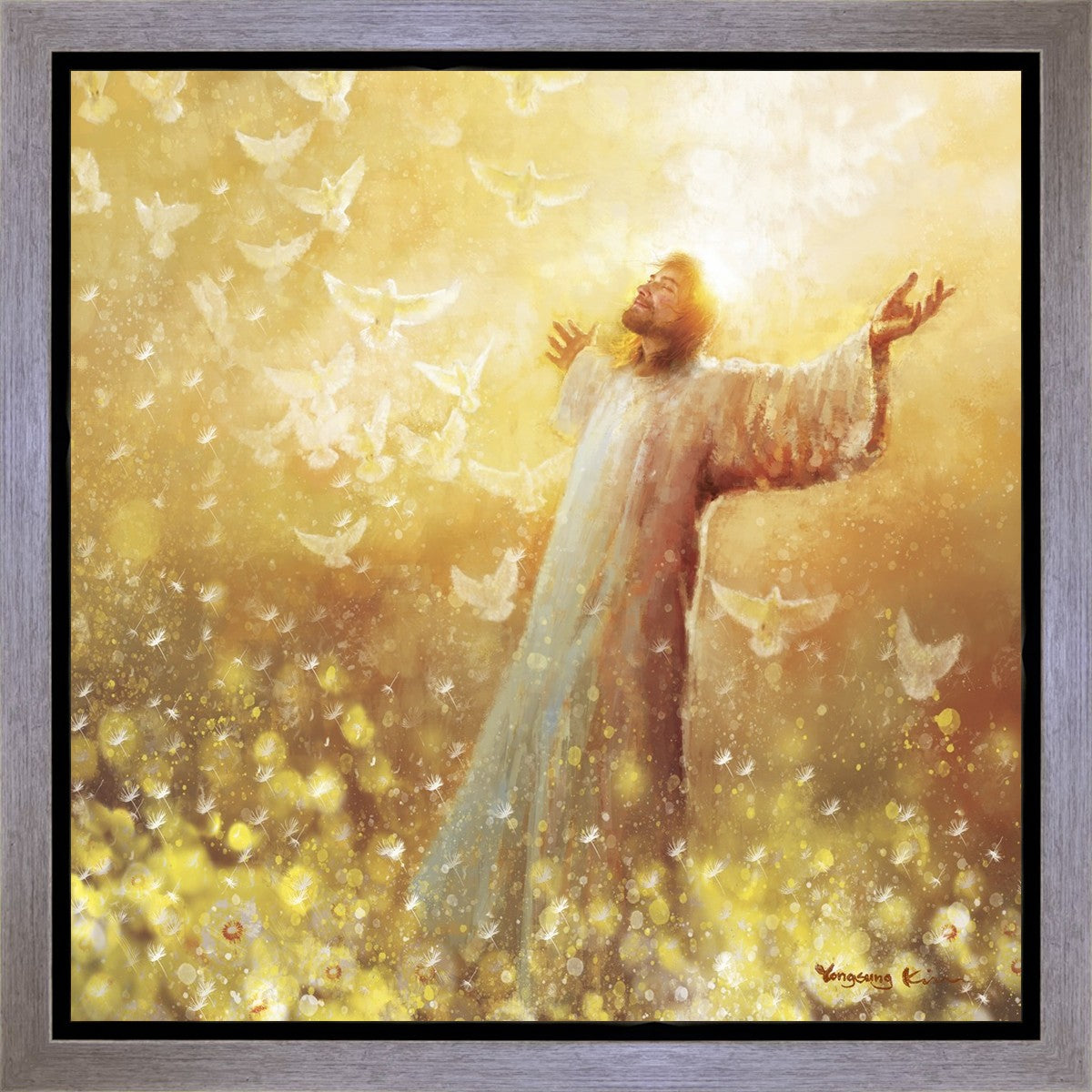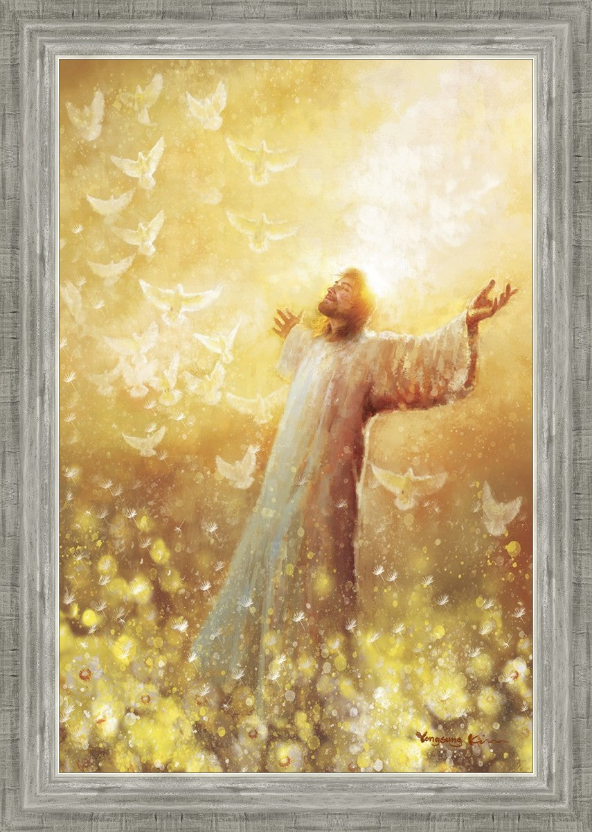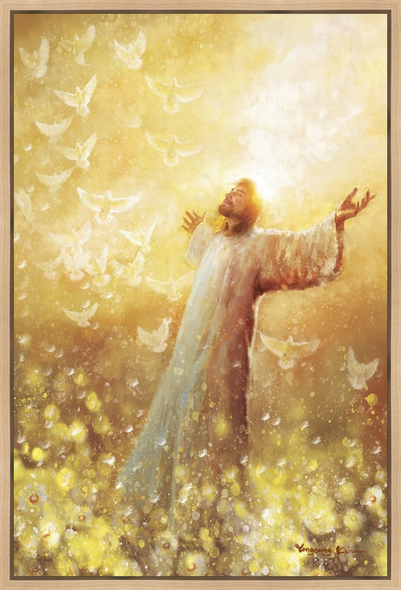 Oh Lord" by Yongsung Kim is a captivating painting portraying Christ standing in a field of flowers, with doves flying overhead, symbolizing peace and divine presence.