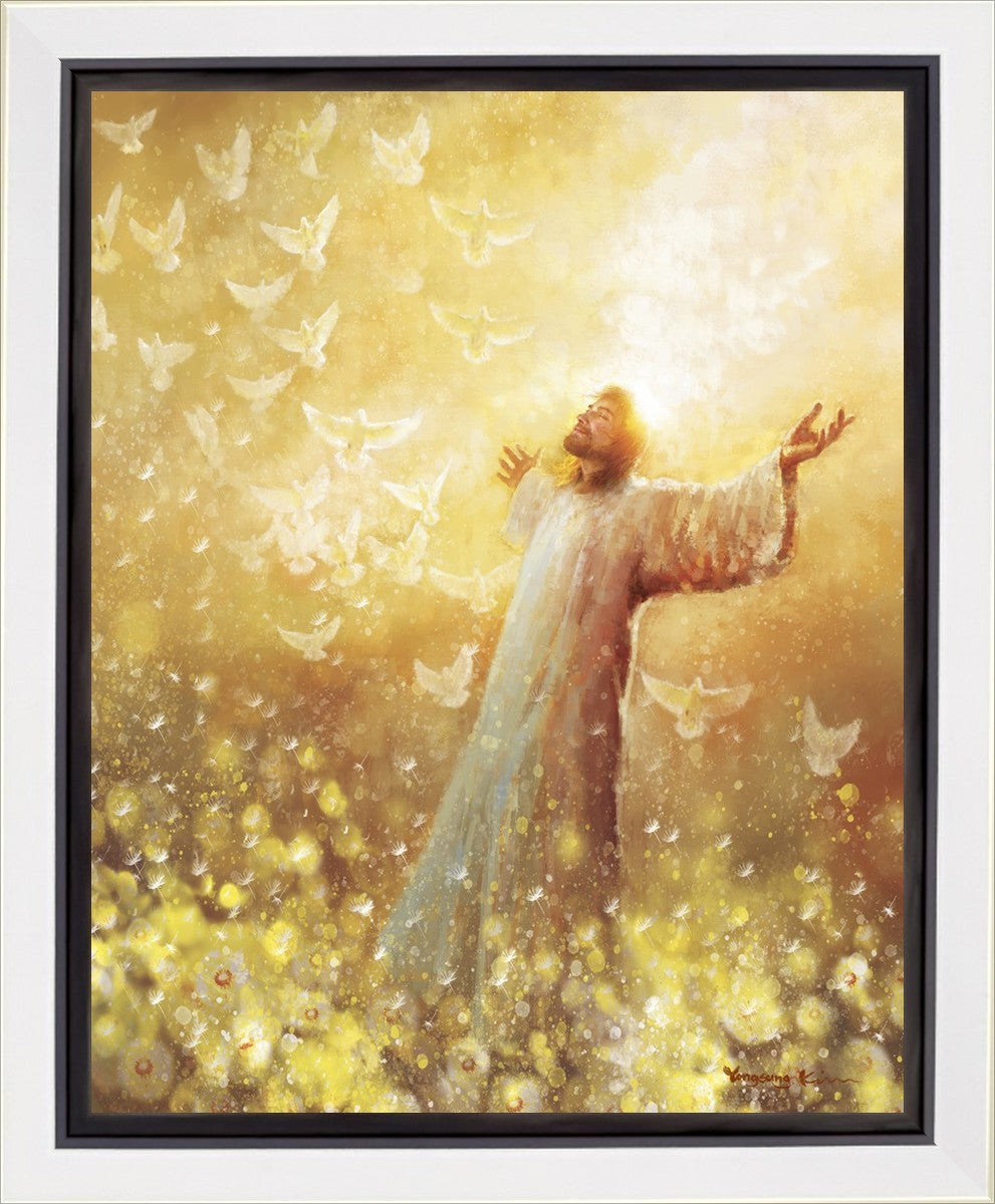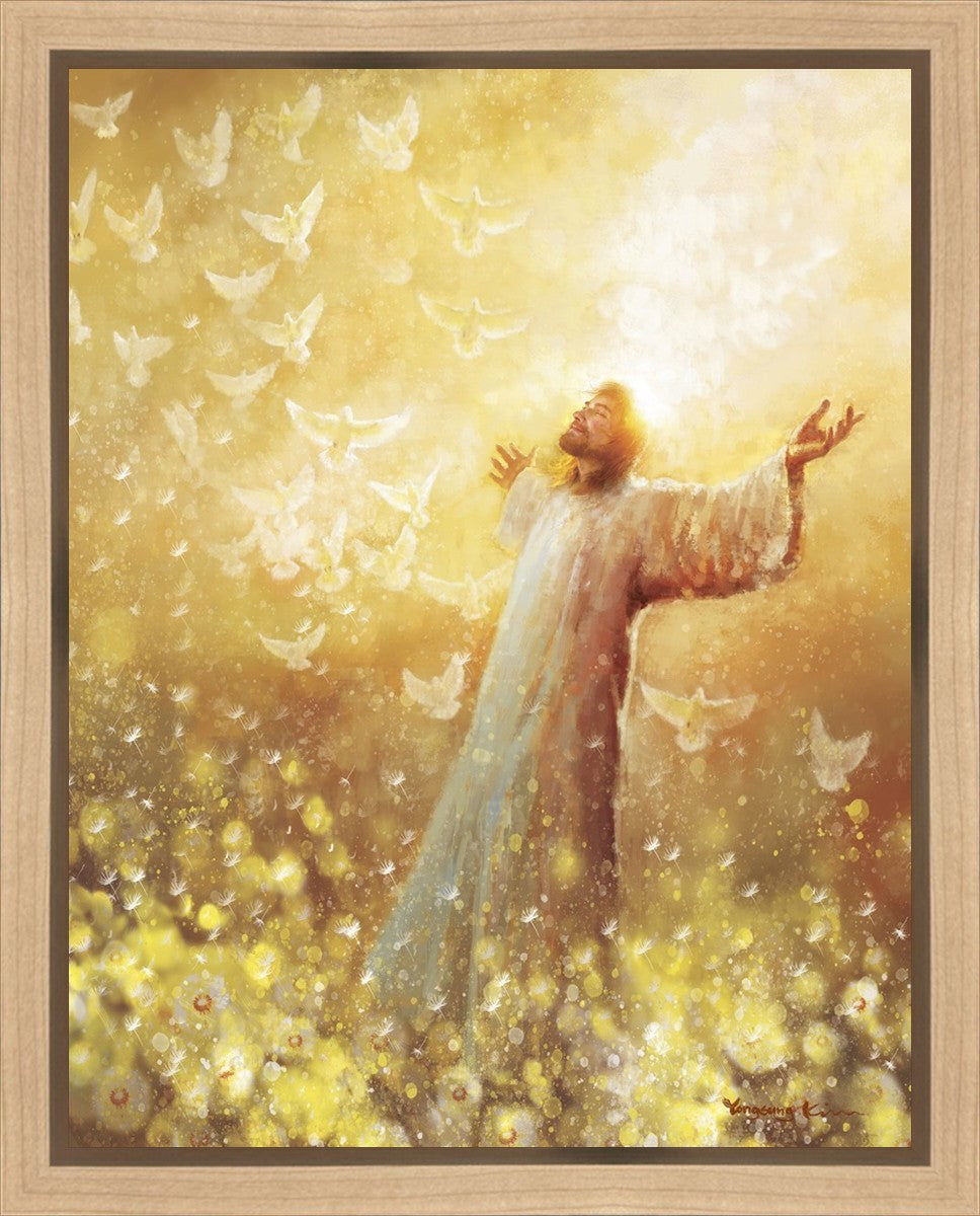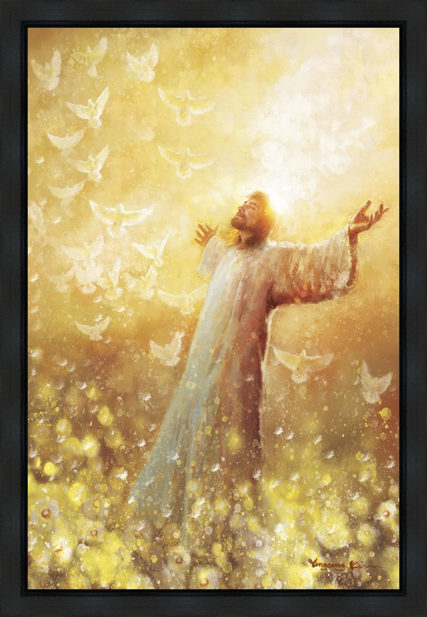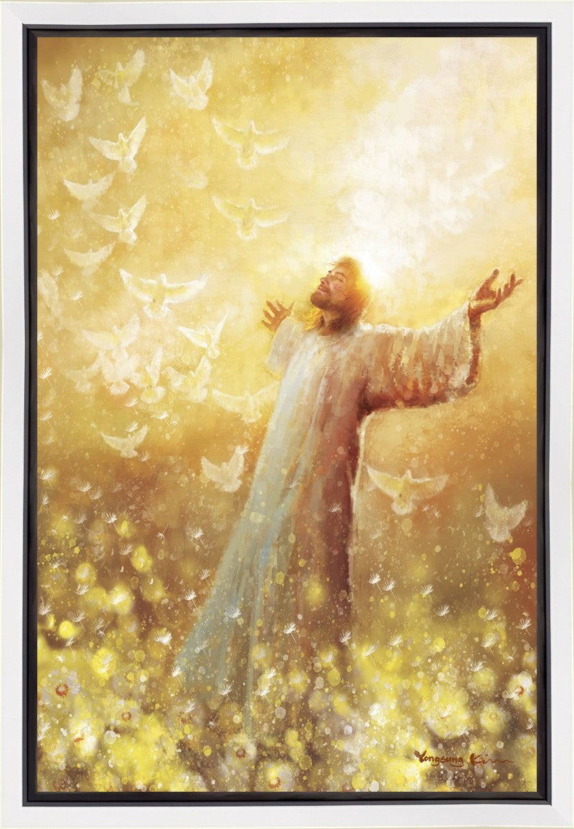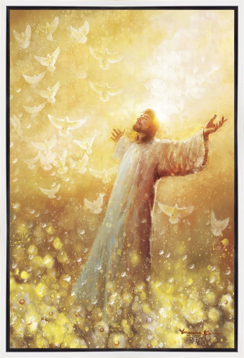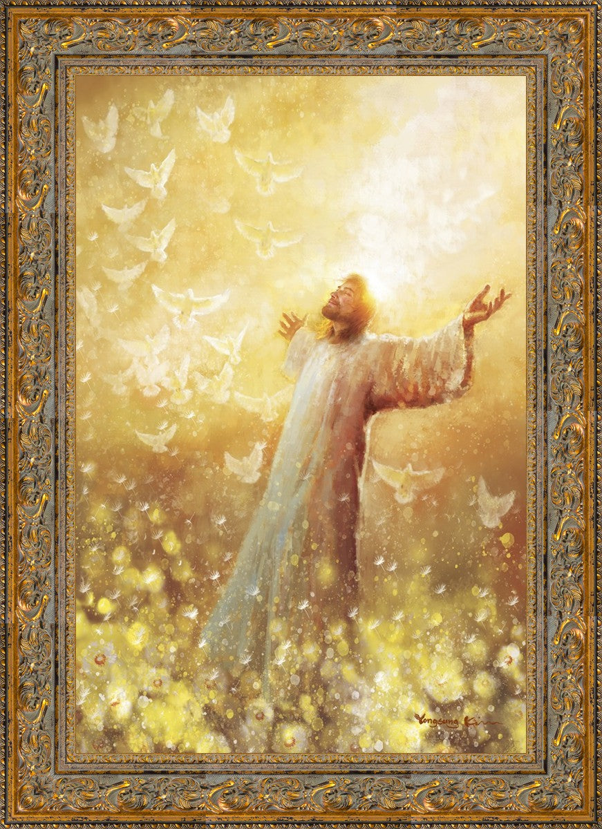Oh Lord" by Yongsung Kim is a captivating painting portraying Christ standing in a field of flowers, with doves flying overhead, symbolizing peace and divine presence.