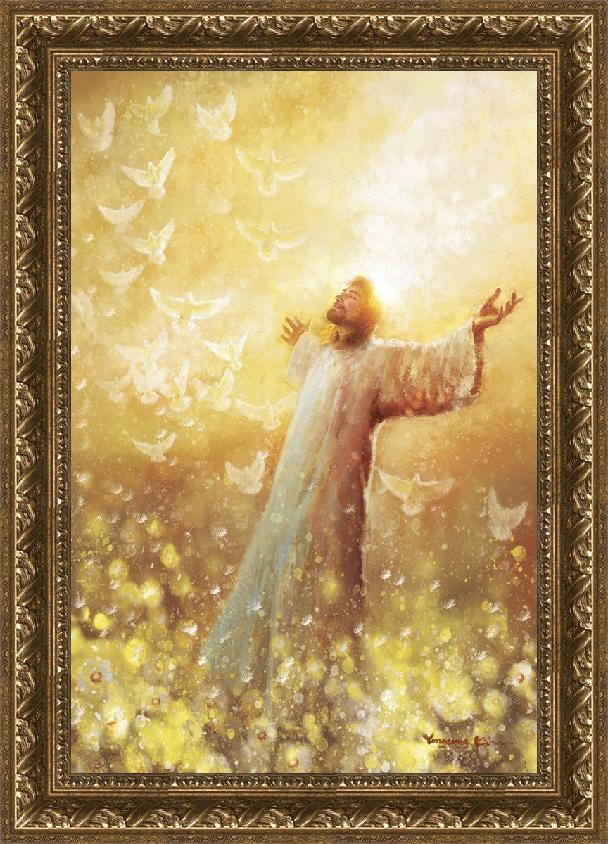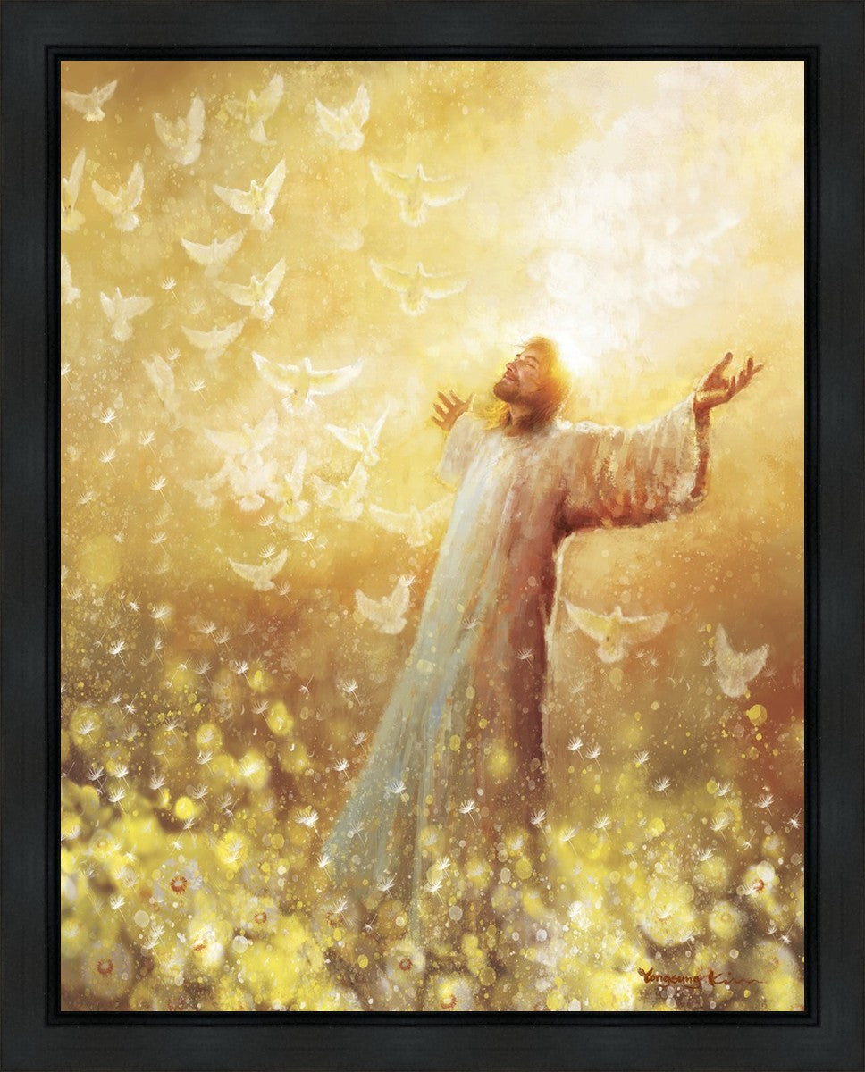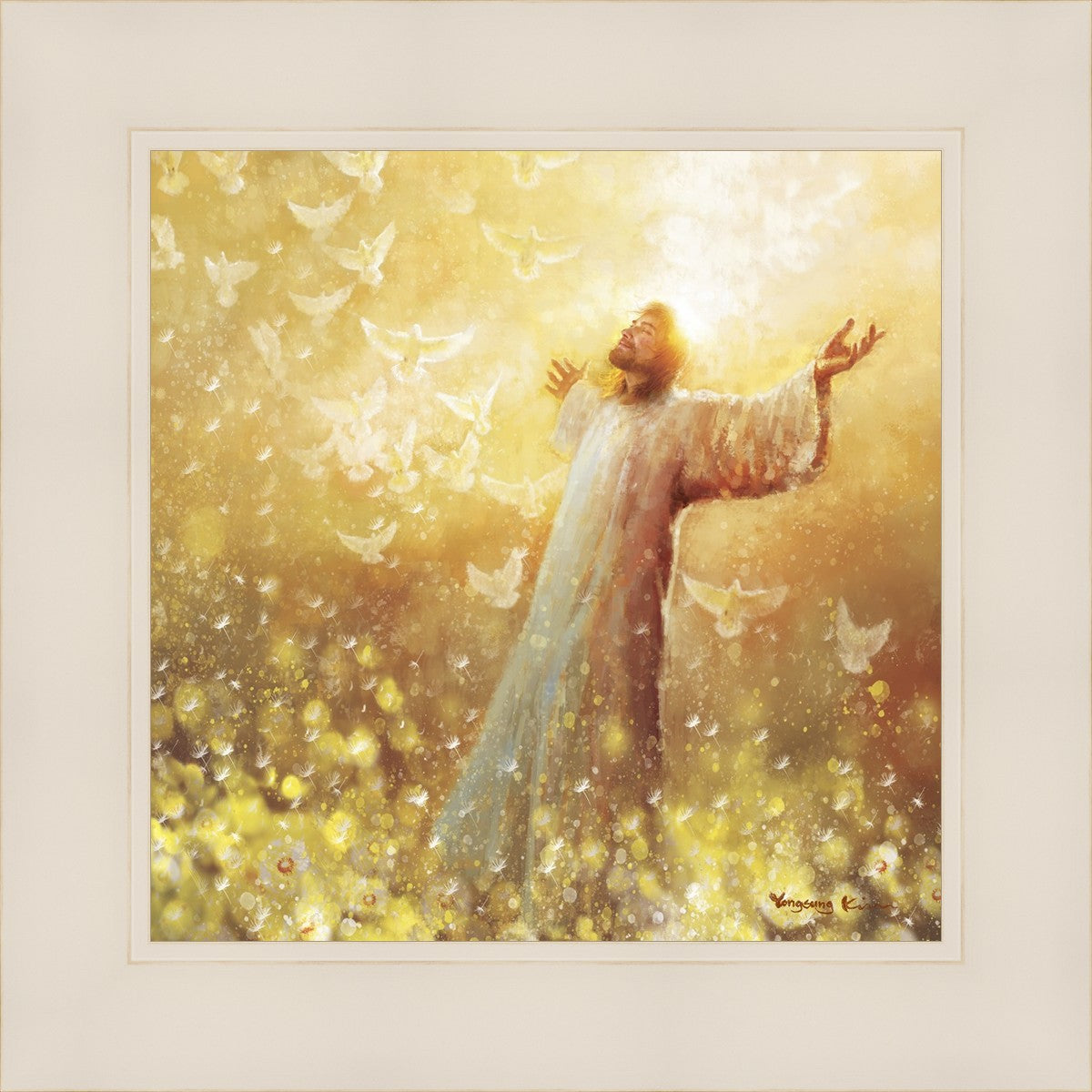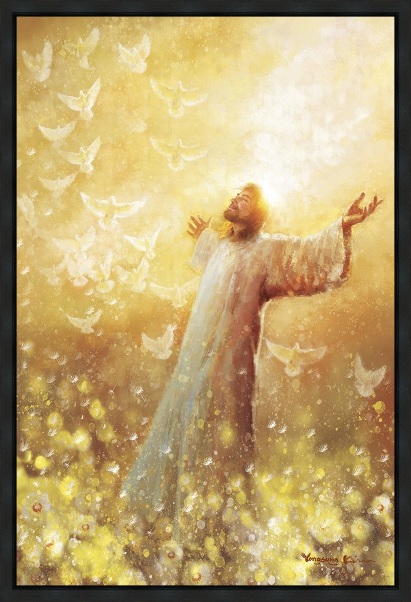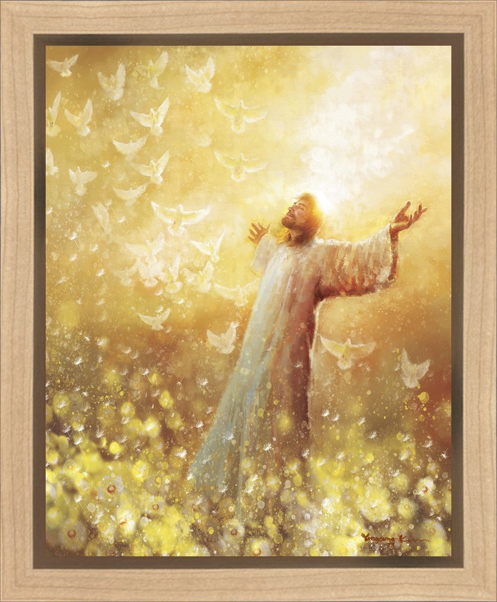 Oh Lord" by Yongsung Kim is a captivating painting portraying Christ standing in a field of flowers, with doves flying overhead, symbolizing peace and divine presence.
