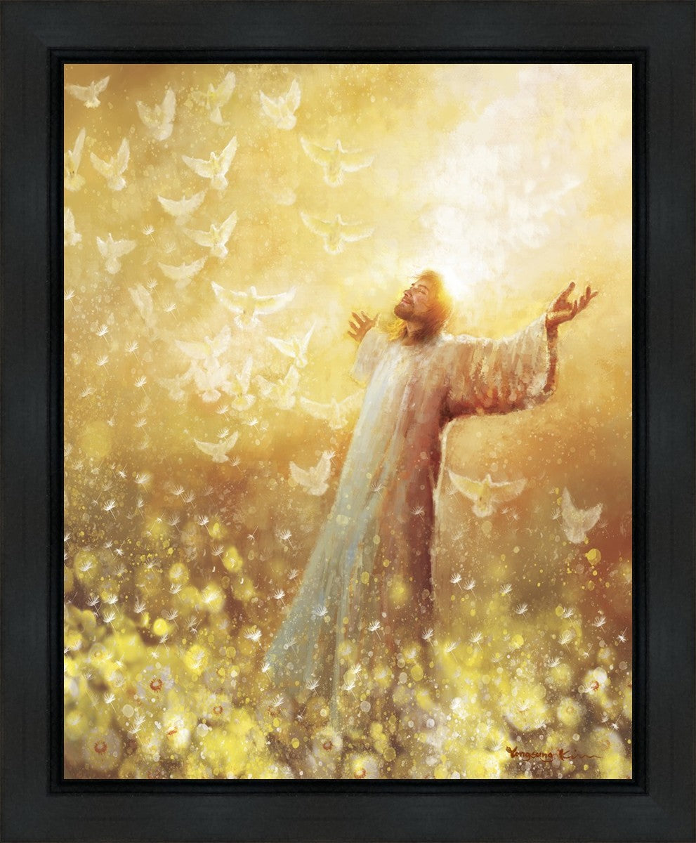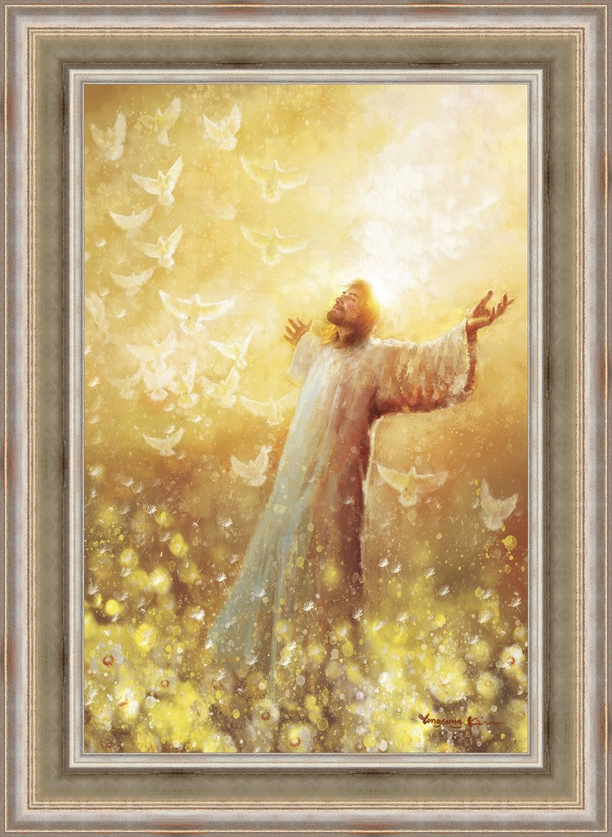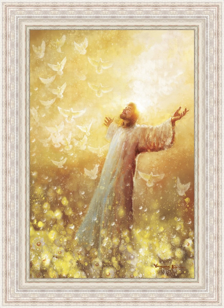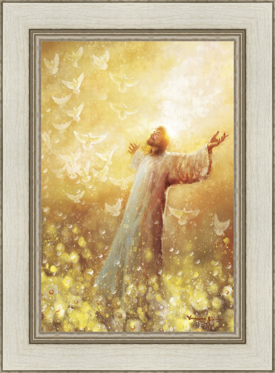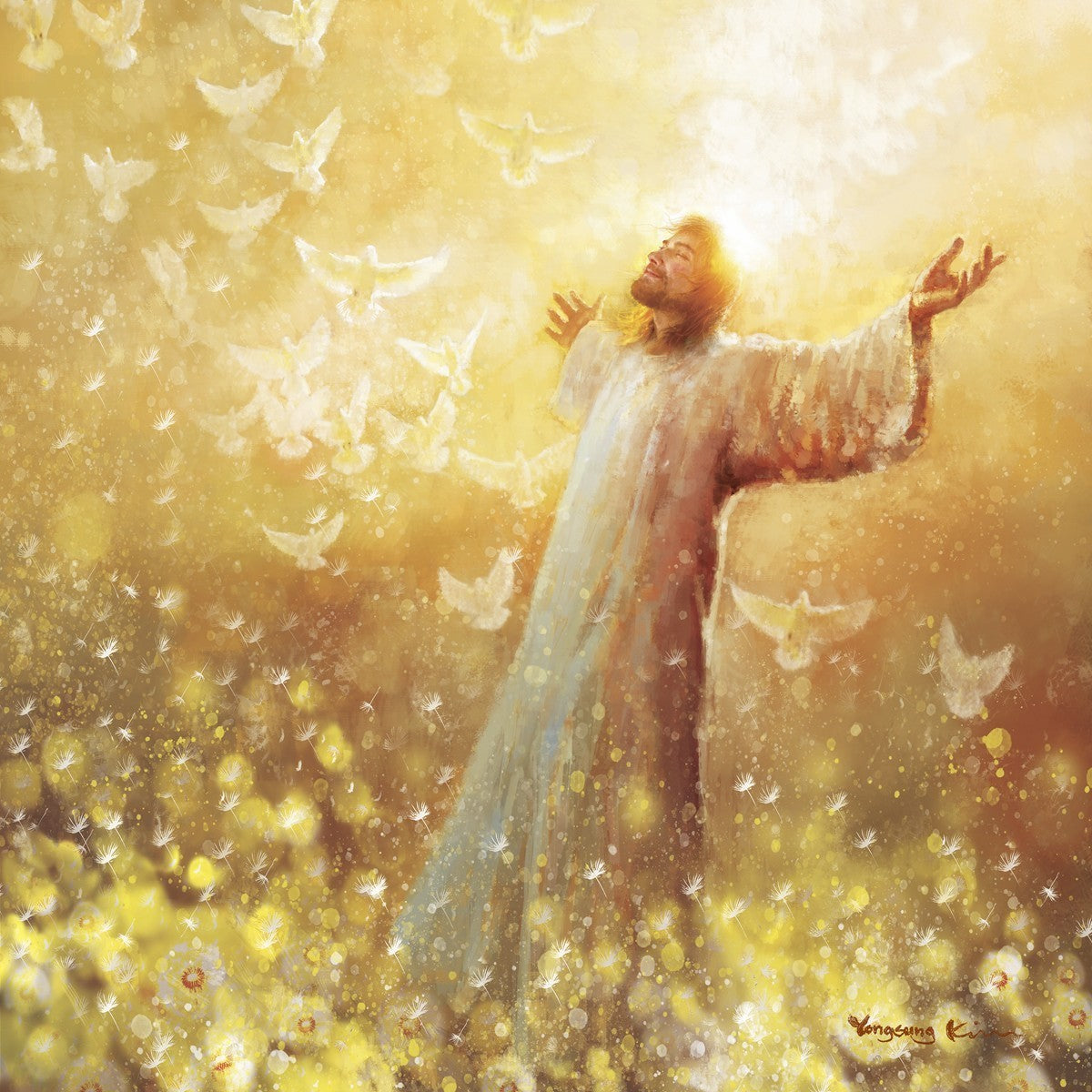 Oh Lord" by Yongsung Kim is a captivating painting portraying Christ standing in a field of flowers, with doves flying overhead, symbolizing peace and divine presence.