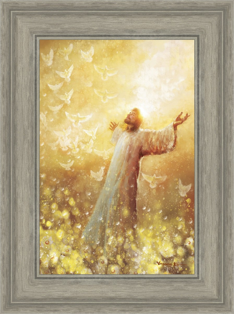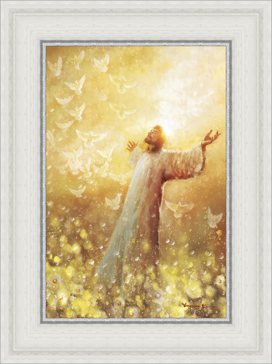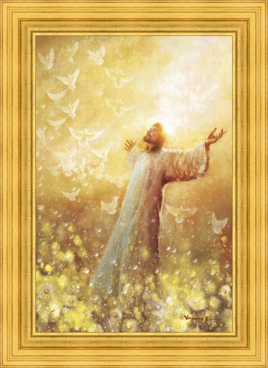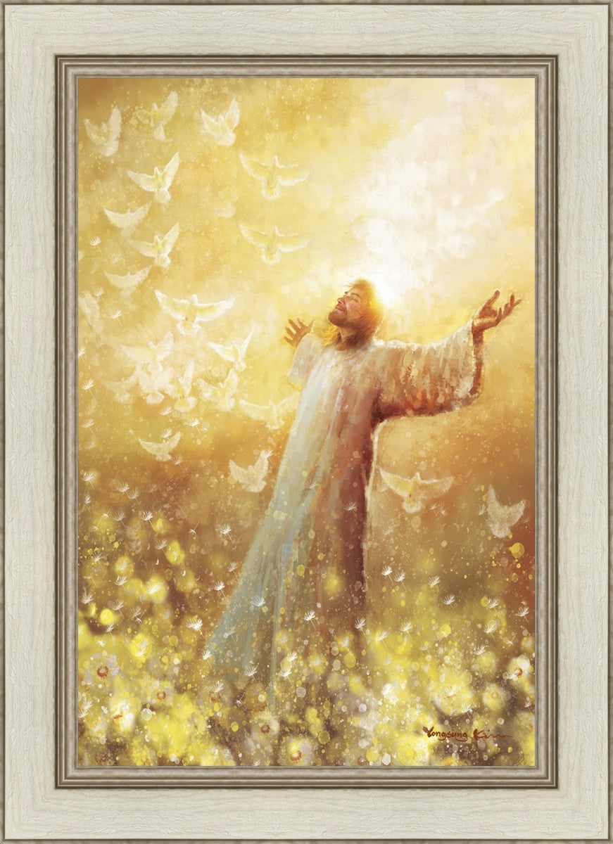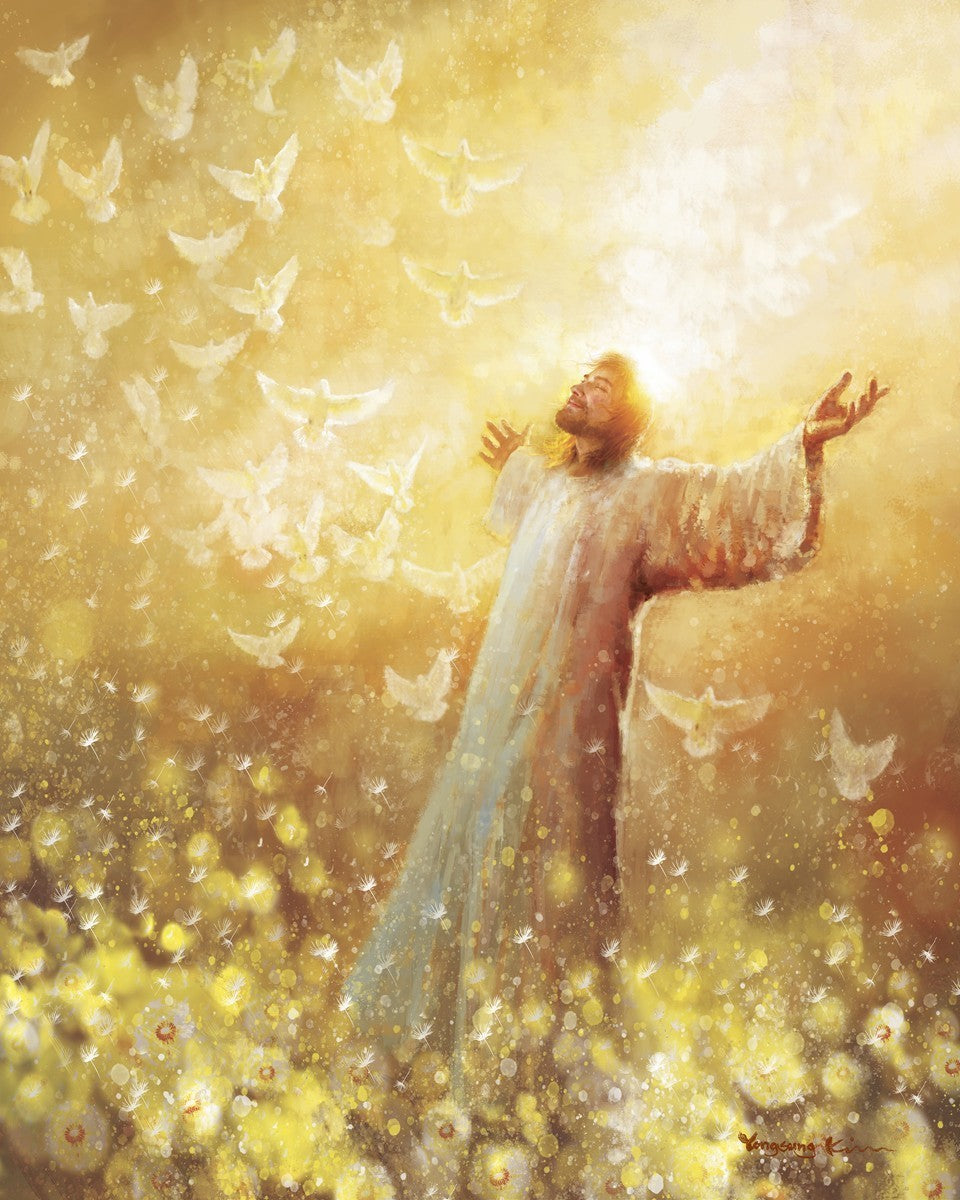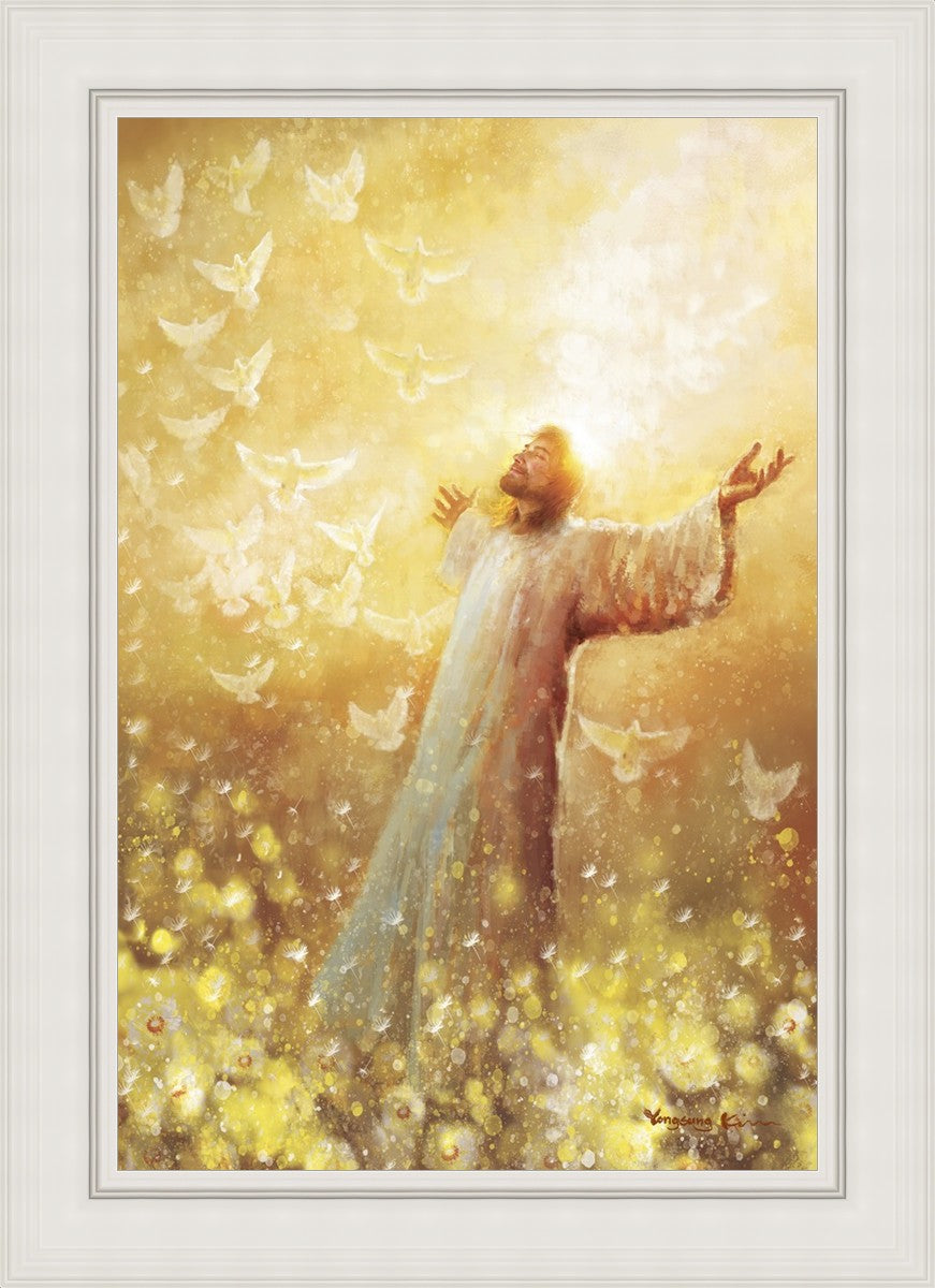 Oh Lord" by Yongsung Kim is a captivating painting portraying Christ standing in a field of flowers, with doves flying overhead, symbolizing peace and divine presence.