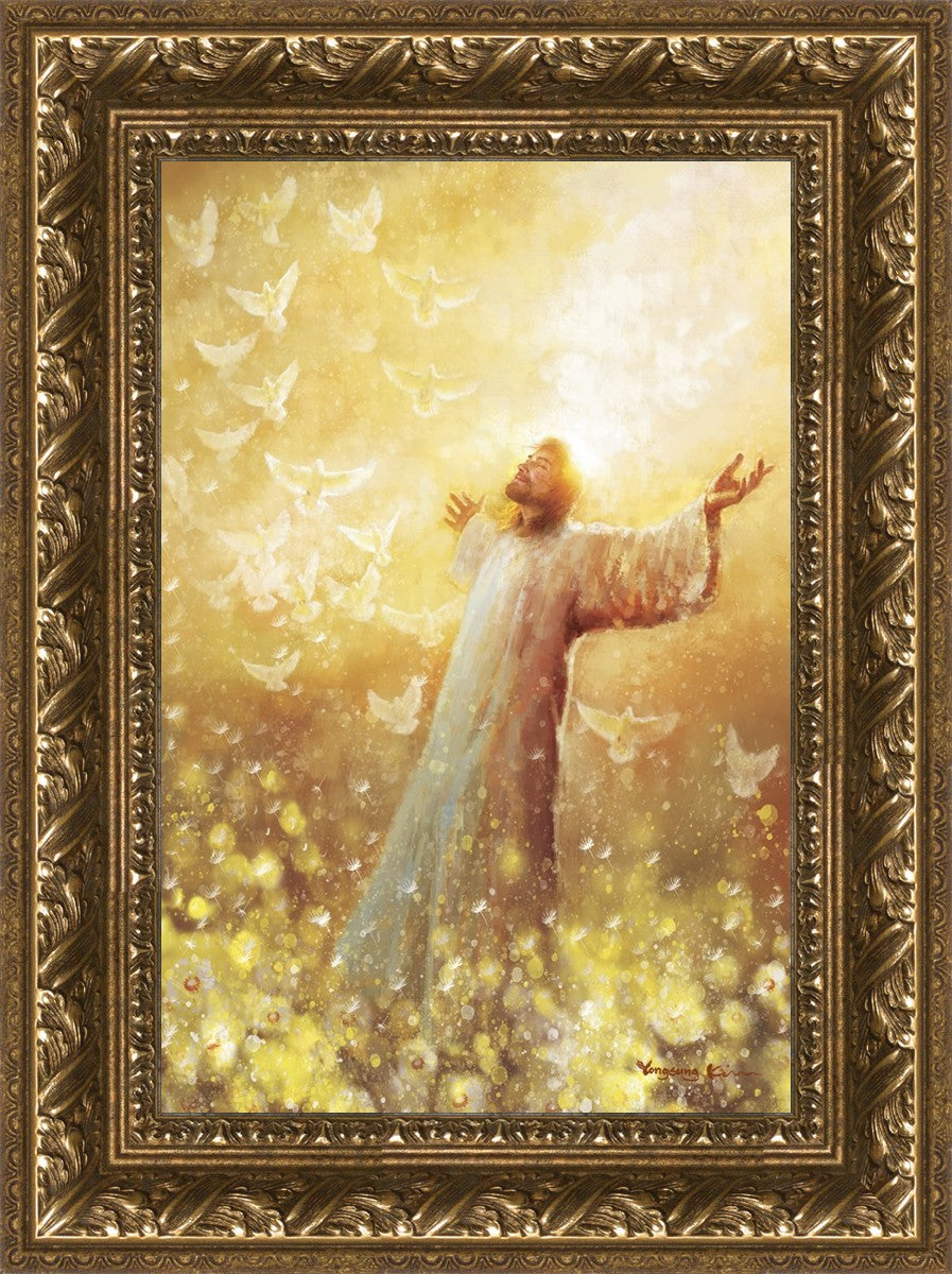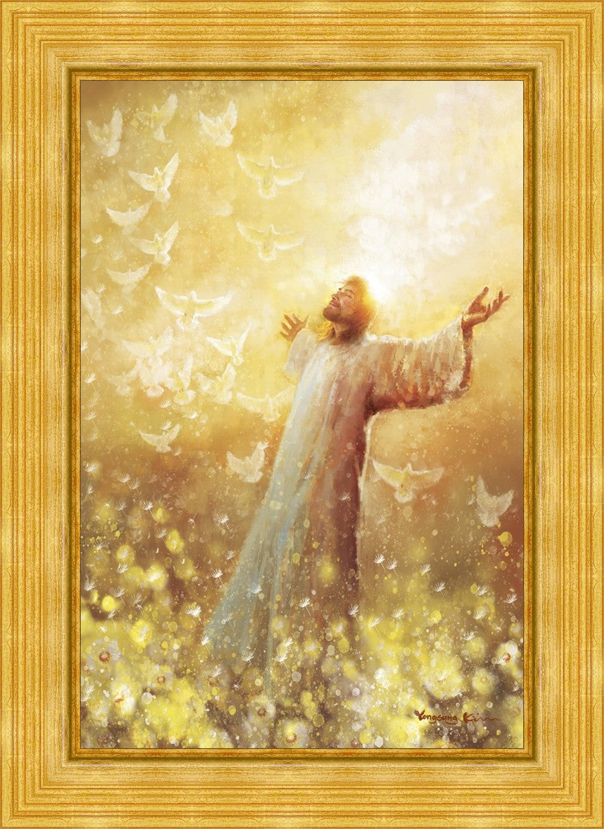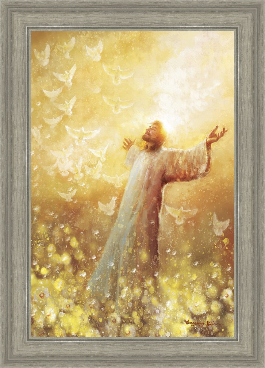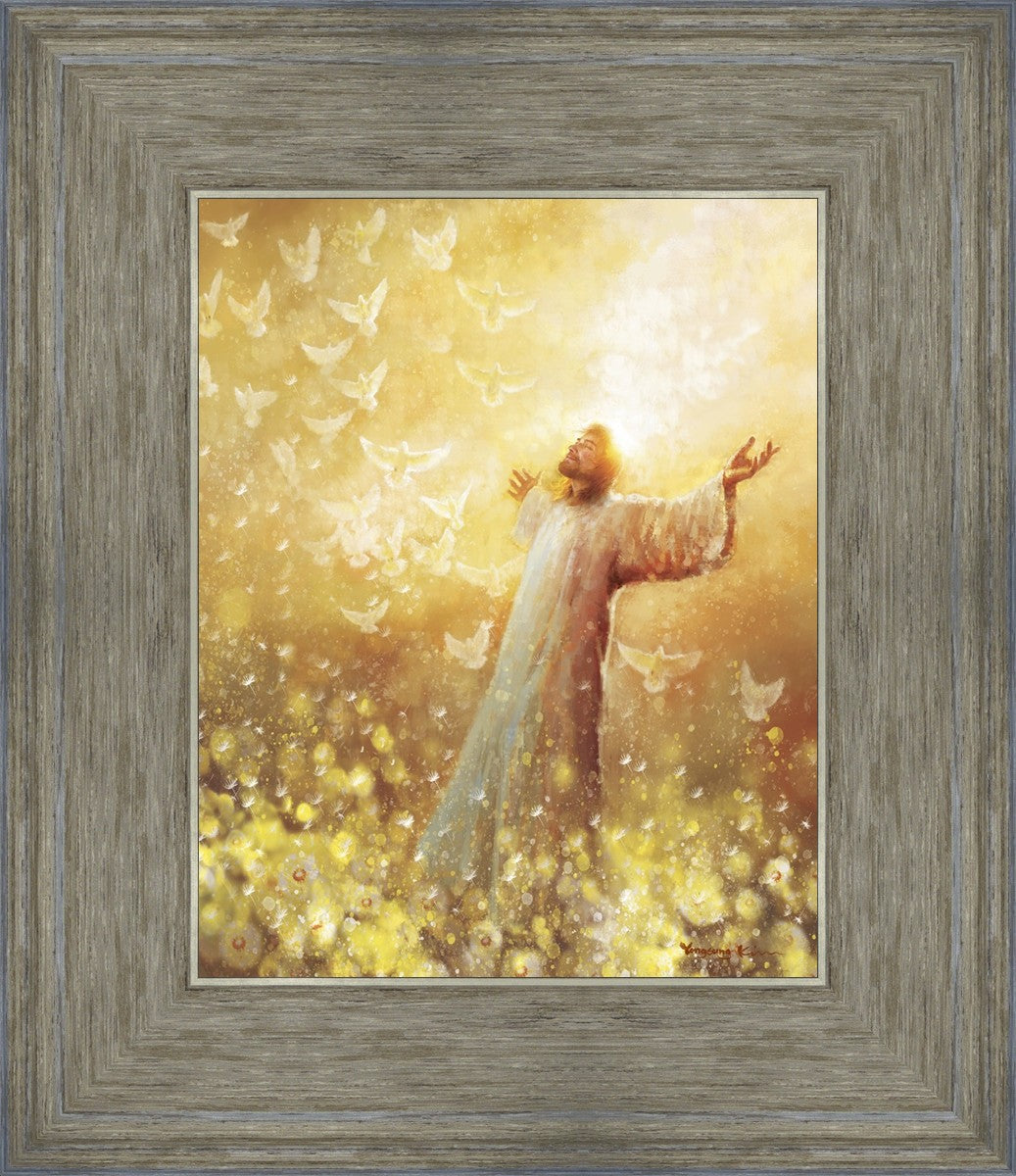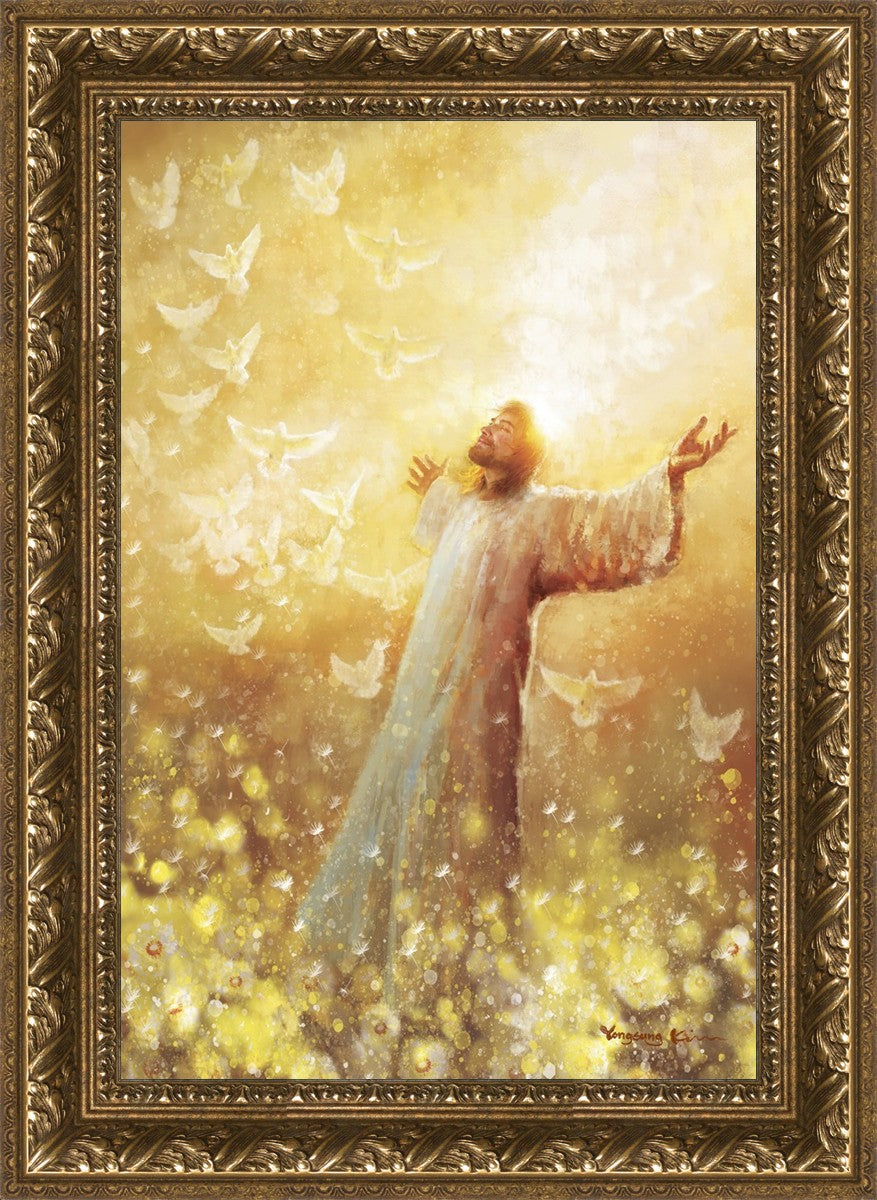 Oh Lord" by Yongsung Kim is a captivating painting portraying Christ standing in a field of flowers, with doves flying overhead, symbolizing peace and divine presence.