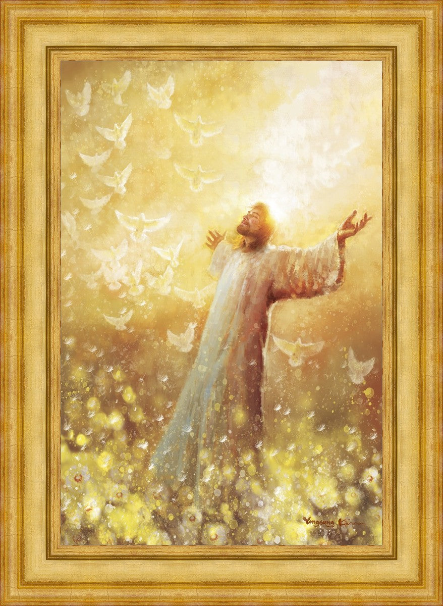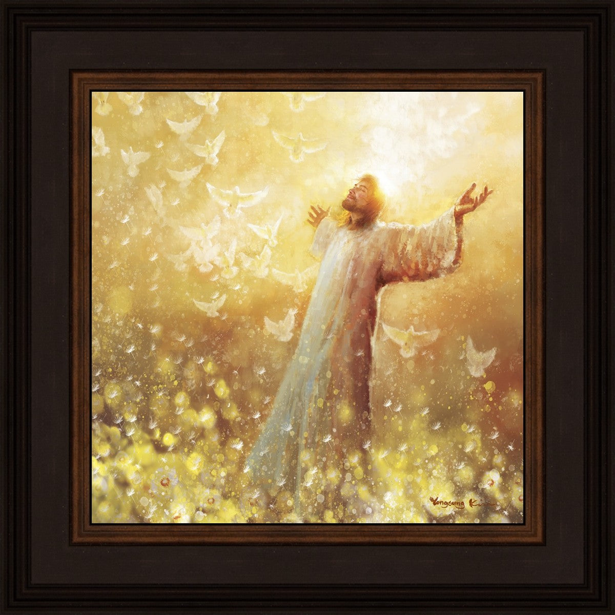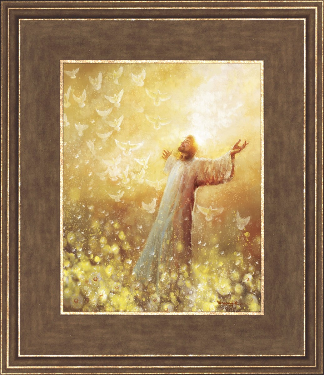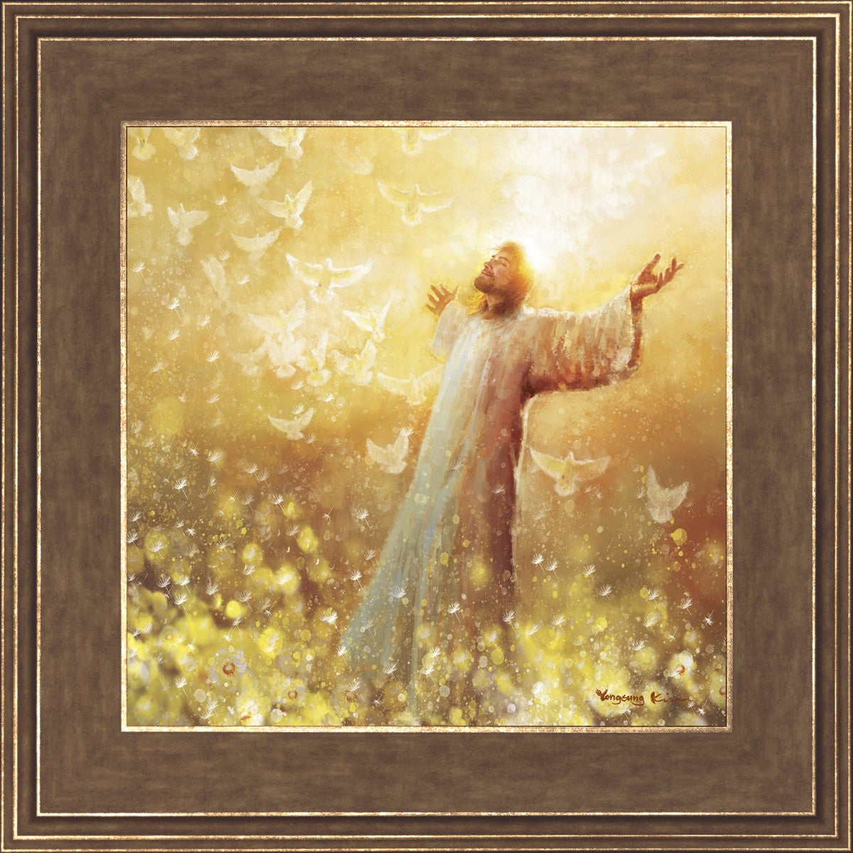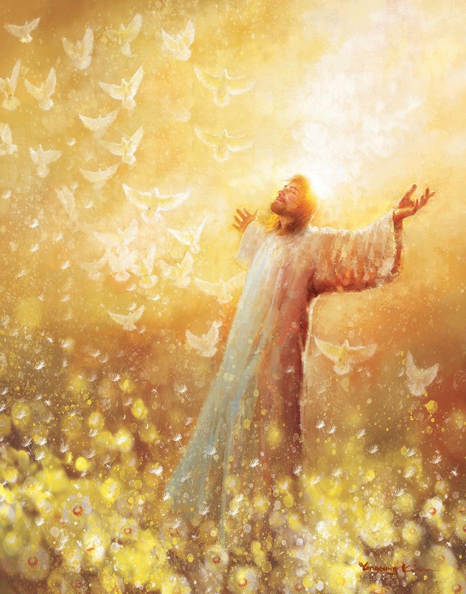 Oh Lord" by Yongsung Kim is a captivating painting portraying Christ standing in a field of flowers, with doves flying overhead, symbolizing peace and divine presence.