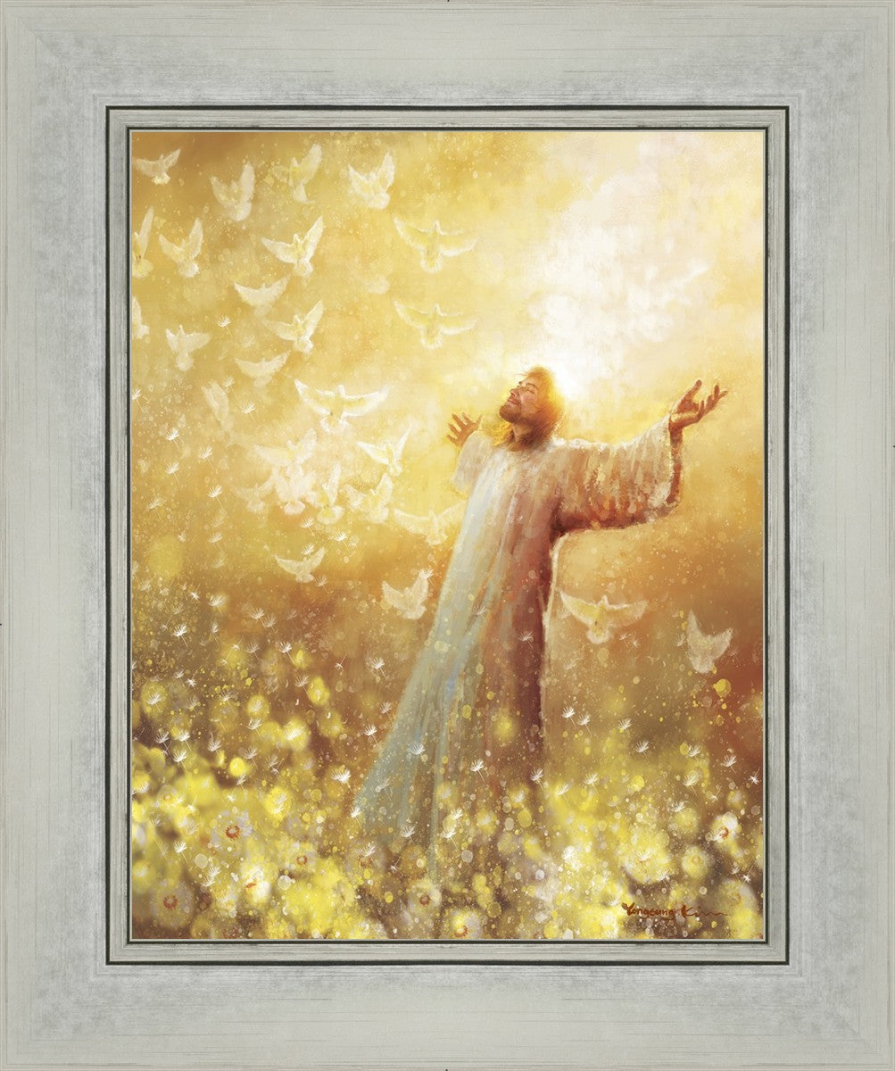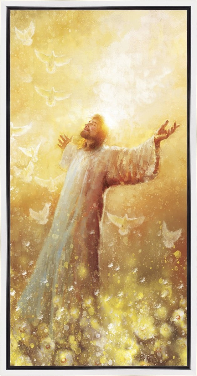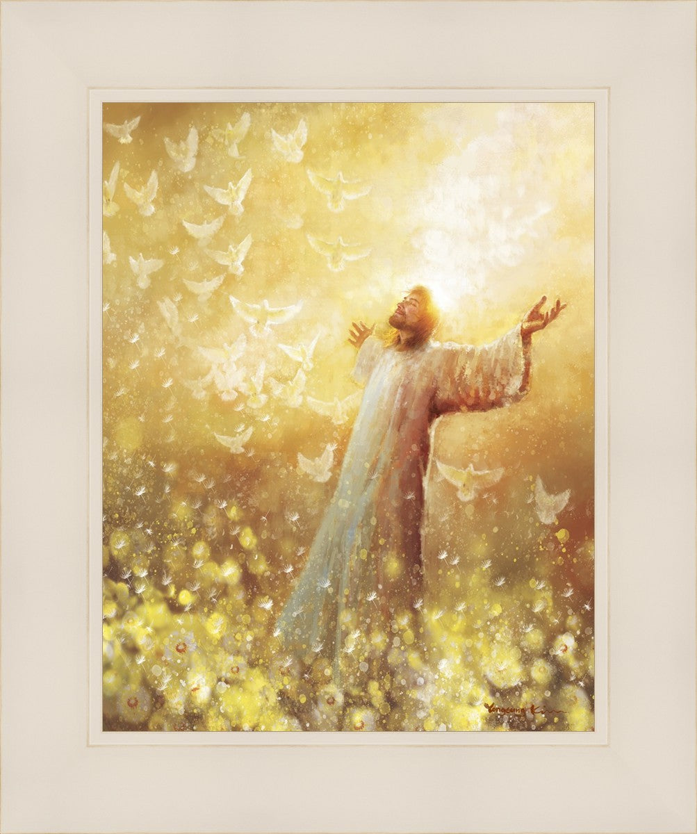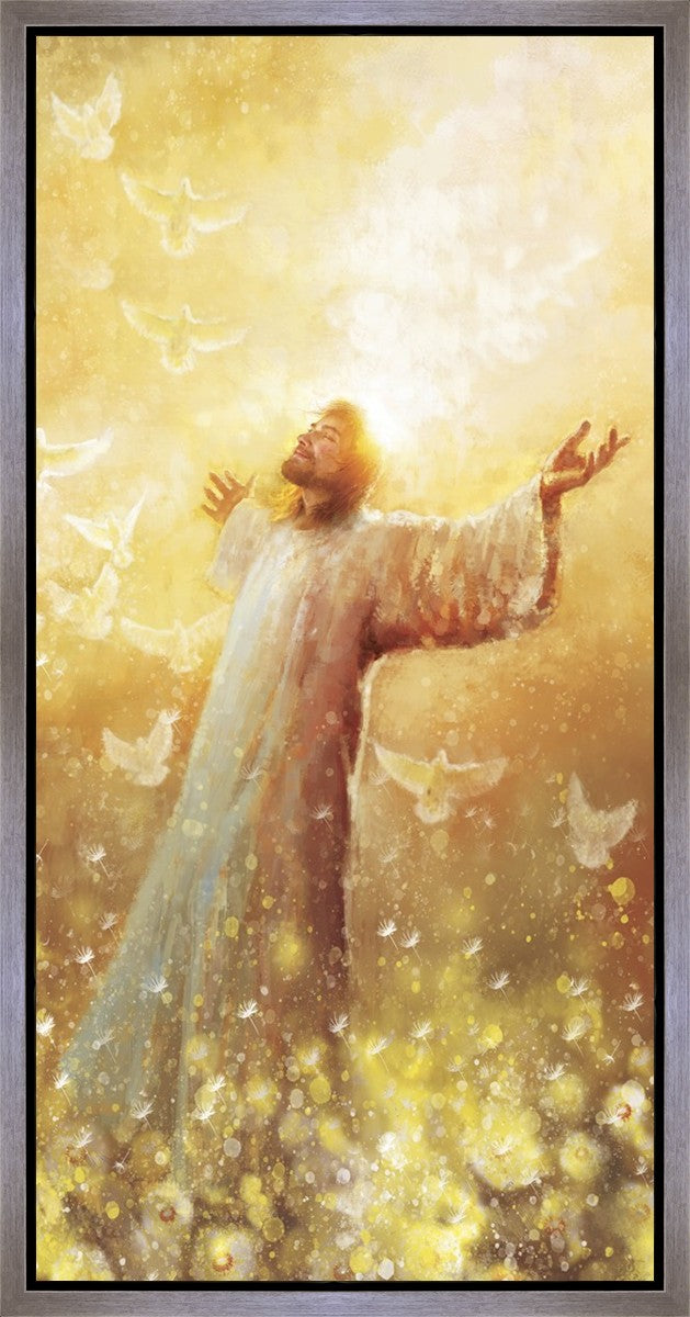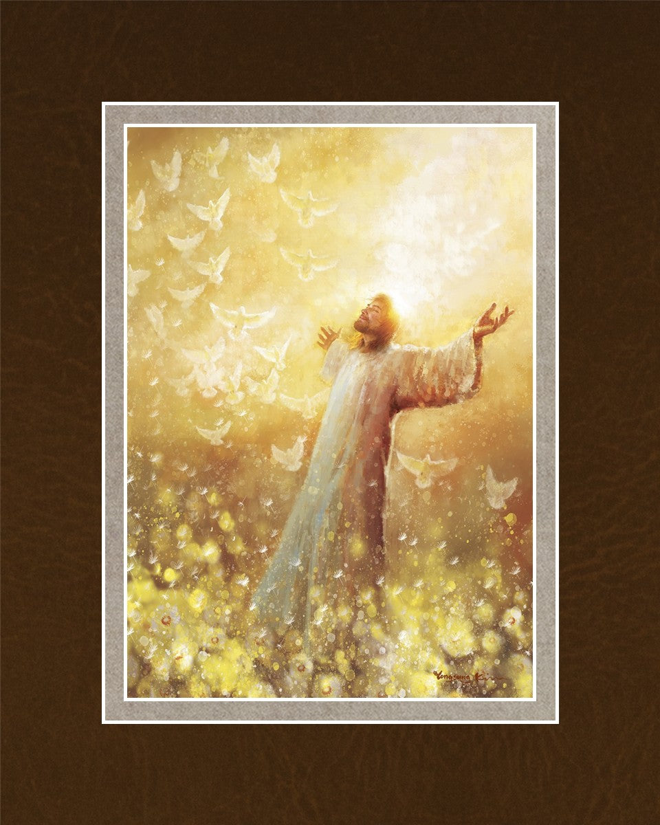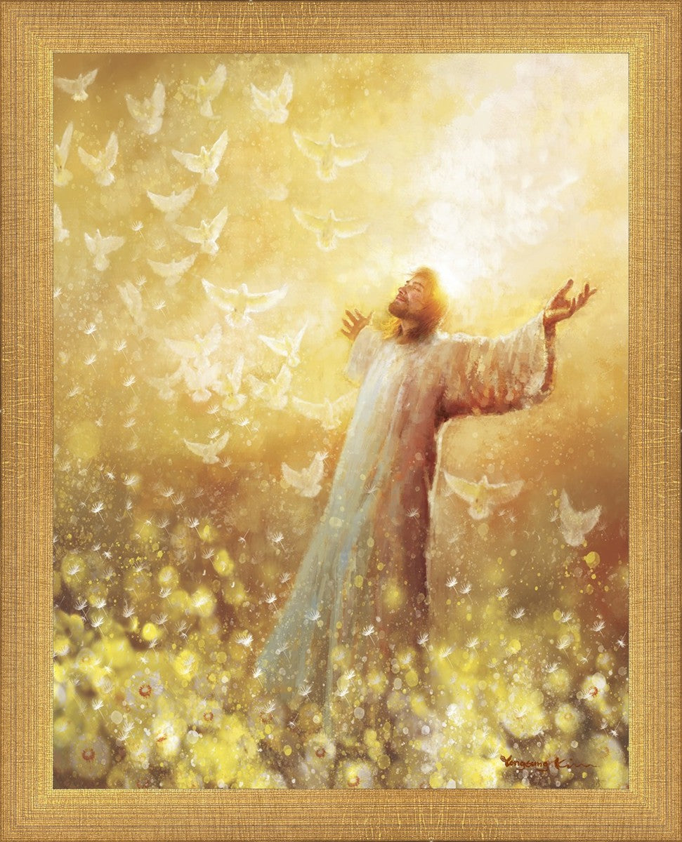 Oh Lord" by Yongsung Kim is a captivating painting portraying Christ standing in a field of flowers, with doves flying overhead, symbolizing peace and divine presence.