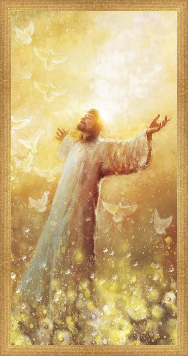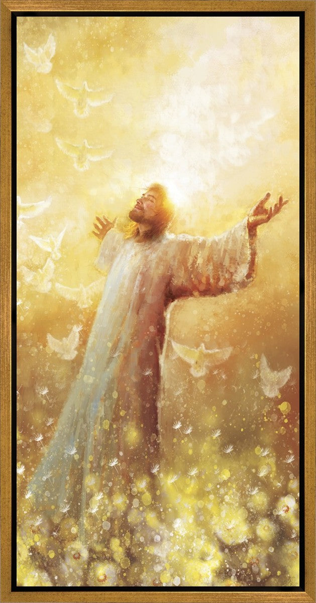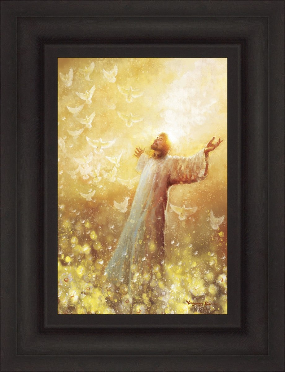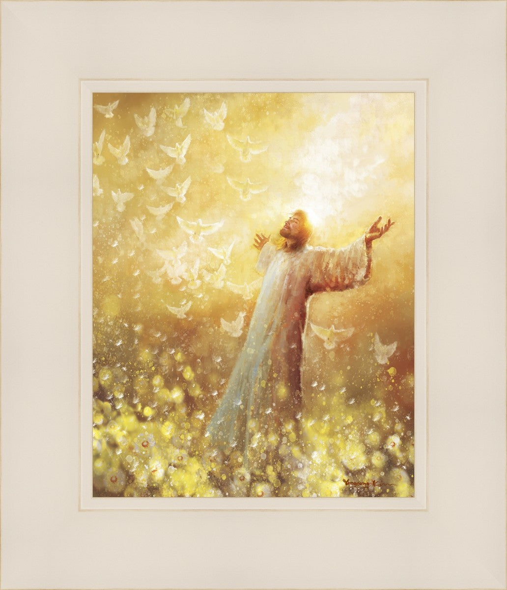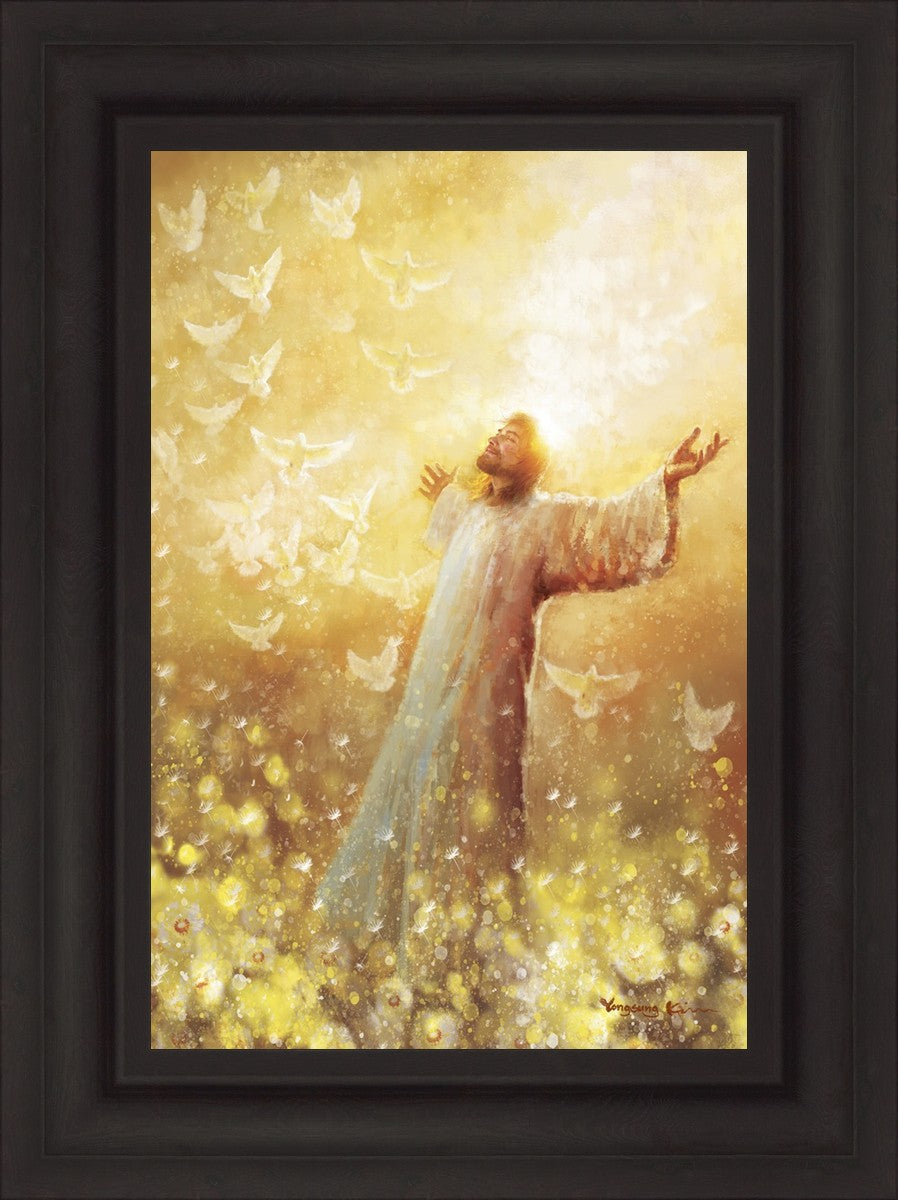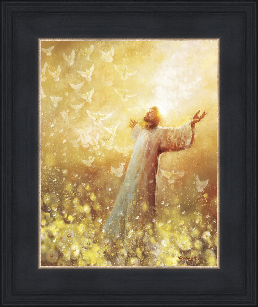 Oh Lord" by Yongsung Kim is a captivating painting portraying Christ standing in a field of flowers, with doves flying overhead, symbolizing peace and divine presence.