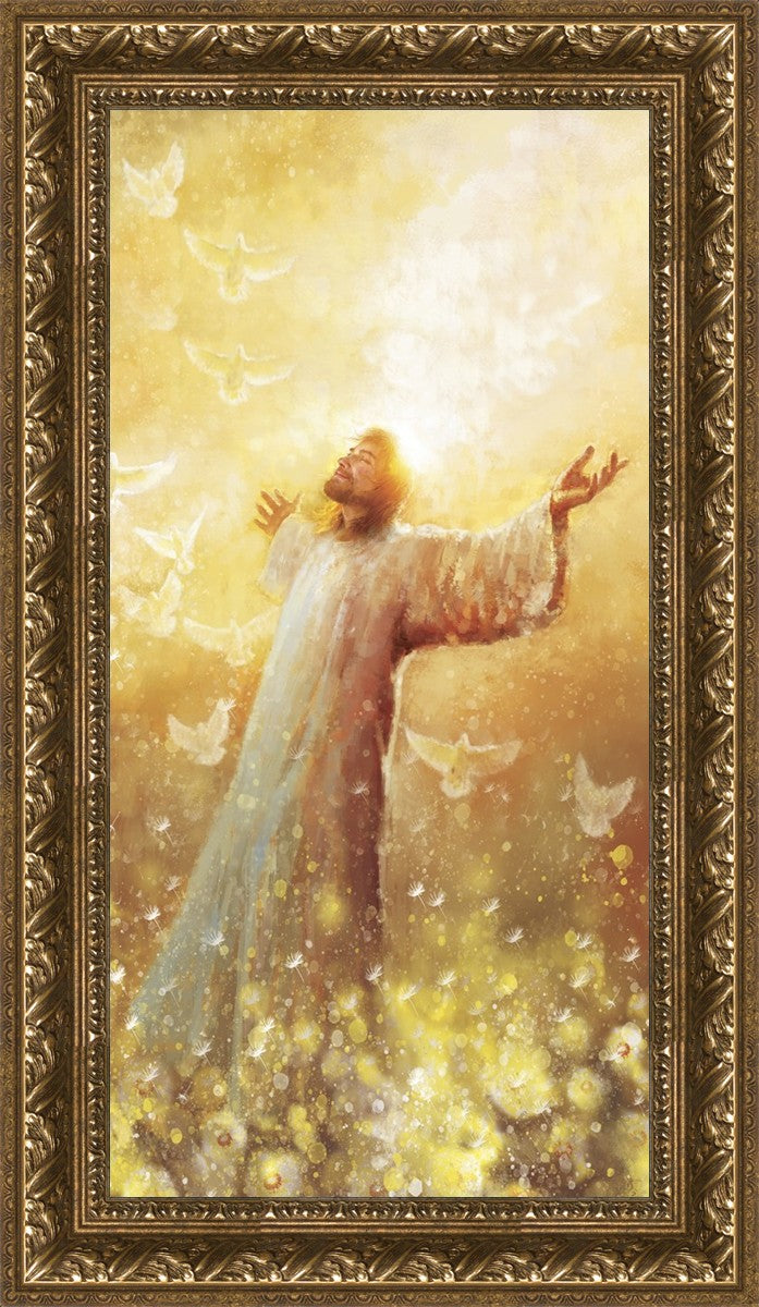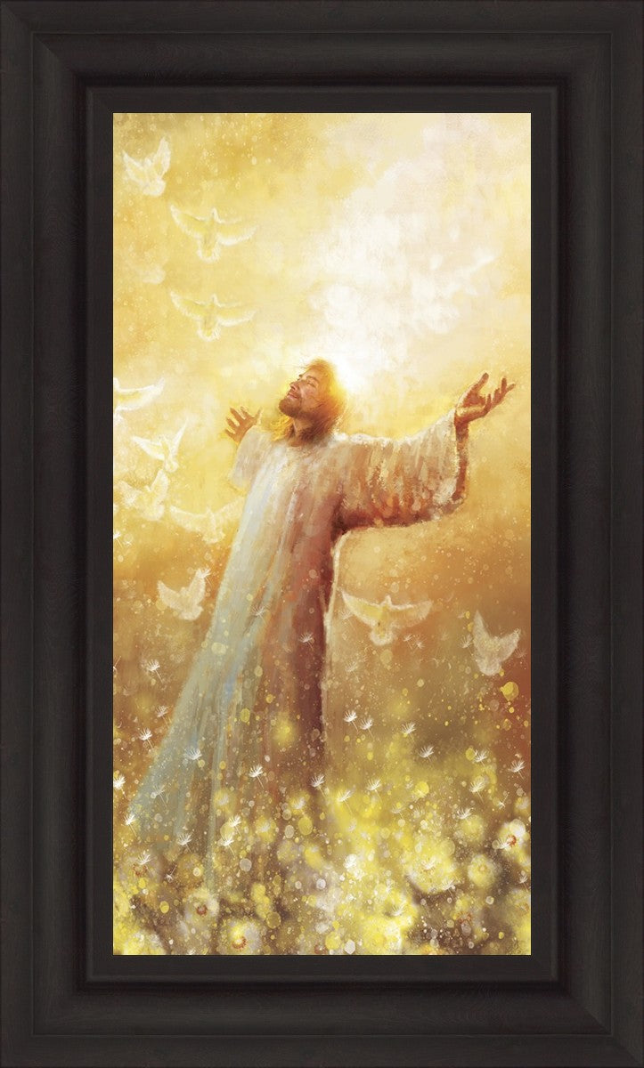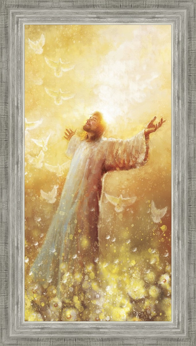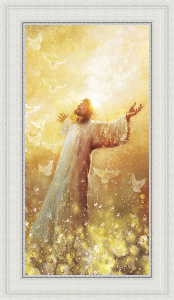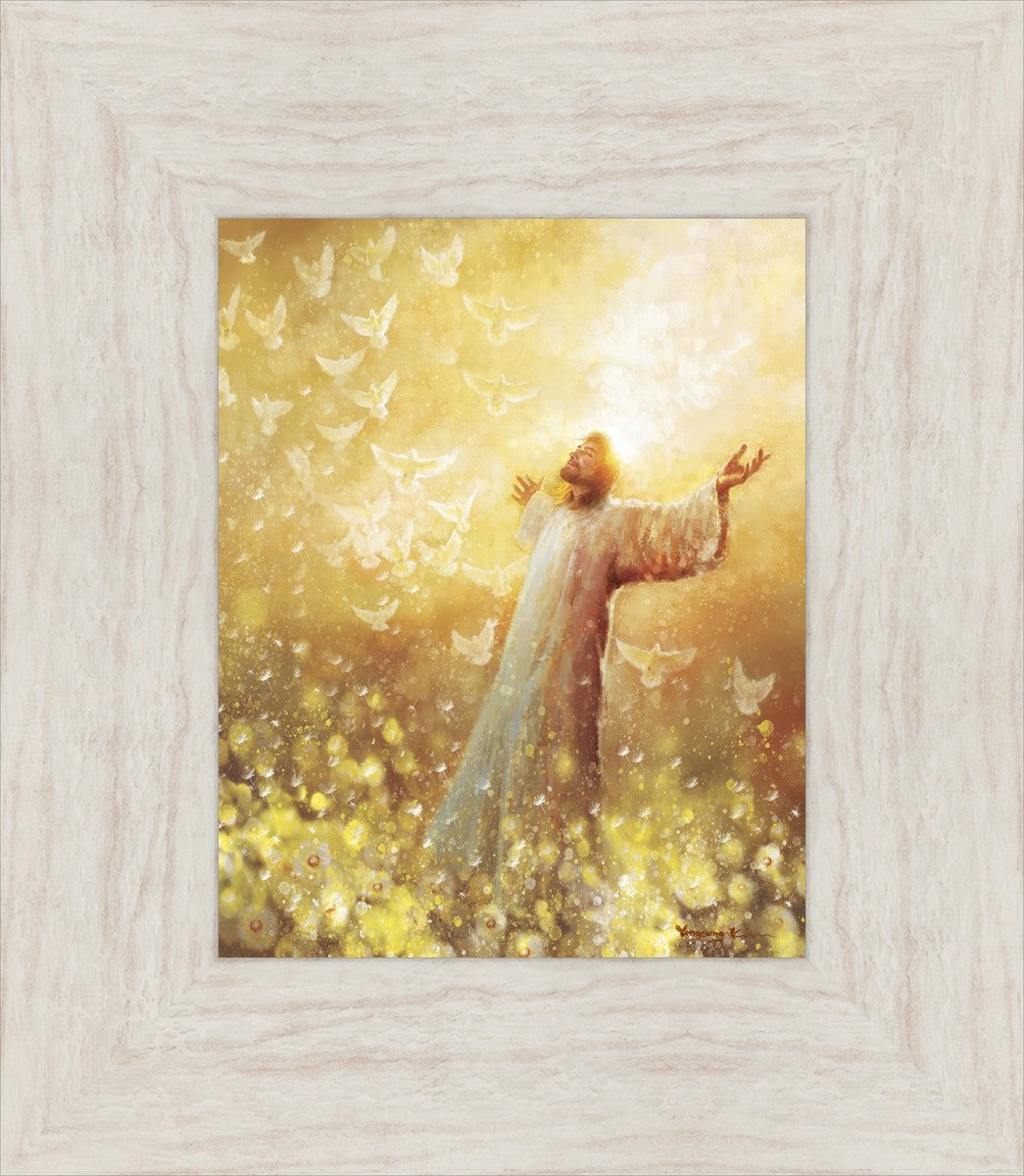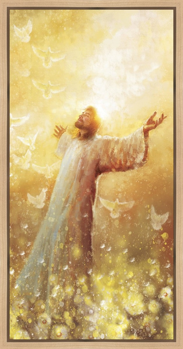 Oh Lord" by Yongsung Kim is a captivating painting portraying Christ standing in a field of flowers, with doves flying overhead, symbolizing peace and divine presence.