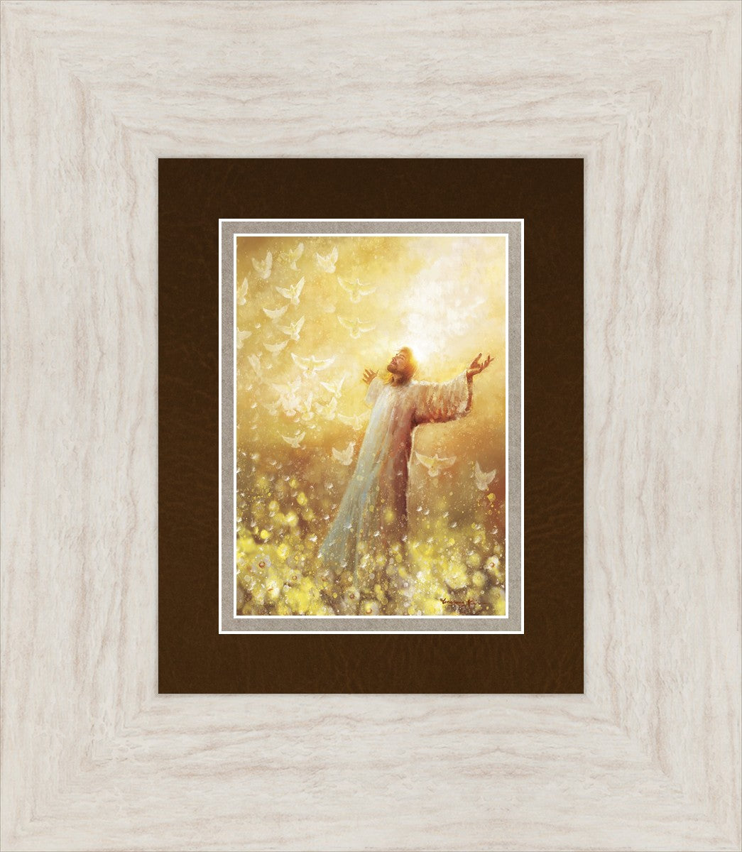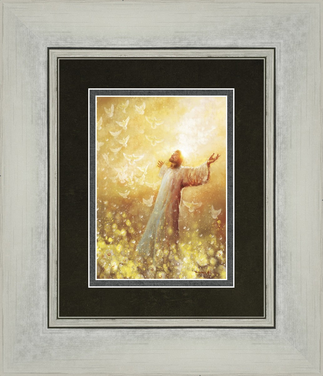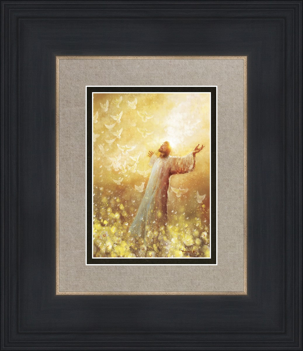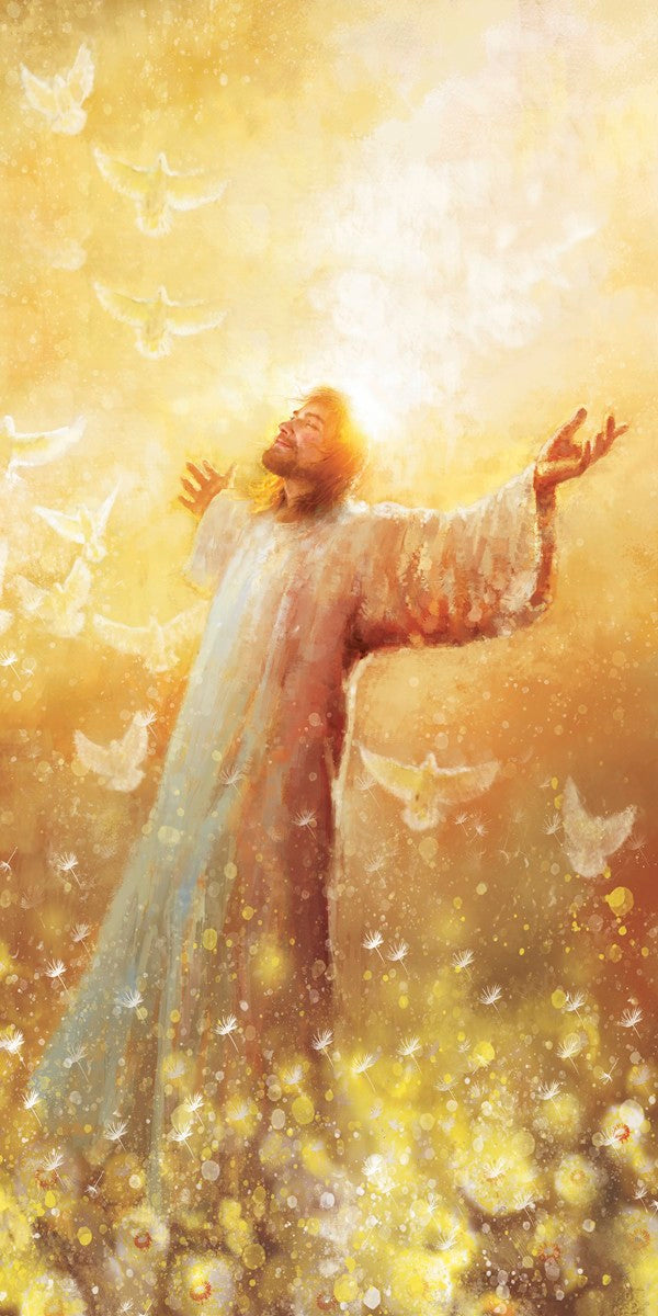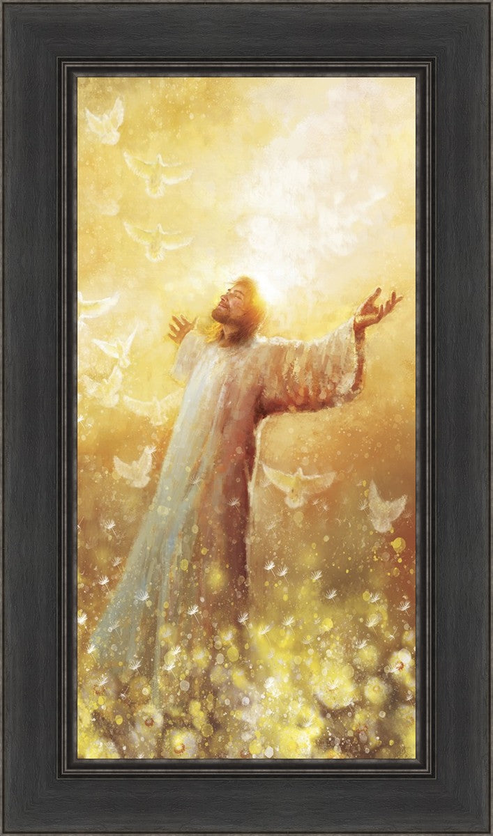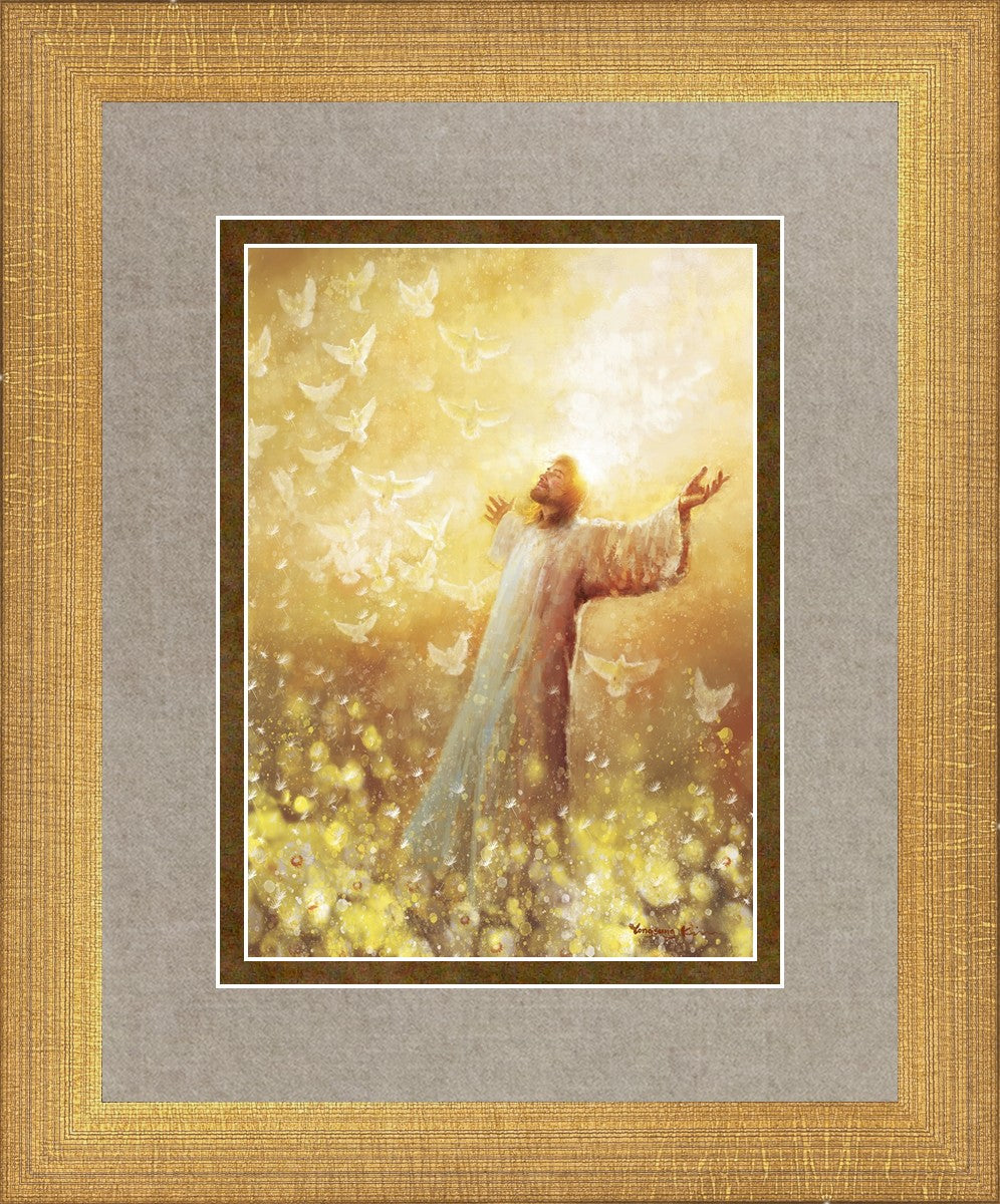 Oh Lord" by Yongsung Kim is a captivating painting portraying Christ standing in a field of flowers, with doves flying overhead, symbolizing peace and divine presence.