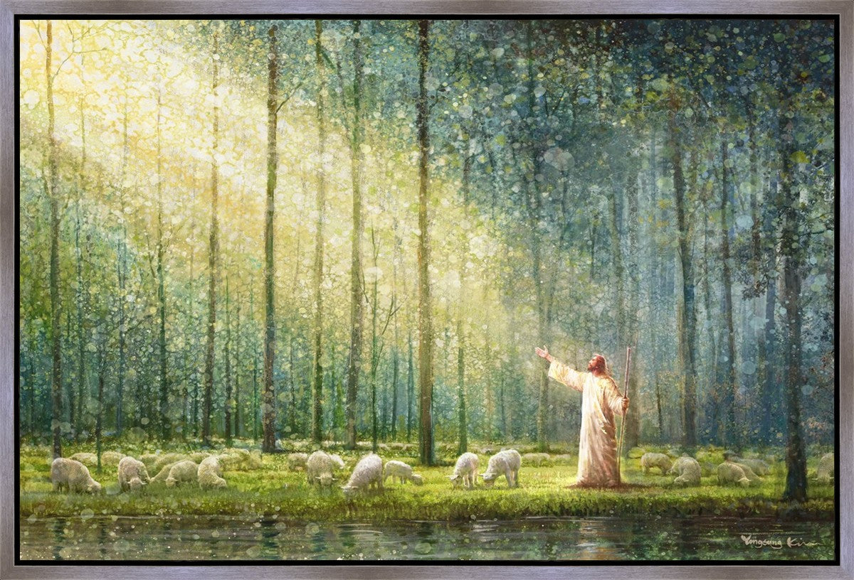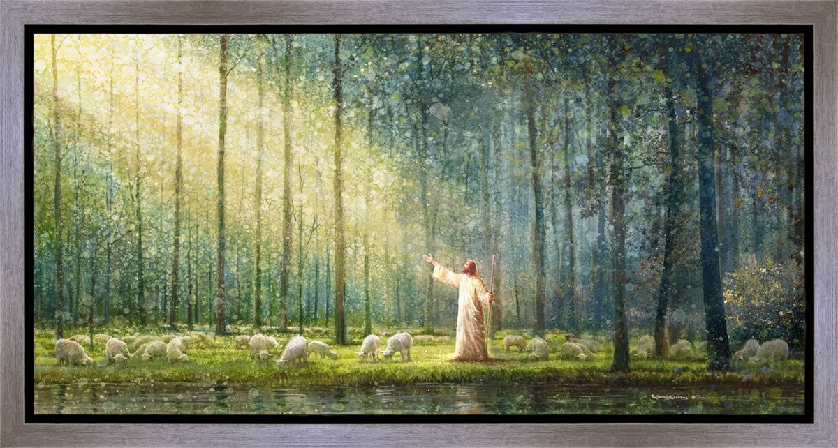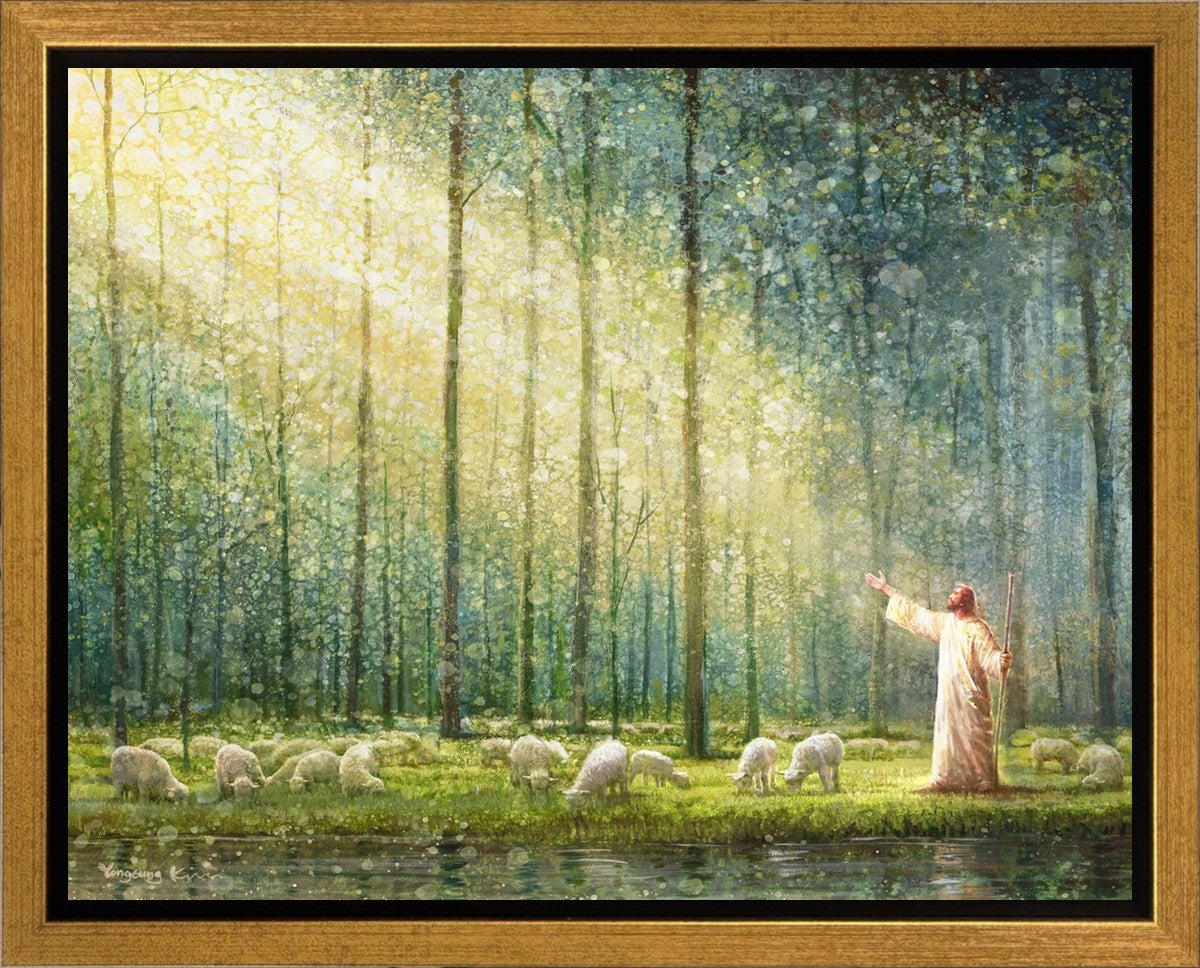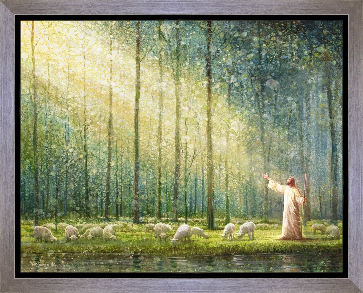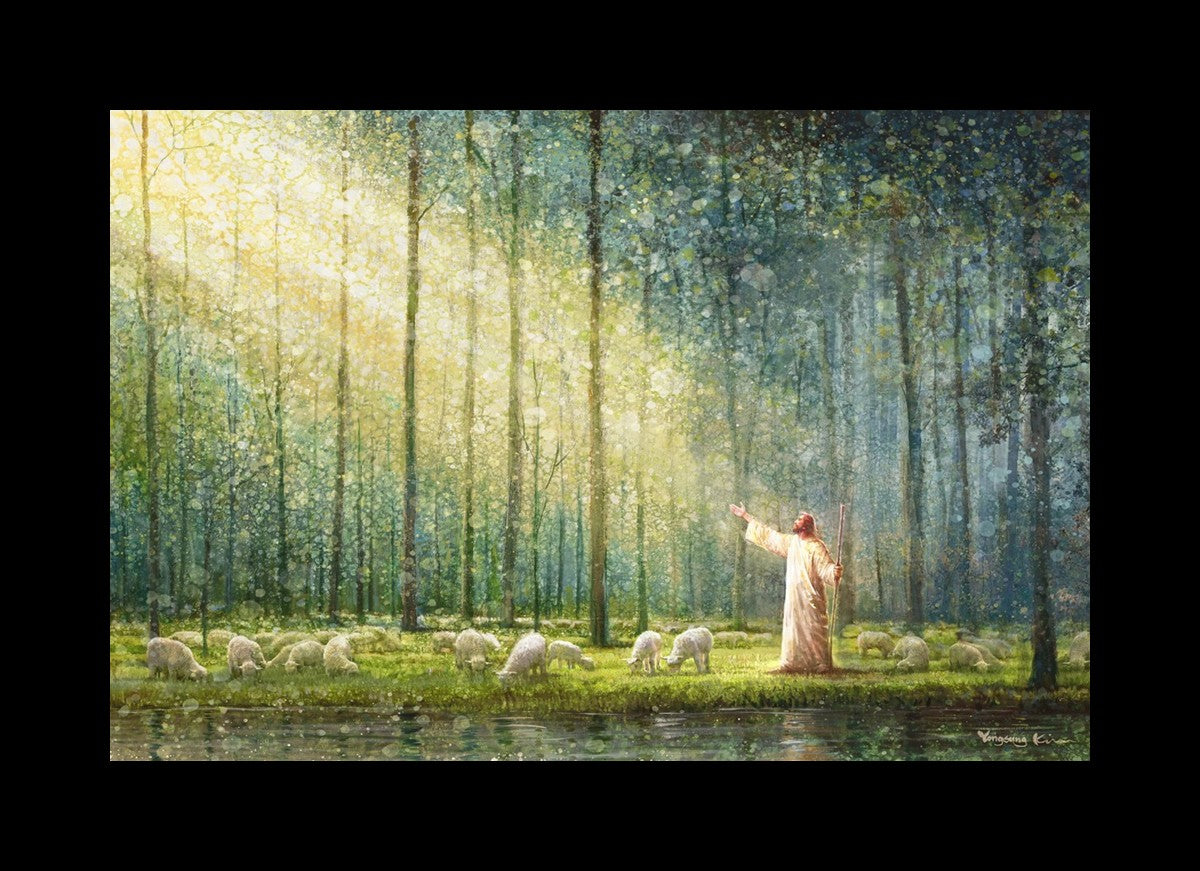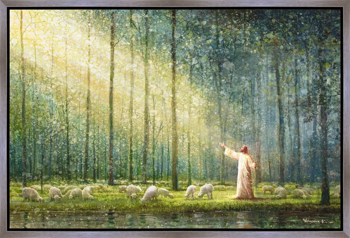 What is the promise of Zion? In Yongsung Kim's painting Rest, inspired by Jeremiah 31:12, the imagery of a lush and vibrant forest reflects a soul nourished by divine grace. Just as the trees,the grasses, and the flock are sustained by life-giving water, so too the soul is replenished by the spiritual nourishment that comes from a deep connection with God. The serene scene invites reflection on the promise of restoration and renewal, where the soul, like the garden, finds its rest in the presence of the divine.