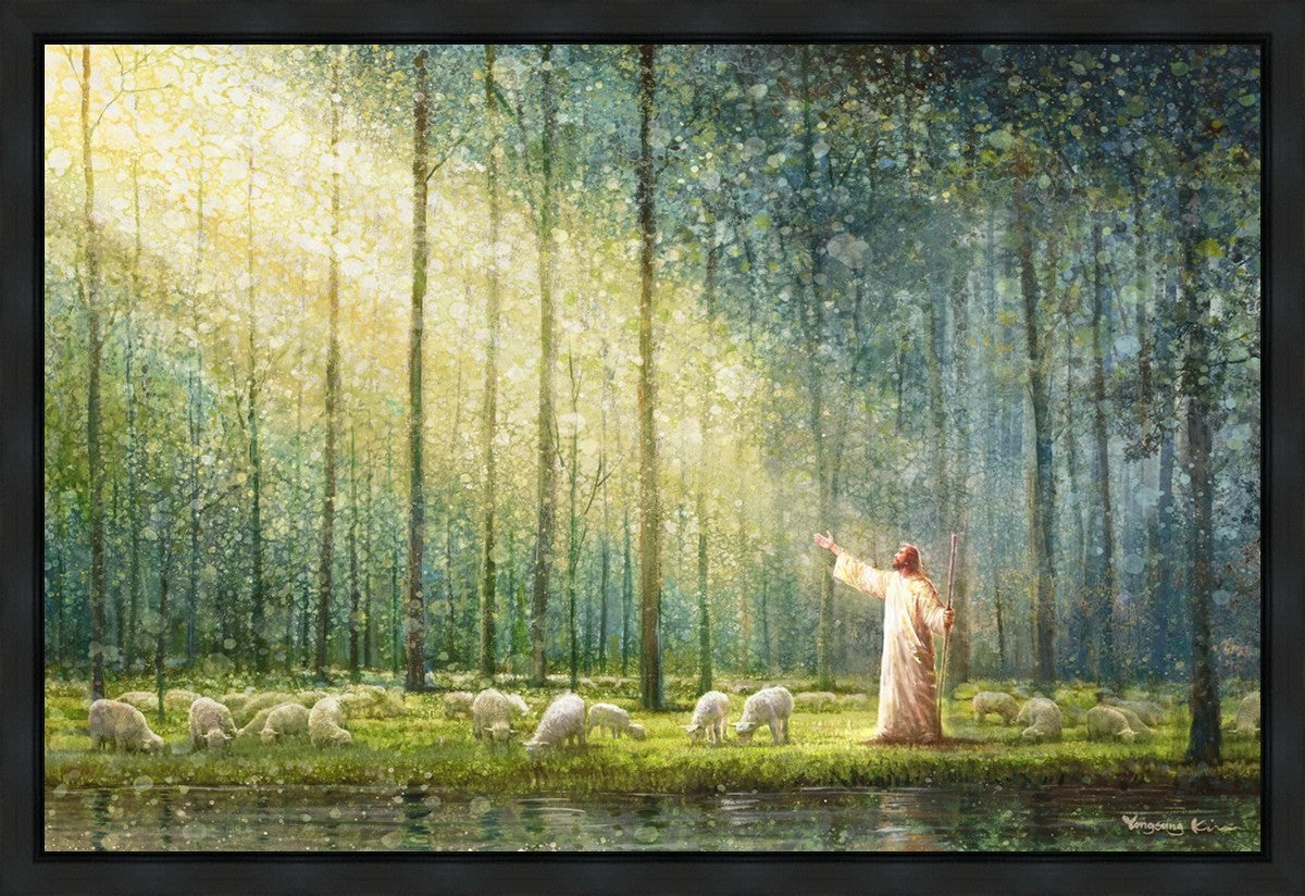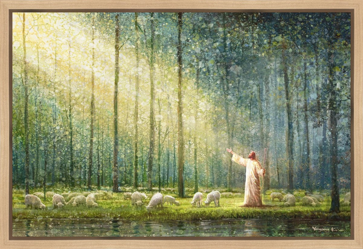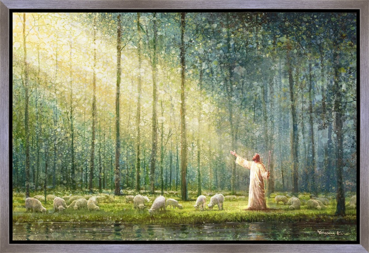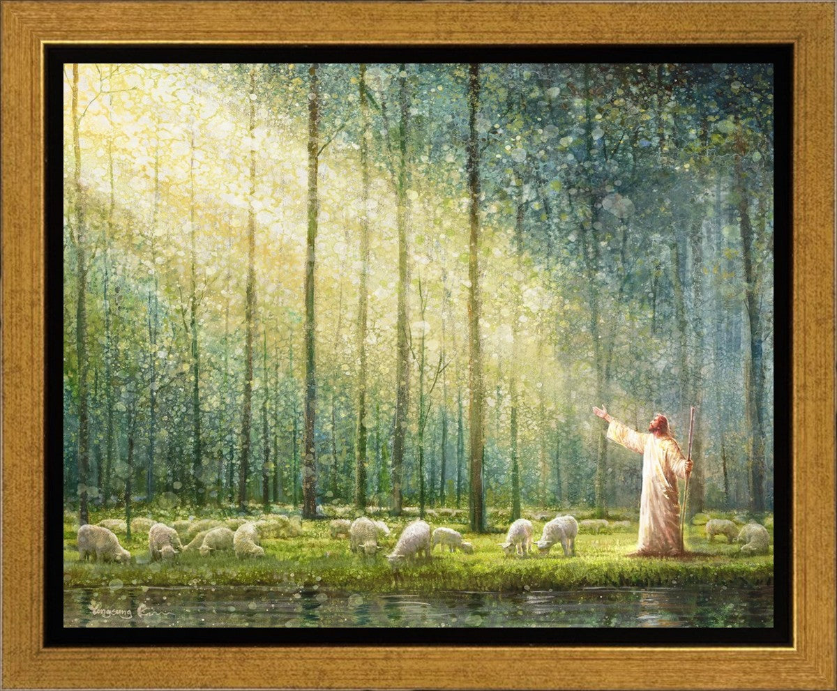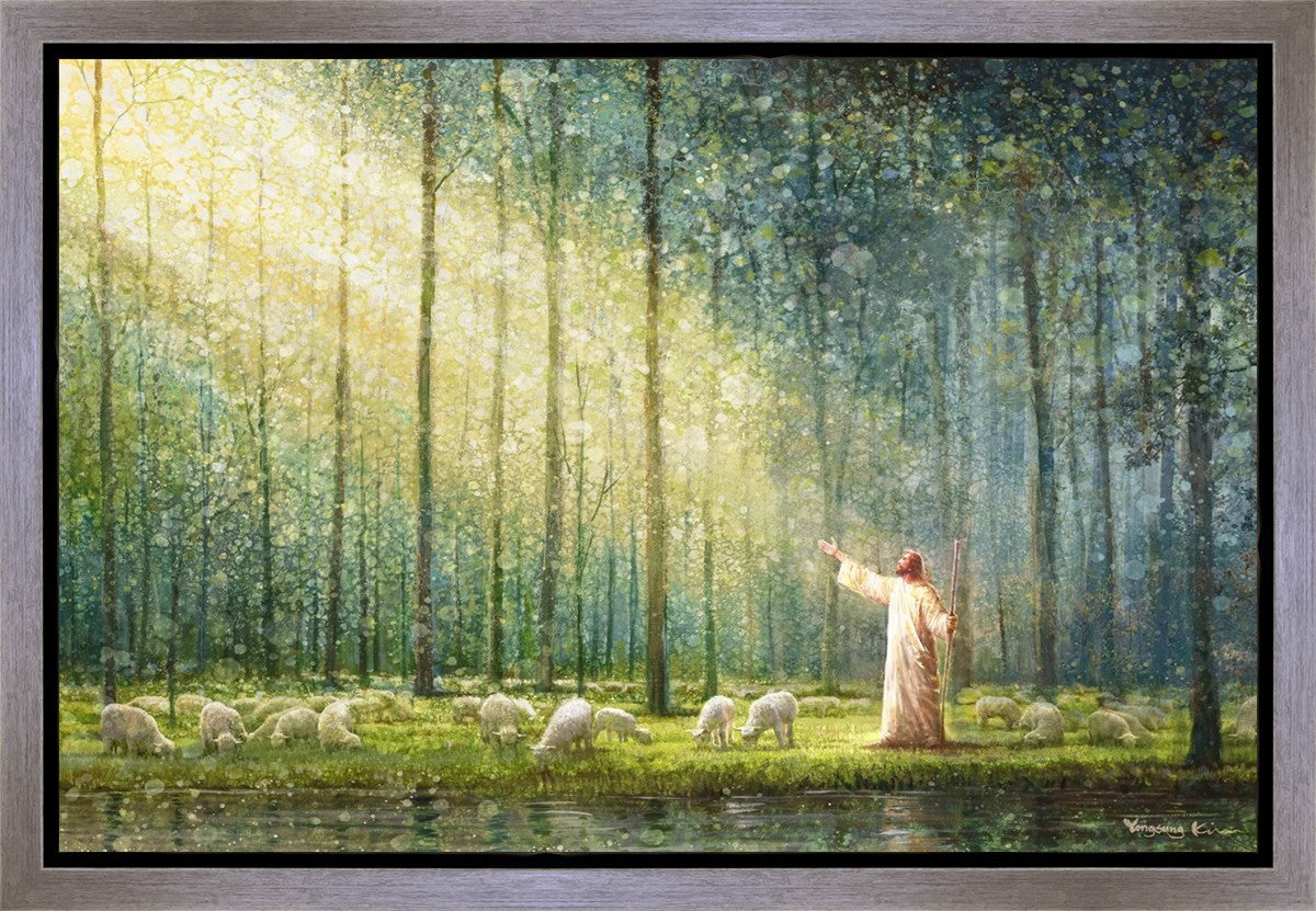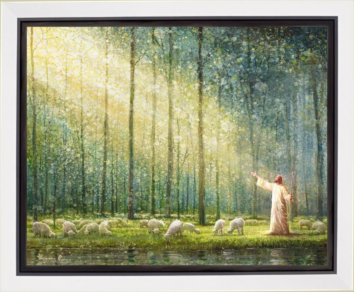 What is the promise of Zion? In Yongsung Kim's painting Rest, inspired by Jeremiah 31:12, the imagery of a lush and vibrant forest reflects a soul nourished by divine grace. Just as the trees,the grasses, and the flock are sustained by life-giving water, so too the soul is replenished by the spiritual nourishment that comes from a deep connection with God. The serene scene invites reflection on the promise of restoration and renewal, where the soul, like the garden, finds its rest in the presence of the divine.
