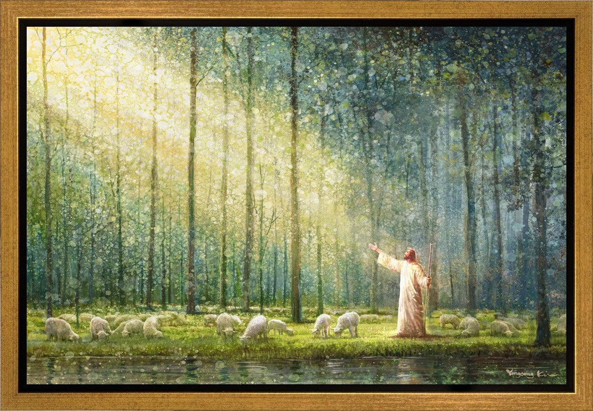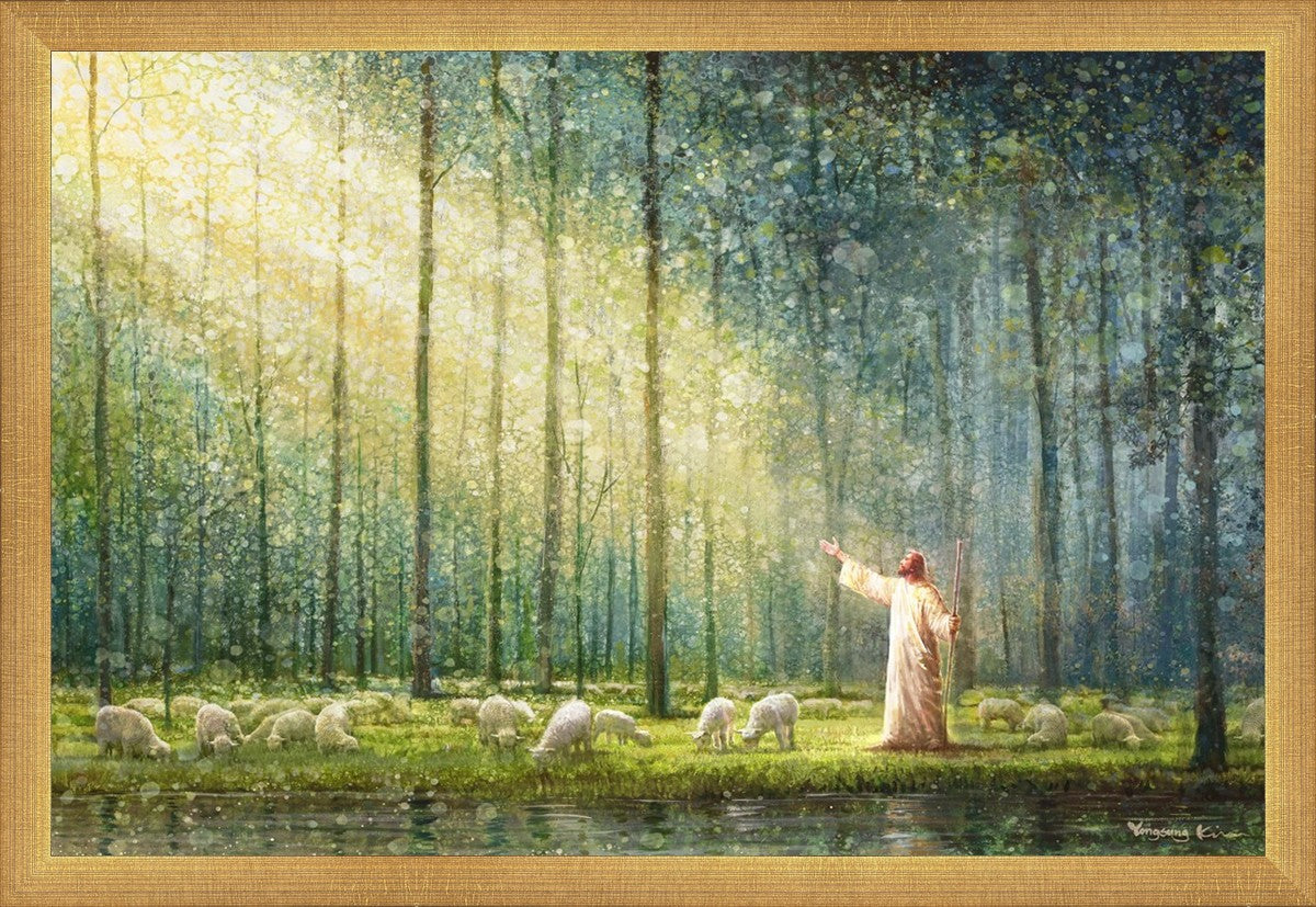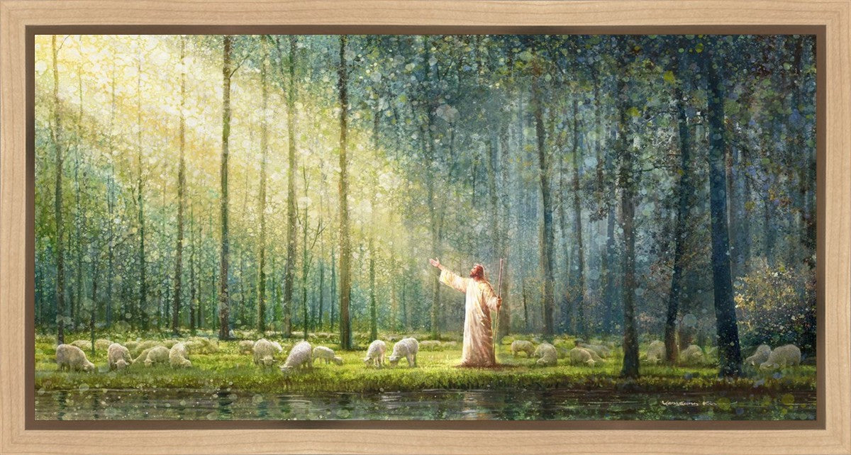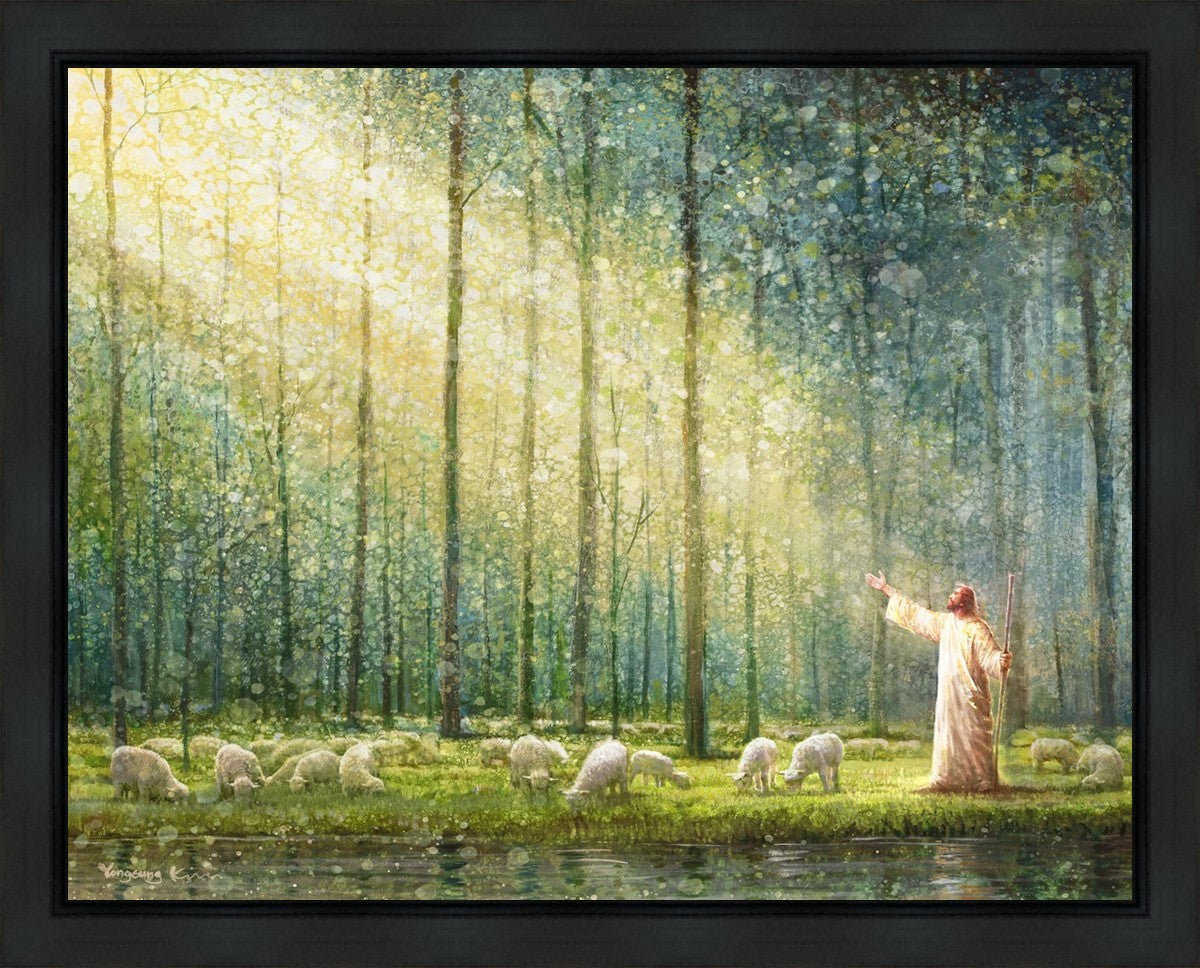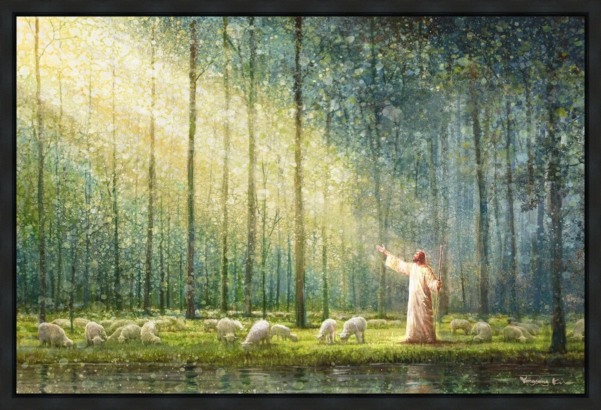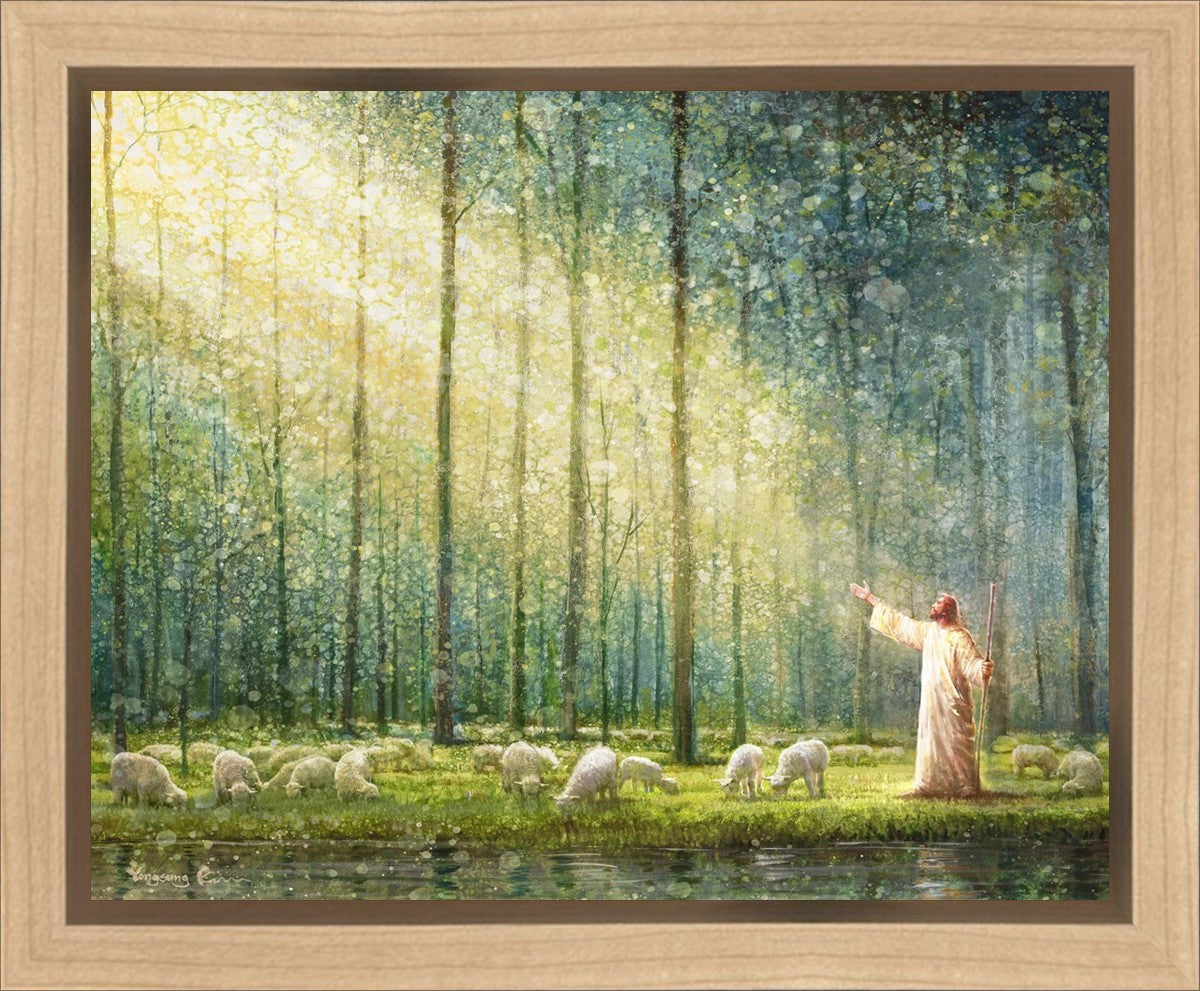 What is the promise of Zion? In Yongsung Kim's painting Rest, inspired by Jeremiah 31:12, the imagery of a lush and vibrant forest reflects a soul nourished by divine grace. Just as the trees,the grasses, and the flock are sustained by life-giving water, so too the soul is replenished by the spiritual nourishment that comes from a deep connection with God. The serene scene invites reflection on the promise of restoration and renewal, where the soul, like the garden, finds its rest in the presence of the divine.
