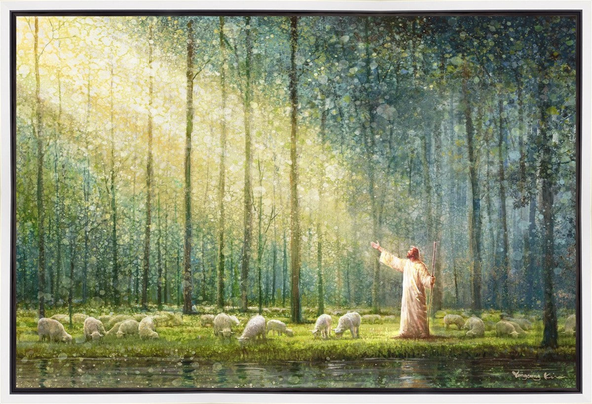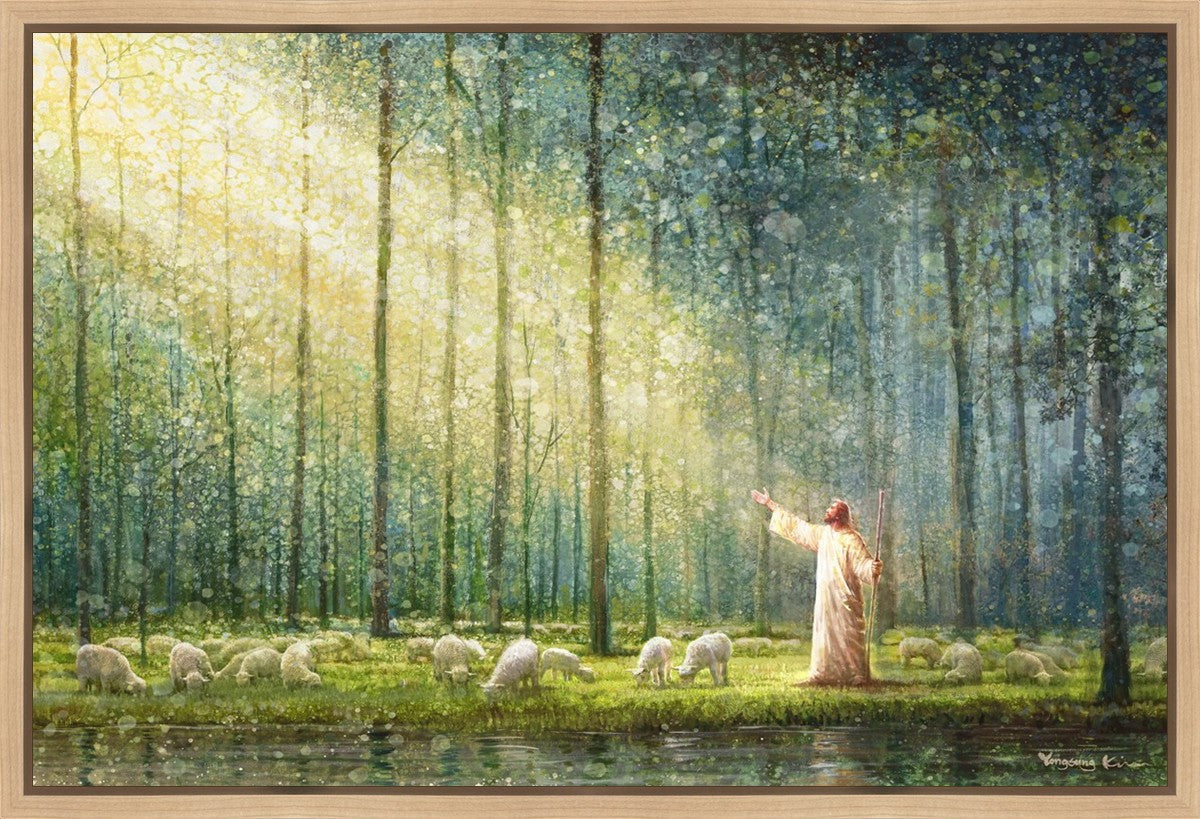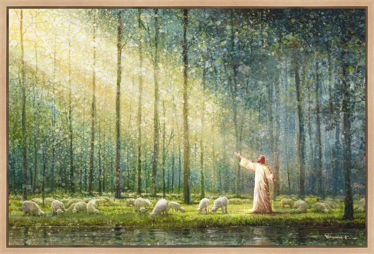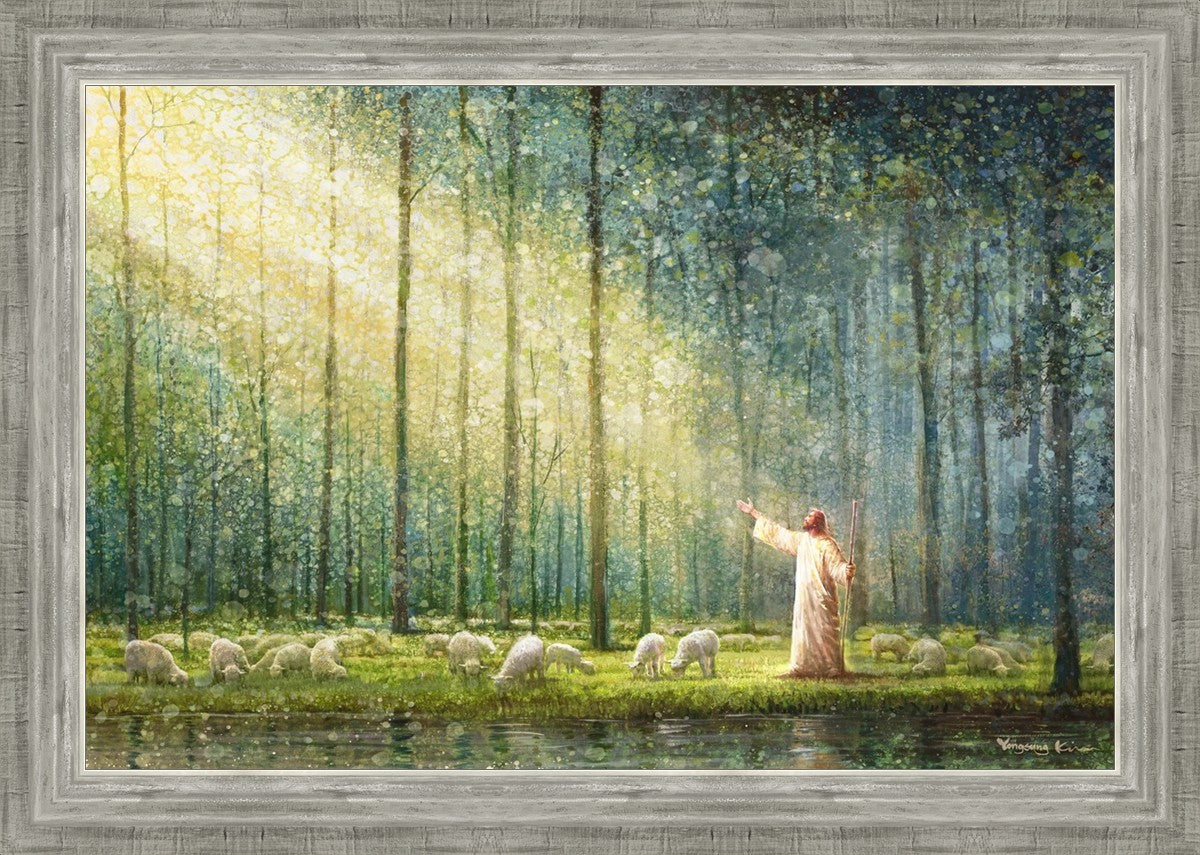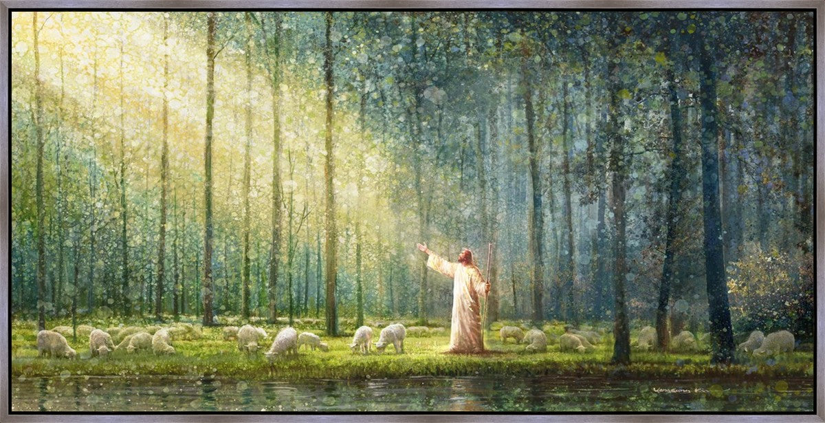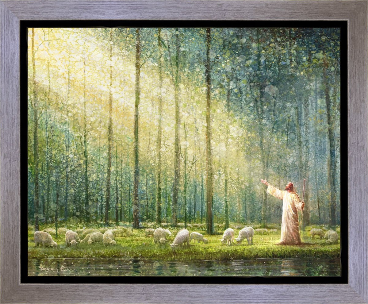 What is the promise of Zion? In Yongsung Kim's painting Rest, inspired by Jeremiah 31:12, the imagery of a lush and vibrant forest reflects a soul nourished by divine grace. Just as the trees,the grasses, and the flock are sustained by life-giving water, so too the soul is replenished by the spiritual nourishment that comes from a deep connection with God. The serene scene invites reflection on the promise of restoration and renewal, where the soul, like the garden, finds its rest in the presence of the divine.