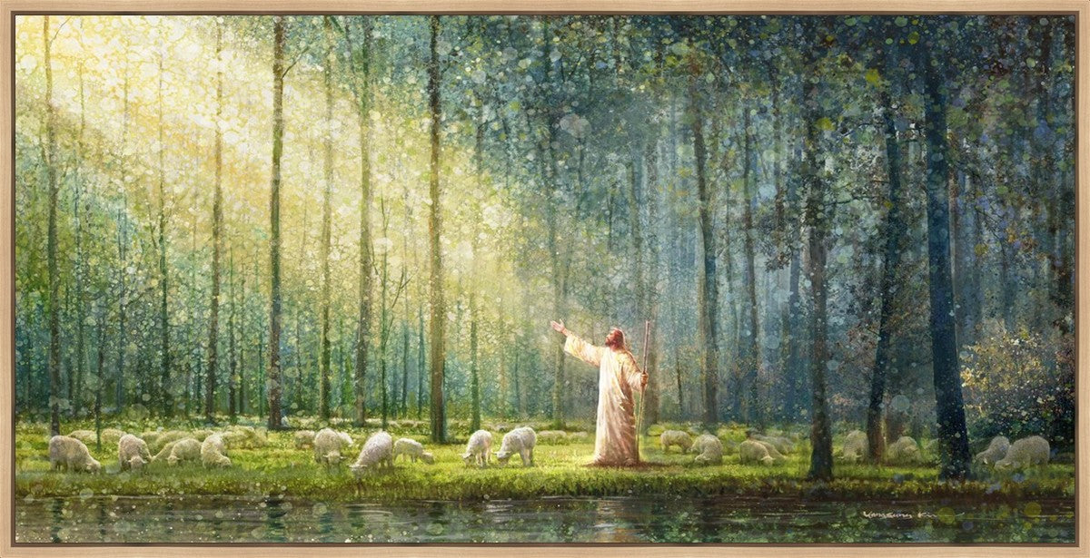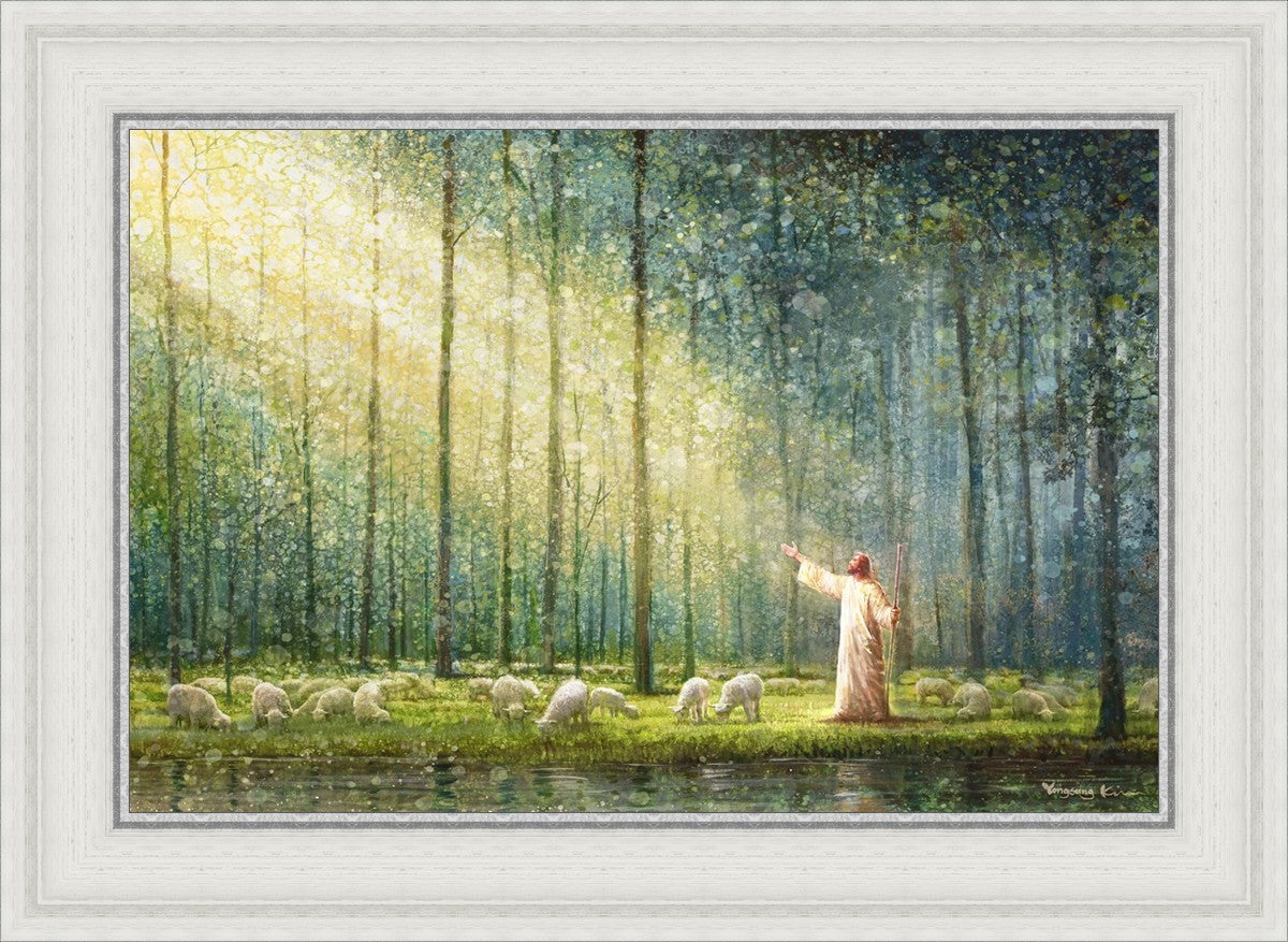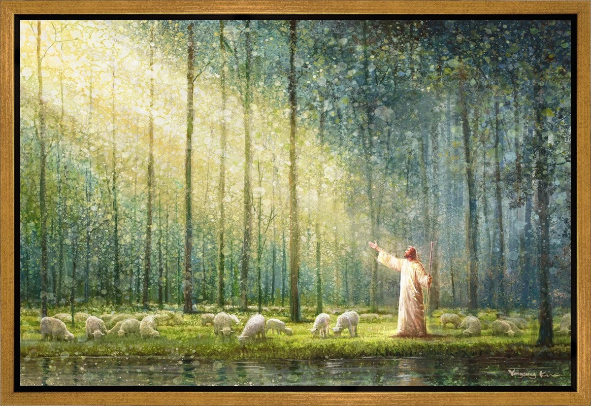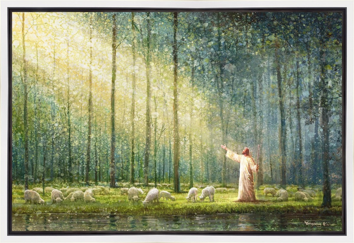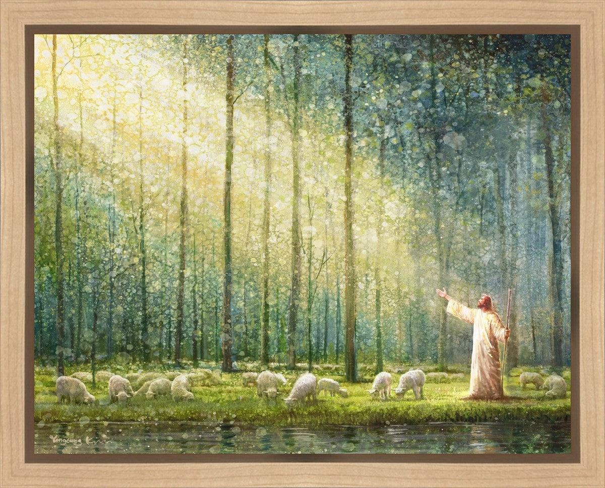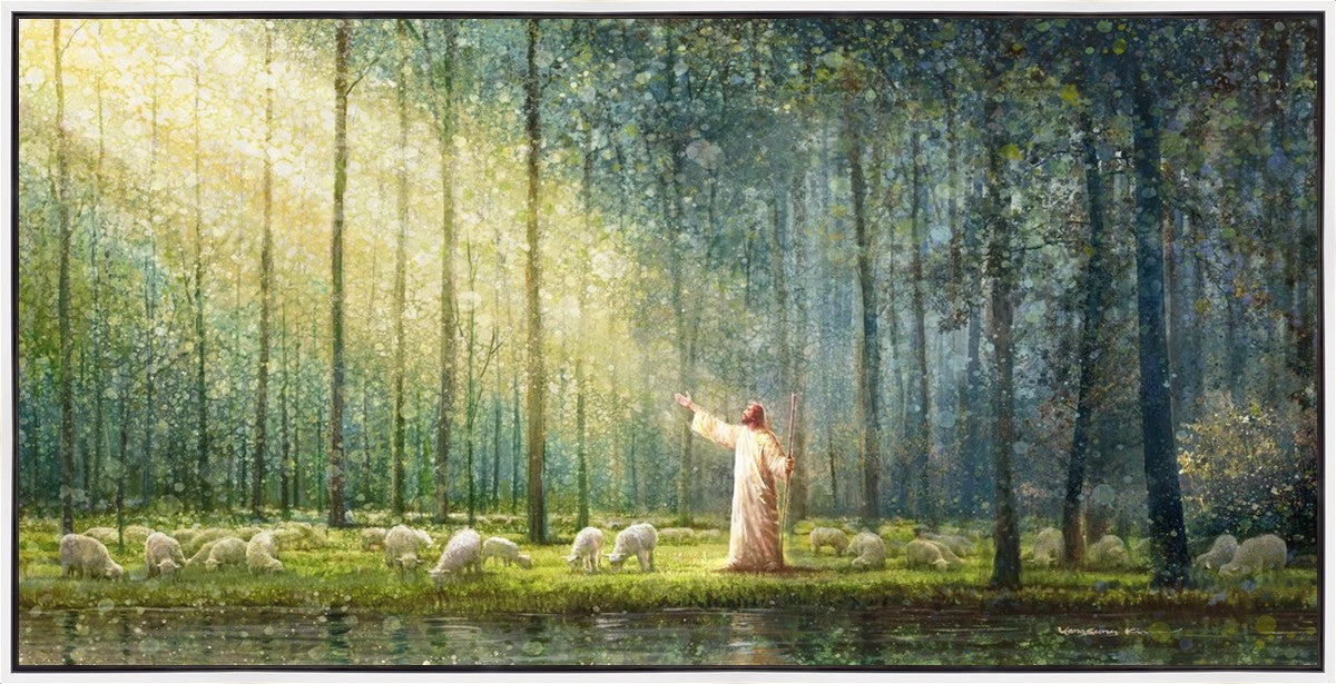 What is the promise of Zion? In Yongsung Kim's painting Rest, inspired by Jeremiah 31:12, the imagery of a lush and vibrant forest reflects a soul nourished by divine grace. Just as the trees,the grasses, and the flock are sustained by life-giving water, so too the soul is replenished by the spiritual nourishment that comes from a deep connection with God. The serene scene invites reflection on the promise of restoration and renewal, where the soul, like the garden, finds its rest in the presence of the divine.