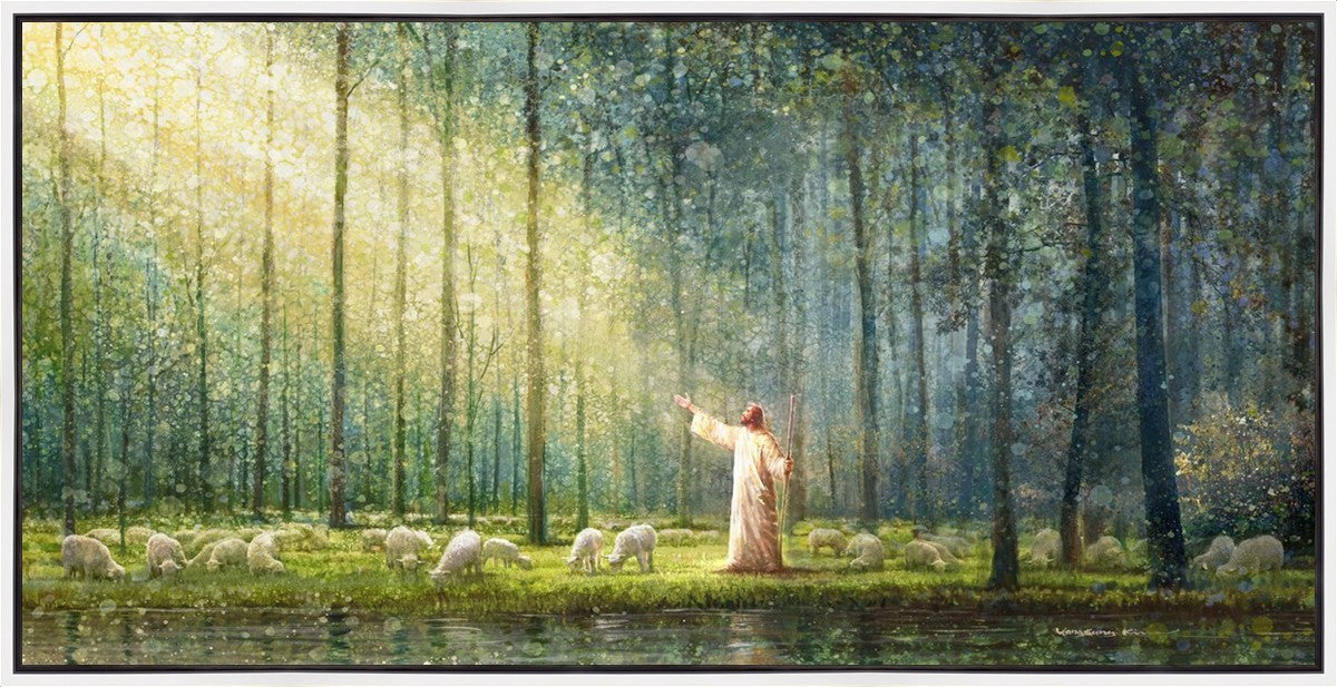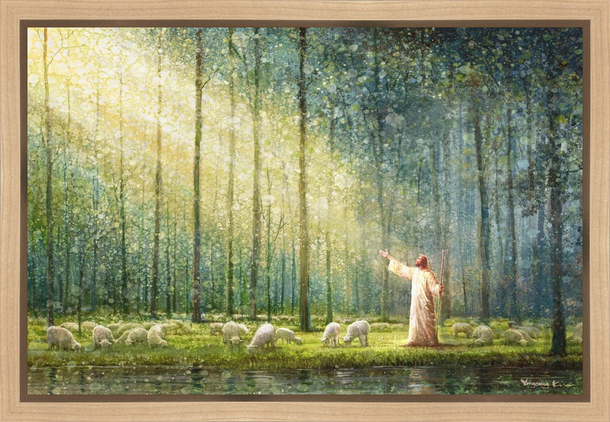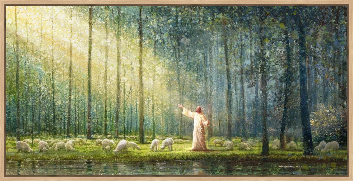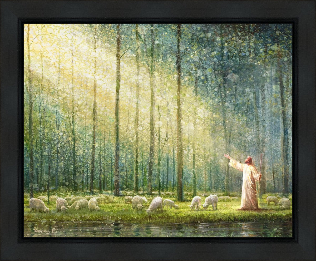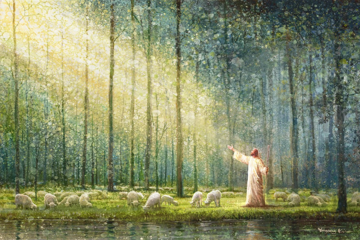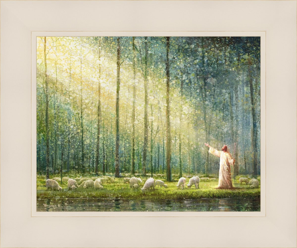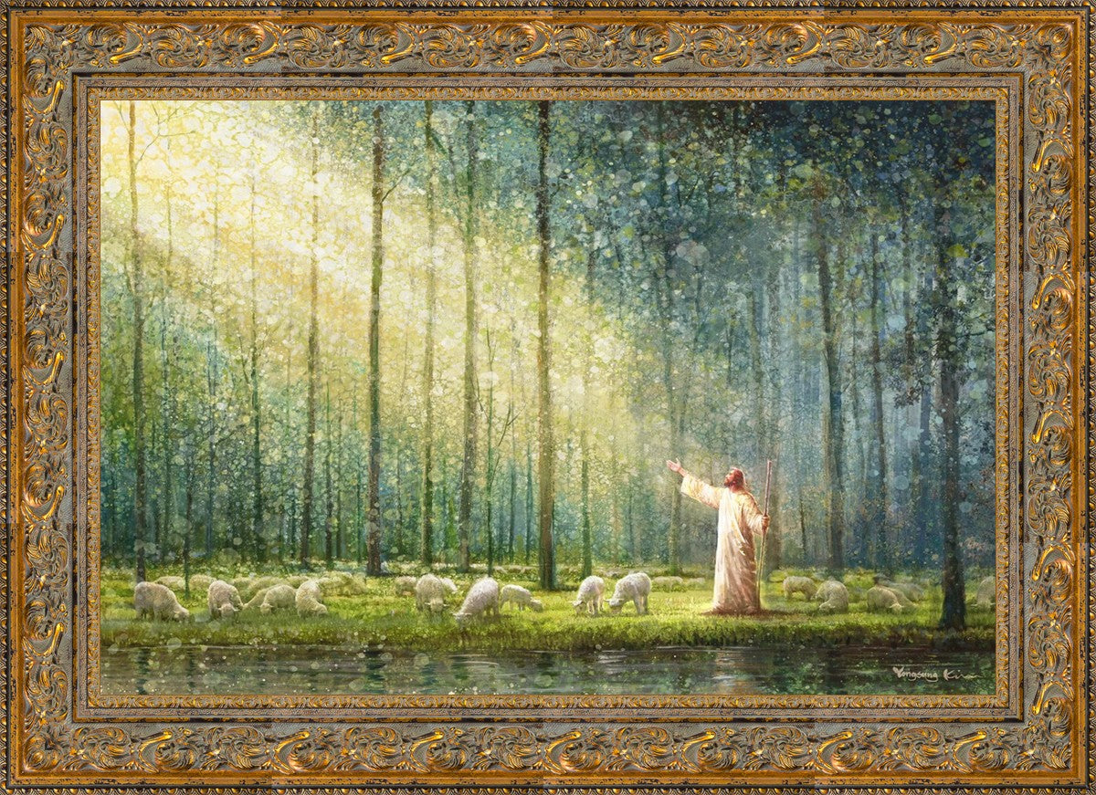 What is the promise of Zion? In Yongsung Kim's painting Rest, inspired by Jeremiah 31:12, the imagery of a lush and vibrant forest reflects a soul nourished by divine grace. Just as the trees,the grasses, and the flock are sustained by life-giving water, so too the soul is replenished by the spiritual nourishment that comes from a deep connection with God. The serene scene invites reflection on the promise of restoration and renewal, where the soul, like the garden, finds its rest in the presence of the divine.