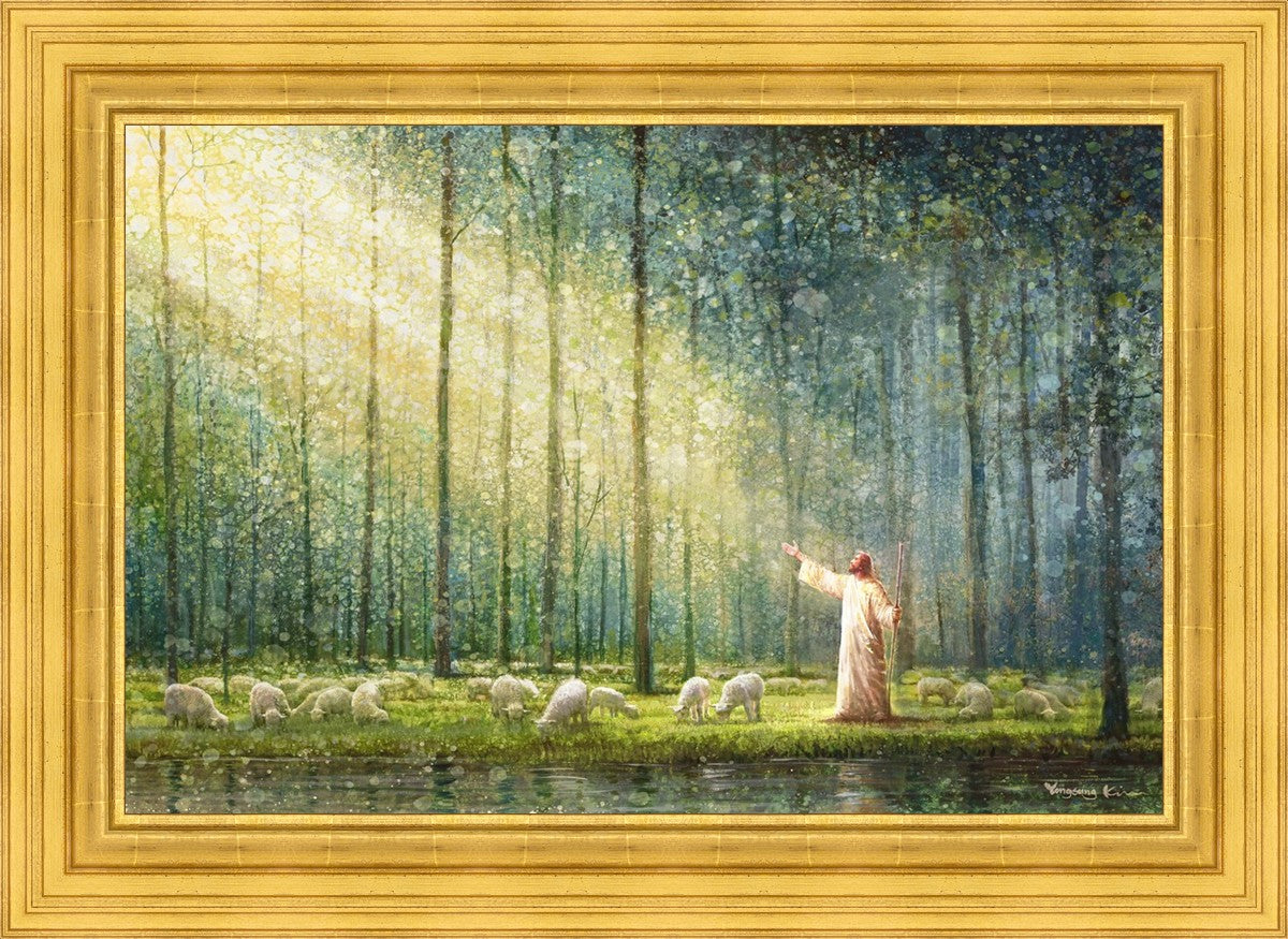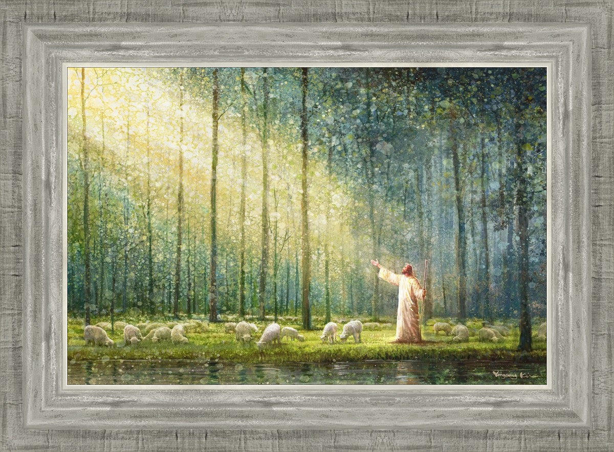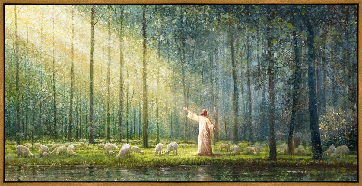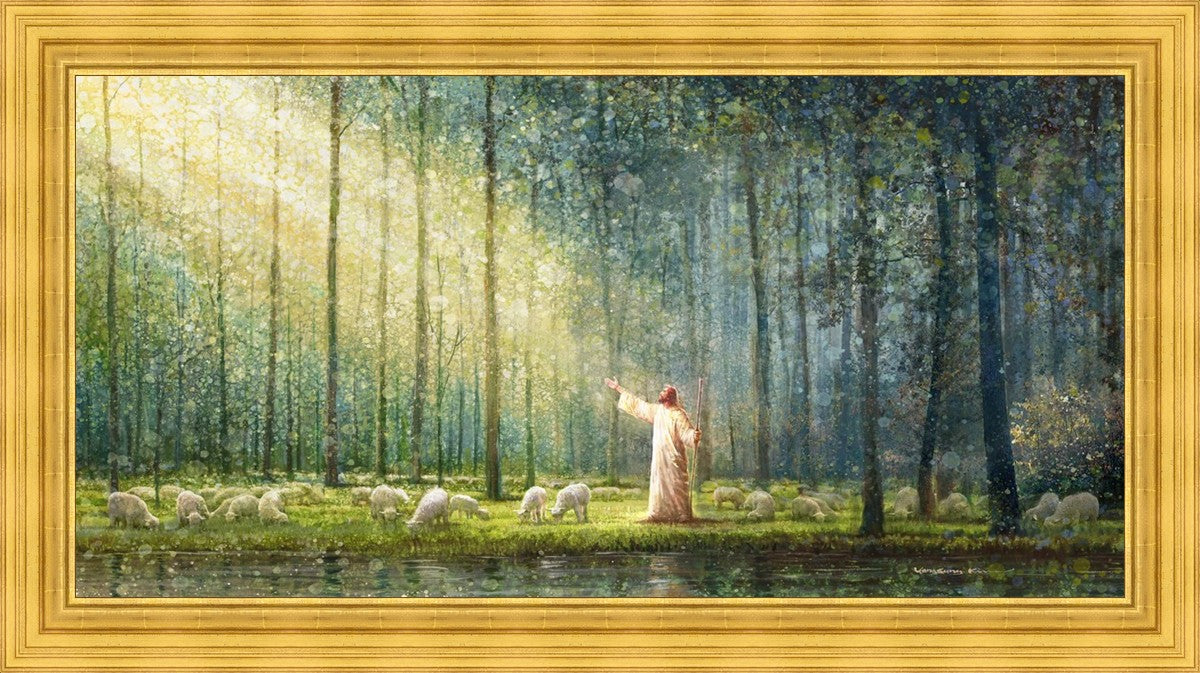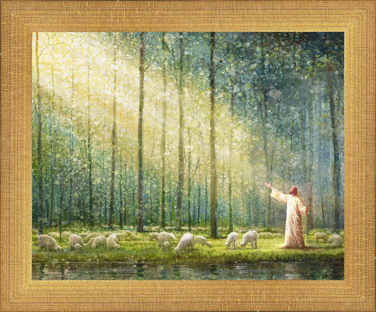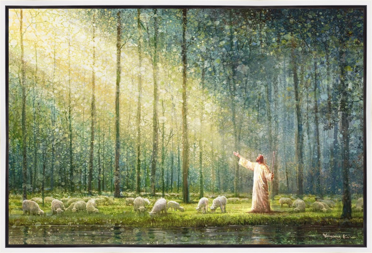 What is the promise of Zion? In Yongsung Kim's painting Rest, inspired by Jeremiah 31:12, the imagery of a lush and vibrant forest reflects a soul nourished by divine grace. Just as the trees,the grasses, and the flock are sustained by life-giving water, so too the soul is replenished by the spiritual nourishment that comes from a deep connection with God. The serene scene invites reflection on the promise of restoration and renewal, where the soul, like the garden, finds its rest in the presence of the divine.