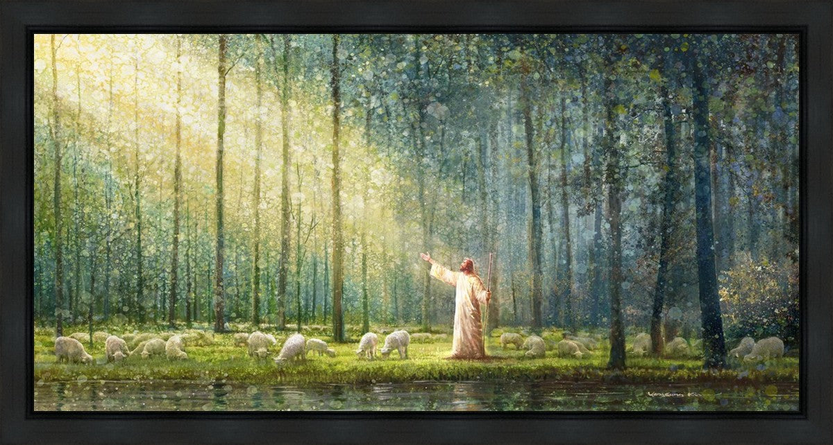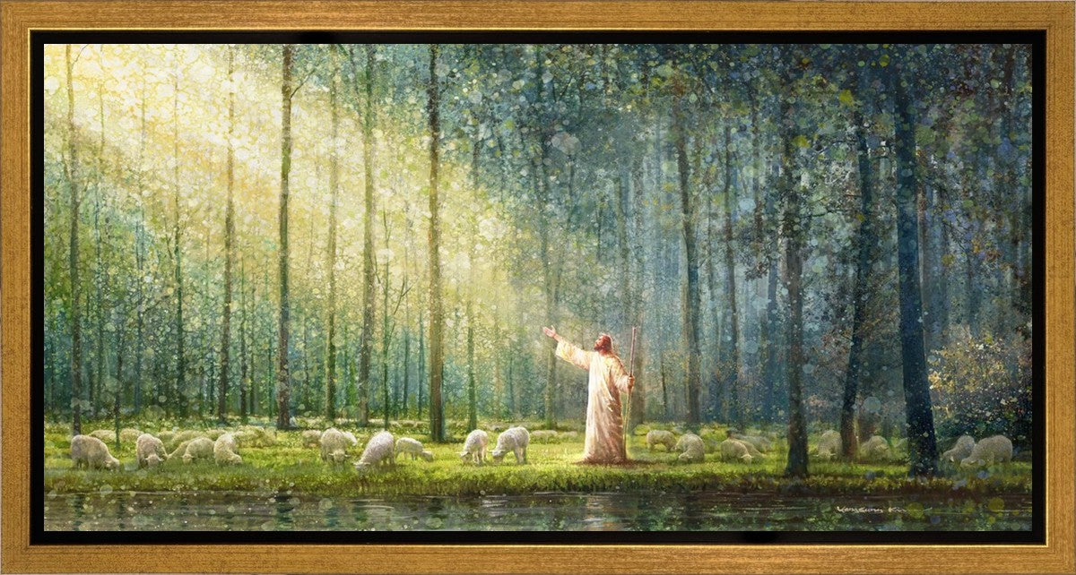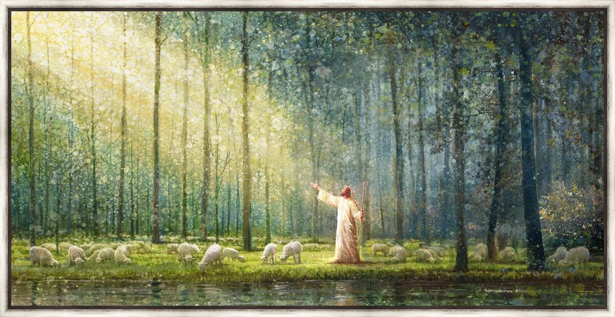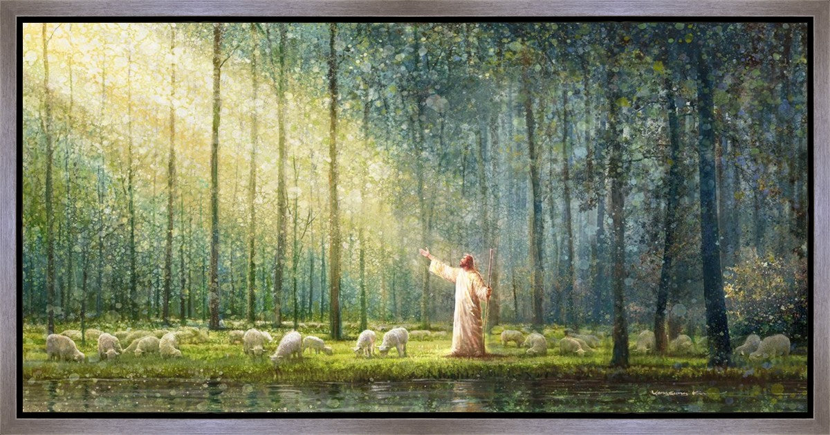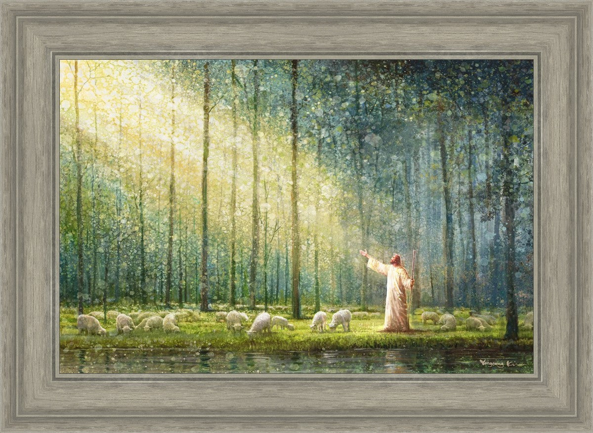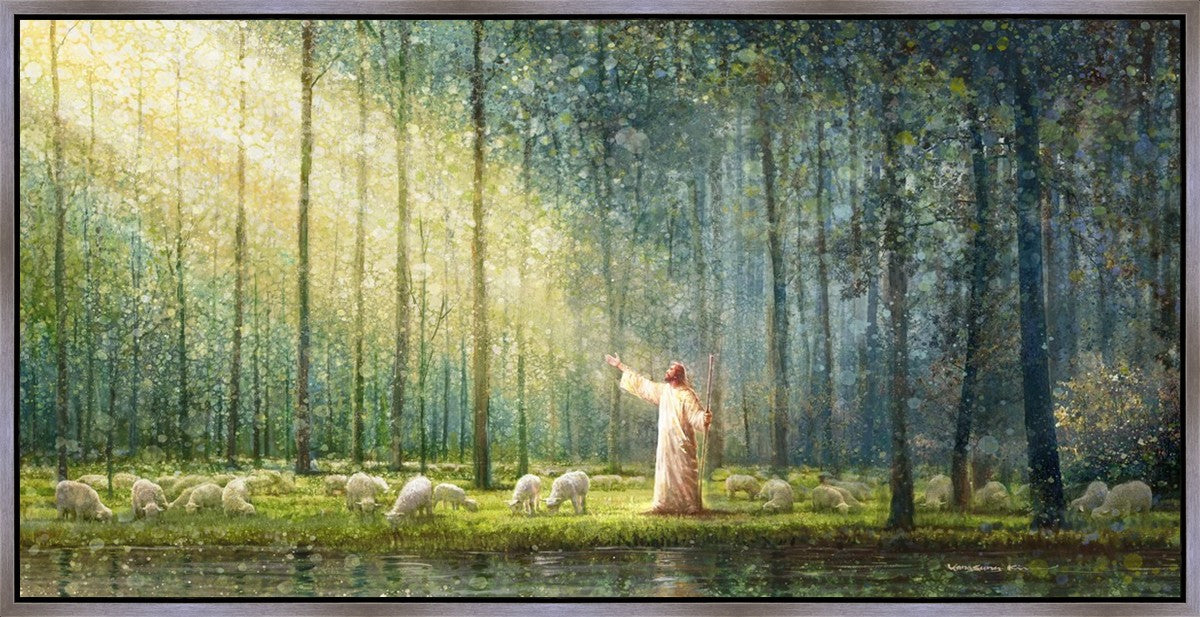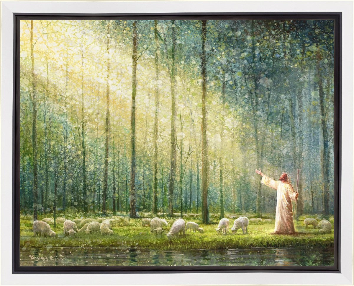 What is the promise of Zion? In Yongsung Kim's painting Rest, inspired by Jeremiah 31:12, the imagery of a lush and vibrant forest reflects a soul nourished by divine grace. Just as the trees,the grasses, and the flock are sustained by life-giving water, so too the soul is replenished by the spiritual nourishment that comes from a deep connection with God. The serene scene invites reflection on the promise of restoration and renewal, where the soul, like the garden, finds its rest in the presence of the divine.