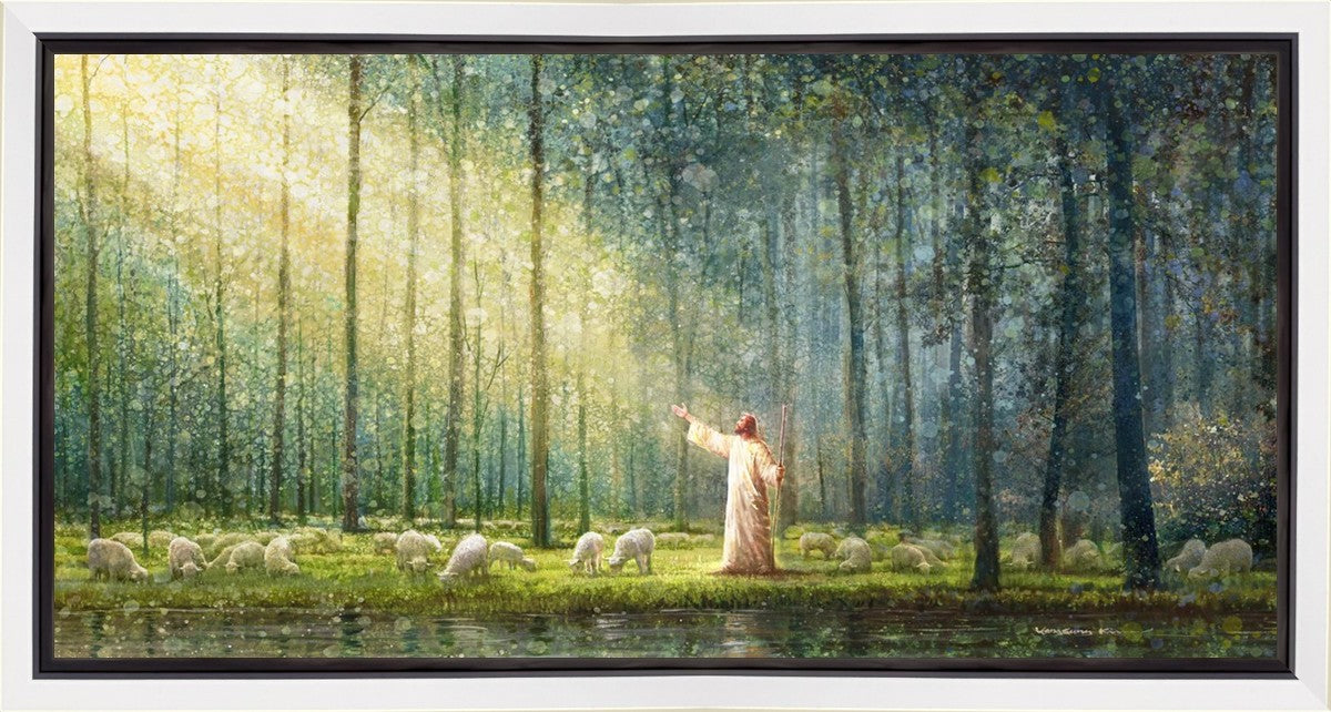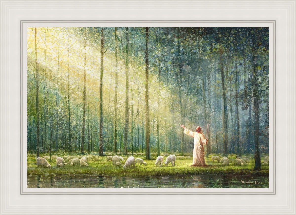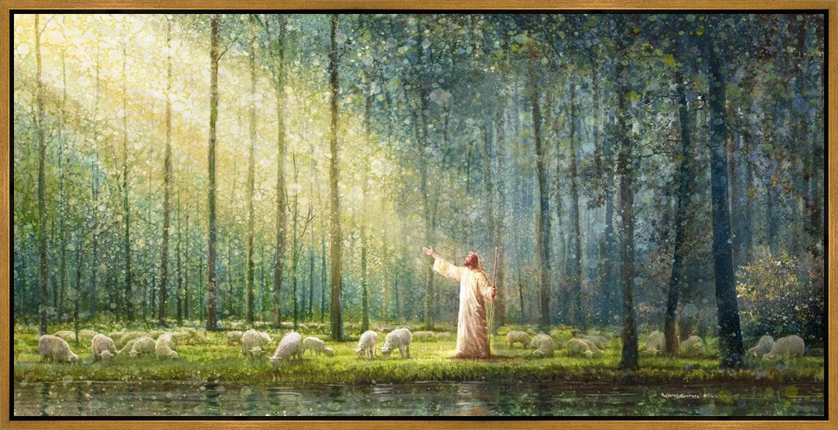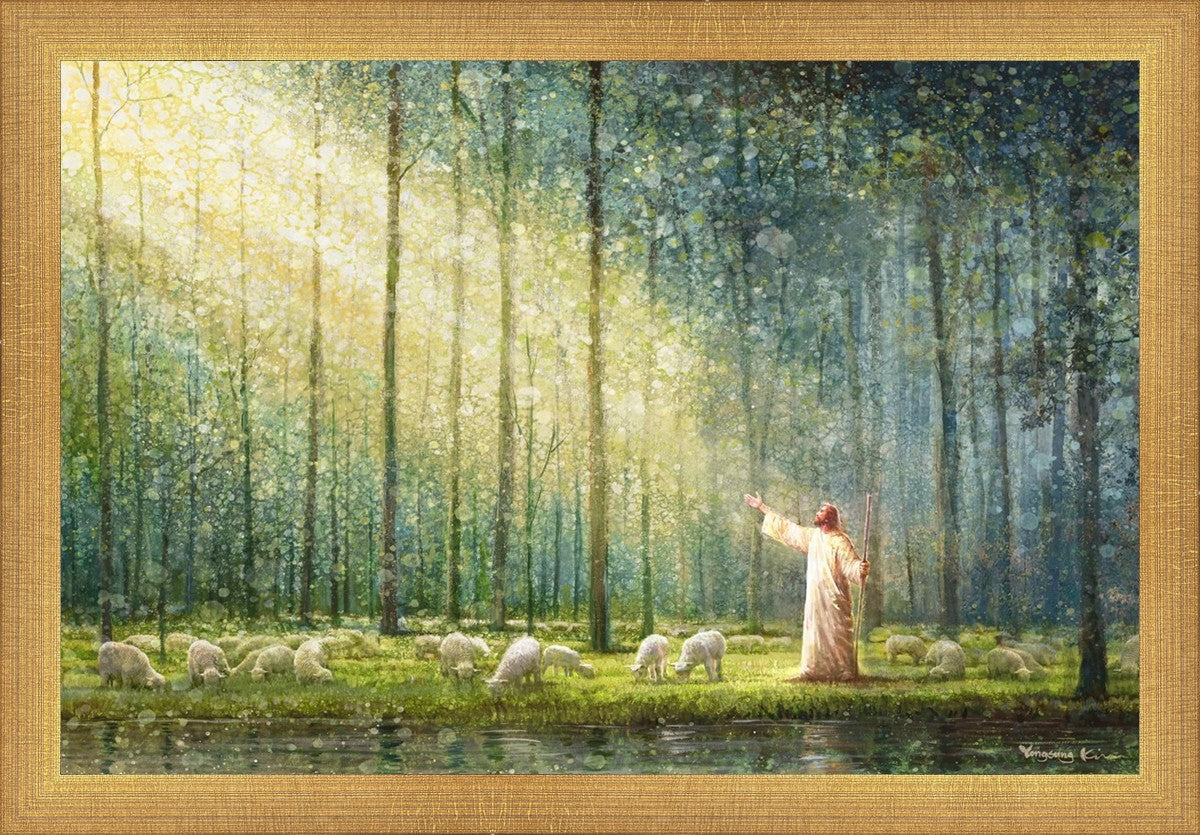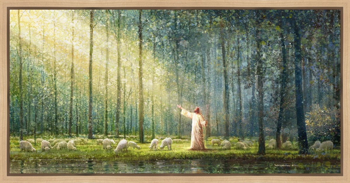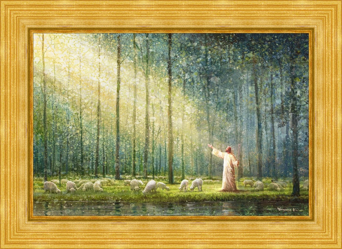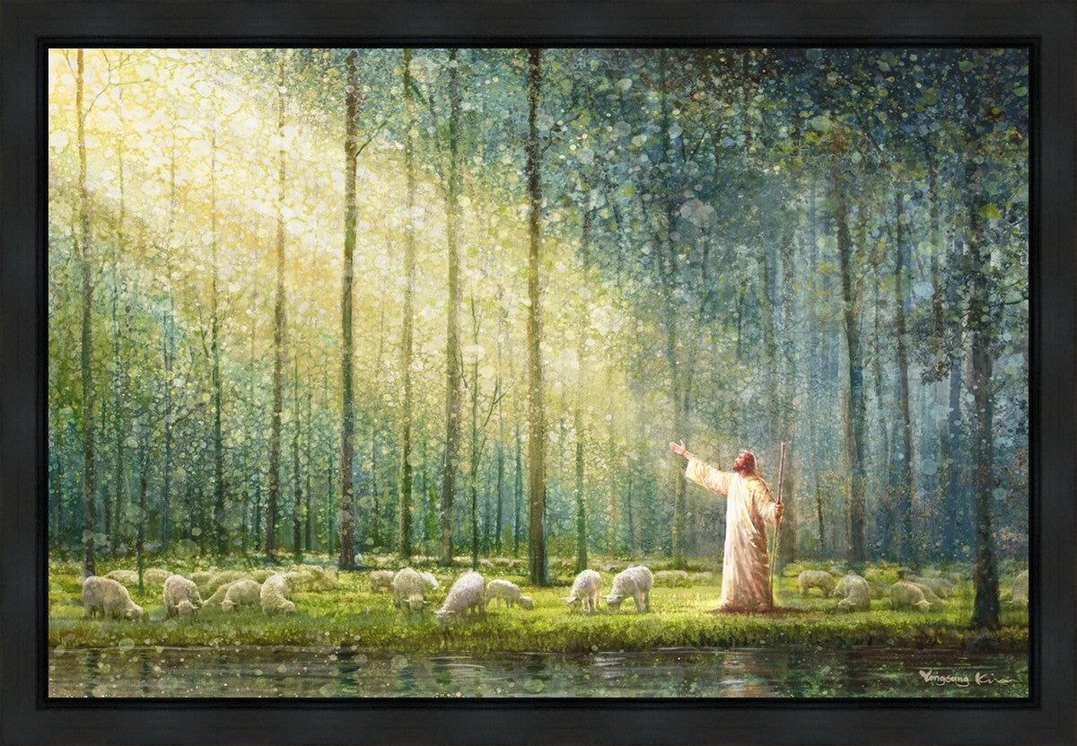 What is the promise of Zion? In Yongsung Kim's painting Rest, inspired by Jeremiah 31:12, the imagery of a lush and vibrant forest reflects a soul nourished by divine grace. Just as the trees,the grasses, and the flock are sustained by life-giving water, so too the soul is replenished by the spiritual nourishment that comes from a deep connection with God. The serene scene invites reflection on the promise of restoration and renewal, where the soul, like the garden, finds its rest in the presence of the divine.