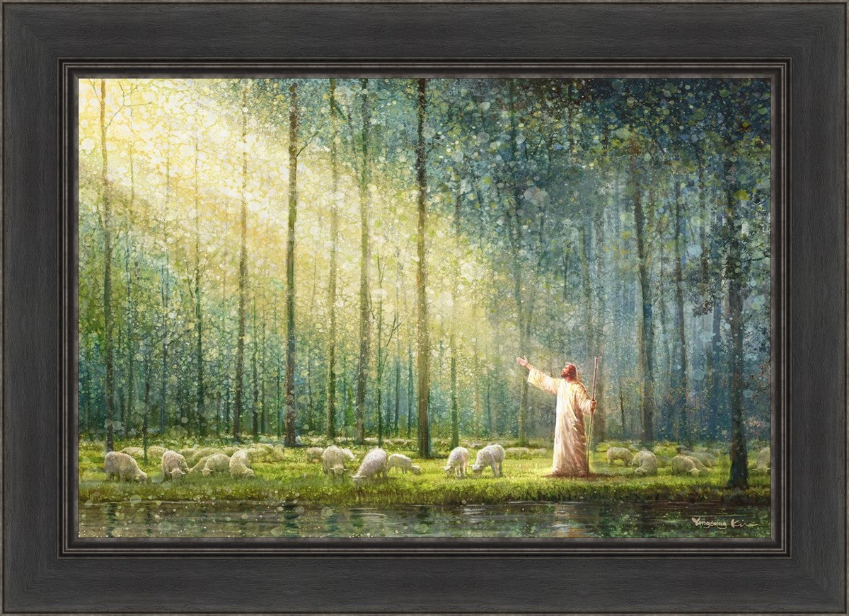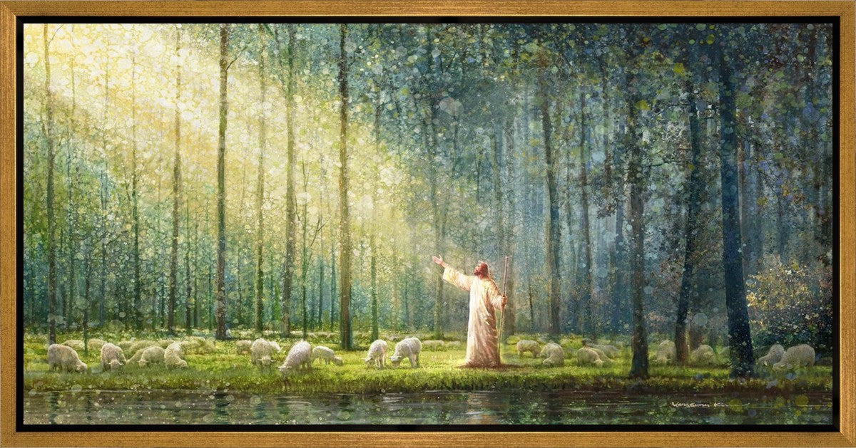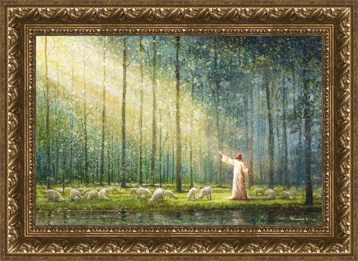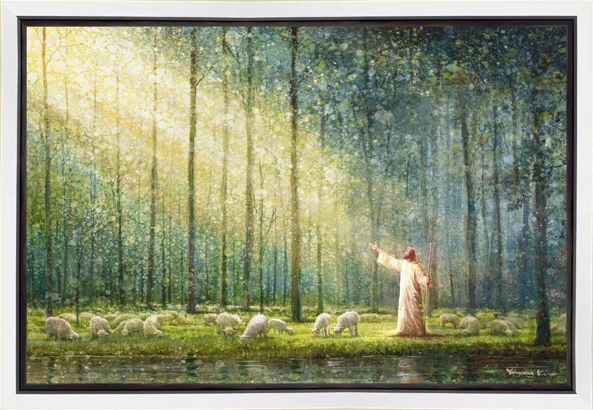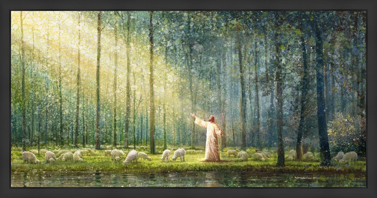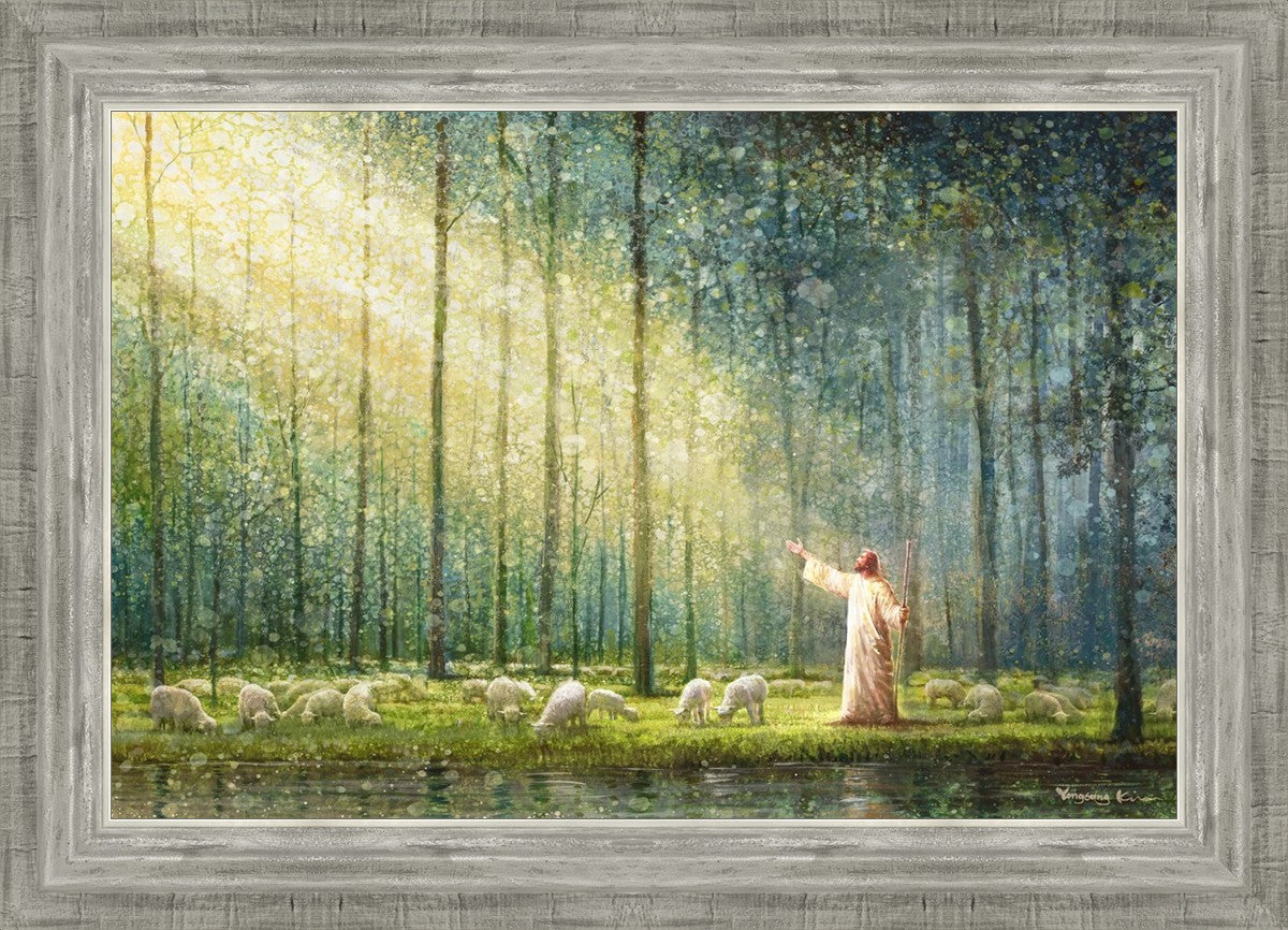 What is the promise of Zion? In Yongsung Kim's painting Rest, inspired by Jeremiah 31:12, the imagery of a lush and vibrant forest reflects a soul nourished by divine grace. Just as the trees,the grasses, and the flock are sustained by life-giving water, so too the soul is replenished by the spiritual nourishment that comes from a deep connection with God. The serene scene invites reflection on the promise of restoration and renewal, where the soul, like the garden, finds its rest in the presence of the divine.