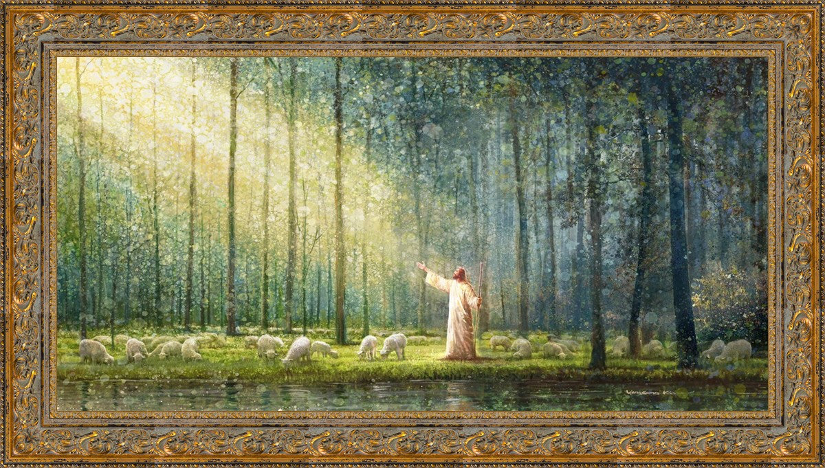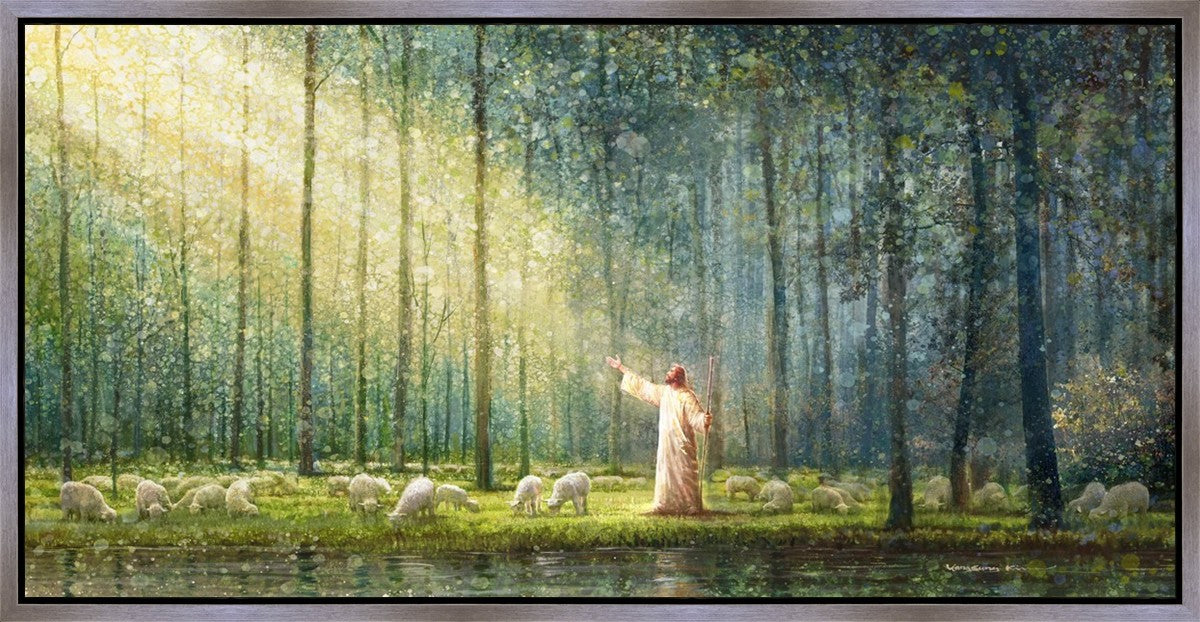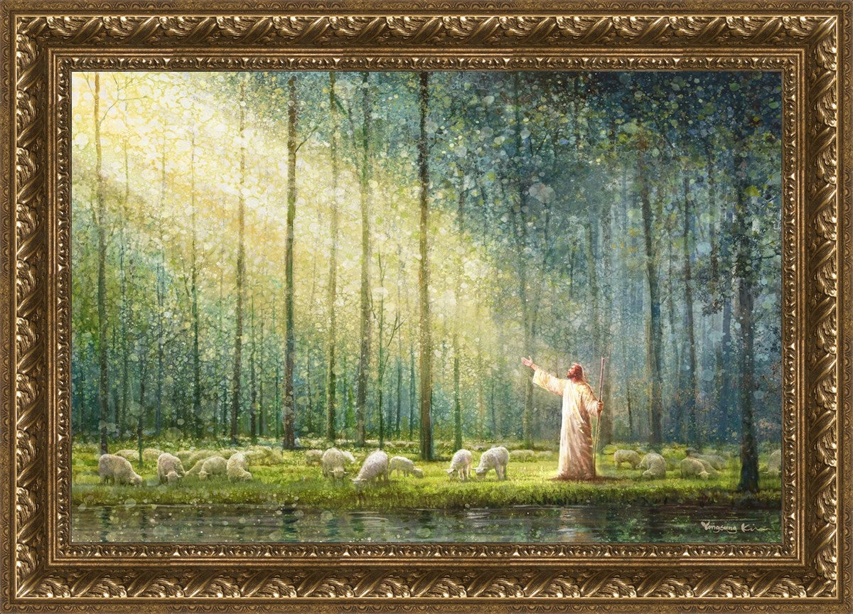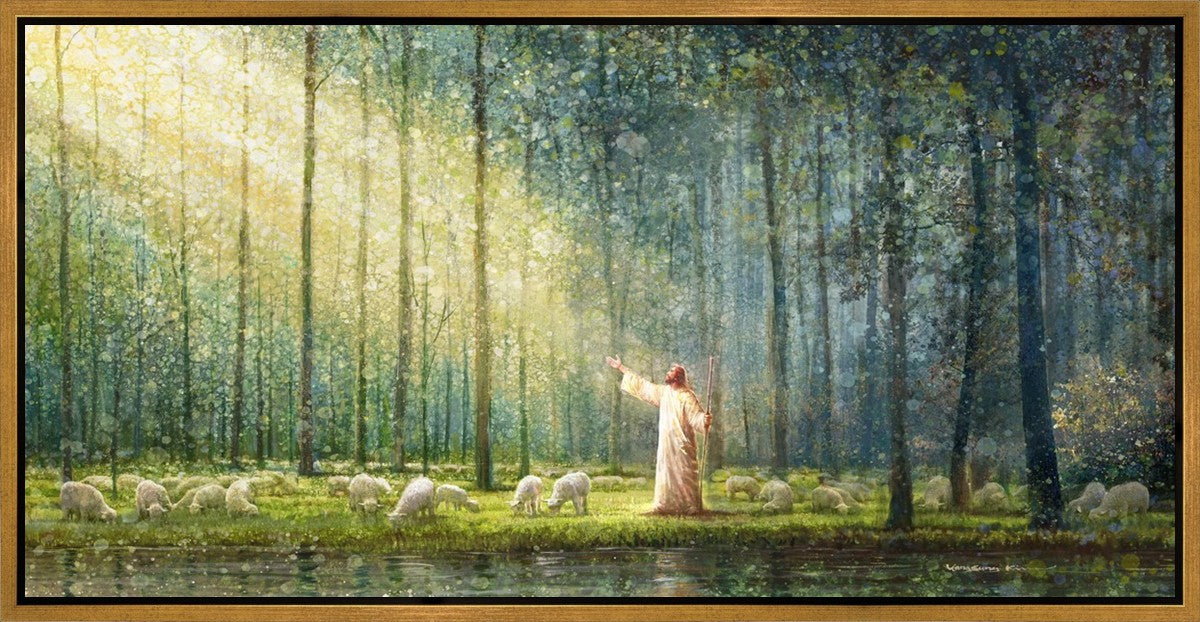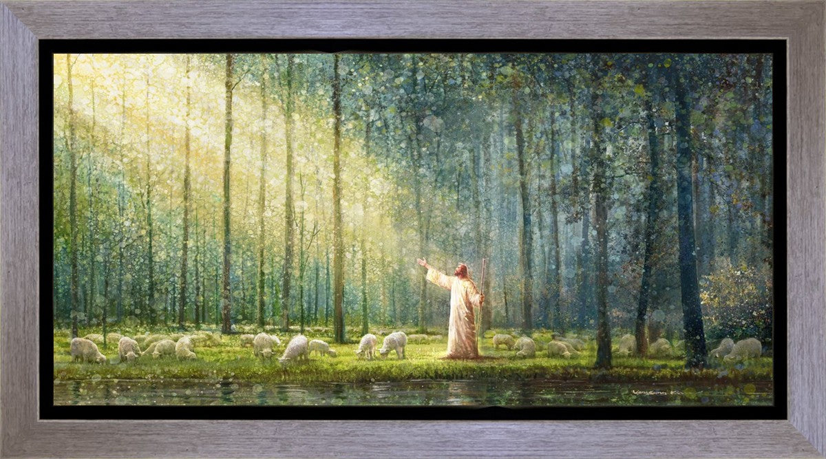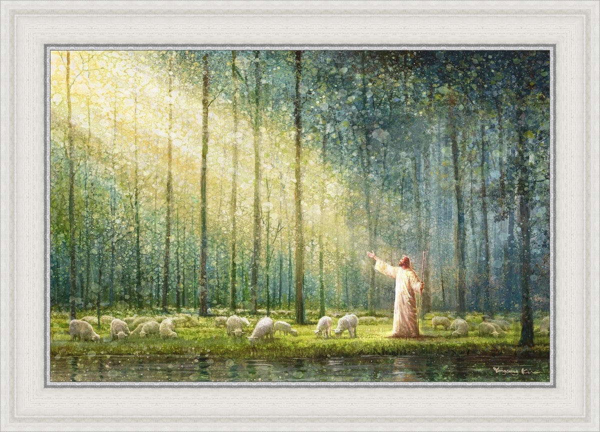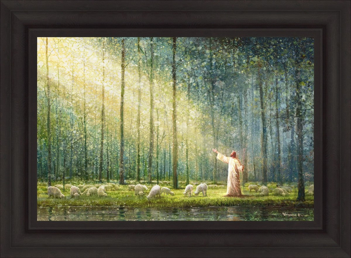 What is the promise of Zion? In Yongsung Kim's painting Rest, inspired by Jeremiah 31:12, the imagery of a lush and vibrant forest reflects a soul nourished by divine grace. Just as the trees,the grasses, and the flock are sustained by life-giving water, so too the soul is replenished by the spiritual nourishment that comes from a deep connection with God. The serene scene invites reflection on the promise of restoration and renewal, where the soul, like the garden, finds its rest in the presence of the divine.