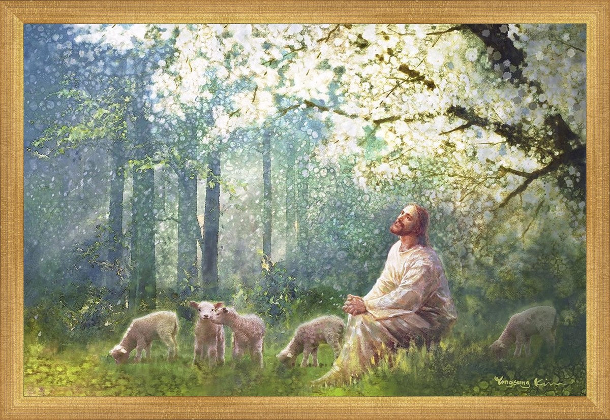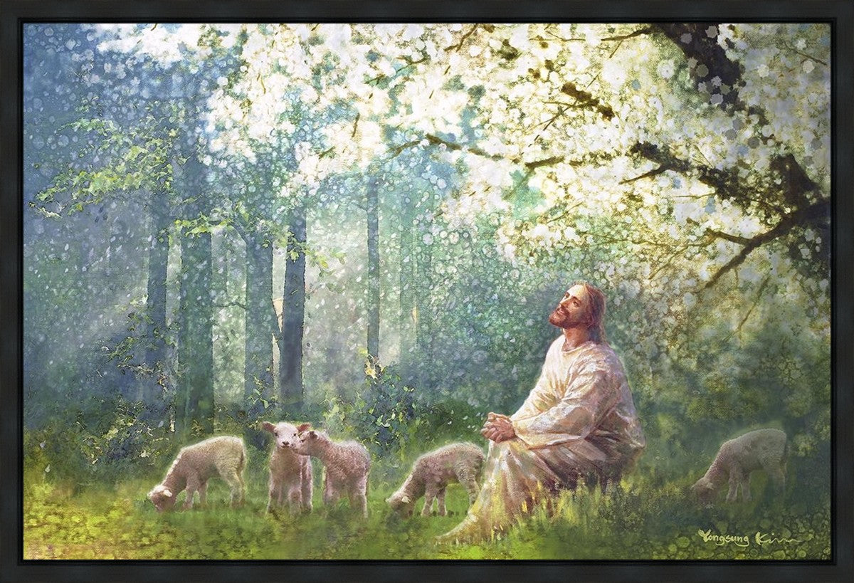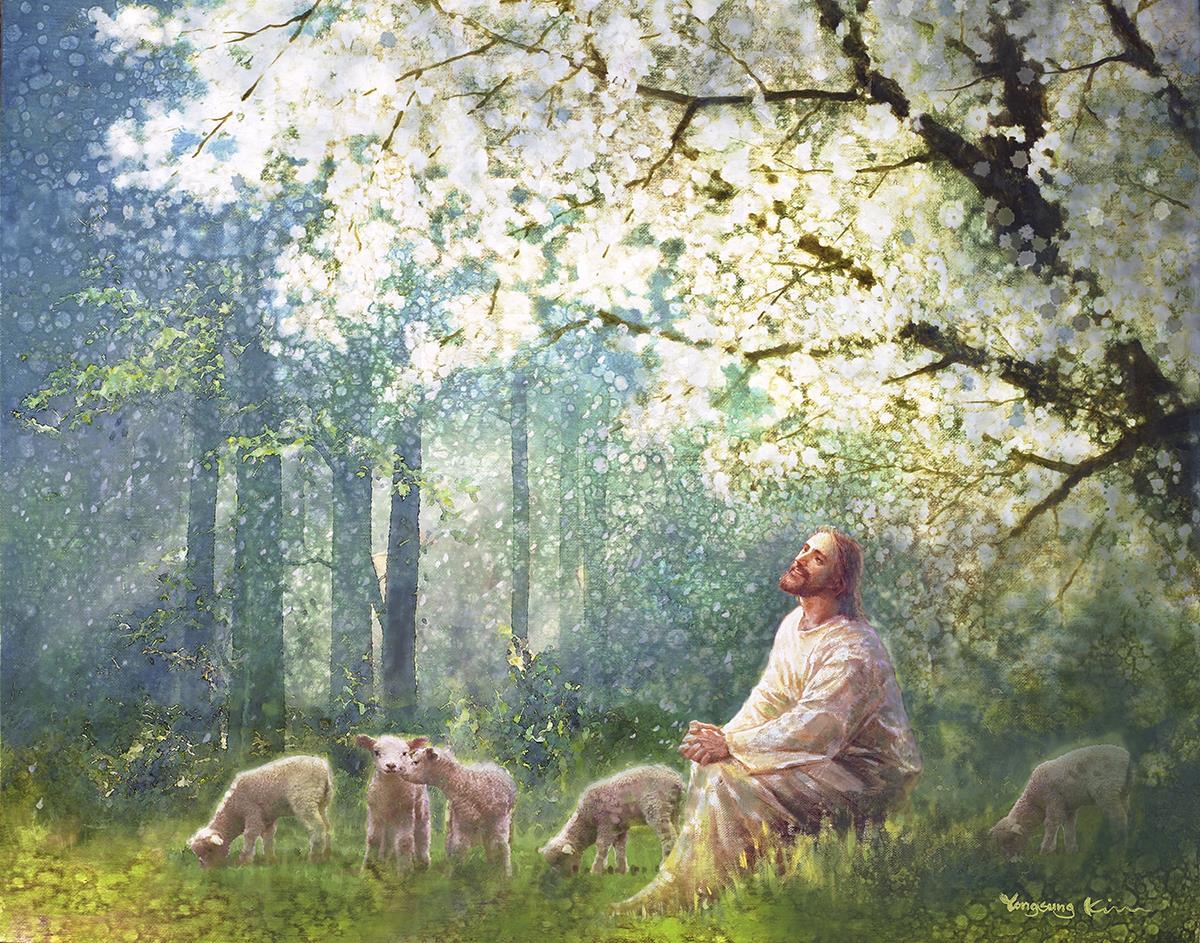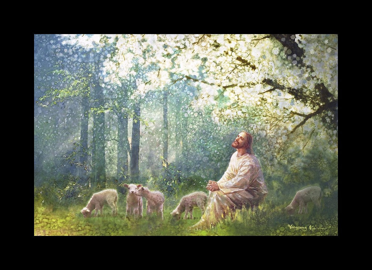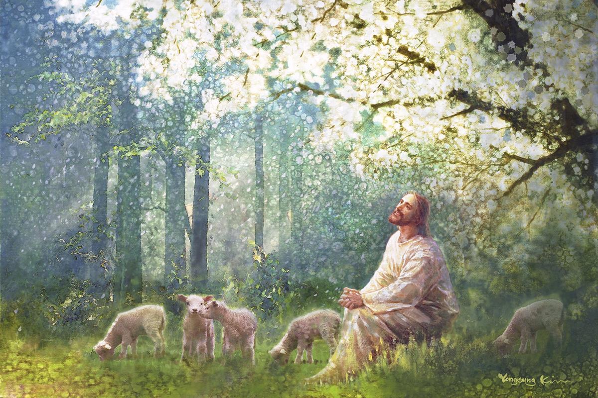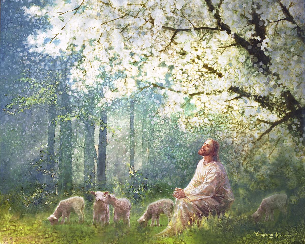 Yong Sung Kim's painting of Sweet is the Work presents Jesus Christ not only as a protector but a caretaker. Here He enjoys time playing beneath a tree nountiful tree with His flock at the edge of an abundant pasture
