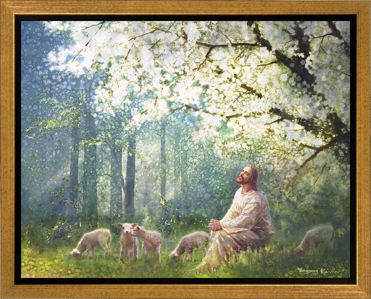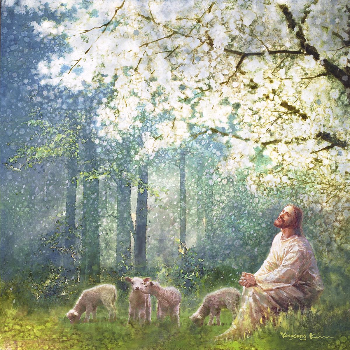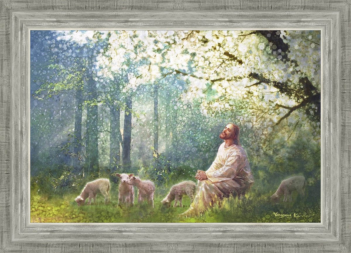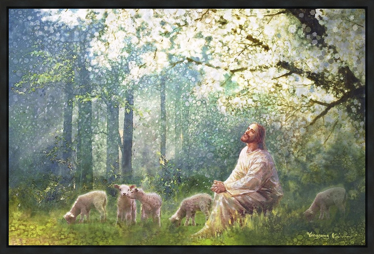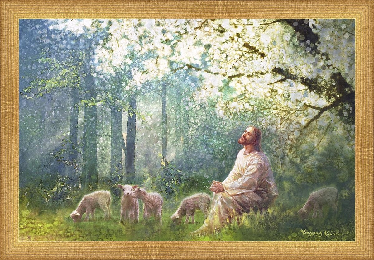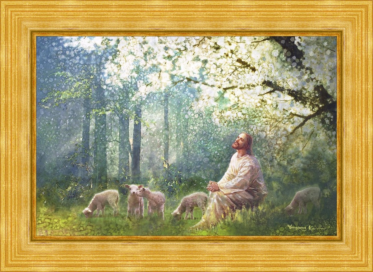 Yong Sung Kim's painting of Sweet is the Work presents Jesus Christ not only as a protector but a caretaker. Here He enjoys time playing beneath a tree nountiful tree with His flock at the edge of an abundant pasture