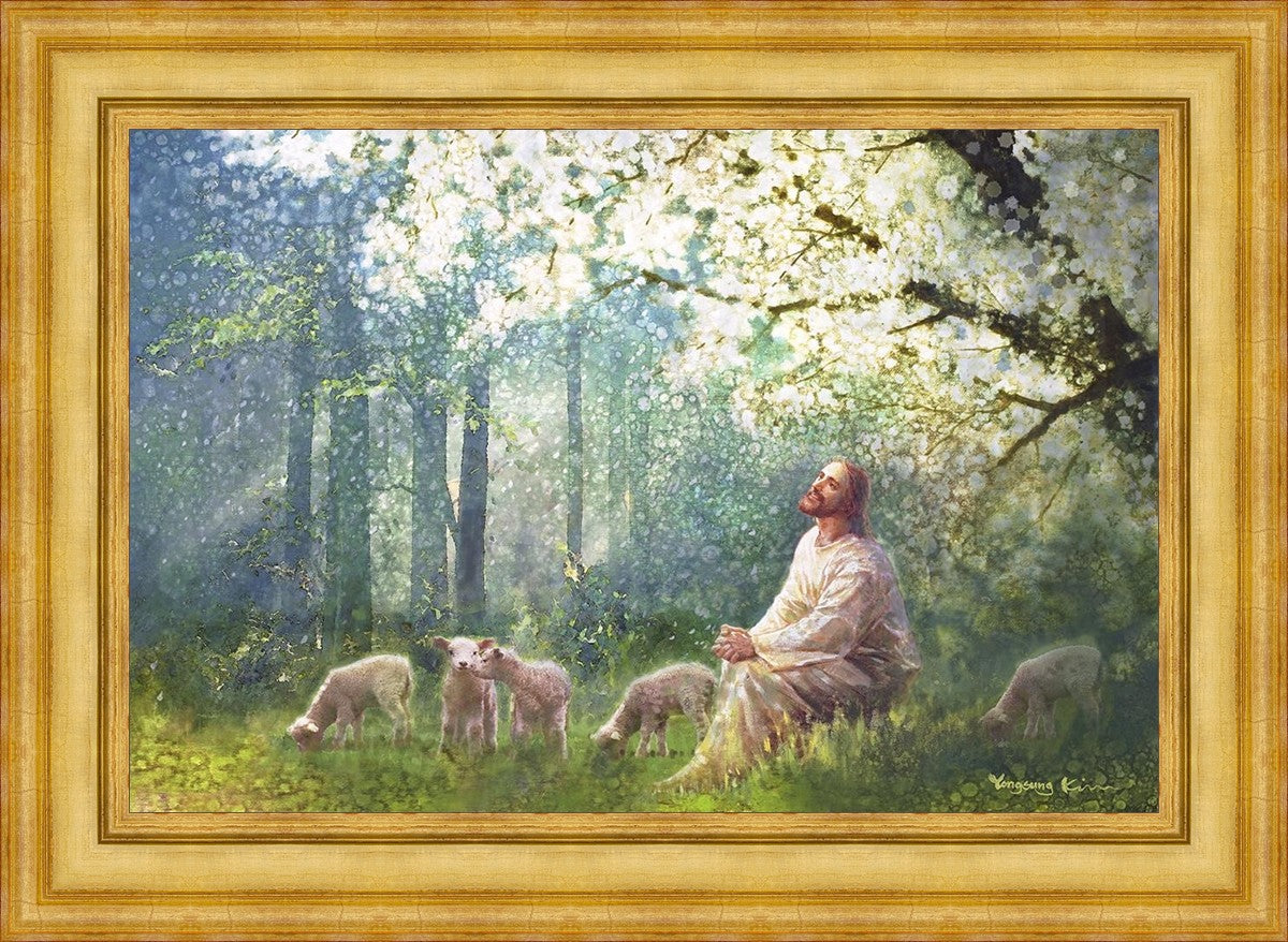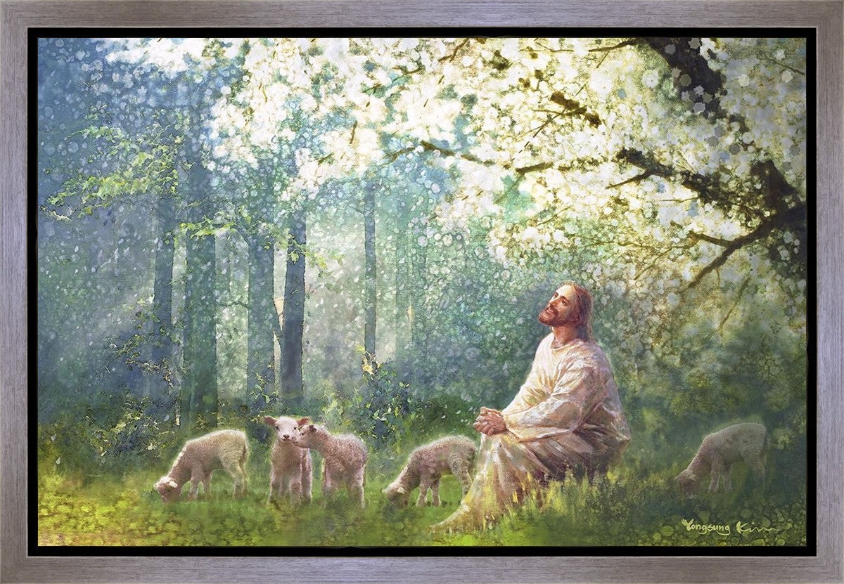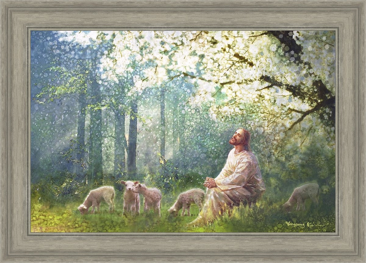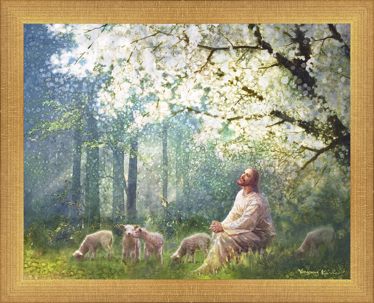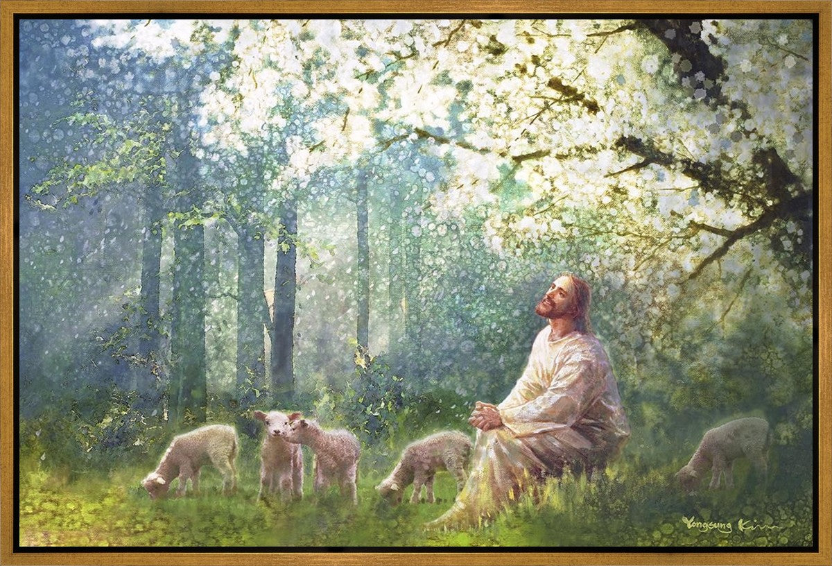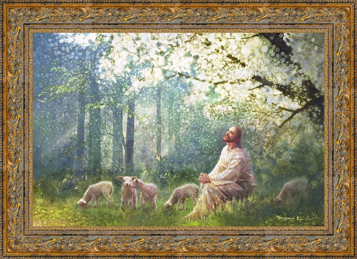 Yong Sung Kim's painting of Sweet is the Work presents Jesus Christ not only as a protector but a caretaker. Here He enjoys time playing beneath a tree nountiful tree with His flock at the edge of an abundant pasture