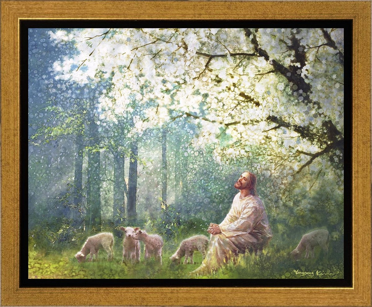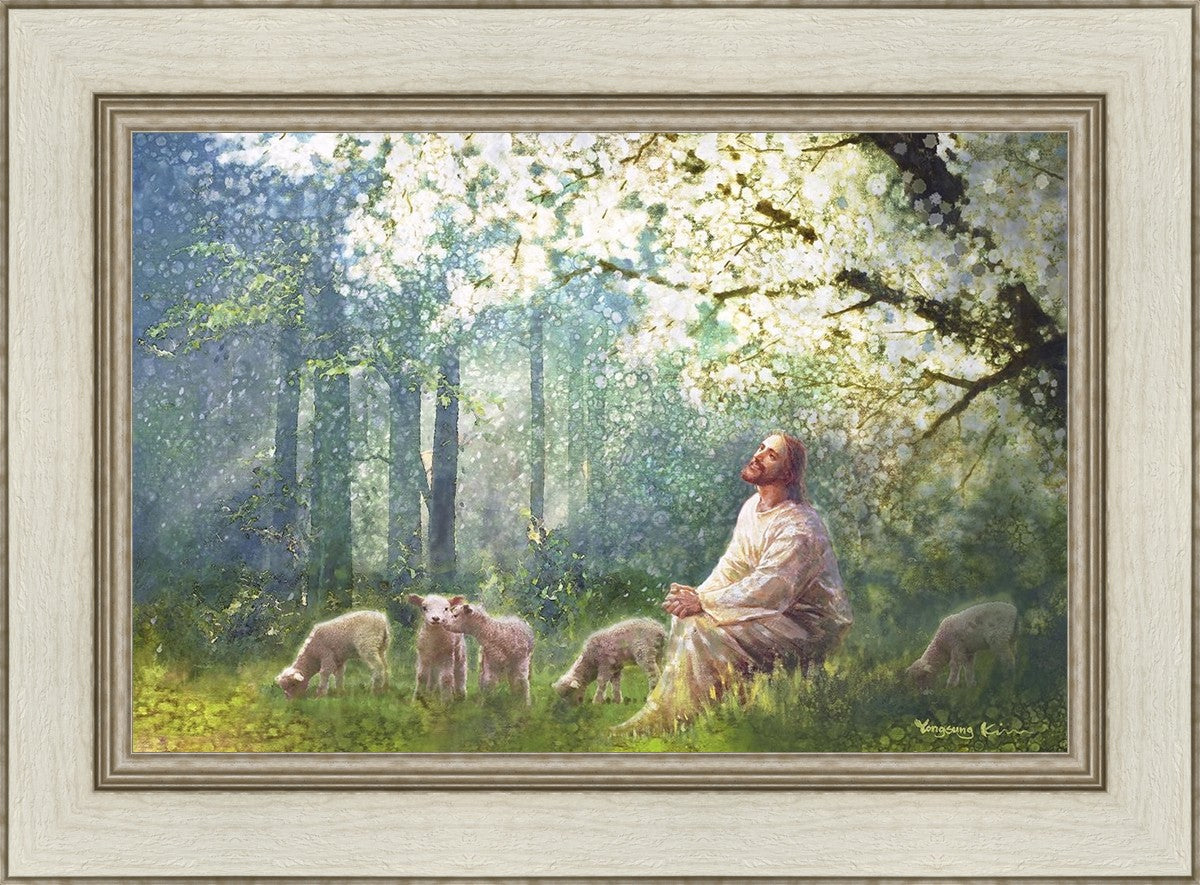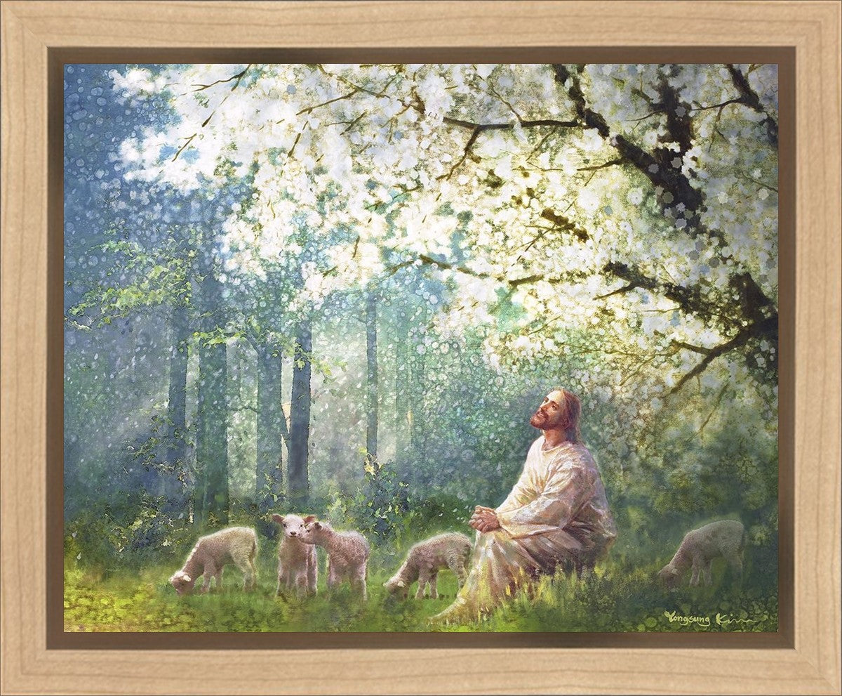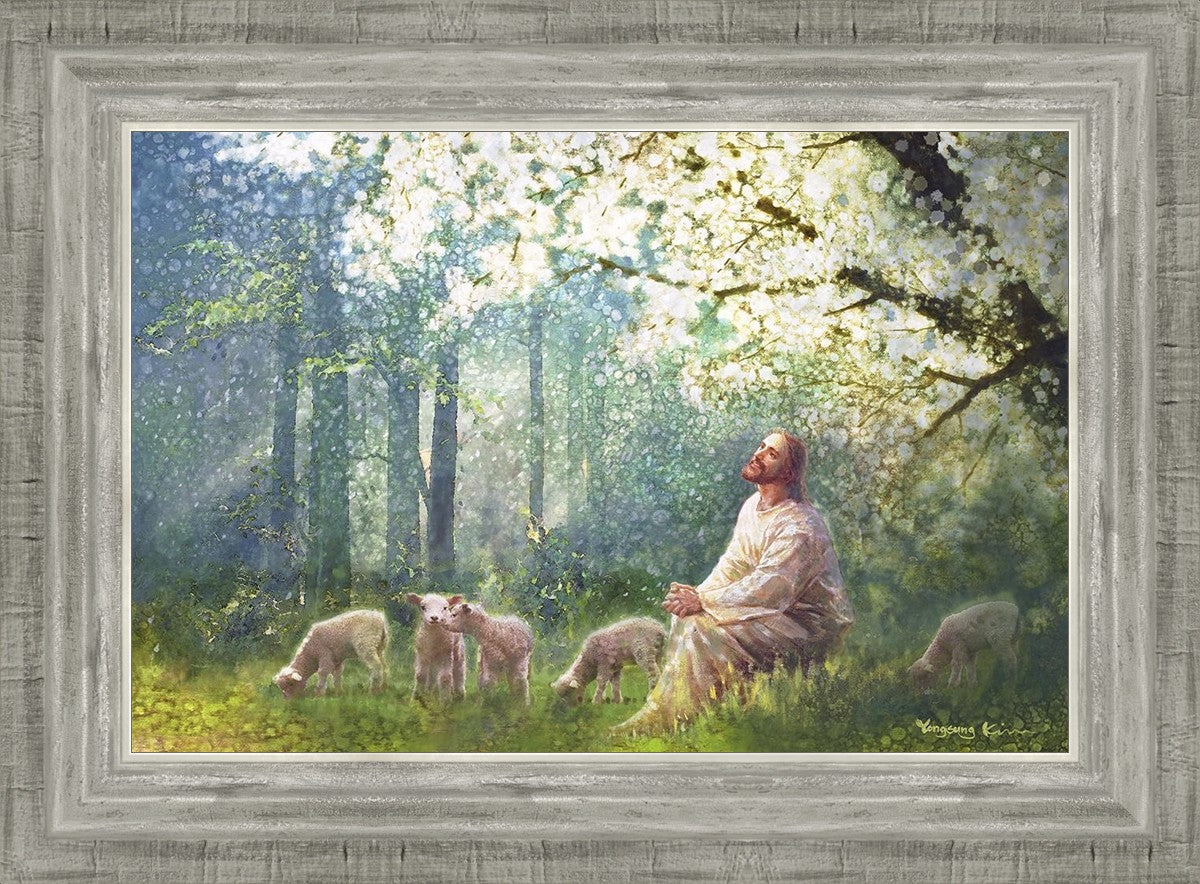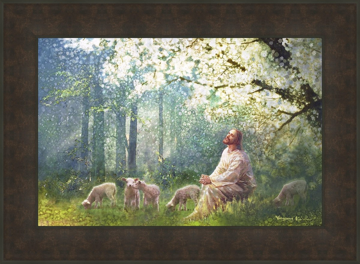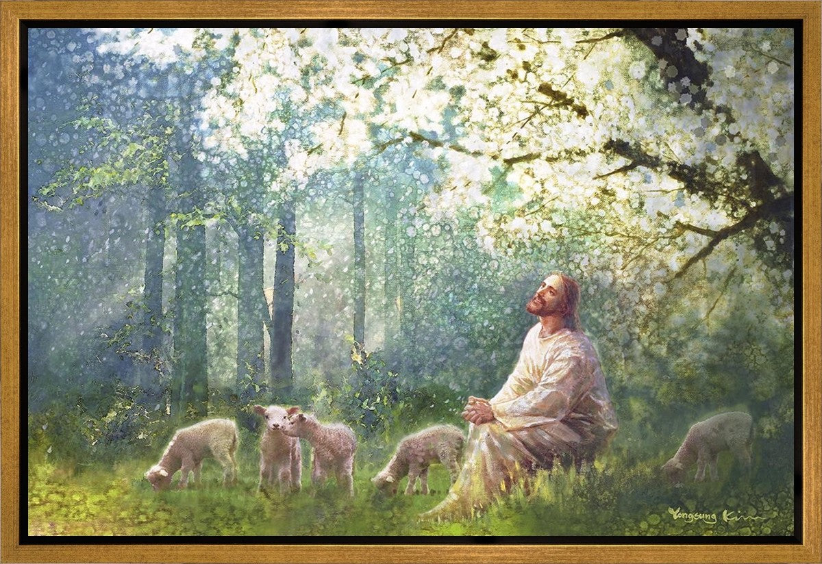 Yong Sung Kim's painting of Sweet is the Work presents Jesus Christ not only as a protector but a caretaker. Here He enjoys time playing beneath a tree nountiful tree with His flock at the edge of an abundant pasture