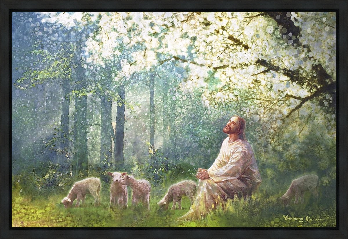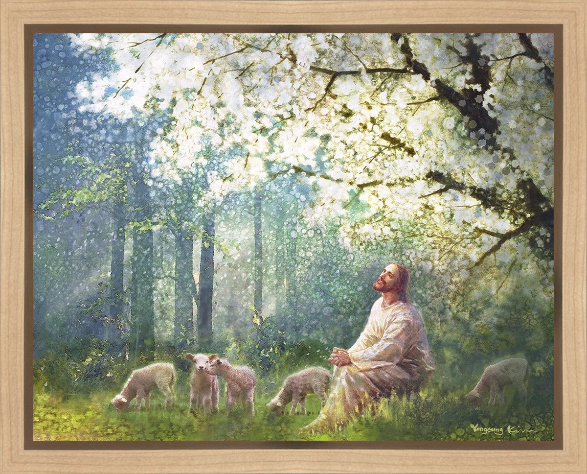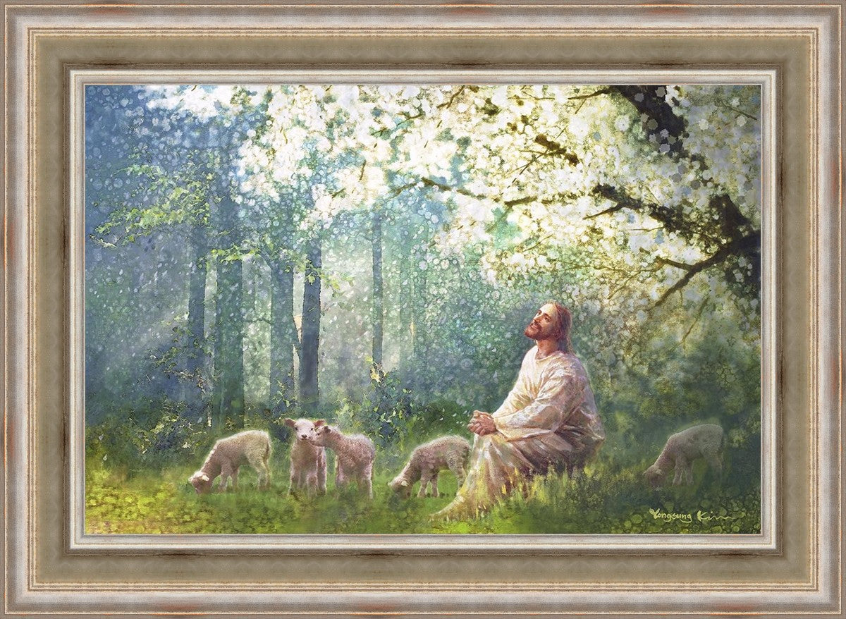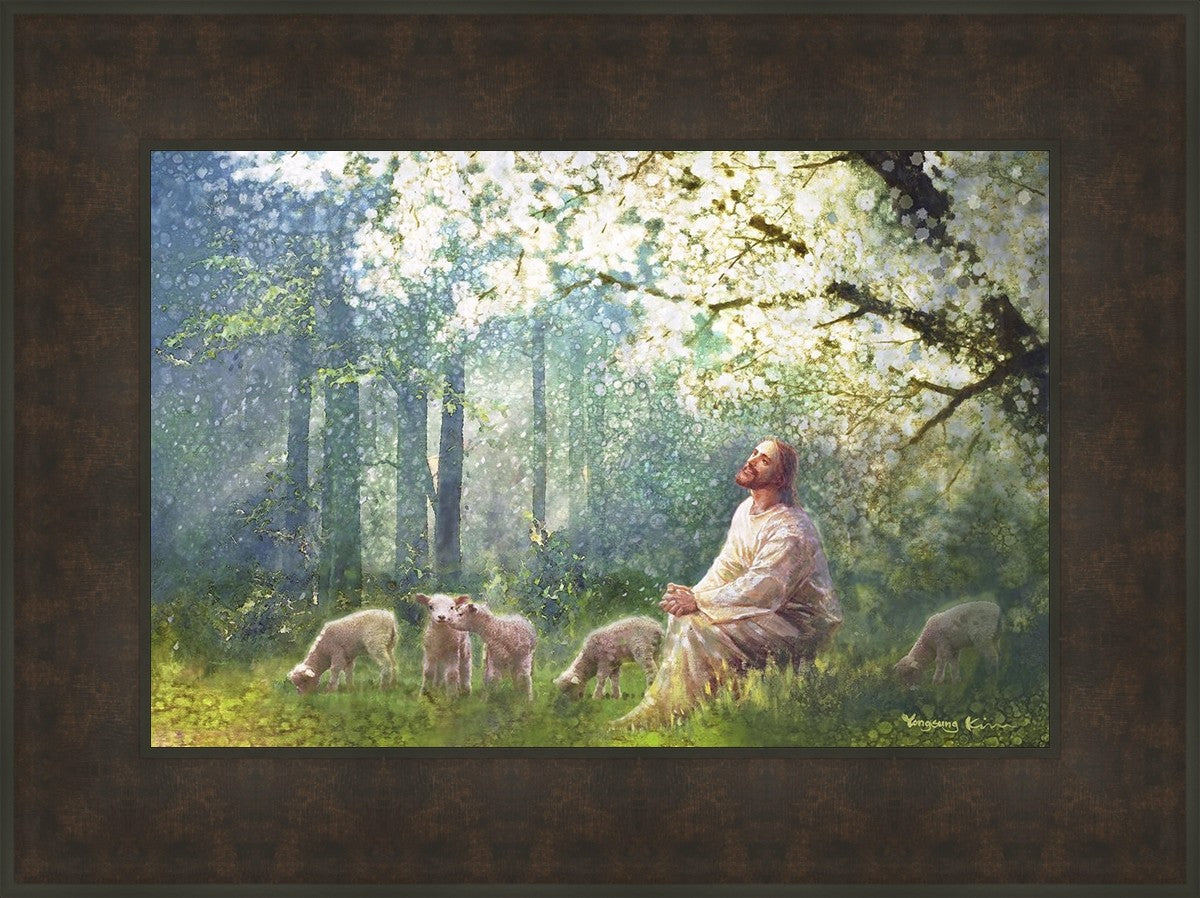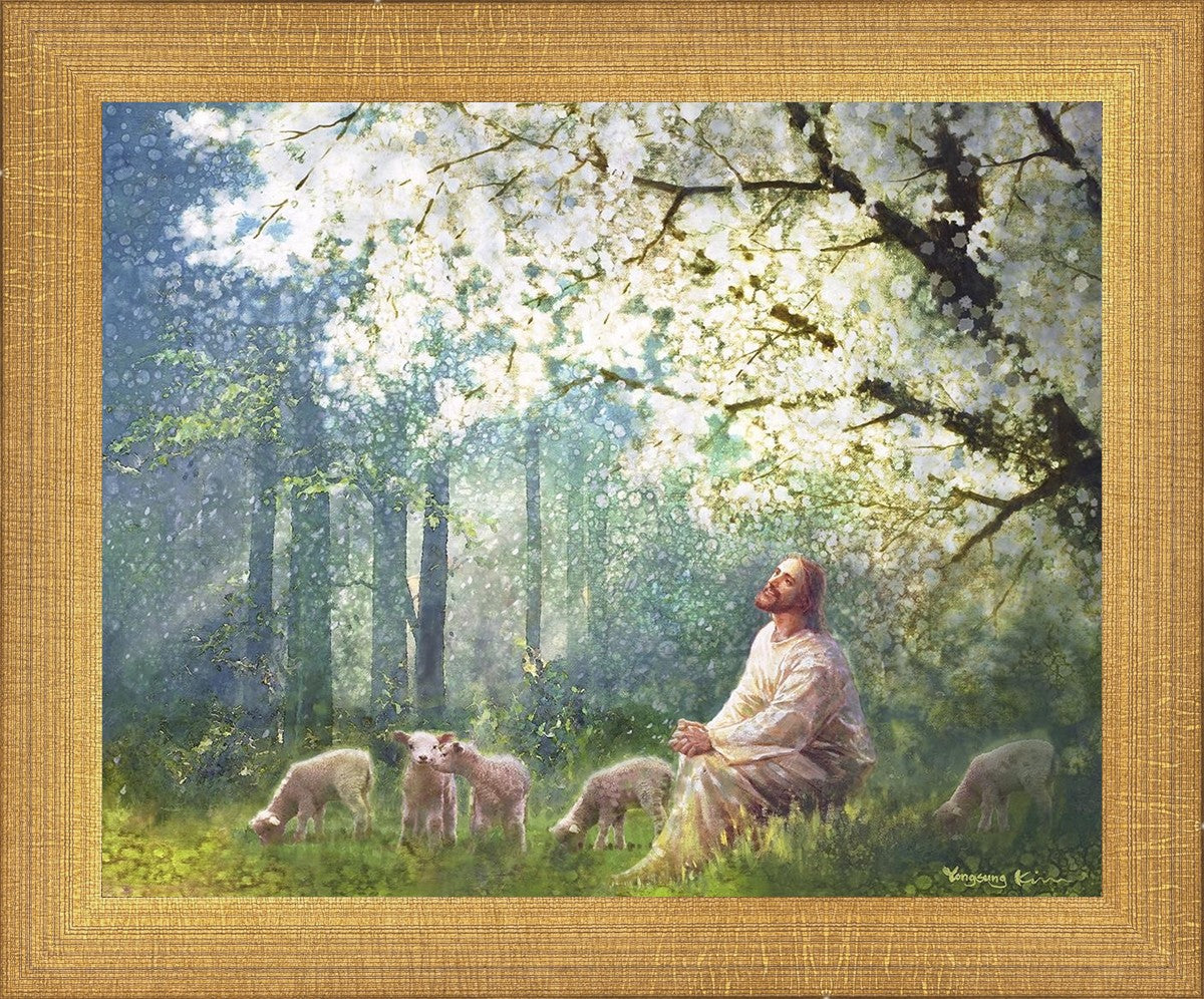 Yong Sung Kim's painting of Sweet is the Work presents Jesus Christ not only as a protector but a caretaker. Here He enjoys time playing beneath a tree nountiful tree with His flock at the edge of an abundant pasture