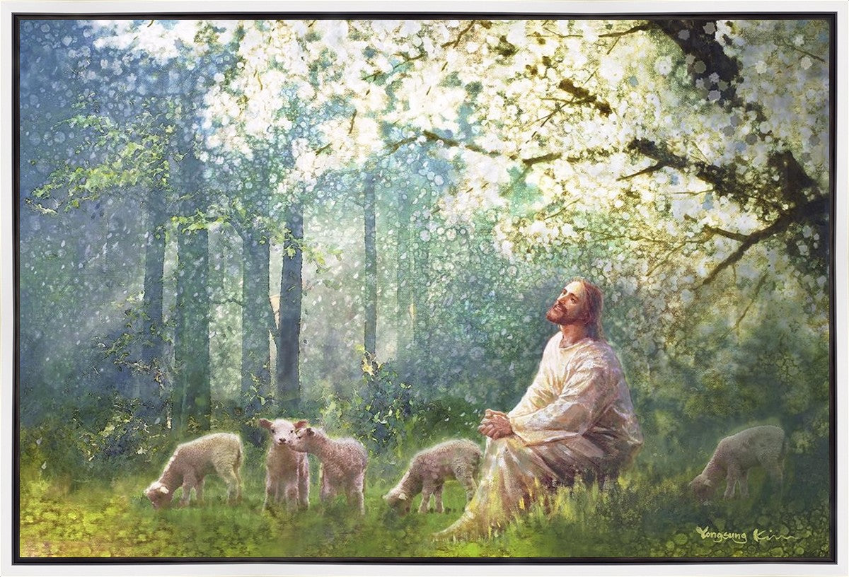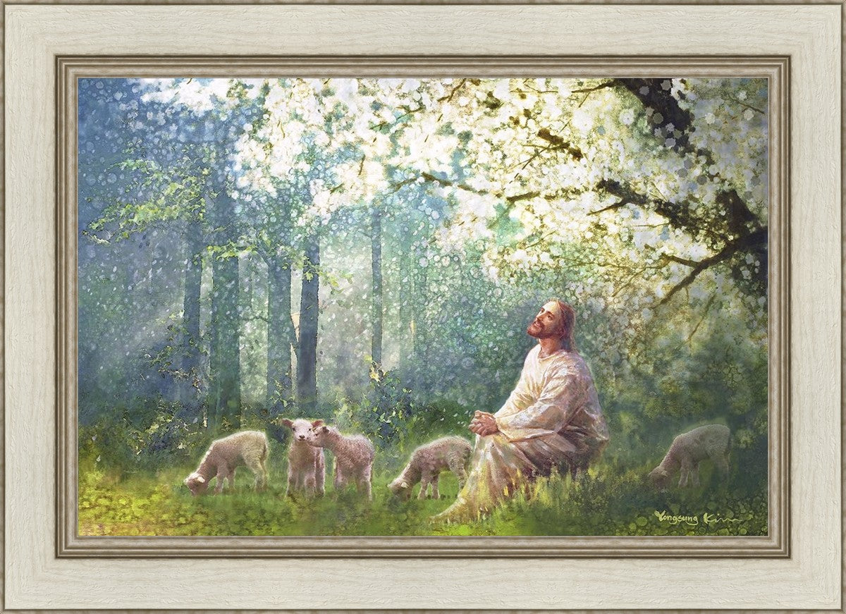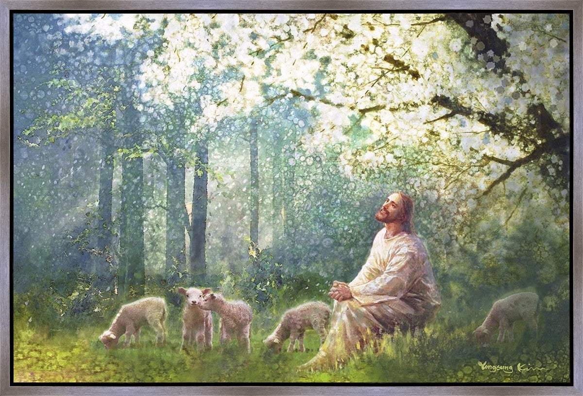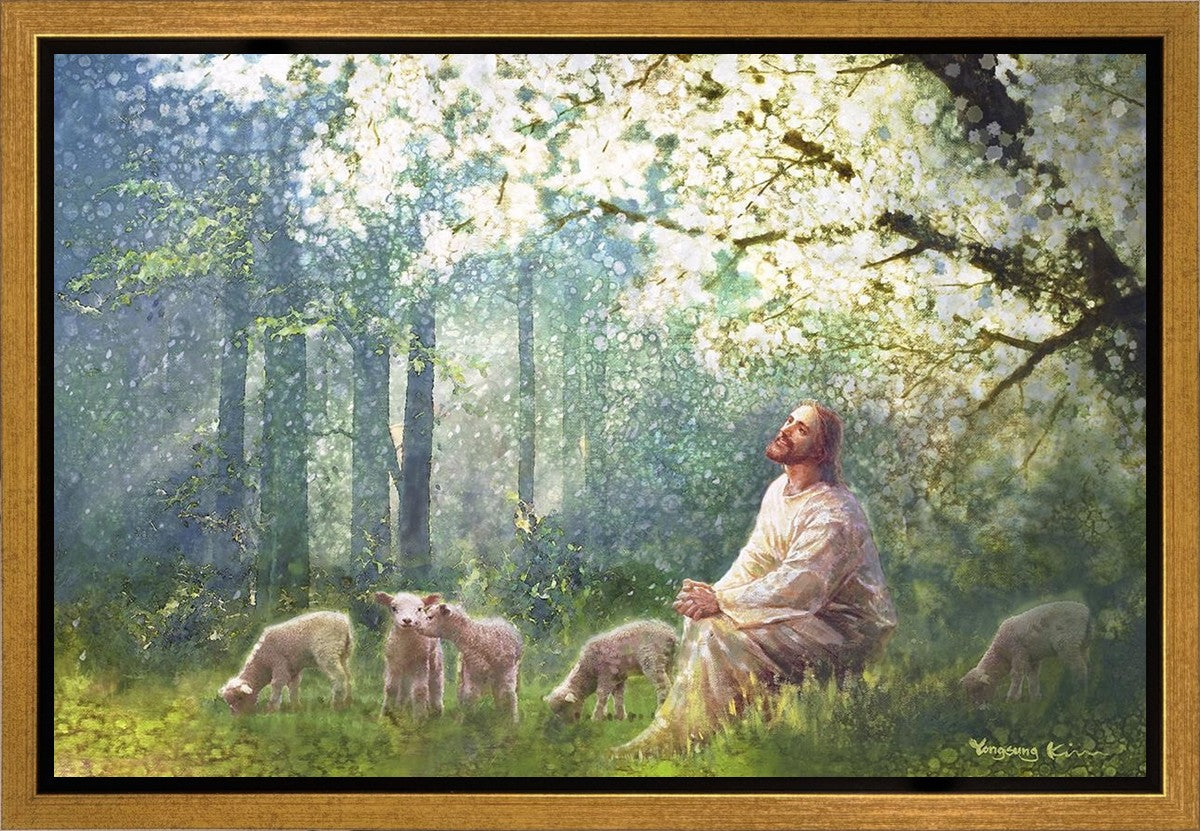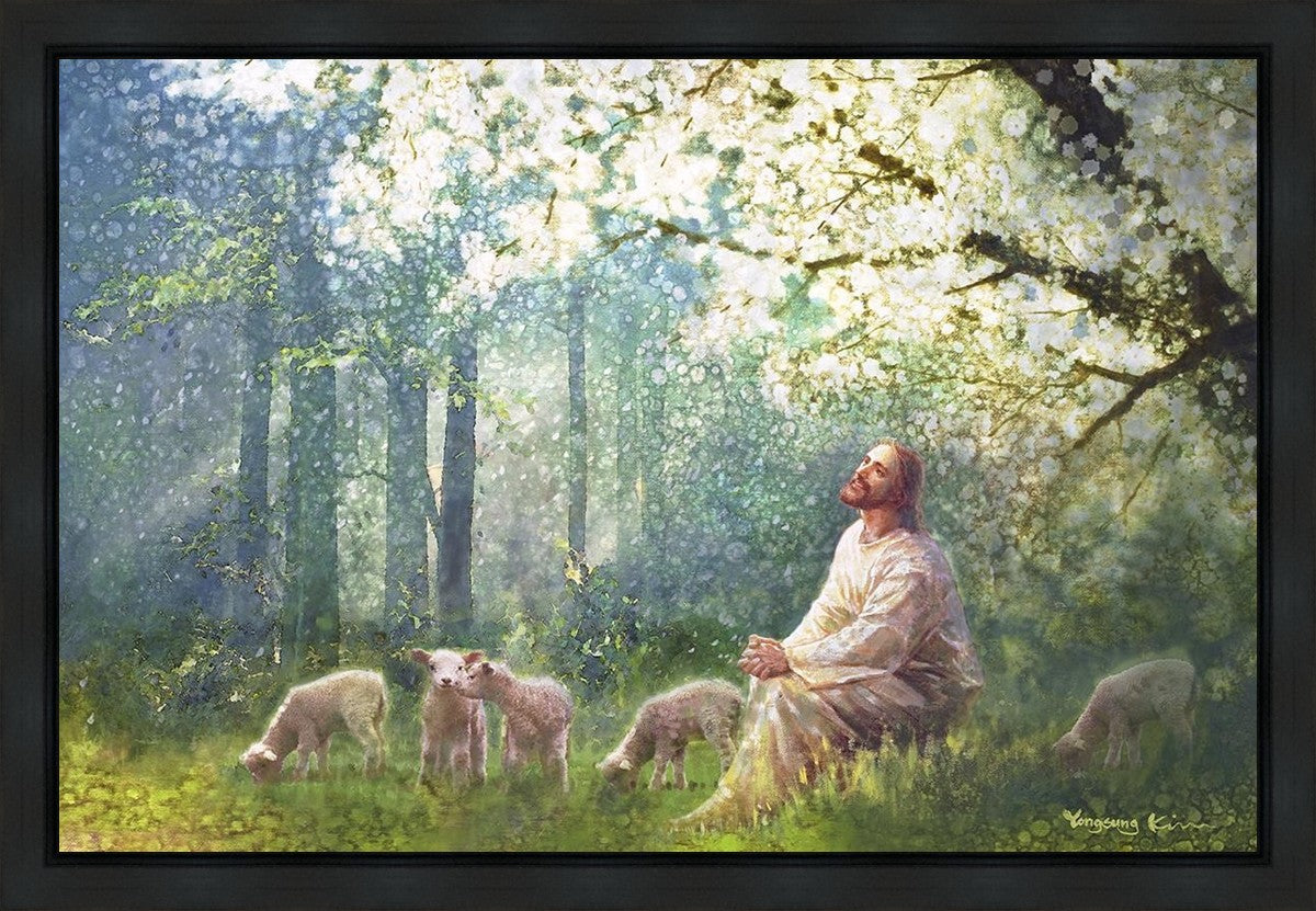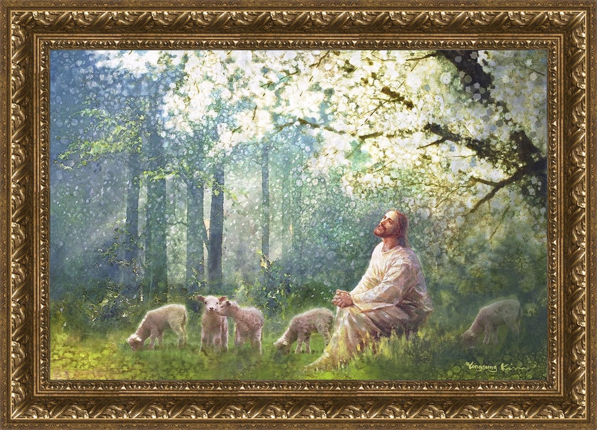 Yong Sung Kim's painting of Sweet is the Work presents Jesus Christ not only as a protector but a caretaker. Here He enjoys time playing beneath a tree nountiful tree with His flock at the edge of an abundant pasture