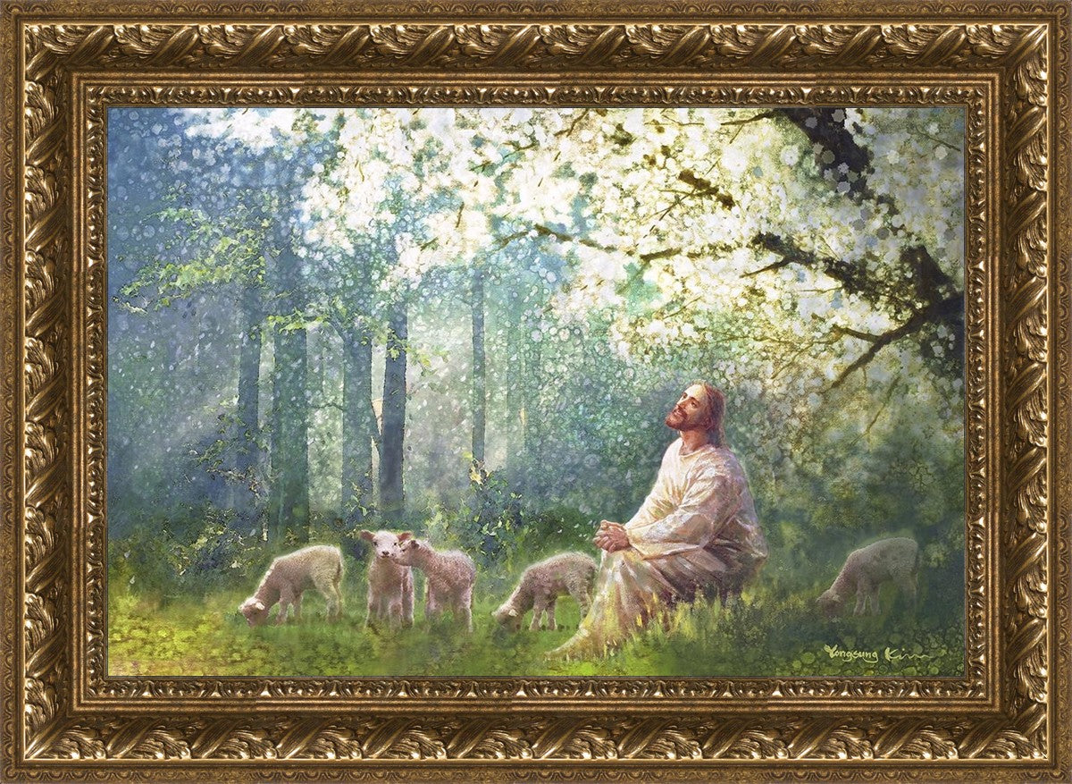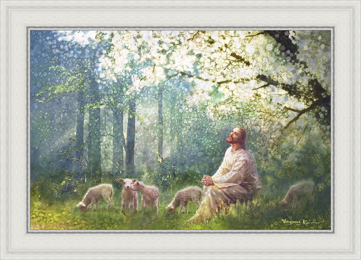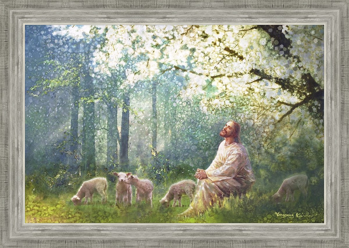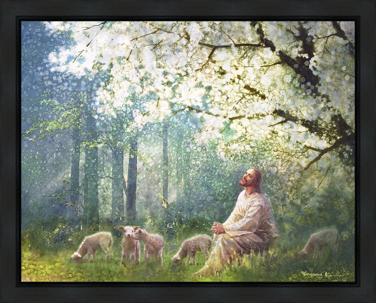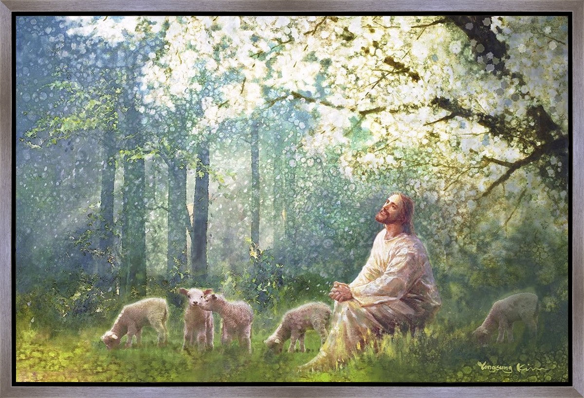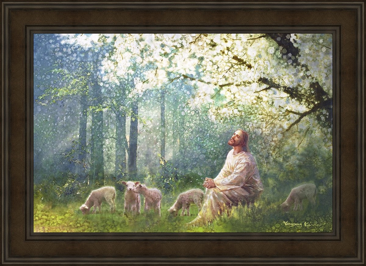 Yong Sung Kim's painting of Sweet is the Work presents Jesus Christ not only as a protector but a caretaker. Here He enjoys time playing beneath a tree nountiful tree with His flock at the edge of an abundant pasture
