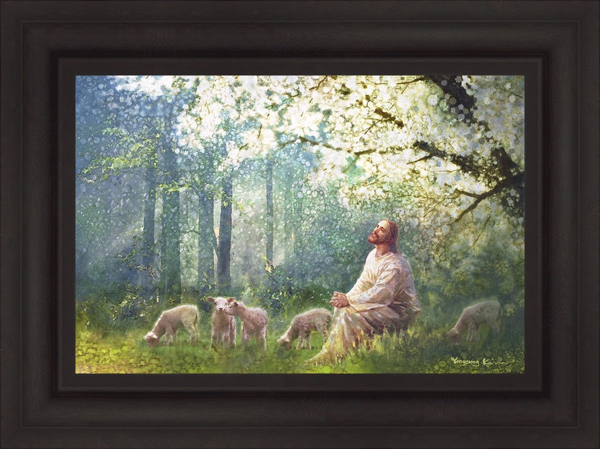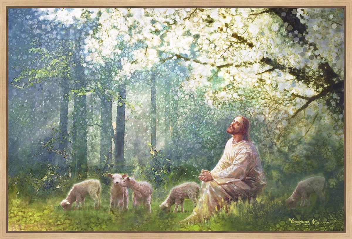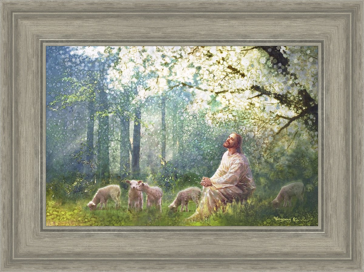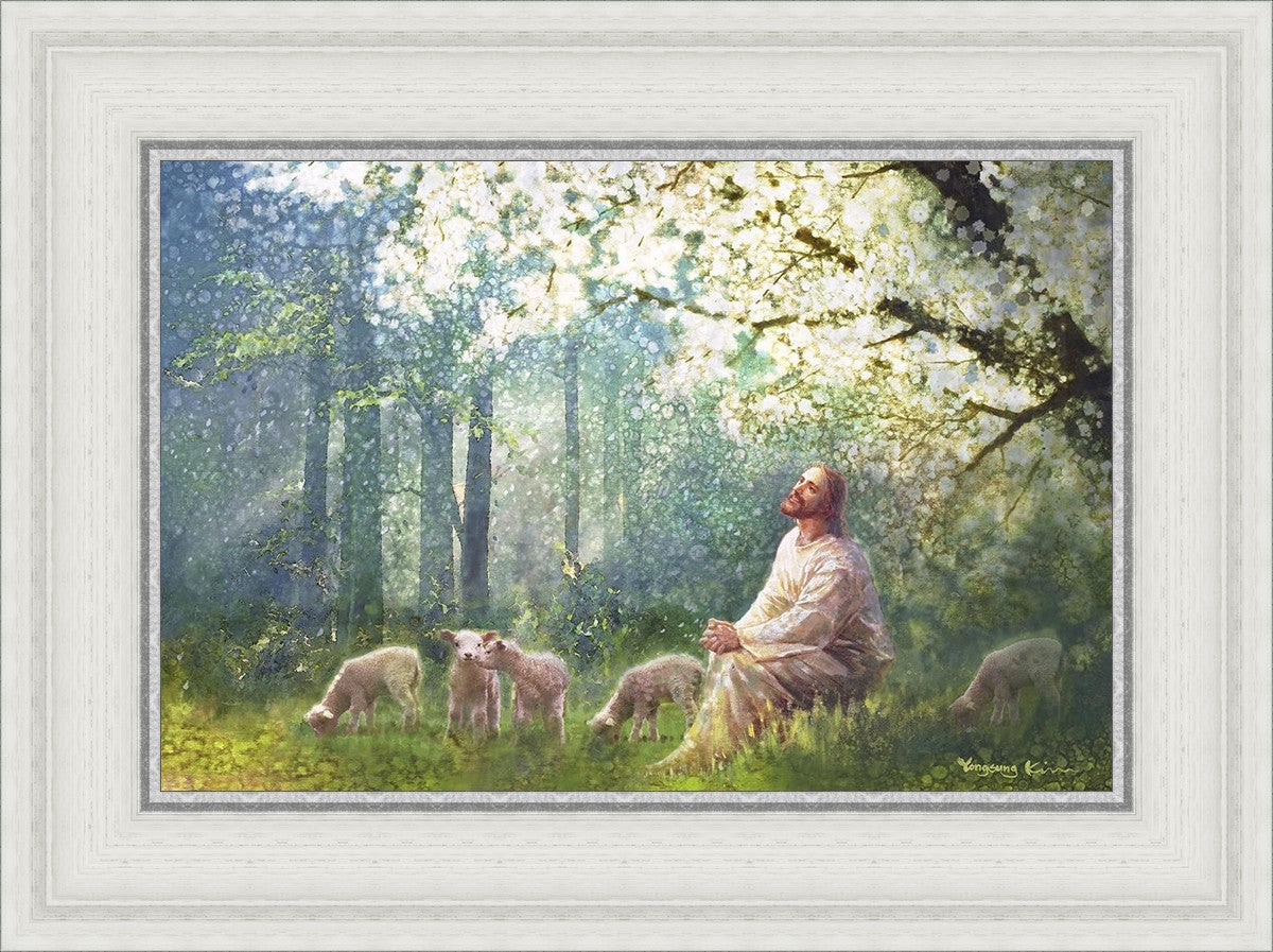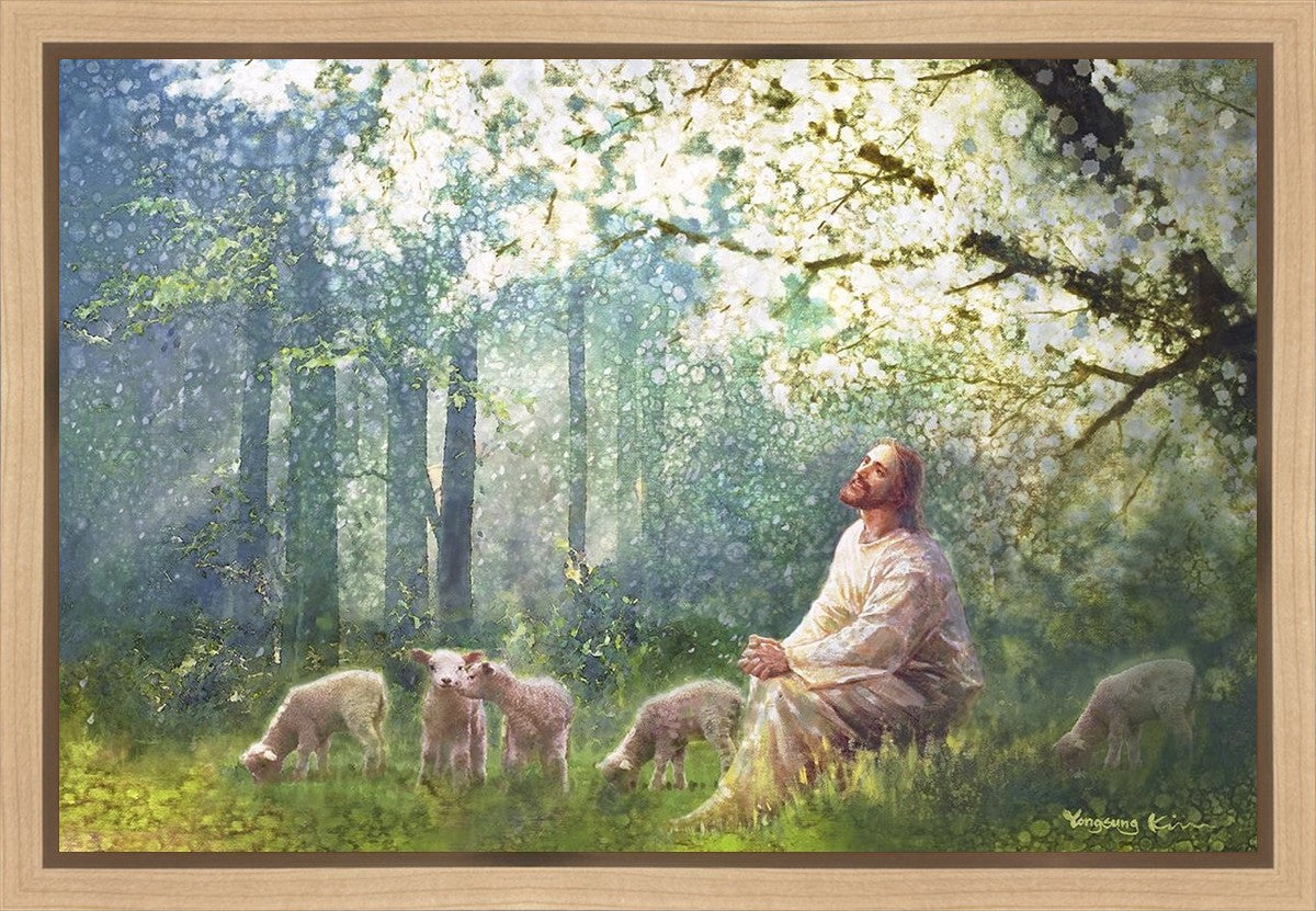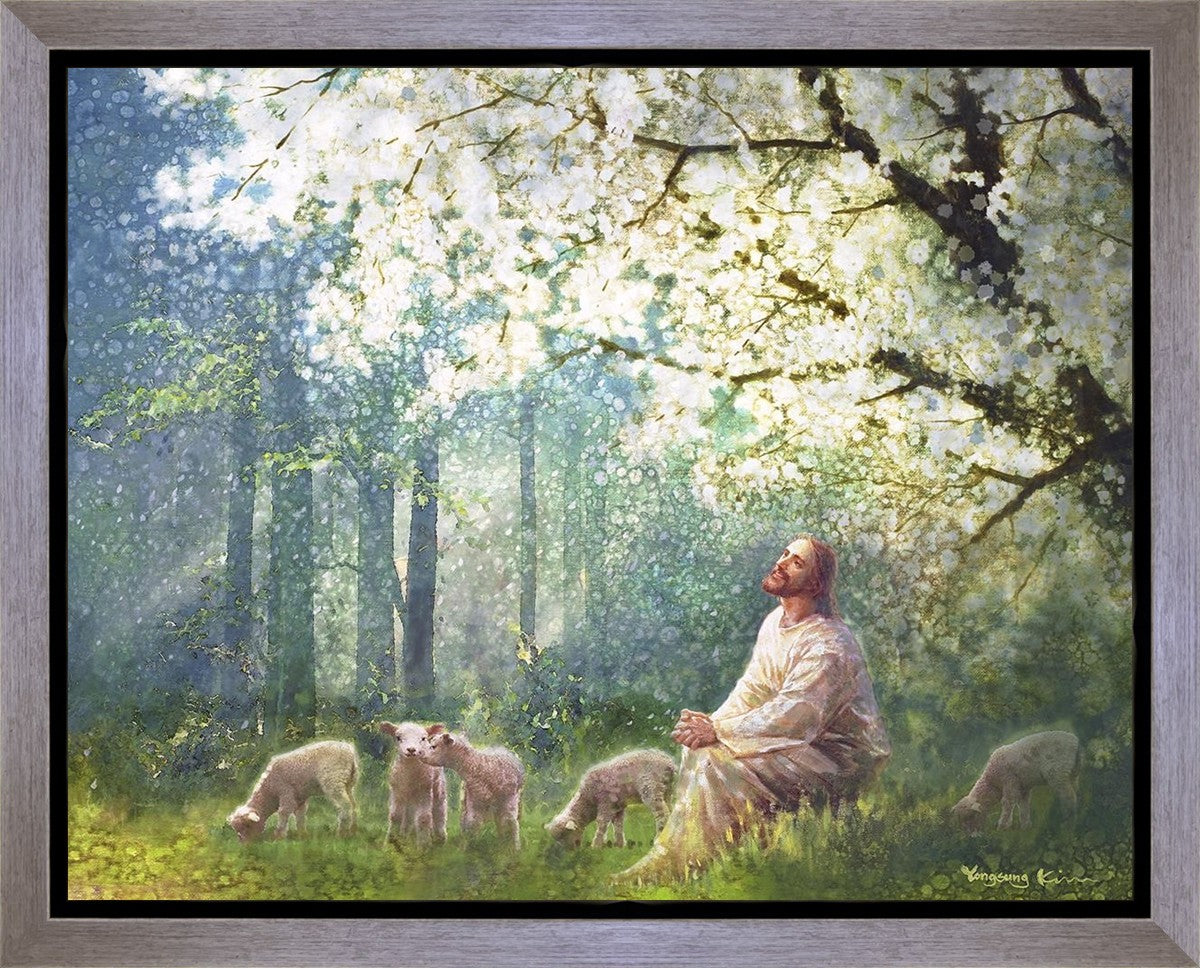 Yong Sung Kim's painting of Sweet is the Work presents Jesus Christ not only as a protector but a caretaker. Here He enjoys time playing beneath a tree nountiful tree with His flock at the edge of an abundant pasture