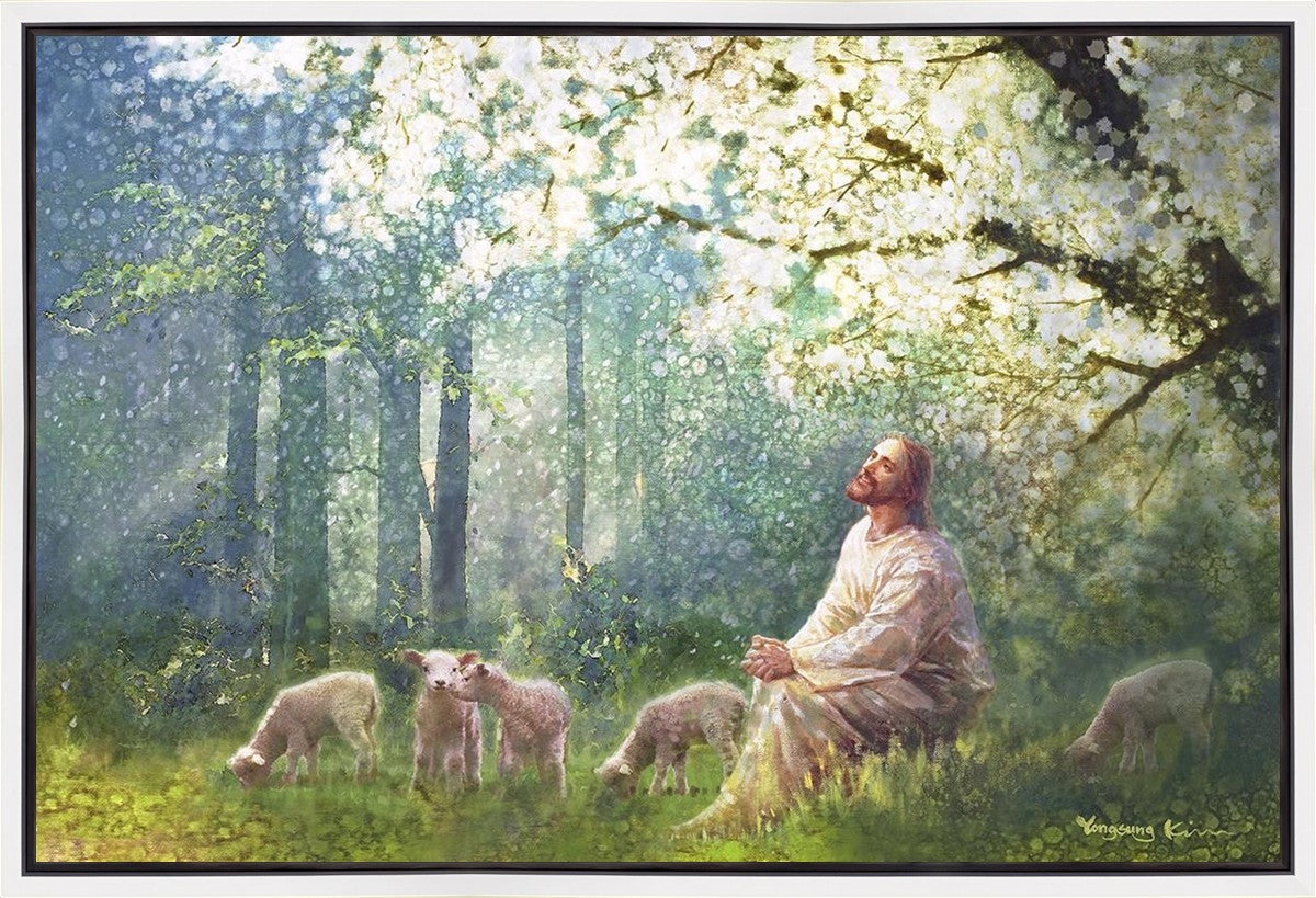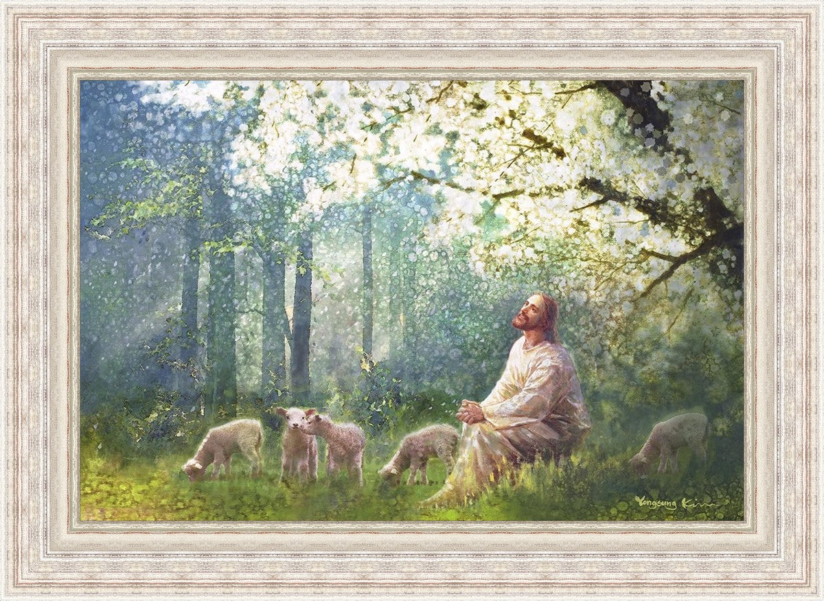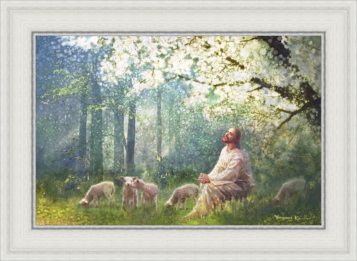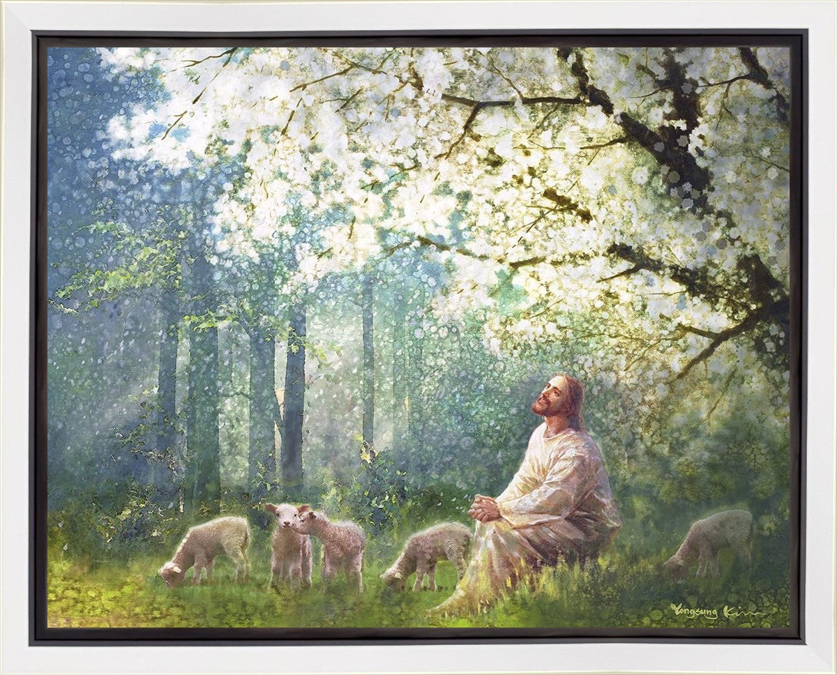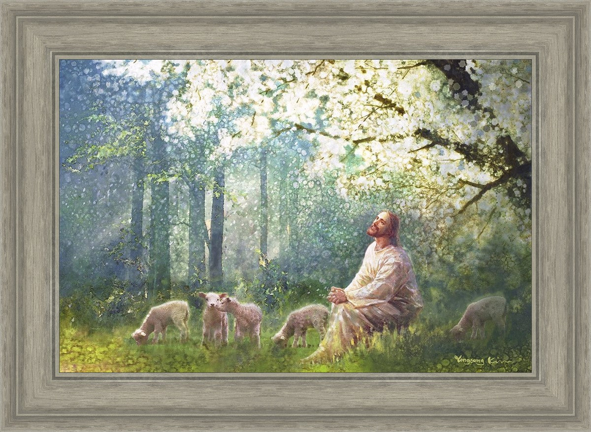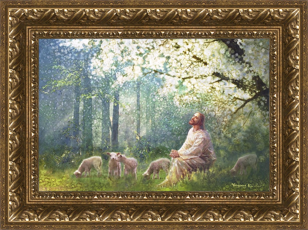 Yong Sung Kim's painting of Sweet is the Work presents Jesus Christ not only as a protector but a caretaker. Here He enjoys time playing beneath a tree nountiful tree with His flock at the edge of an abundant pasture