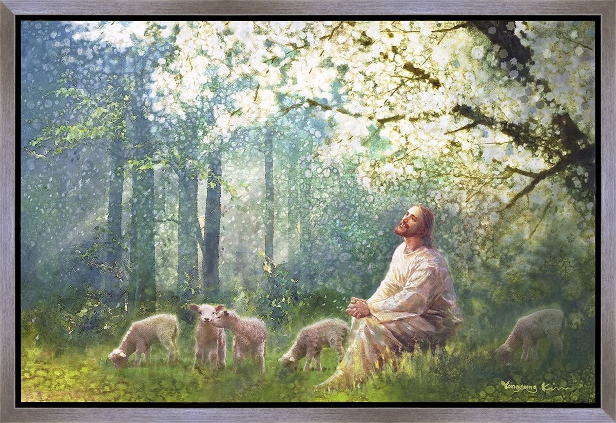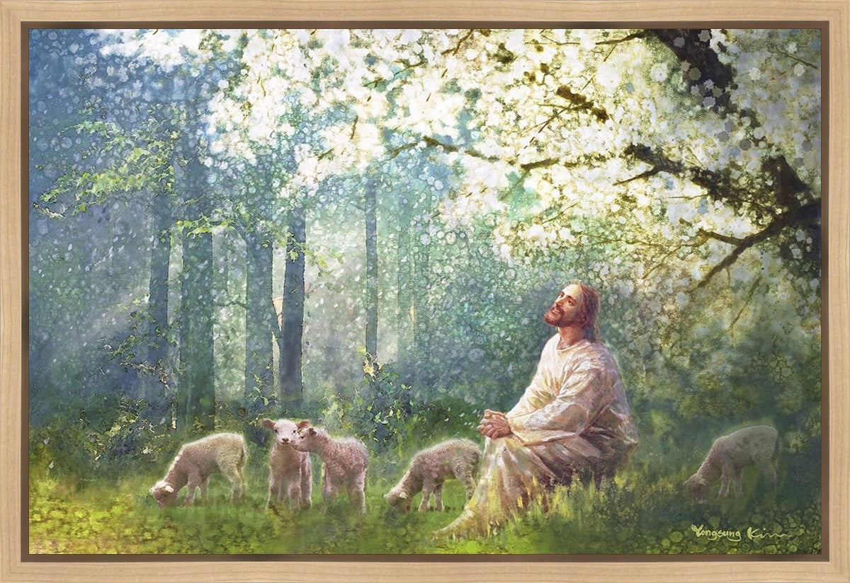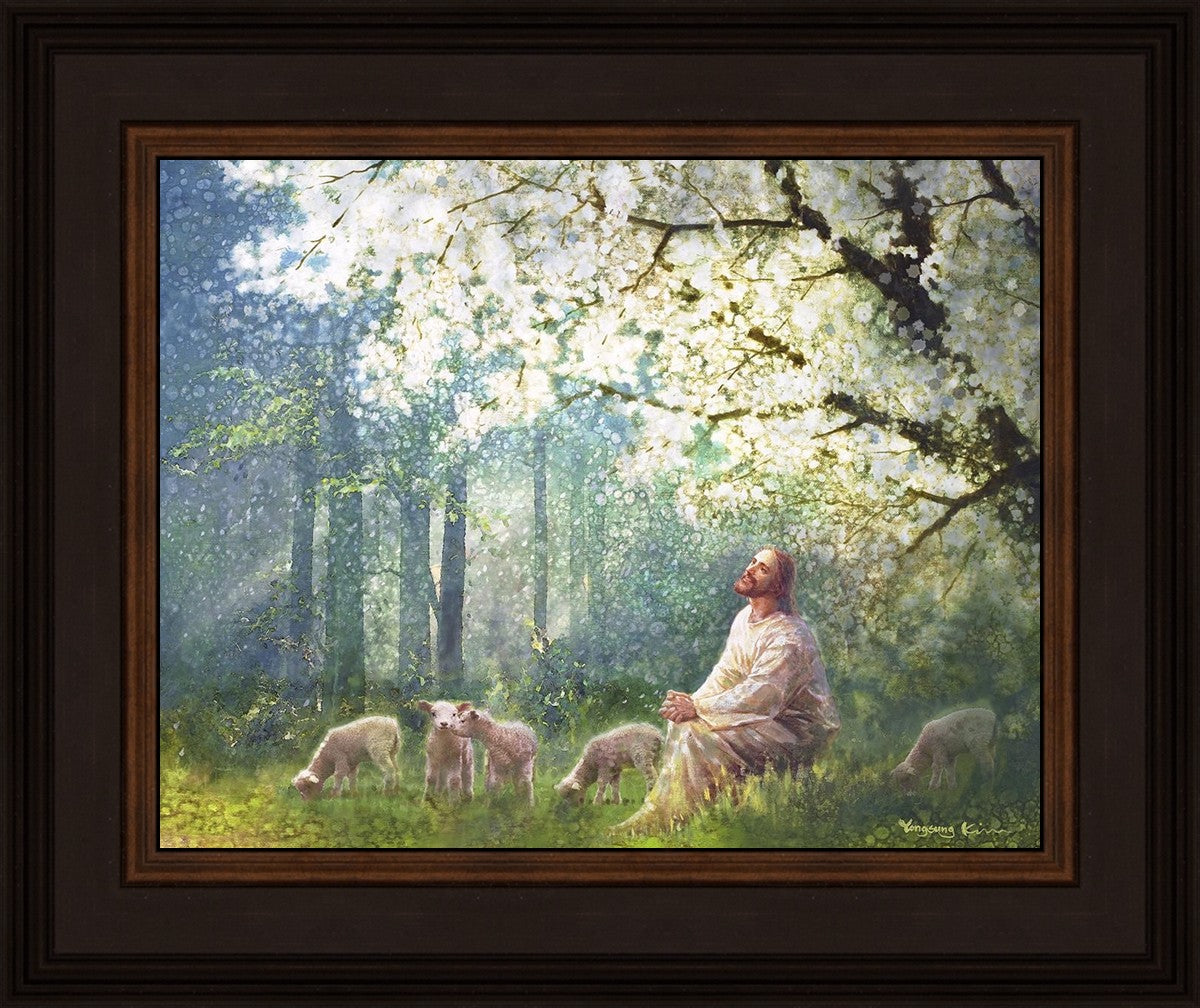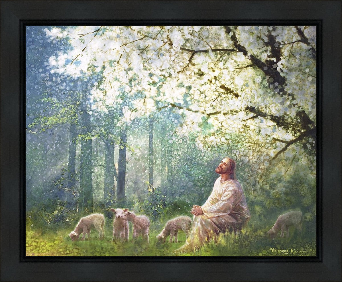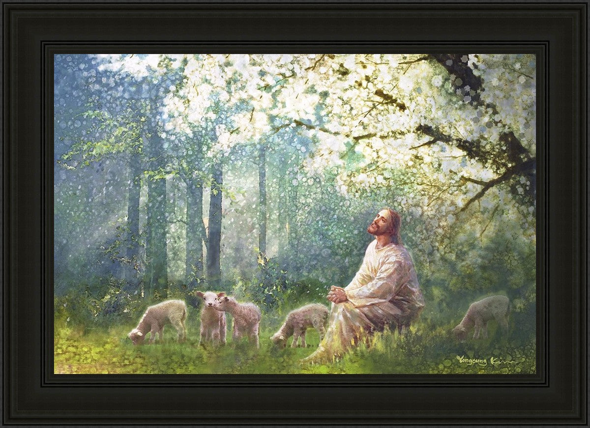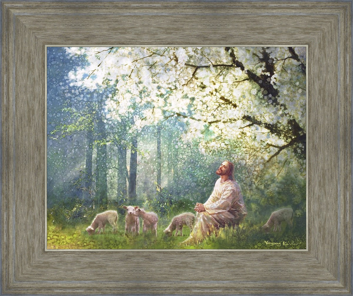 Yong Sung Kim's painting of Sweet is the Work presents Jesus Christ not only as a protector but a caretaker. Here He enjoys time playing beneath a tree nountiful tree with His flock at the edge of an abundant pasture