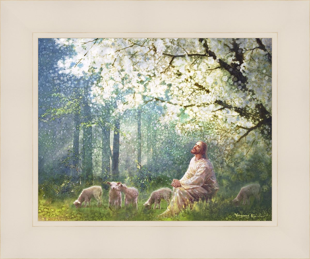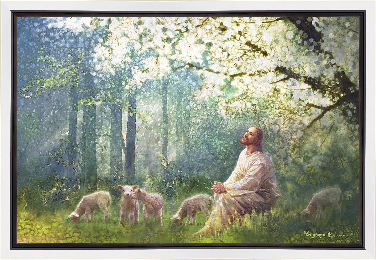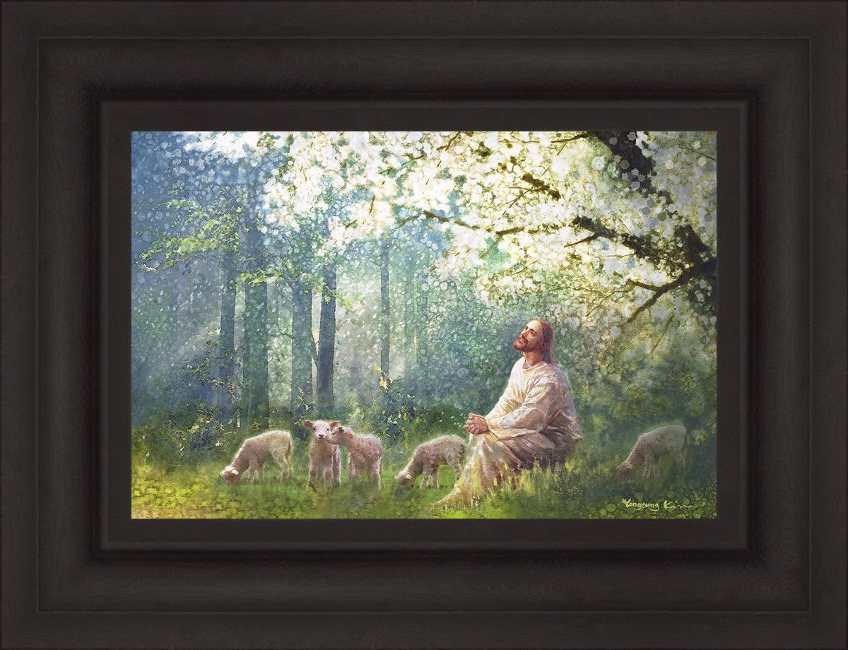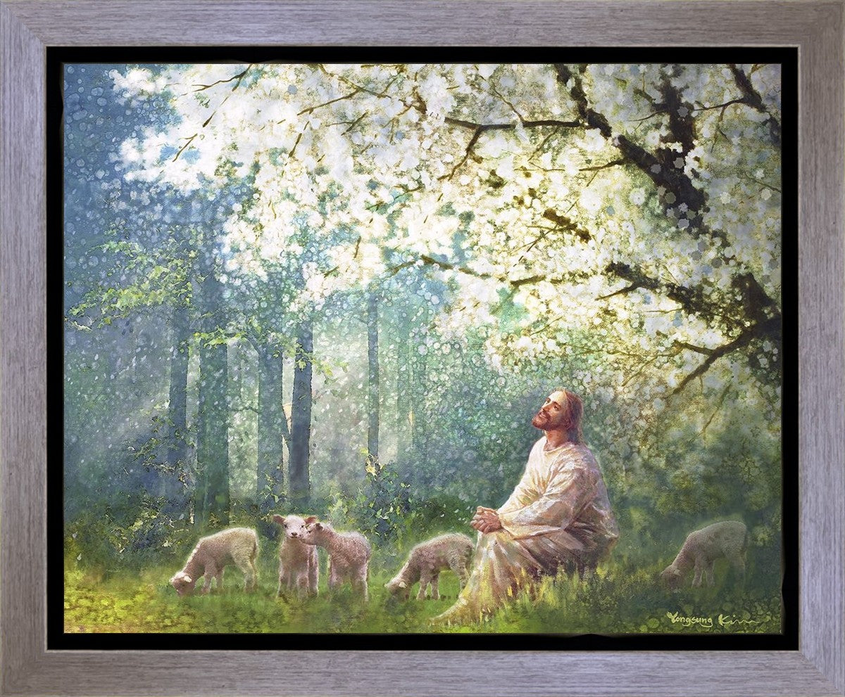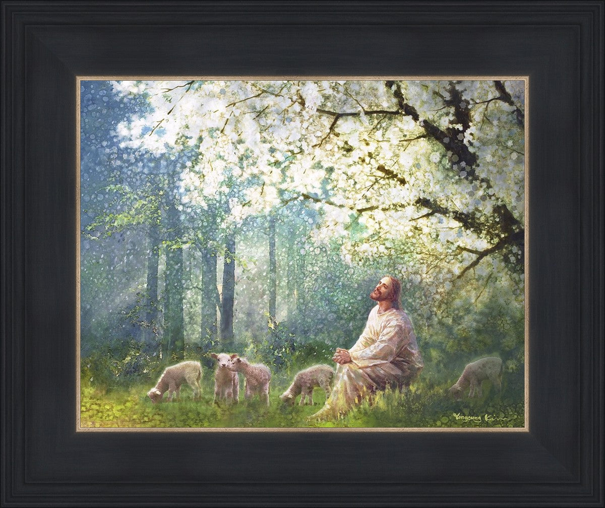Yong Sung Kim's painting of Sweet is the Work presents Jesus Christ not only as a protector but a caretaker. Here He enjoys time playing beneath a tree nountiful tree with His flock at the edge of an abundant pasture