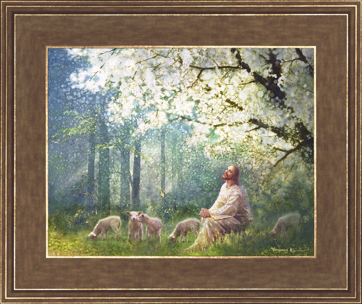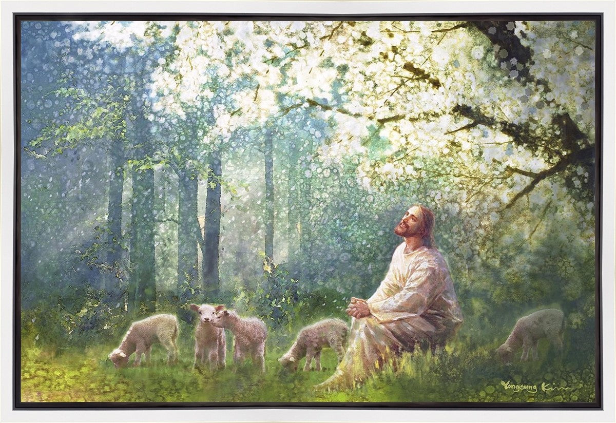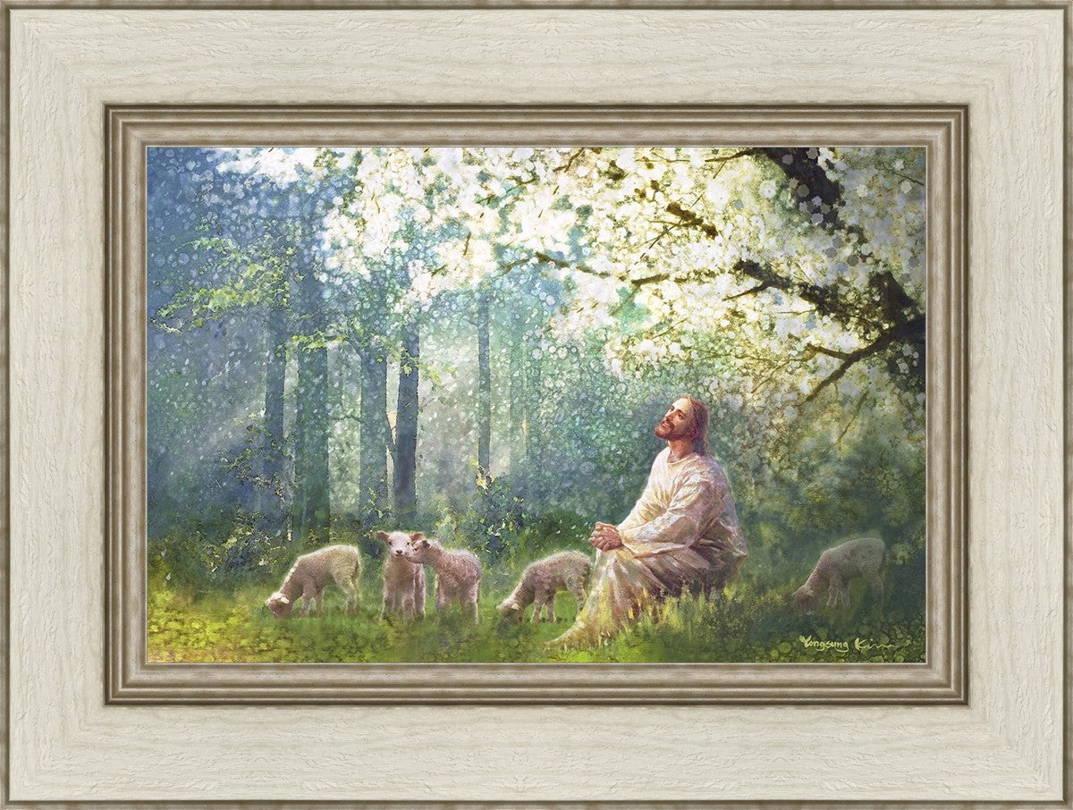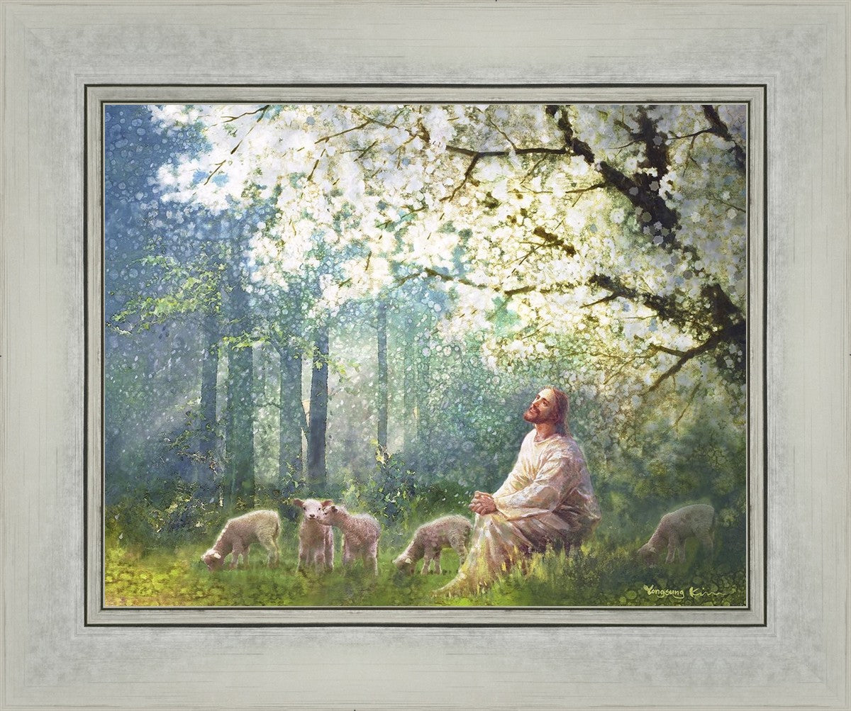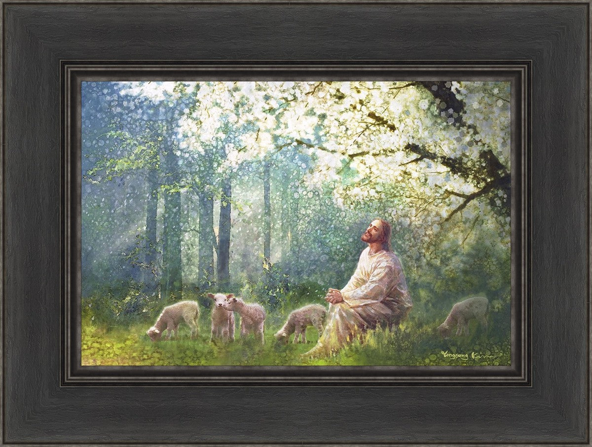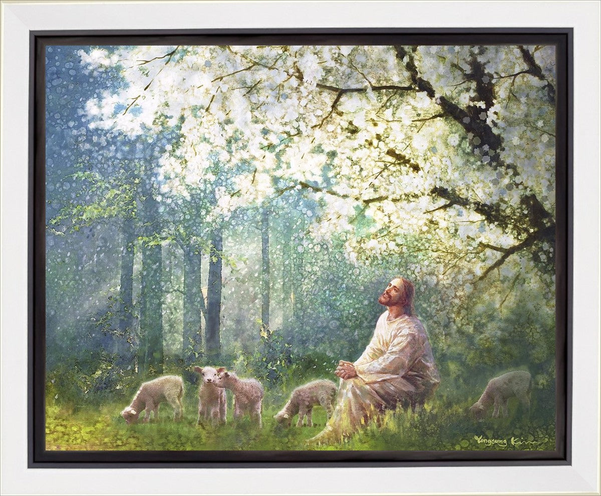 Yong Sung Kim's painting of Sweet is the Work presents Jesus Christ not only as a protector but a caretaker. Here He enjoys time playing beneath a tree nountiful tree with His flock at the edge of an abundant pasture