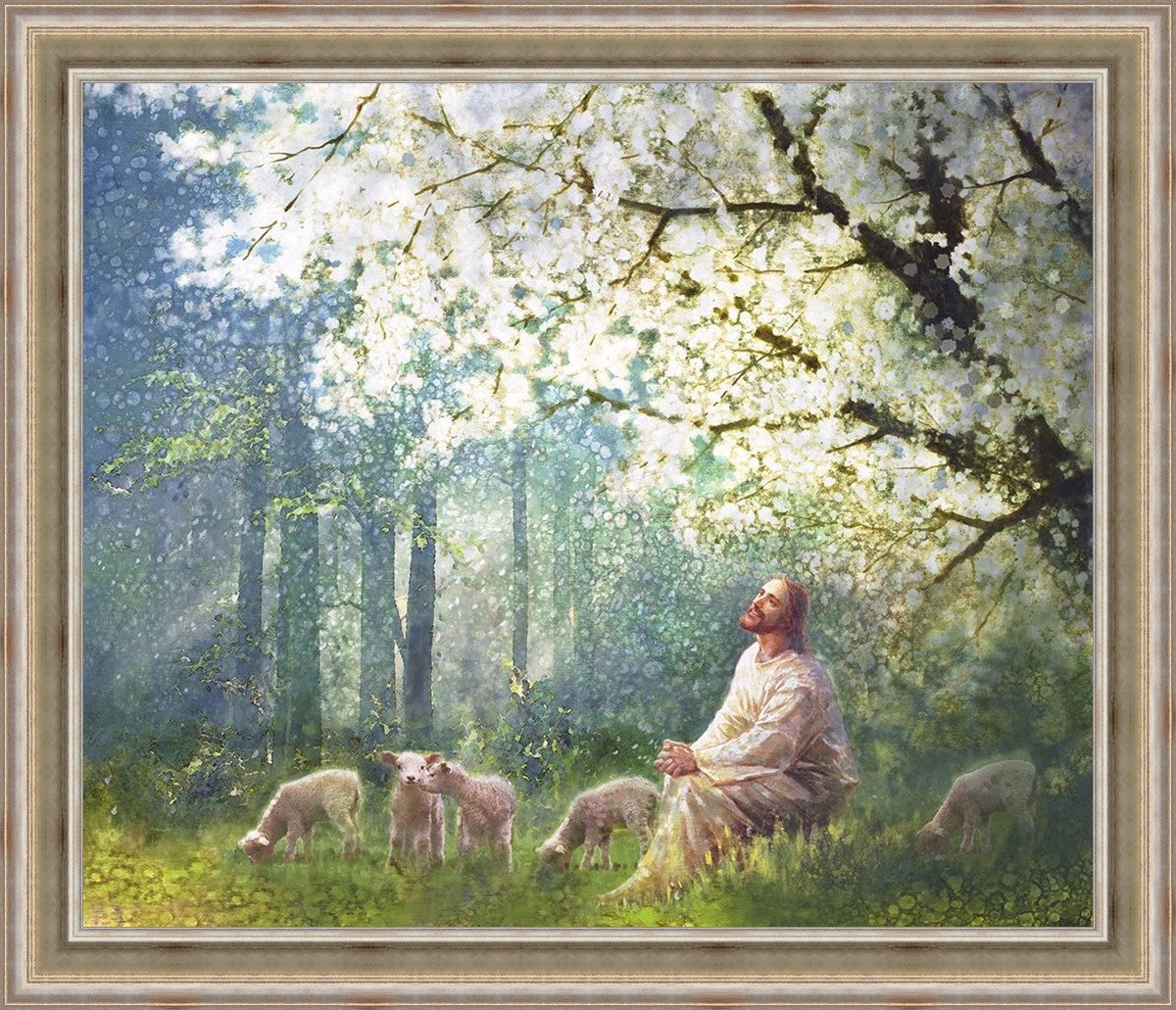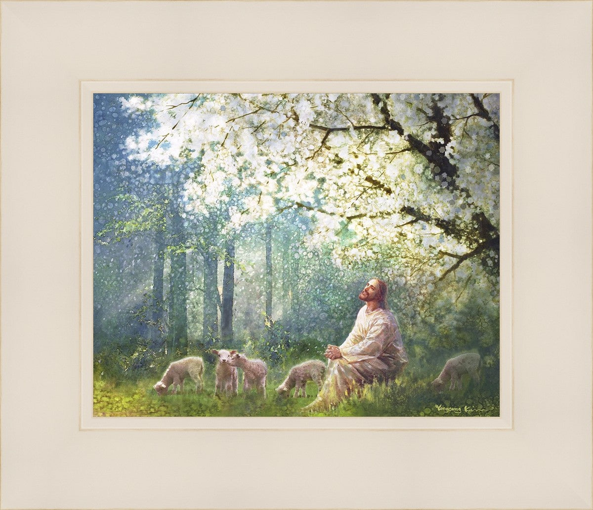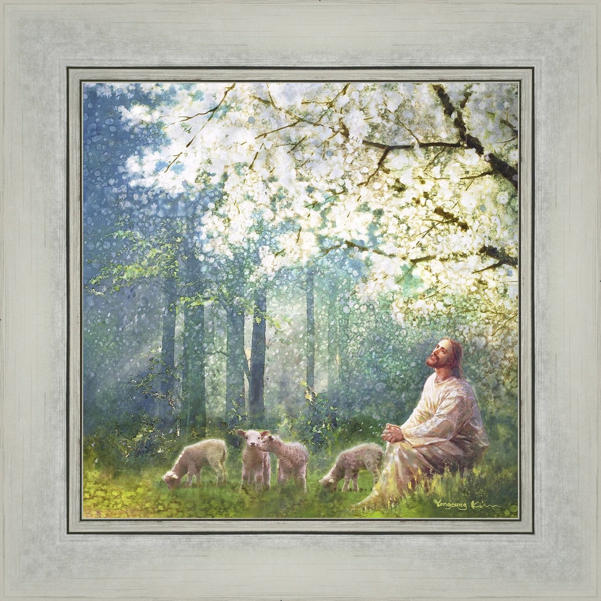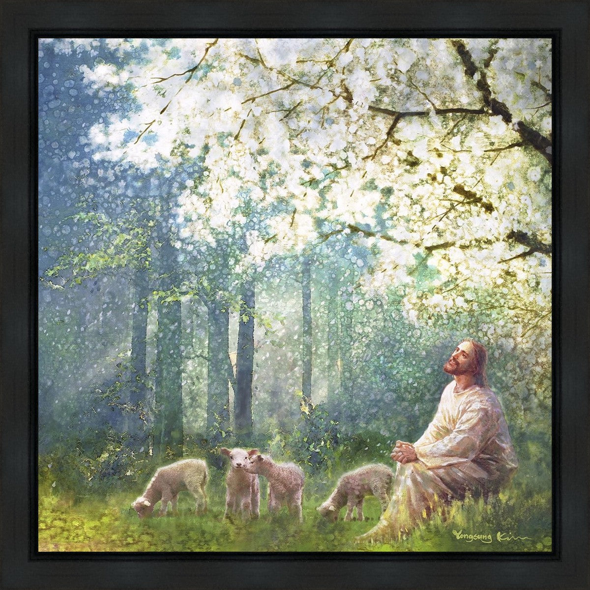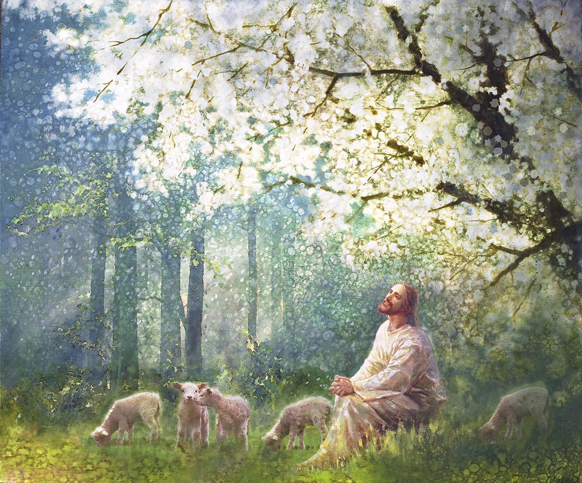 Yong Sung Kim's painting of Sweet is the Work presents Jesus Christ not only as a protector but a caretaker. Here He enjoys time playing beneath a tree nountiful tree with His flock at the edge of an abundant pasture