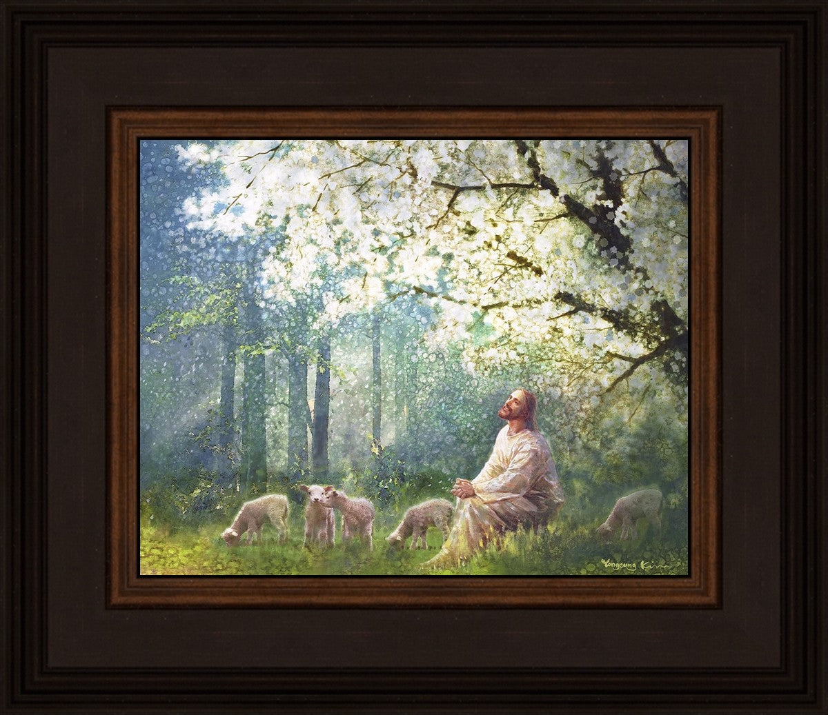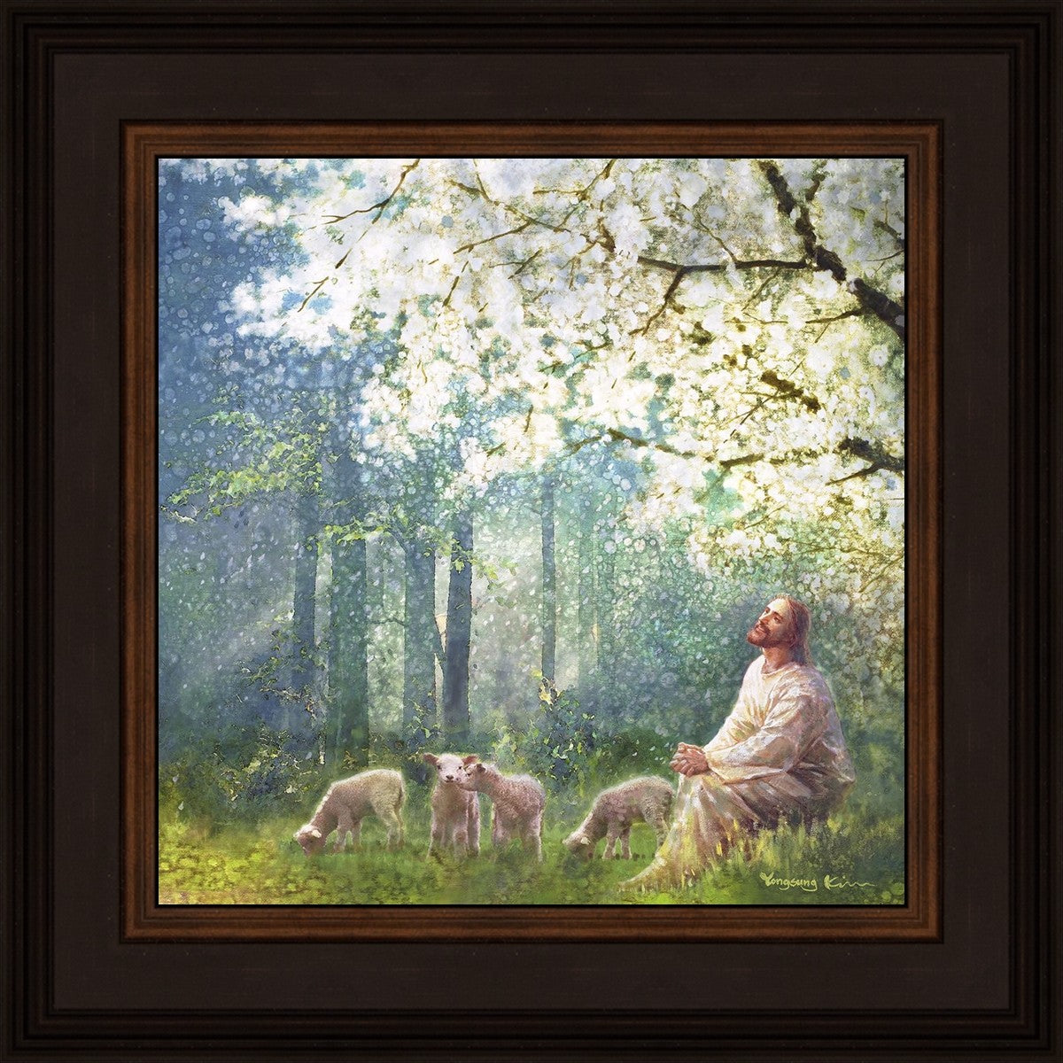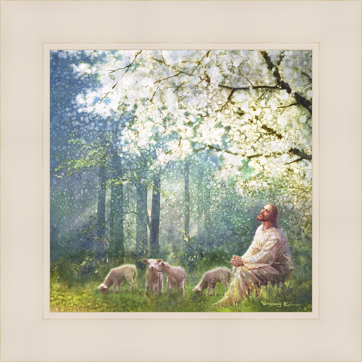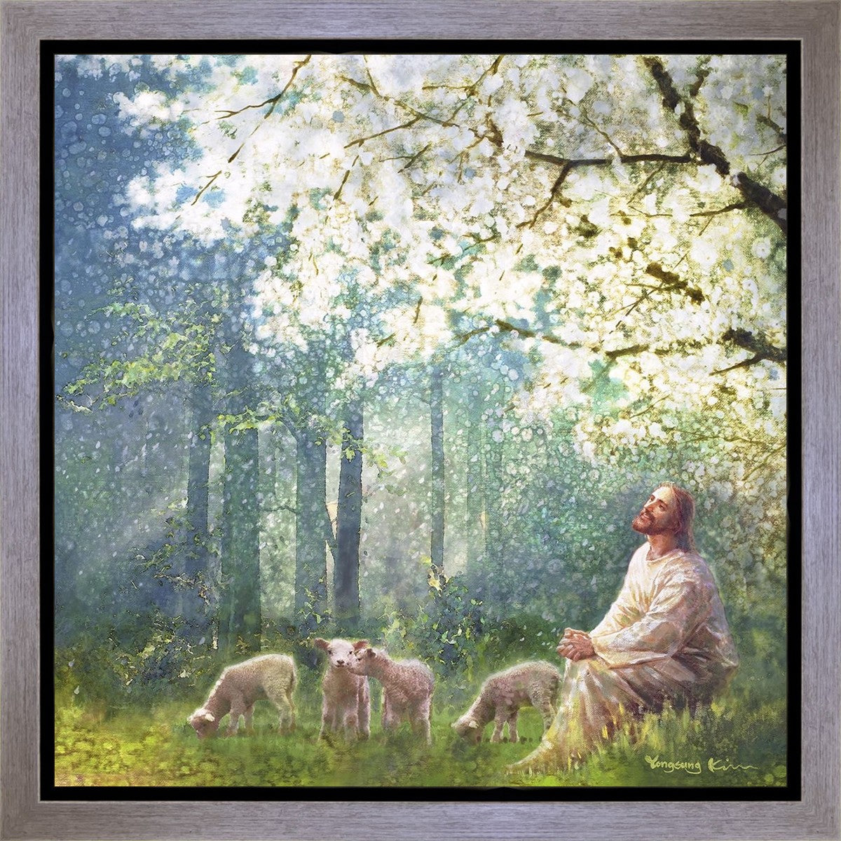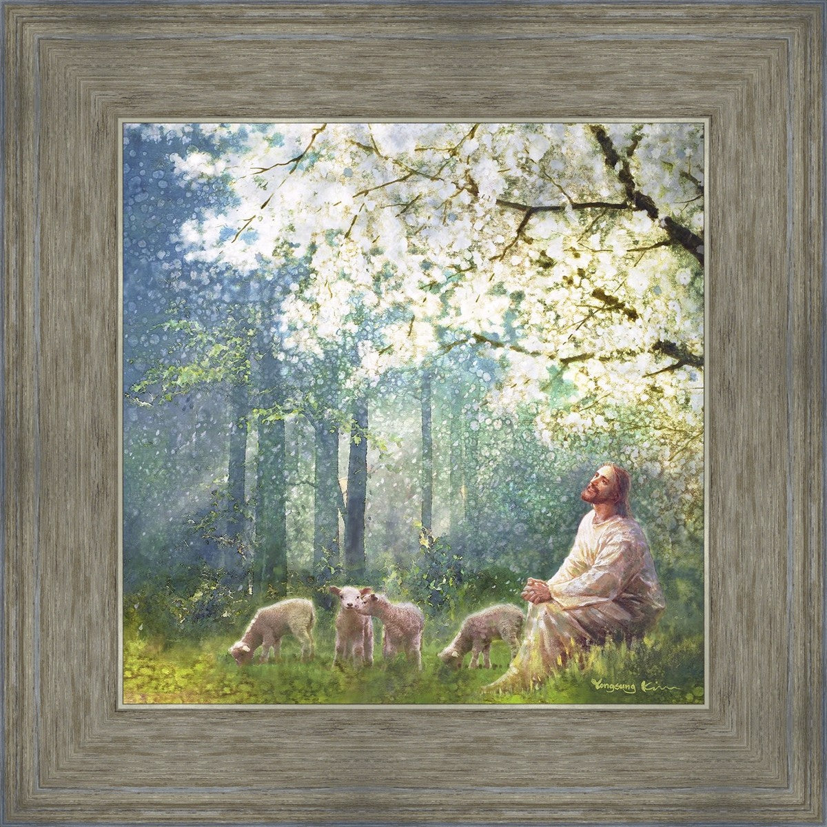 Yong Sung Kim's painting of Sweet is the Work presents Jesus Christ not only as a protector but a caretaker. Here He enjoys time playing beneath a tree nountiful tree with His flock at the edge of an abundant pasture