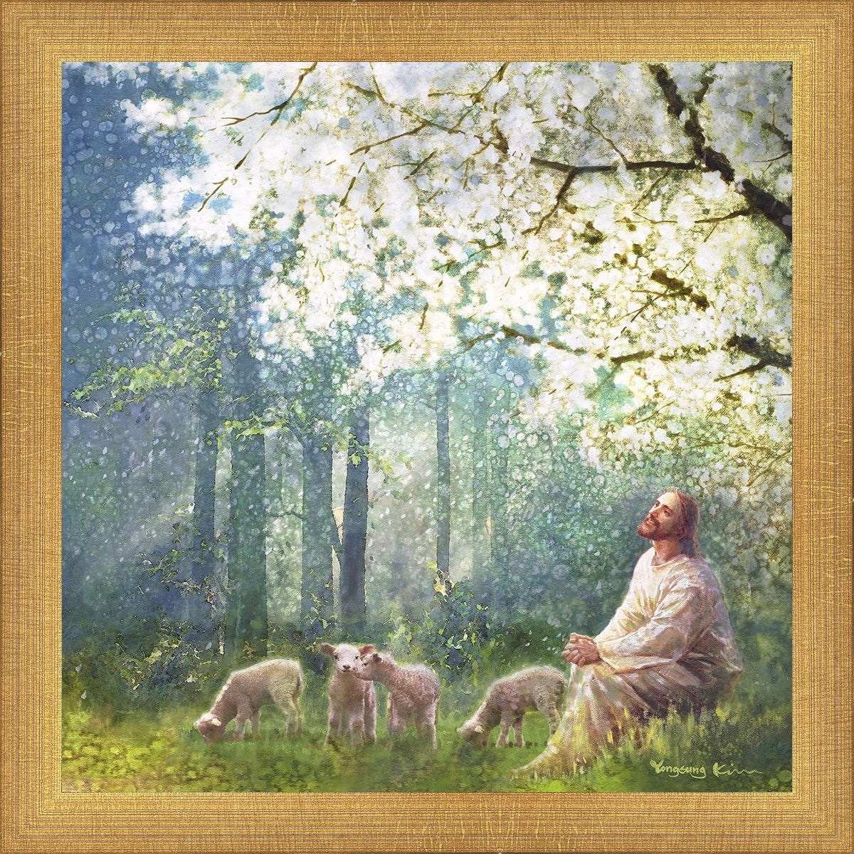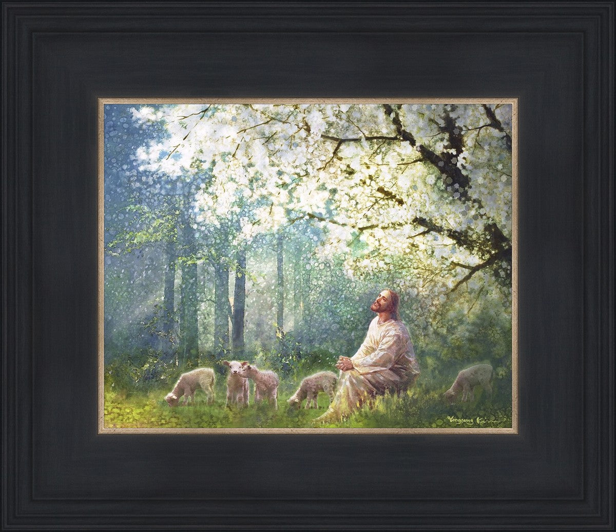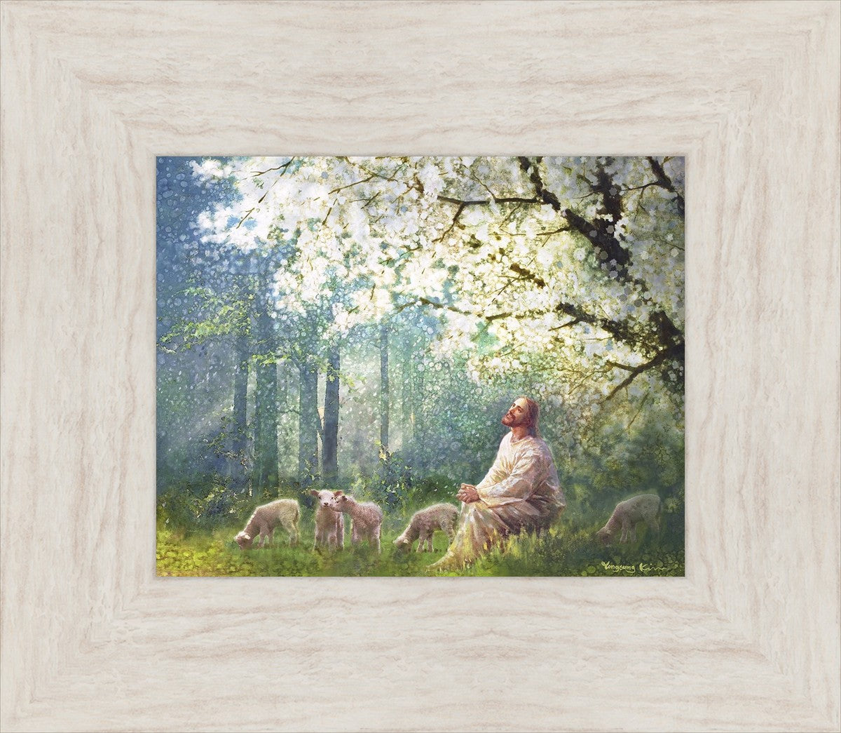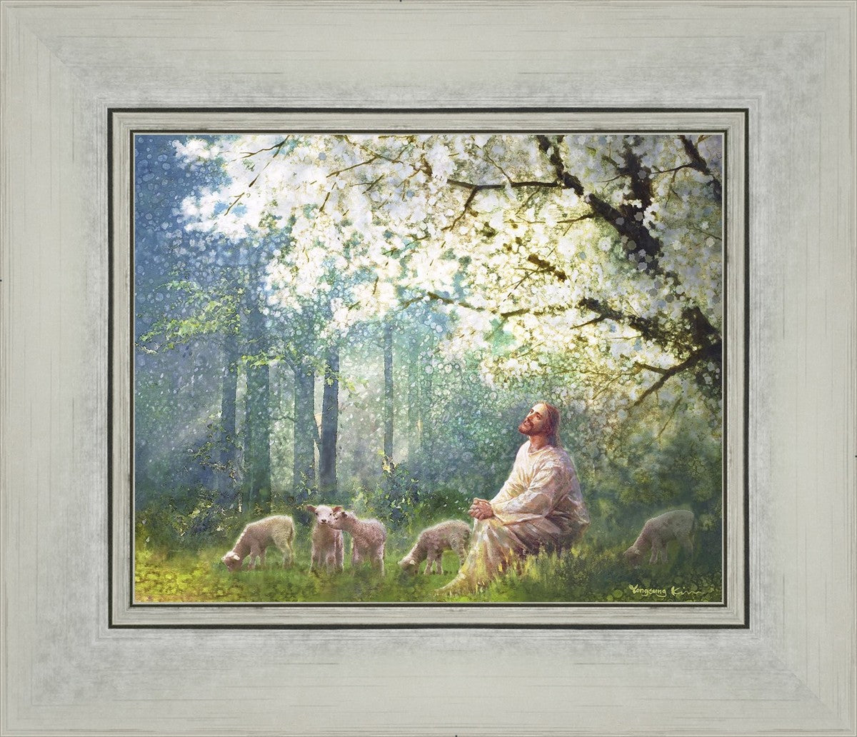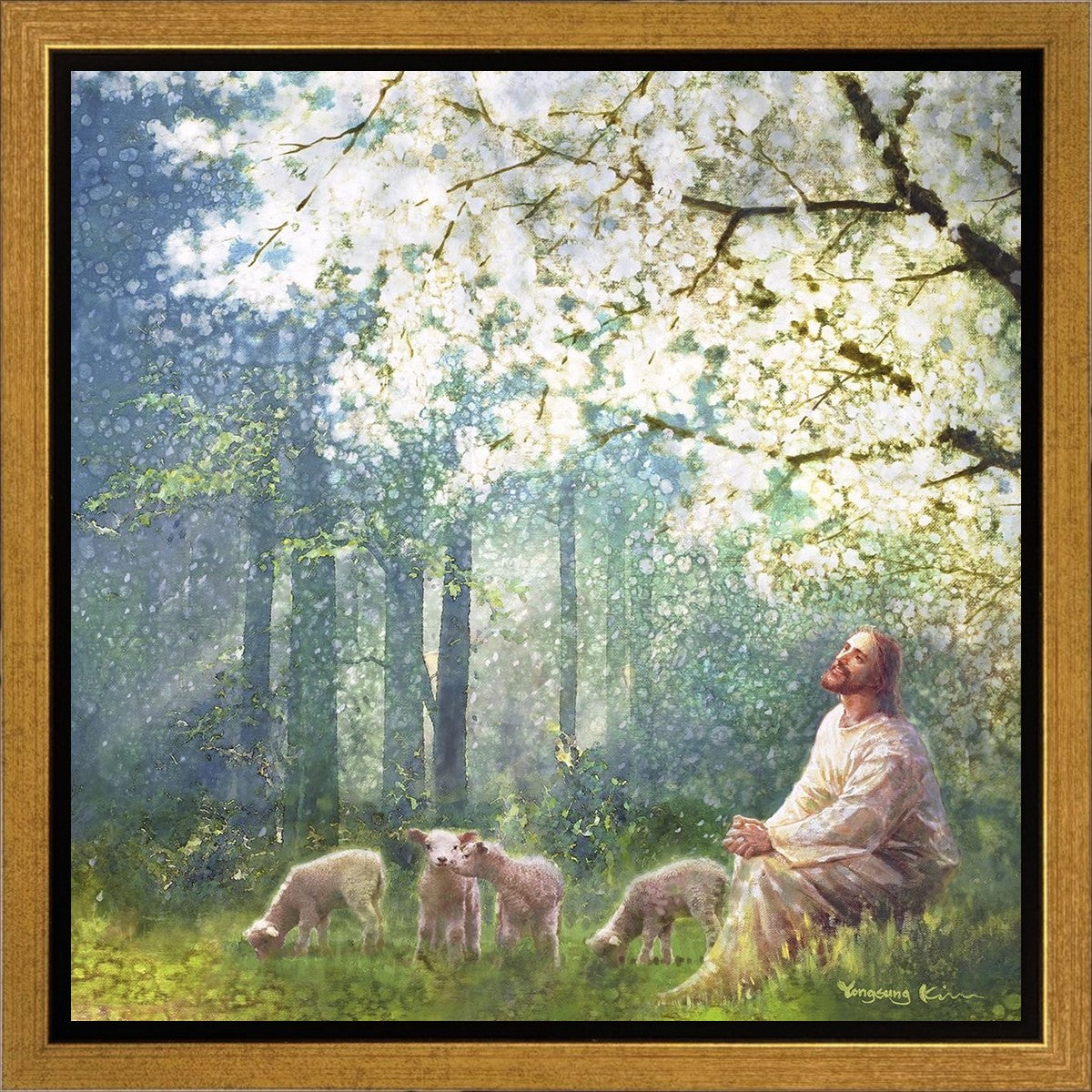 Yong Sung Kim's painting of Sweet is the Work presents Jesus Christ not only as a protector but a caretaker. Here He enjoys time playing beneath a tree nountiful tree with His flock at the edge of an abundant pasture