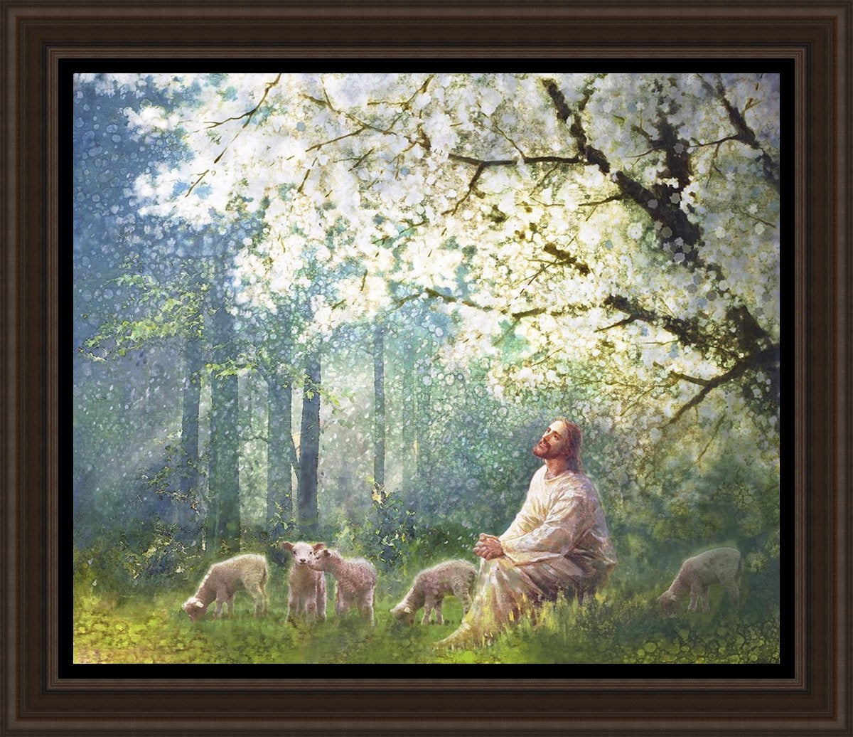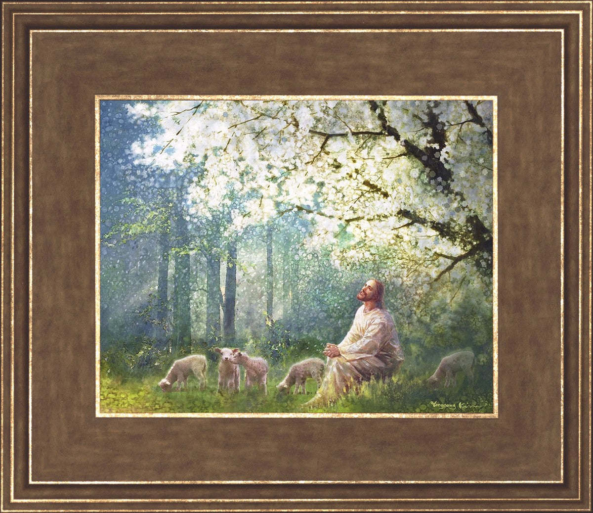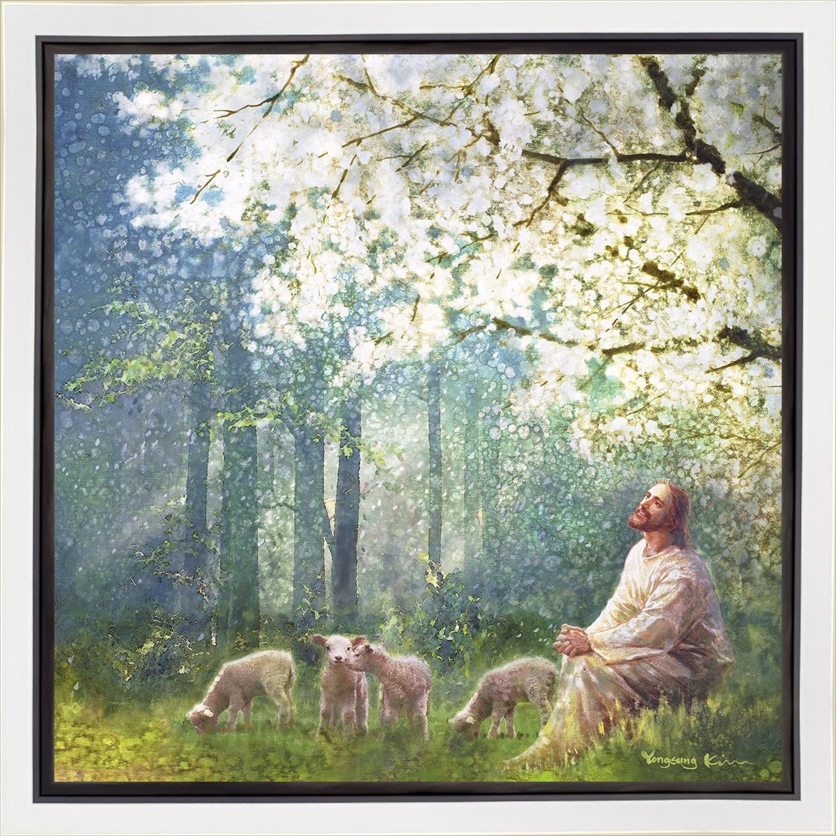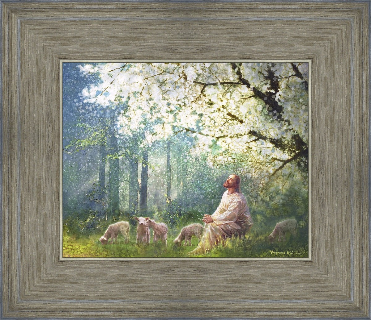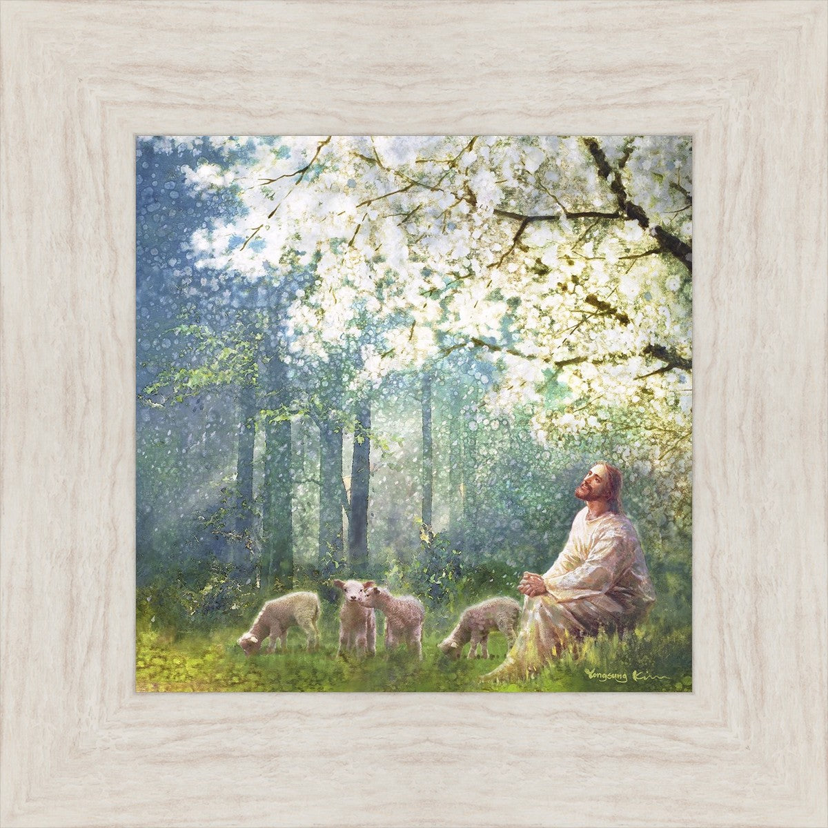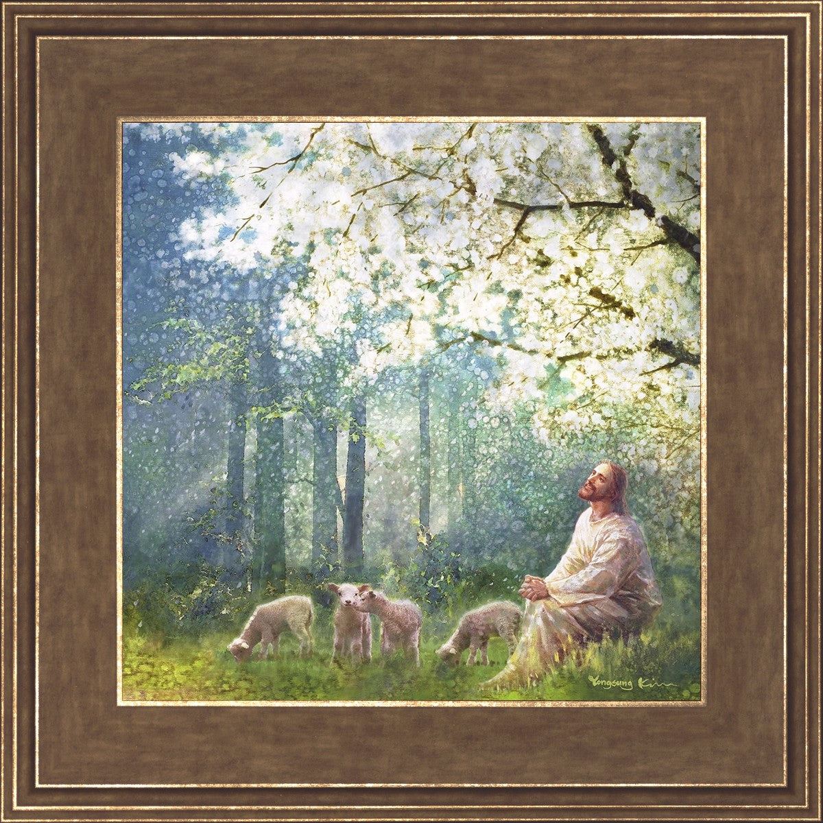 Yong Sung Kim's painting of Sweet is the Work presents Jesus Christ not only as a protector but a caretaker. Here He enjoys time playing beneath a tree nountiful tree with His flock at the edge of an abundant pasture