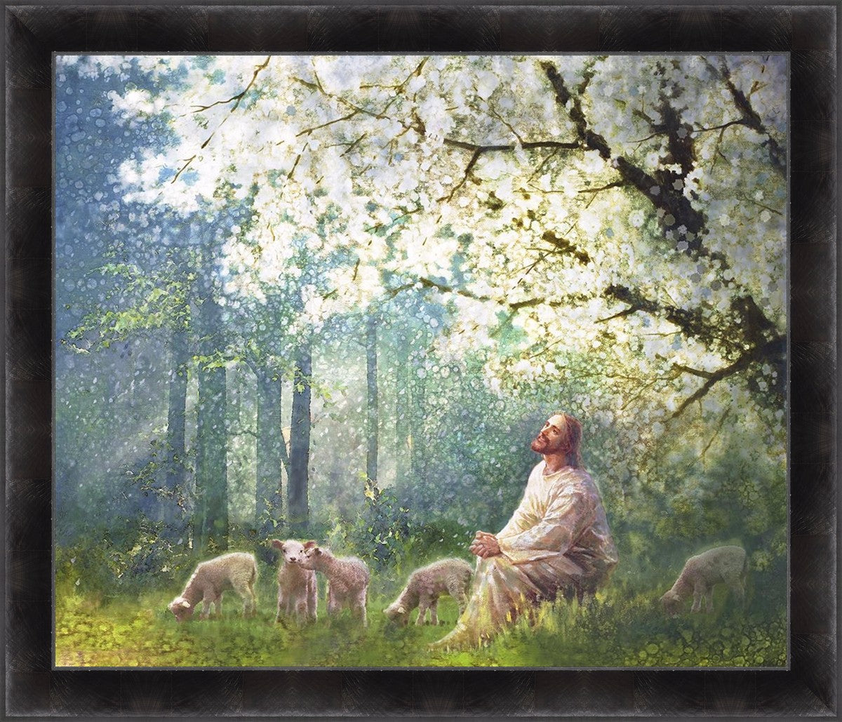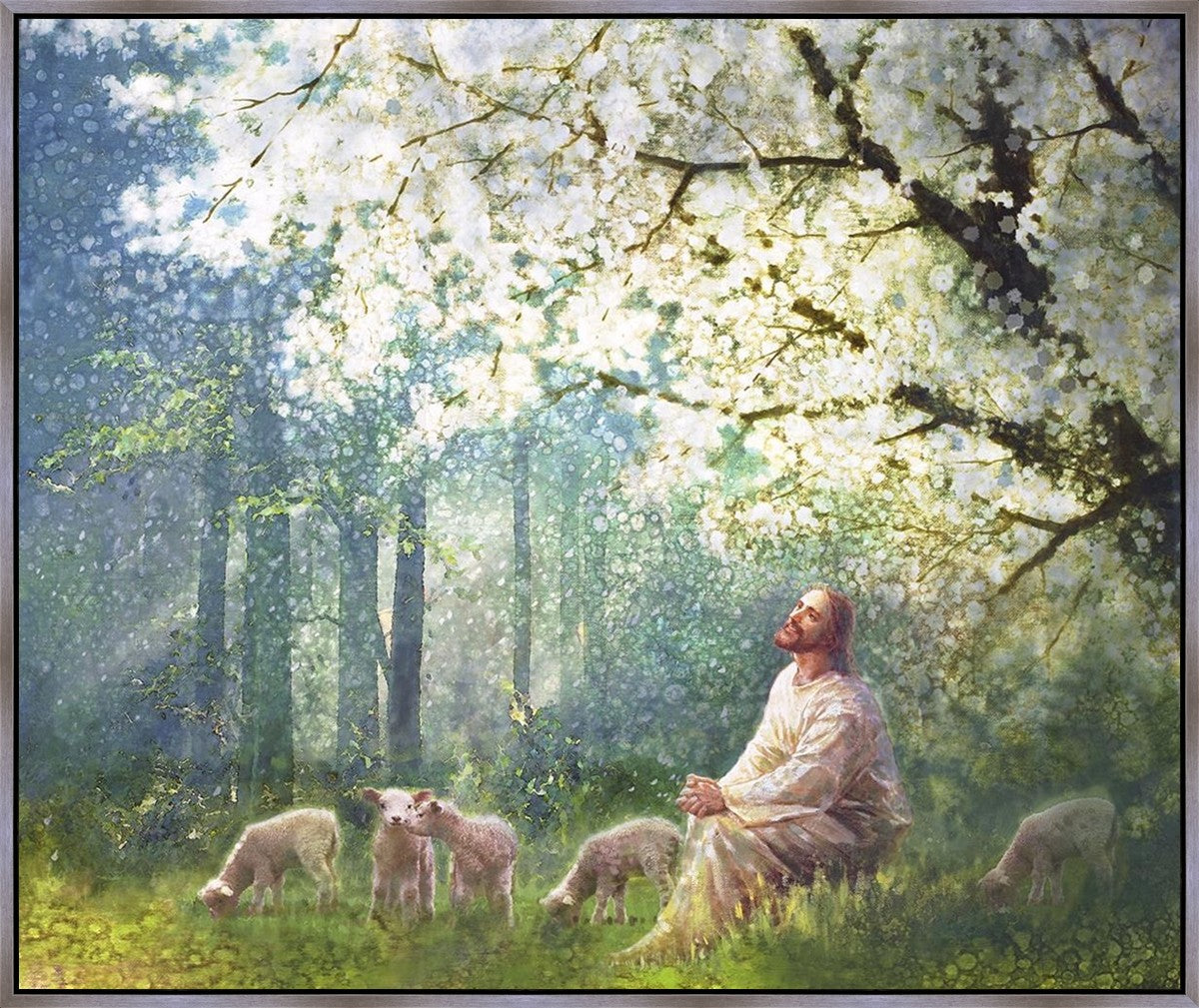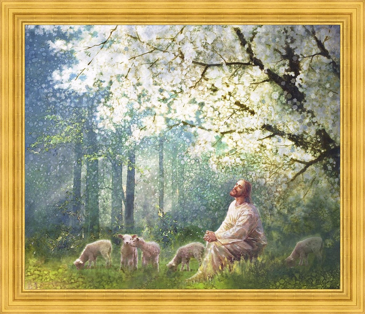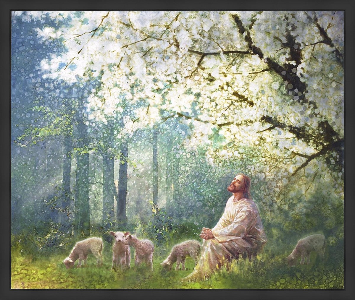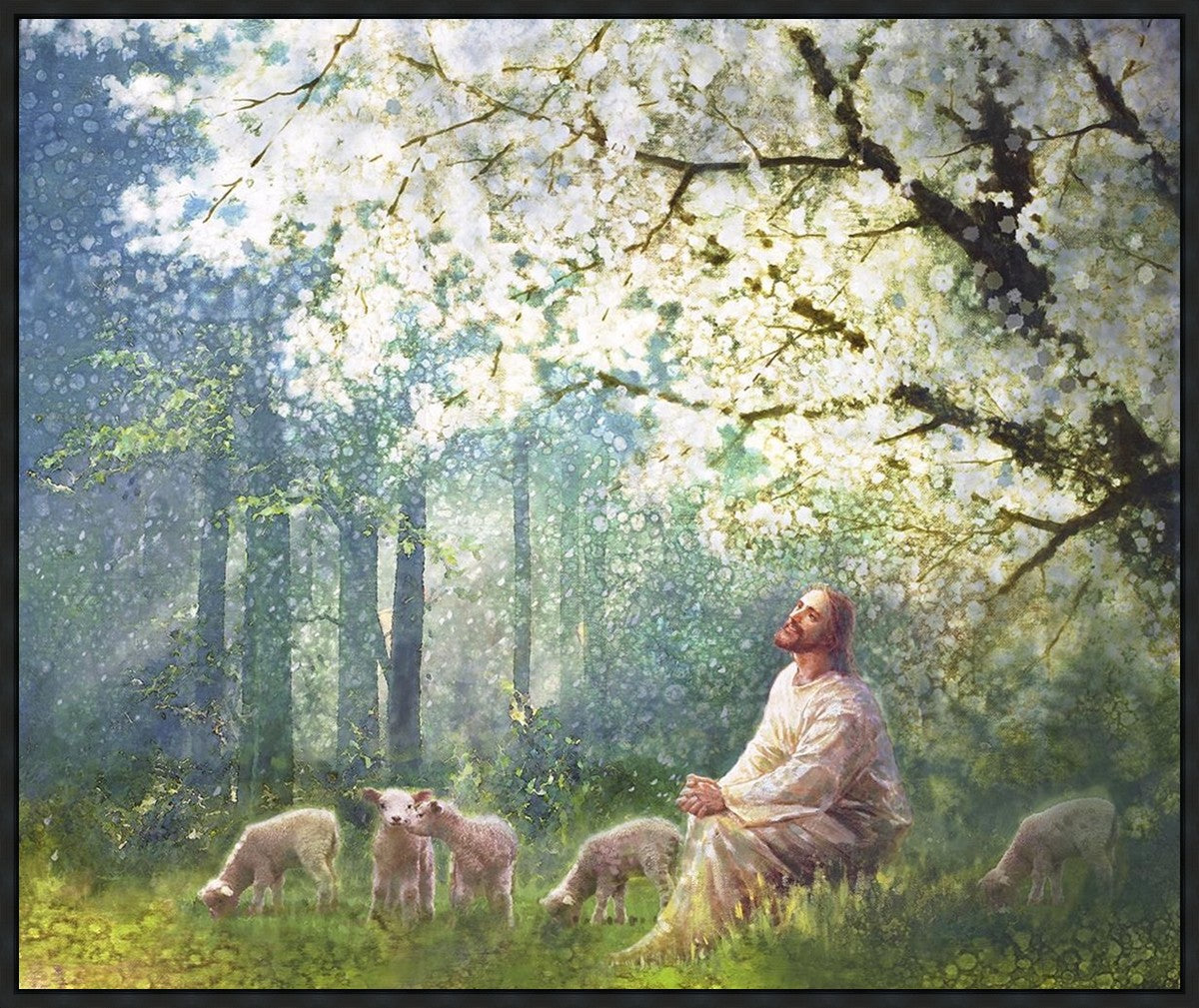 Yong Sung Kim's painting of Sweet is the Work presents Jesus Christ not only as a protector but a caretaker. Here He enjoys time playing beneath a tree nountiful tree with His flock at the edge of an abundant pasture