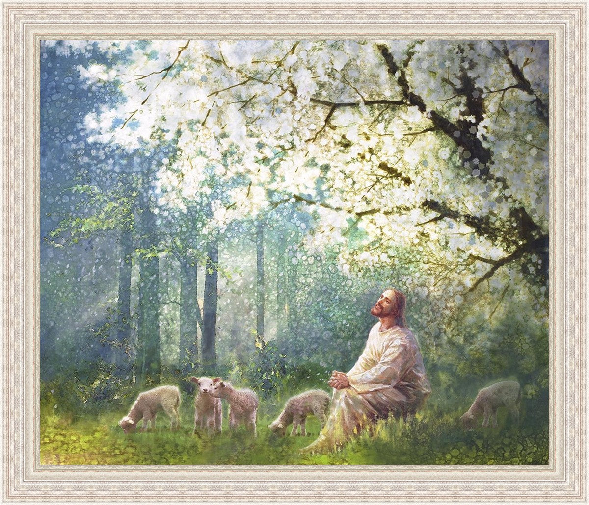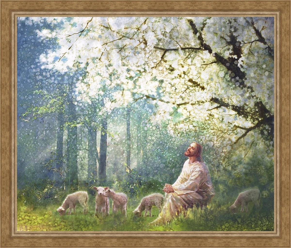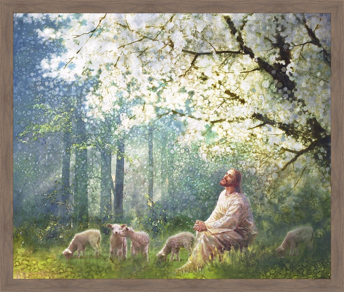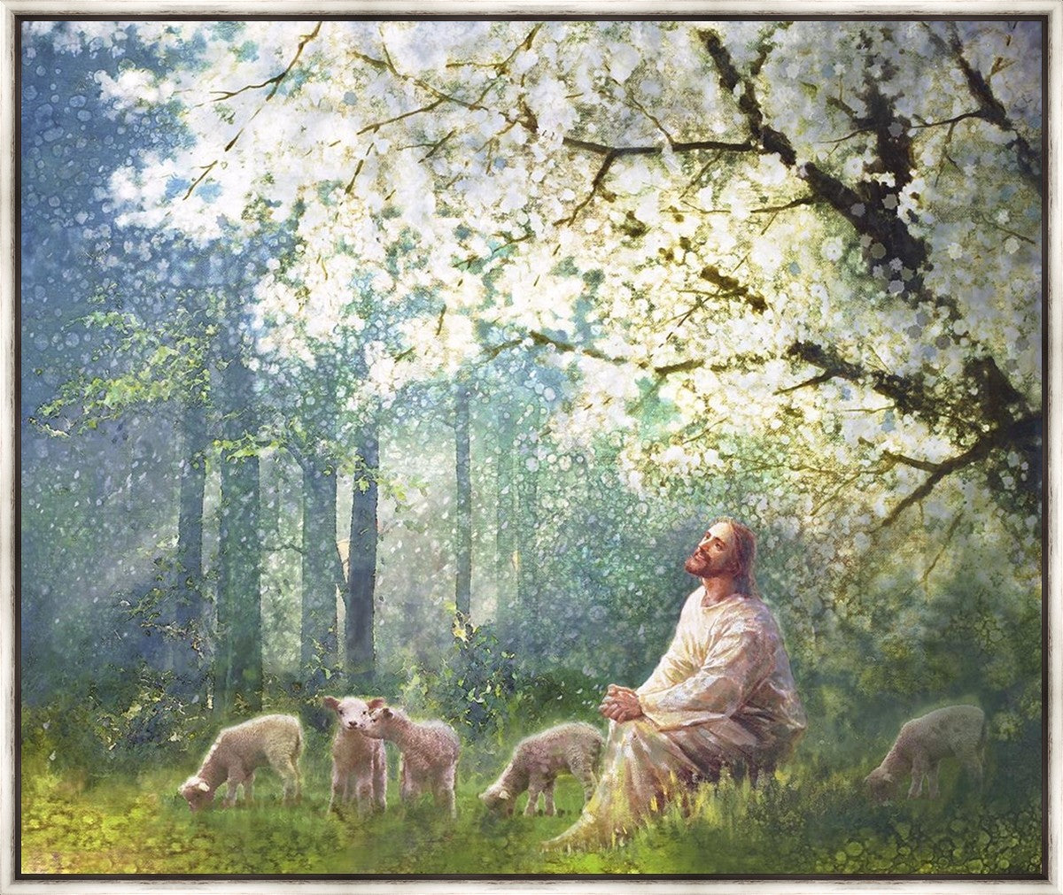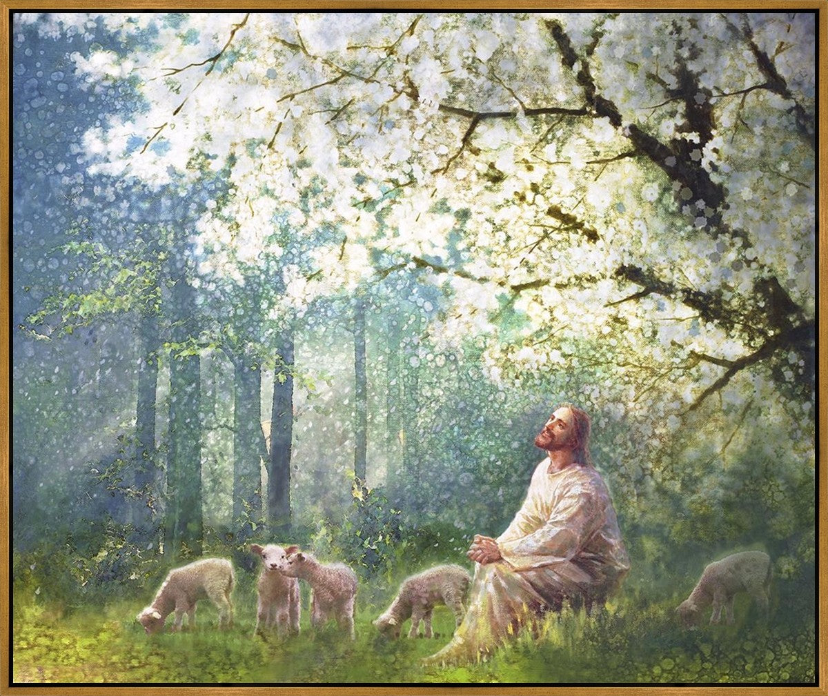 Yong Sung Kim's painting of Sweet is the Work presents Jesus Christ not only as a protector but a caretaker. Here He enjoys time playing beneath a tree nountiful tree with His flock at the edge of an abundant pasture
