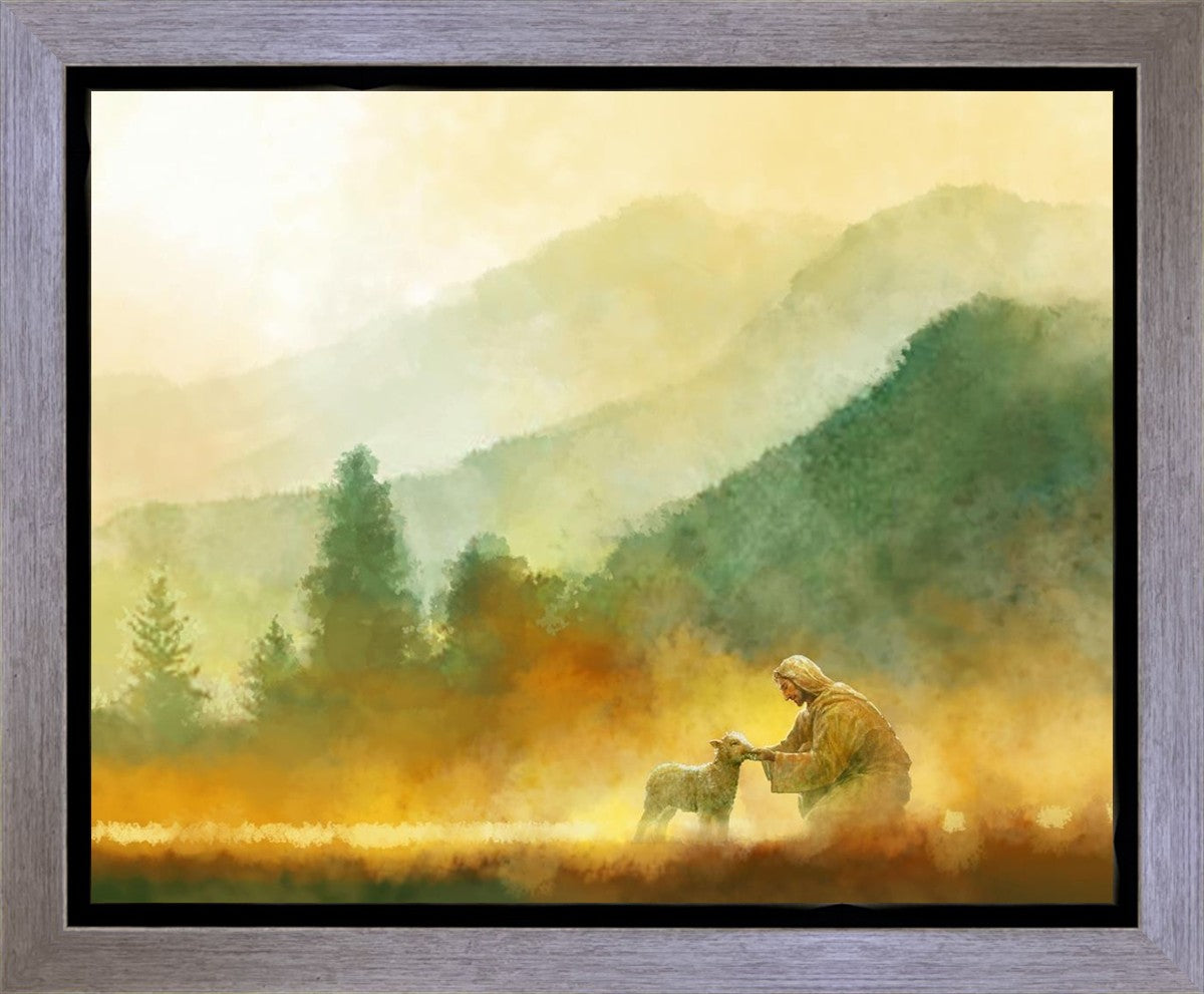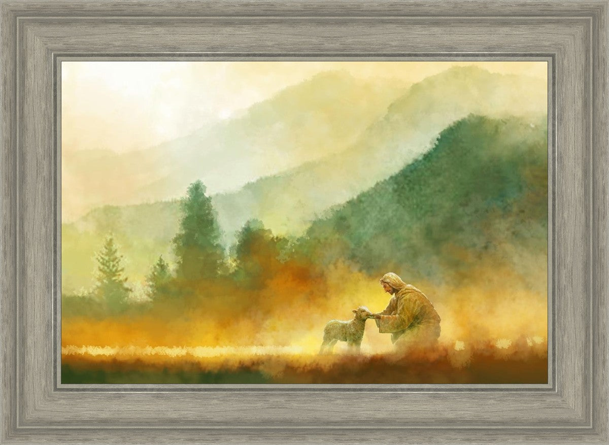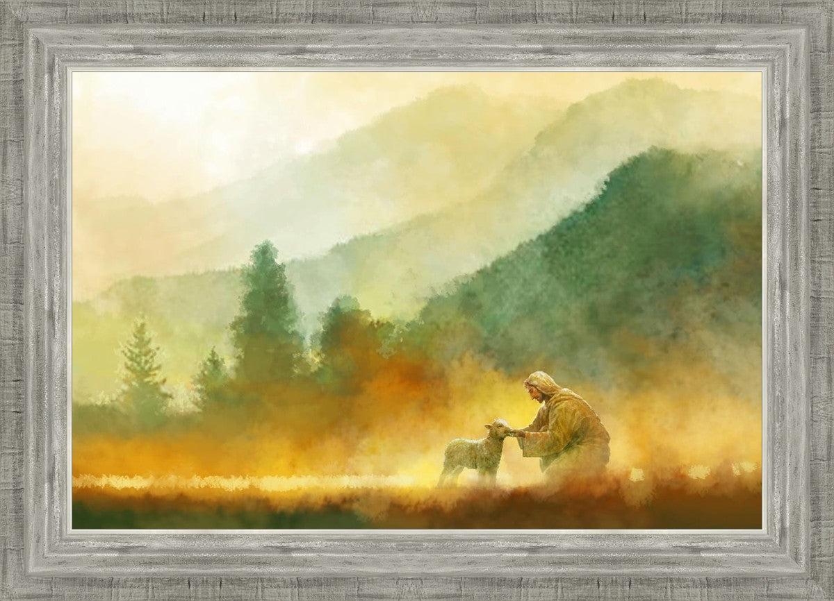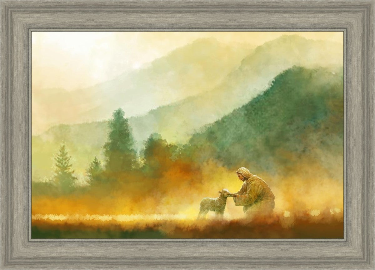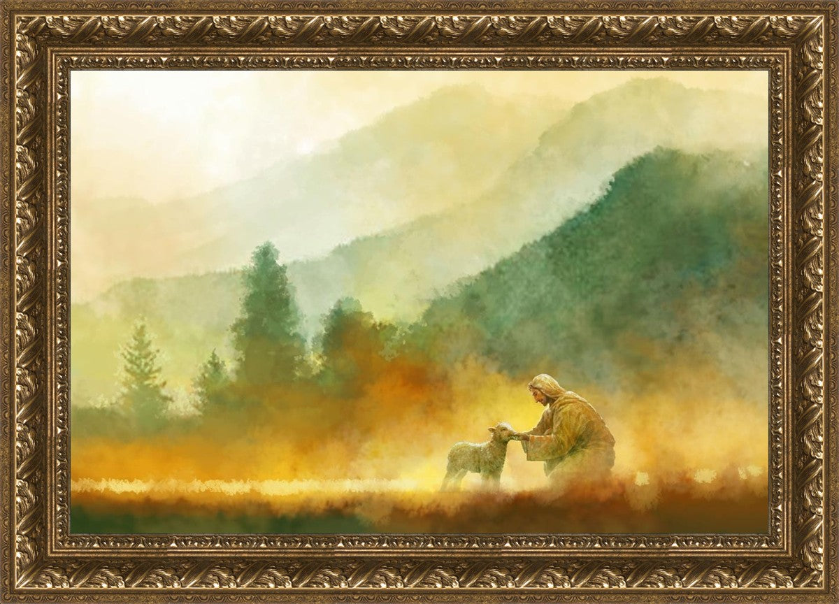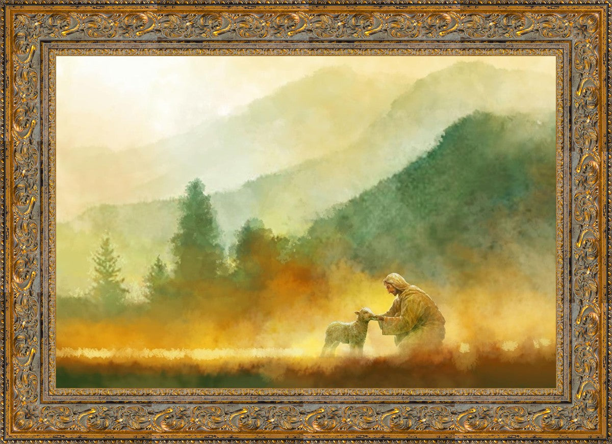 "The Lost Sheep" by Yongsung Kim depicts Jesus kneeling beside a lamb against a serene mountain landscape, symbolizing divine compassion and redemption.