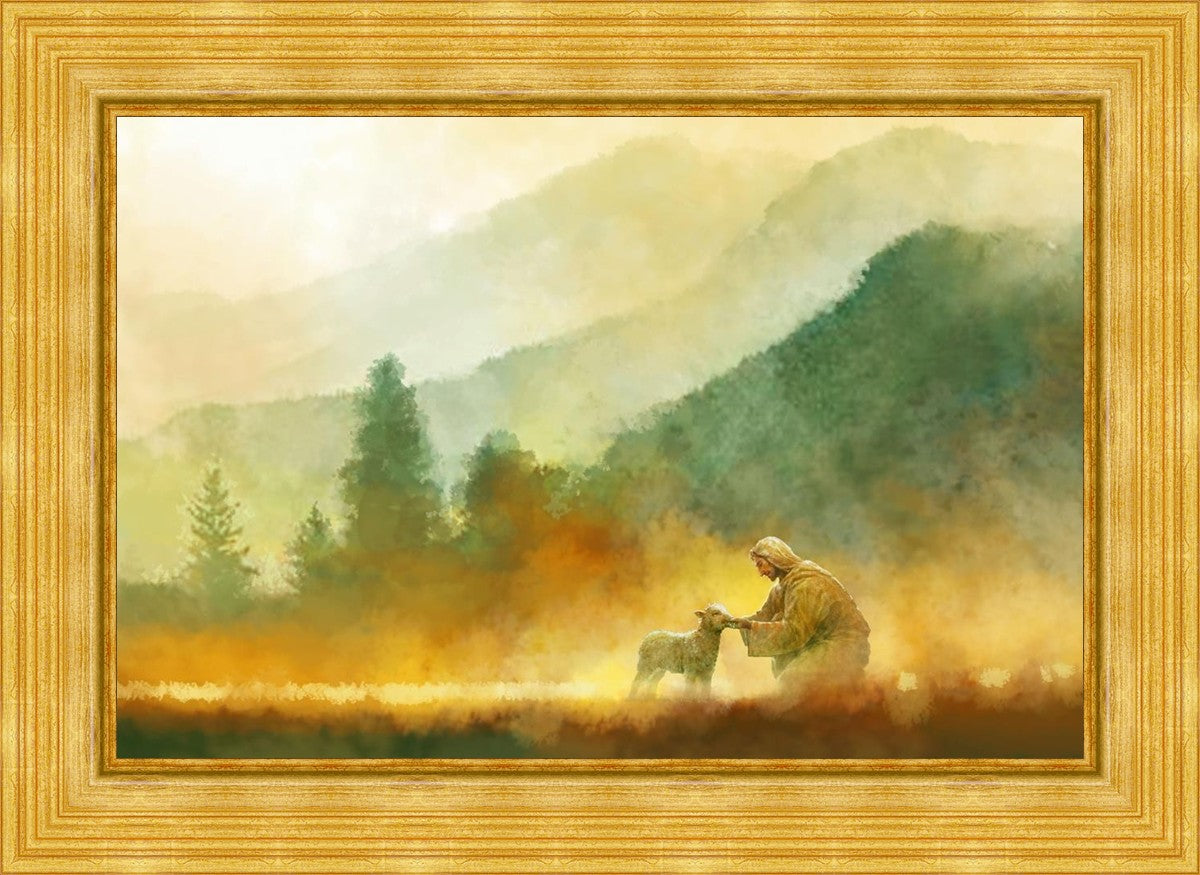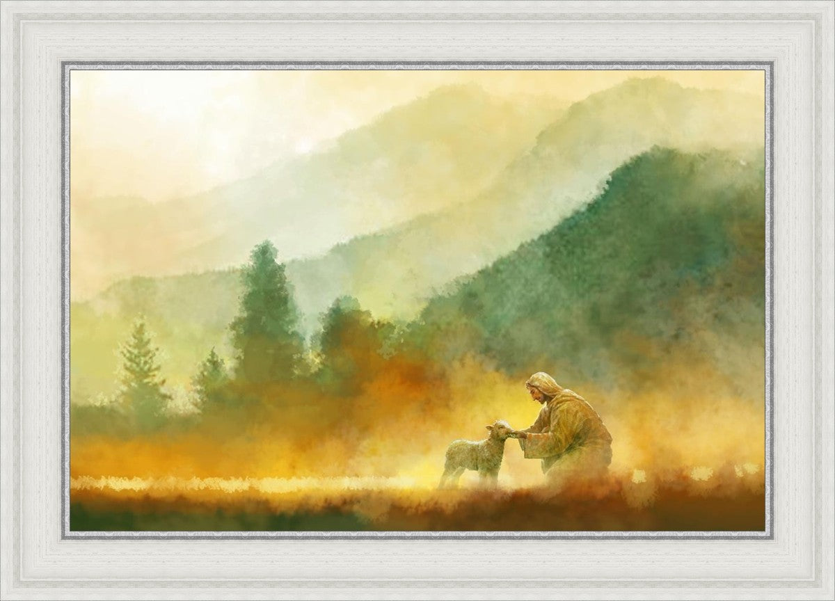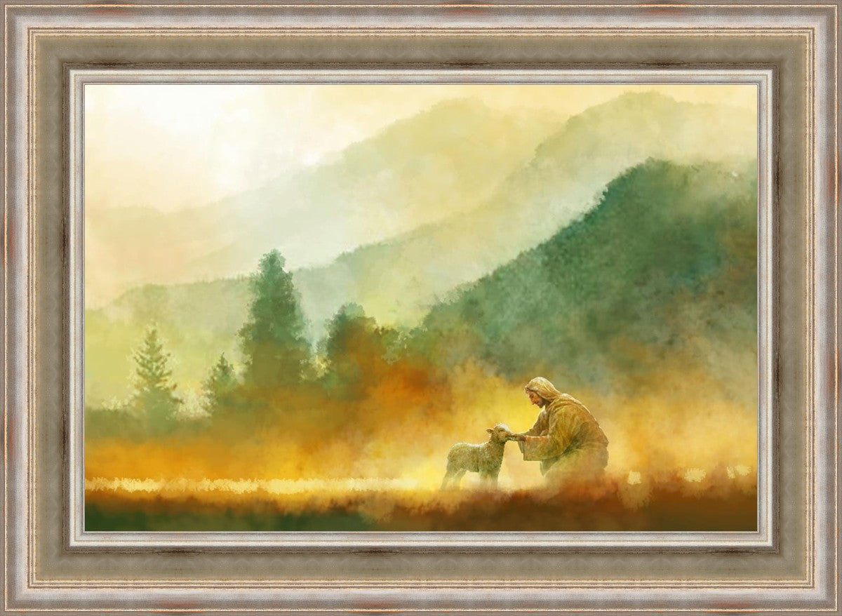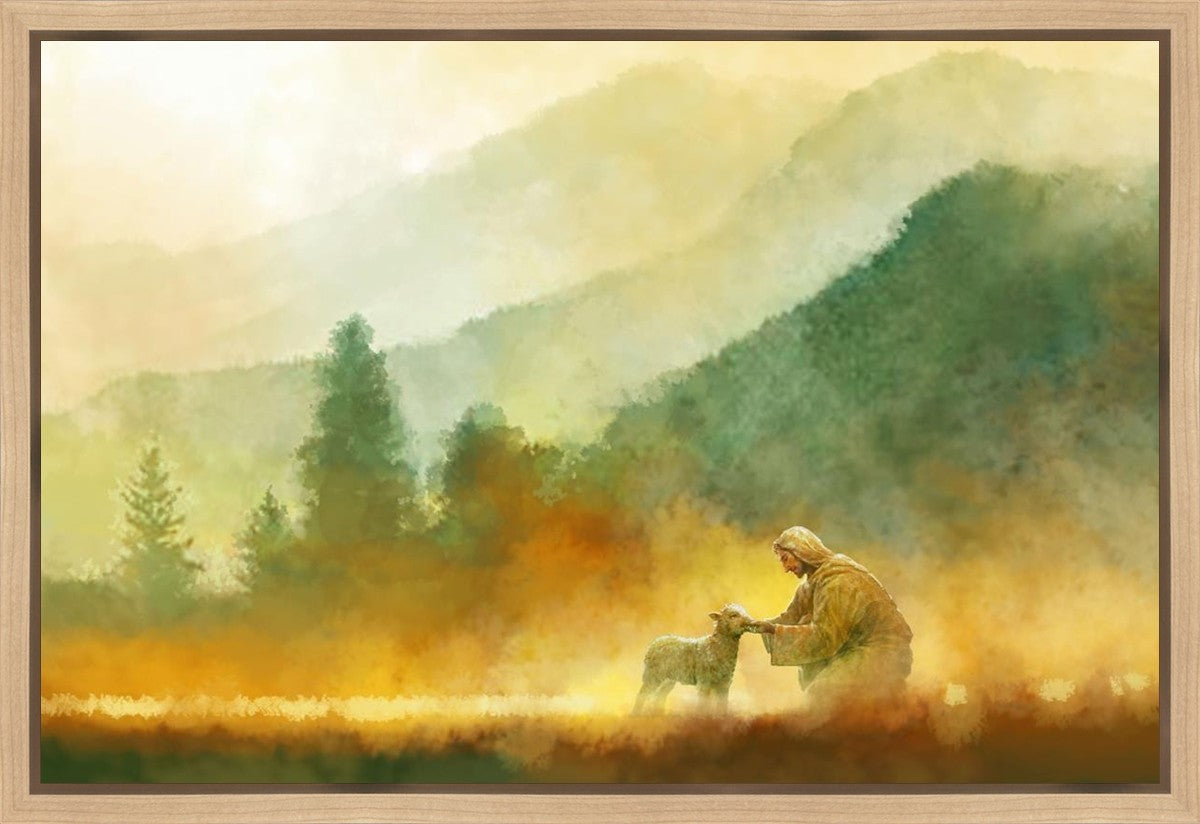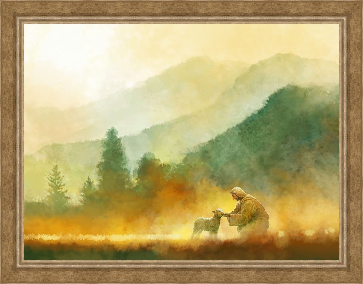 "The Lost Sheep" by Yongsung Kim depicts Jesus kneeling beside a lamb against a serene mountain landscape, symbolizing divine compassion and redemption.